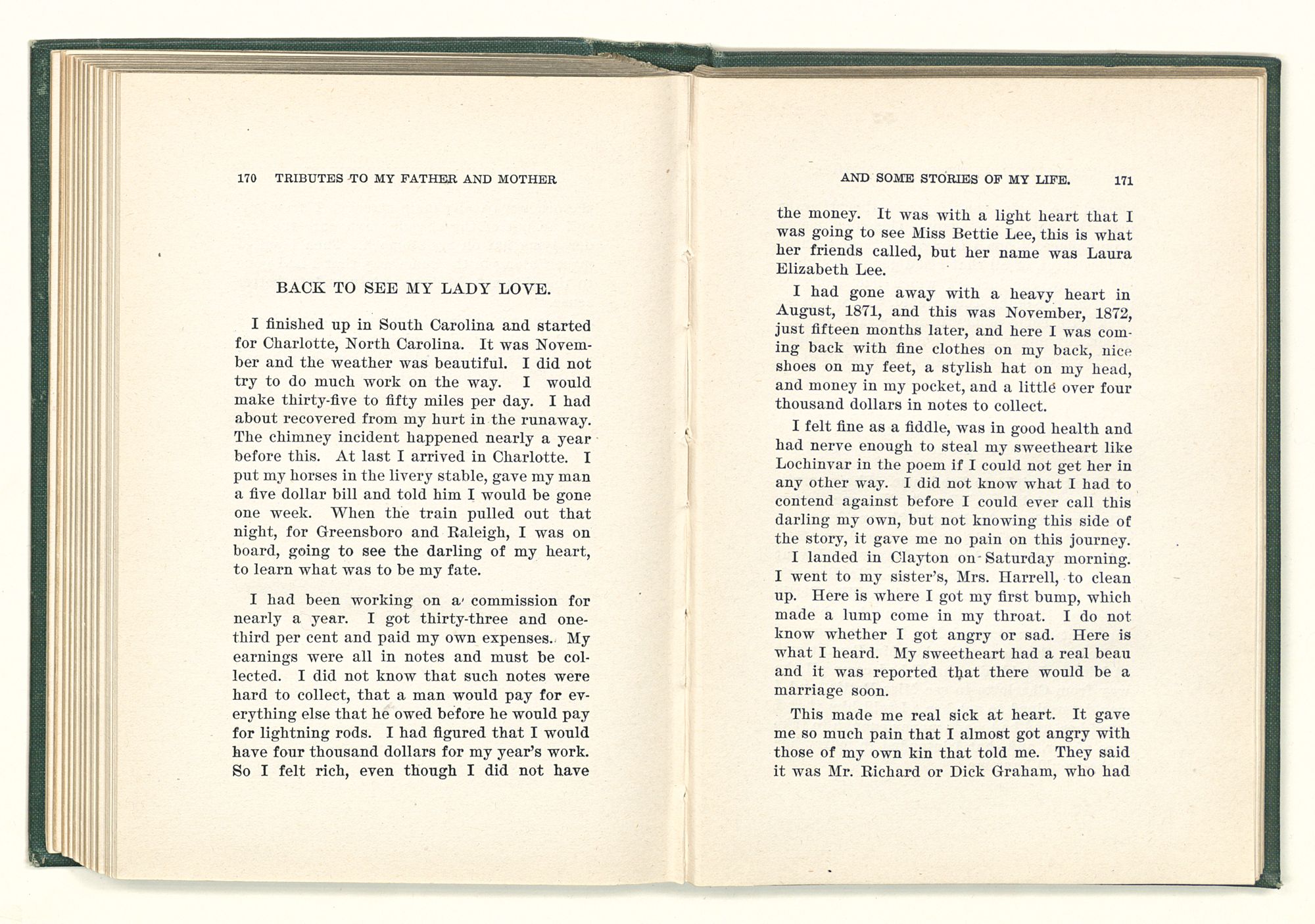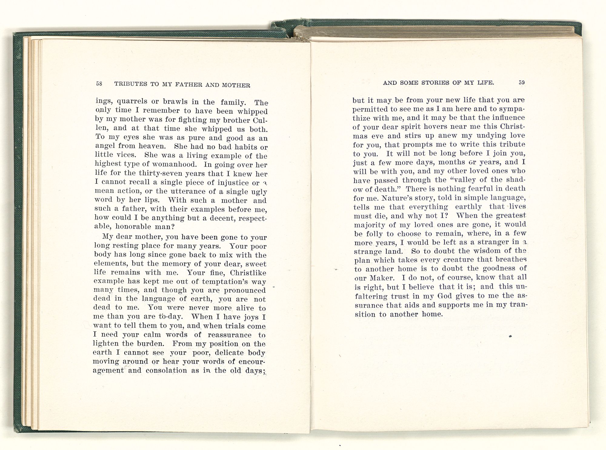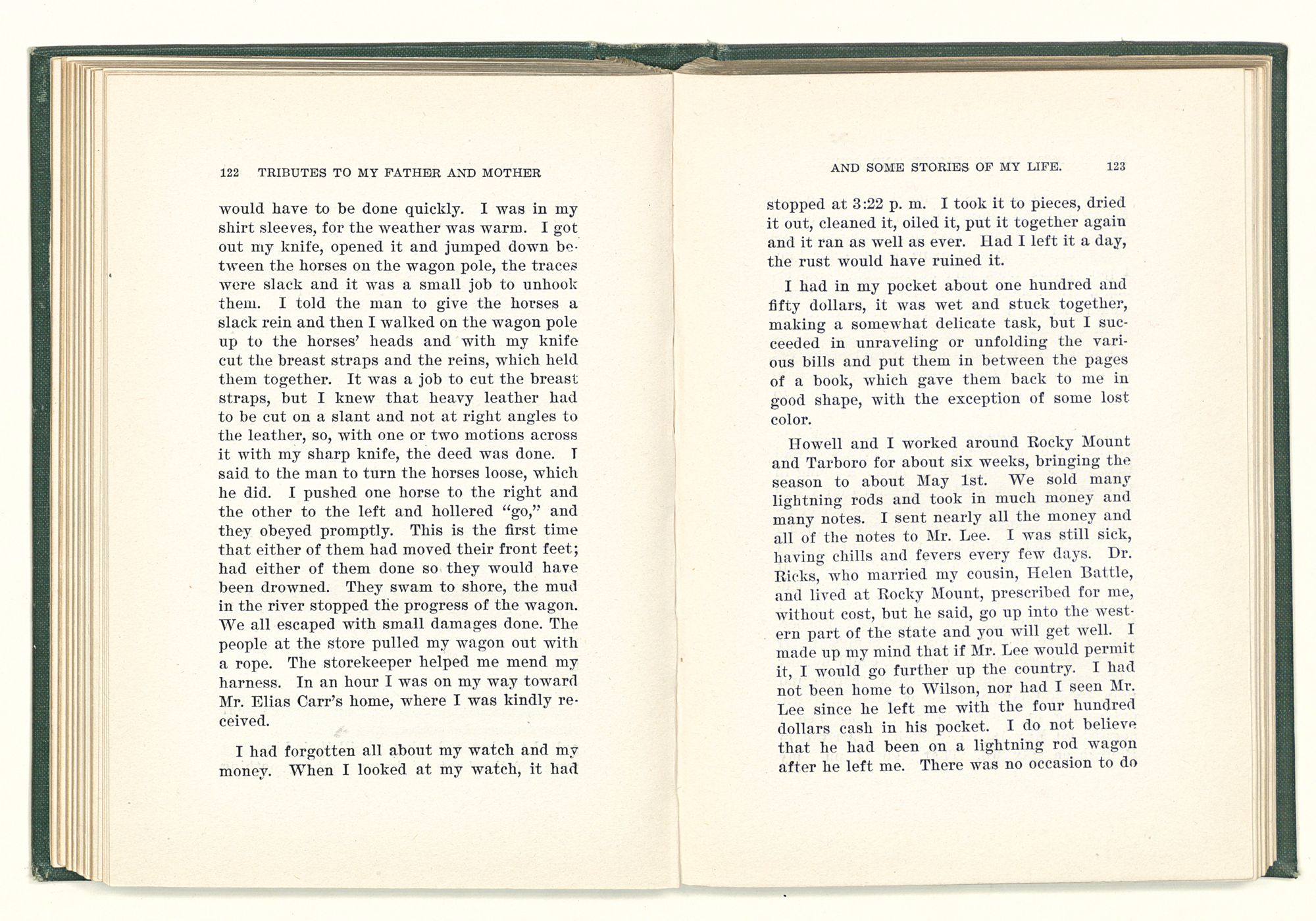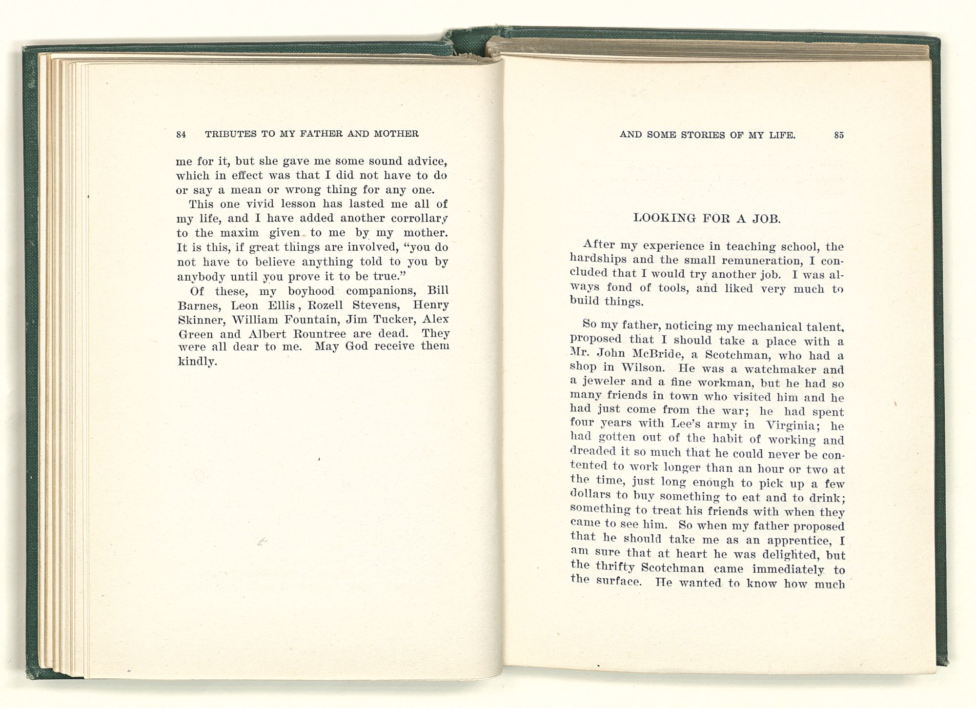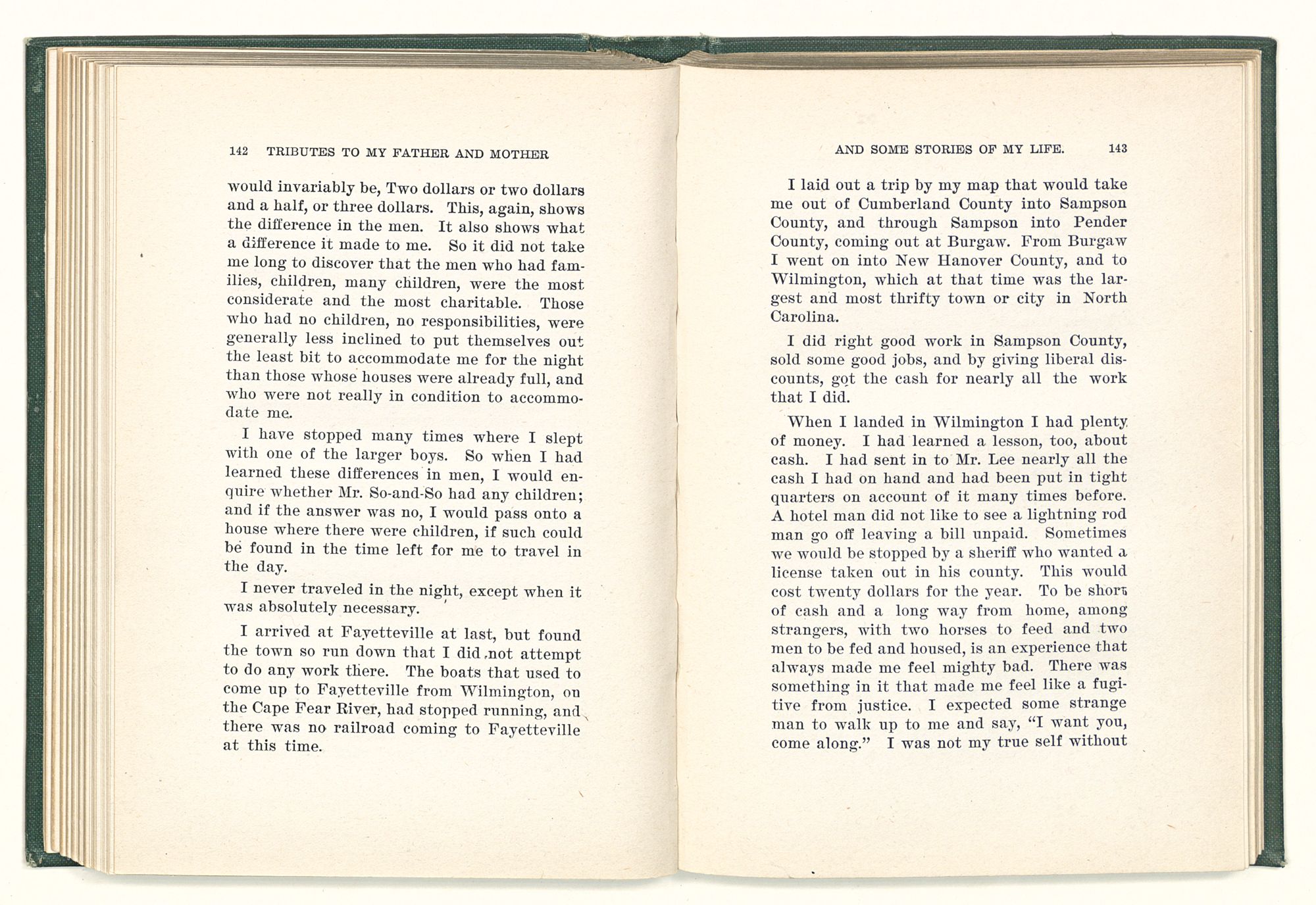 given the money to build a church in a section of the state where there was none, and had bought the old saddle for a very small price and borrowed a horse to do his missionary work with; and when his journey was finished, he had returned the horse and brought the old saddle home on his back to use at some future time. He put his name on the back of some man's note as an endorsement, and when the note came due, the man did not have the money to pay with, and my father was asked to pay, but he did not have the money either, and said so, but that he would pay when he got the money. The man who held the note asked my father why he put his name on a note when he had no money, my father, in his guilelessness said he did it because he had been asked to do so. This answer so enraged the holder of the note that he slapped my father's face, and my father deliberately turned his other cheek and said to the man, “You may slap the other cheek if you want to.” I have known many good men, but I have never seen another one as good as my father. He was accessible to rich and poor alike. There was nothing that he possessed that he would not give away if some one would ask him for it. There was never a minute, night or day that he would reserve for himself or family, all his time was at the disposal of any one that would come and ask