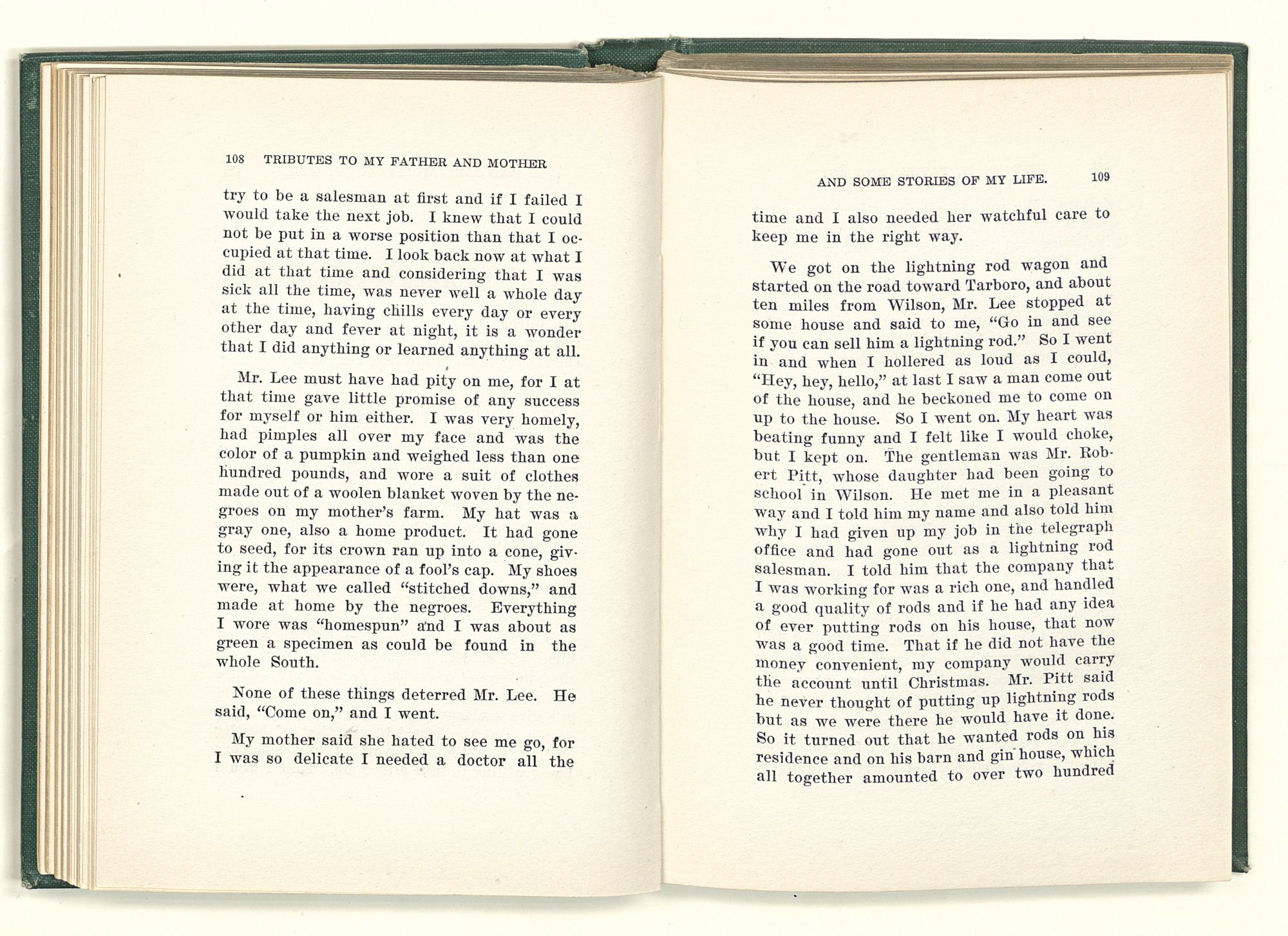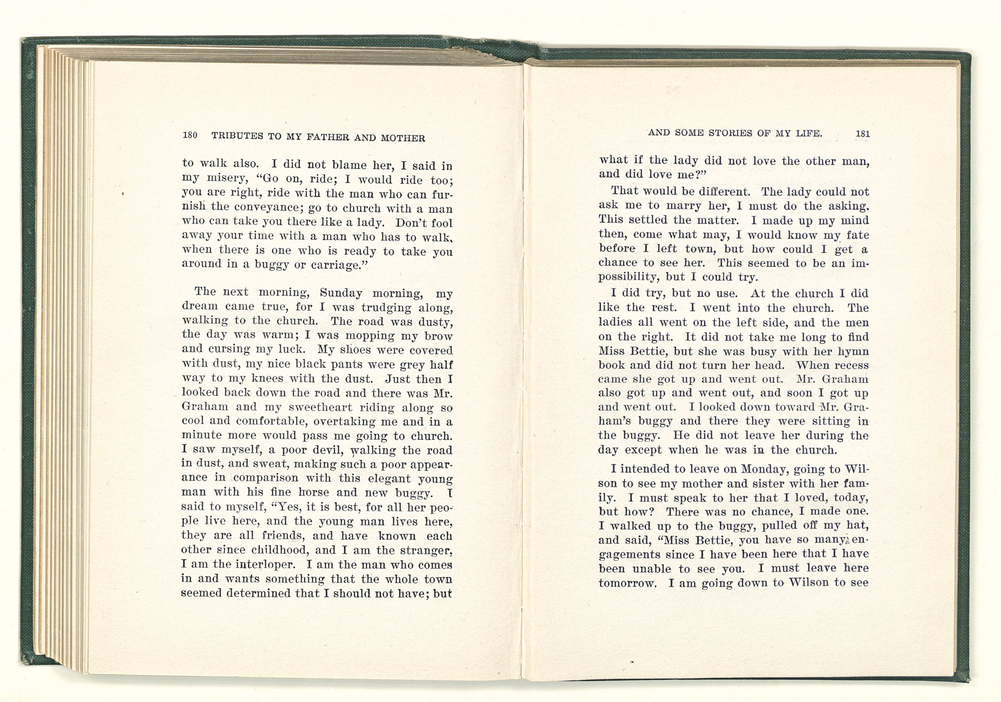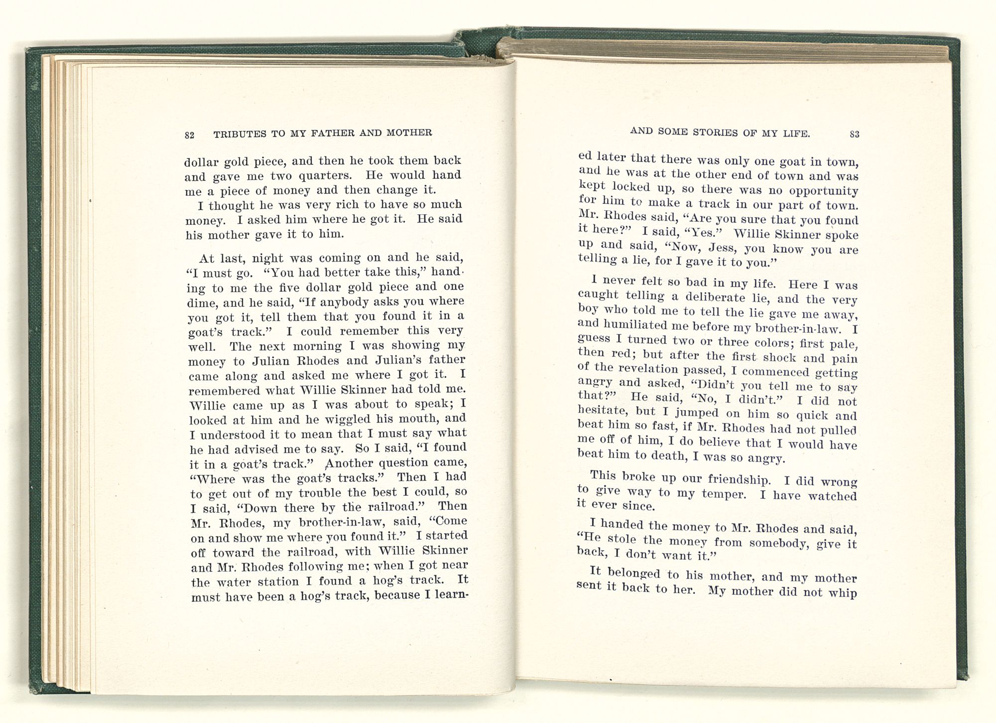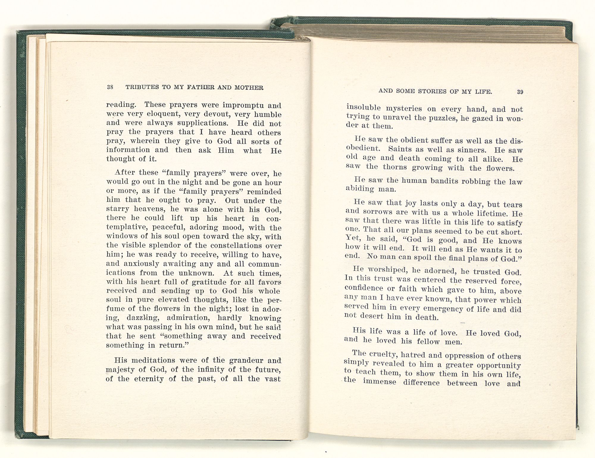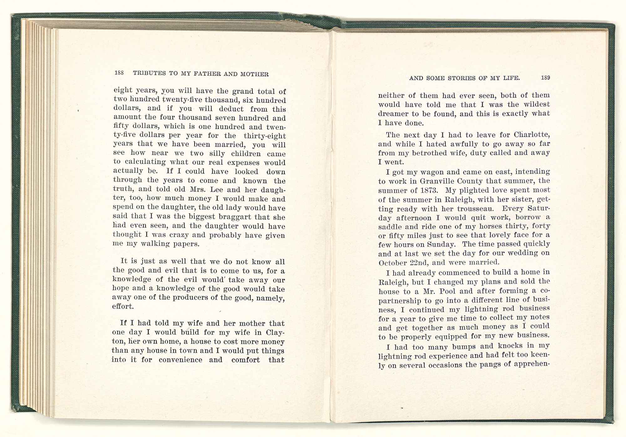 given the money to build a church in a section of the state where there was none, and had bought the old saddle for a very small price and borrowed a horse to do his missionary work with; and when his journey was finished, he had returned the horse and brought the old saddle home on his back to use at some future time. He put his name on the back of some man's note as an endorsement, and when the note came due, the man did not have the money to pay with, and my father was asked to pay, but he did not have the money either, and said so, but that he would pay when he got the money. The man who held the note asked my father why he put his name on a note when he had no money, my father, in his guilelessness said he did it because he had been asked to do so. This answer so enraged the holder of the note that he slapped my father's face, and my father deliberately turned his other cheek and said to the man, “You may slap the other cheek if you want to.” I have known many good men, but I have never seen another one as good as my father. He was accessible to rich and poor alike. There was nothing that he possessed that he would not give away if some one would ask him for it. There was never a minute, night or day that he would reserve for himself or family, all his time was at the disposal of any one that would come and ask