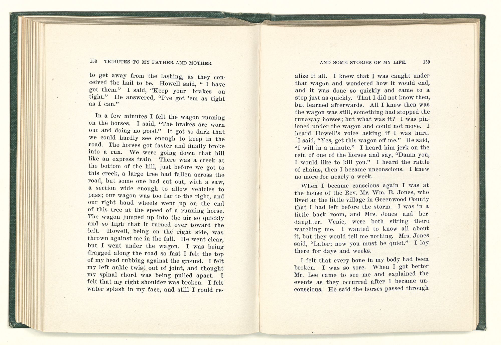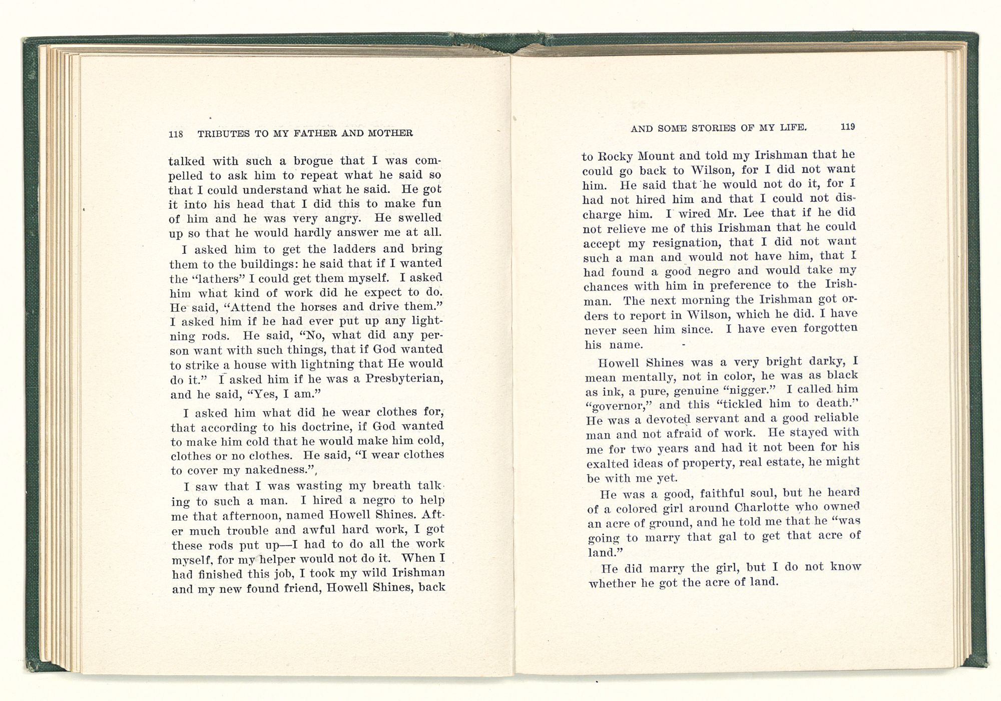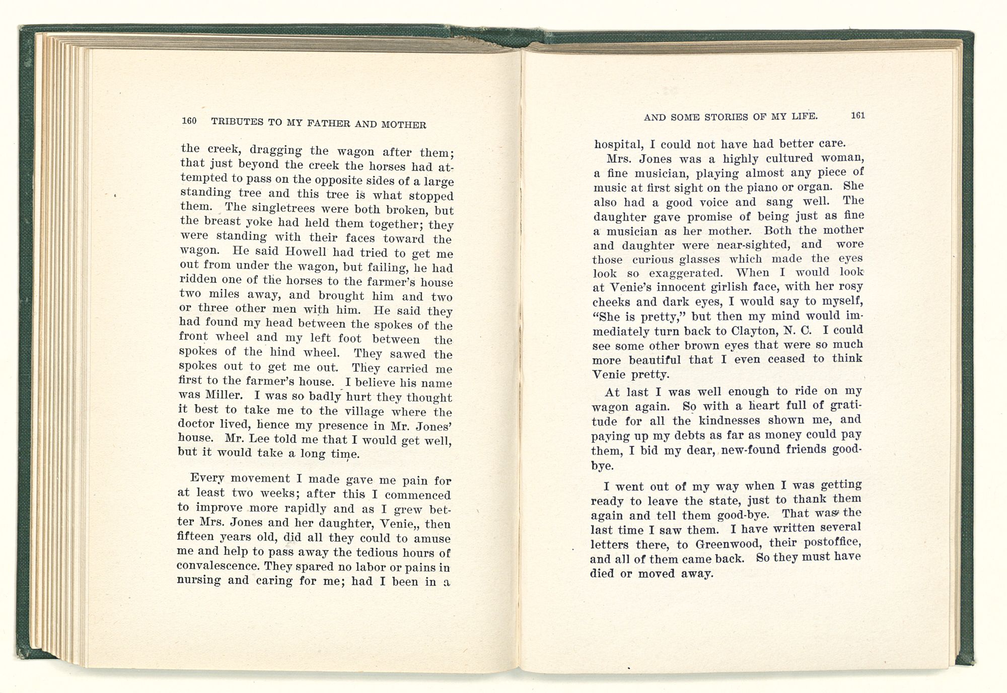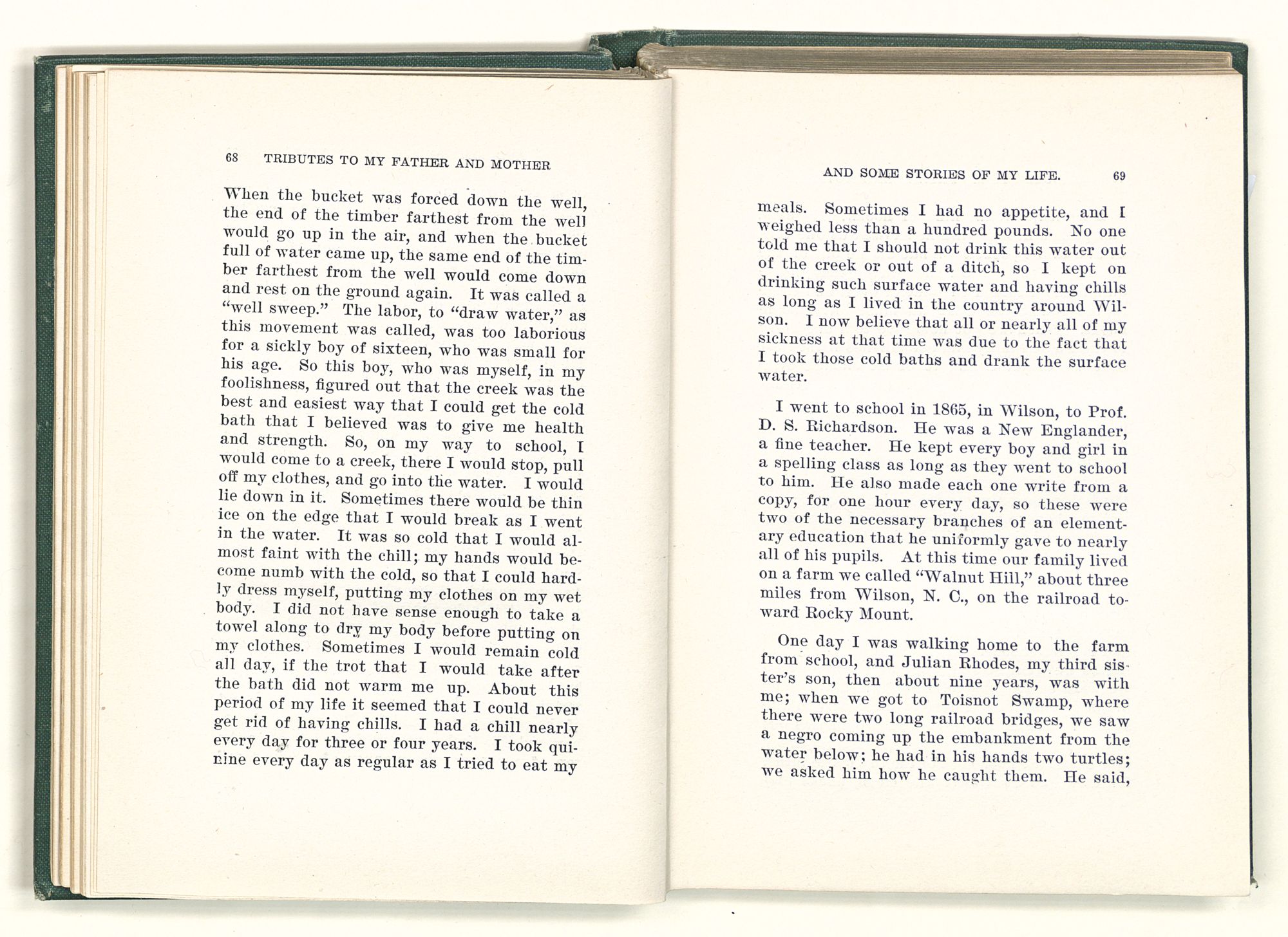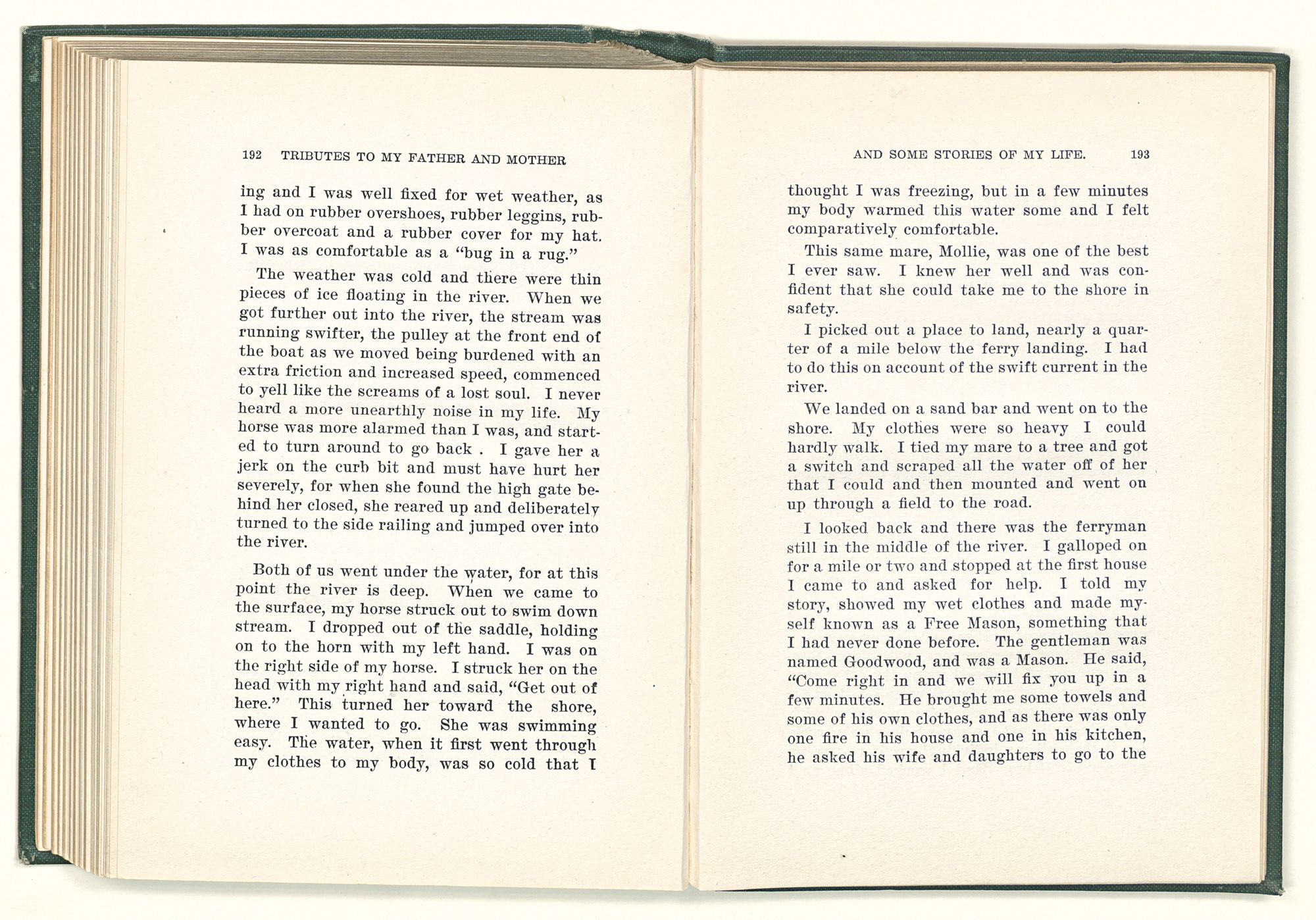 given the money to build a church in a section of the state where there was none, and had bought the old saddle for a very small price and borrowed a horse to do his missionary work with; and when his journey was finished, he had returned the horse and brought the old saddle home on his back to use at some future time. He put his name on the back of some man's note as an endorsement, and when the note came due, the man did not have the money to pay with, and my father was asked to pay, but he did not have the money either, and said so, but that he would pay when he got the money. The man who held the note asked my father why he put his name on a note when he had no money, my father, in his guilelessness said he did it because he had been asked to do so. This answer so enraged the holder of the note that he slapped my father's face, and my father deliberately turned his other cheek and said to the man, “You may slap the other cheek if you want to.” I have known many good men, but I have never seen another one as good as my father. He was accessible to rich and poor alike. There was nothing that he possessed that he would not give away if some one would ask him for it. There was never a minute, night or day that he would reserve for himself or family, all his time was at the disposal of any one that would come and ask