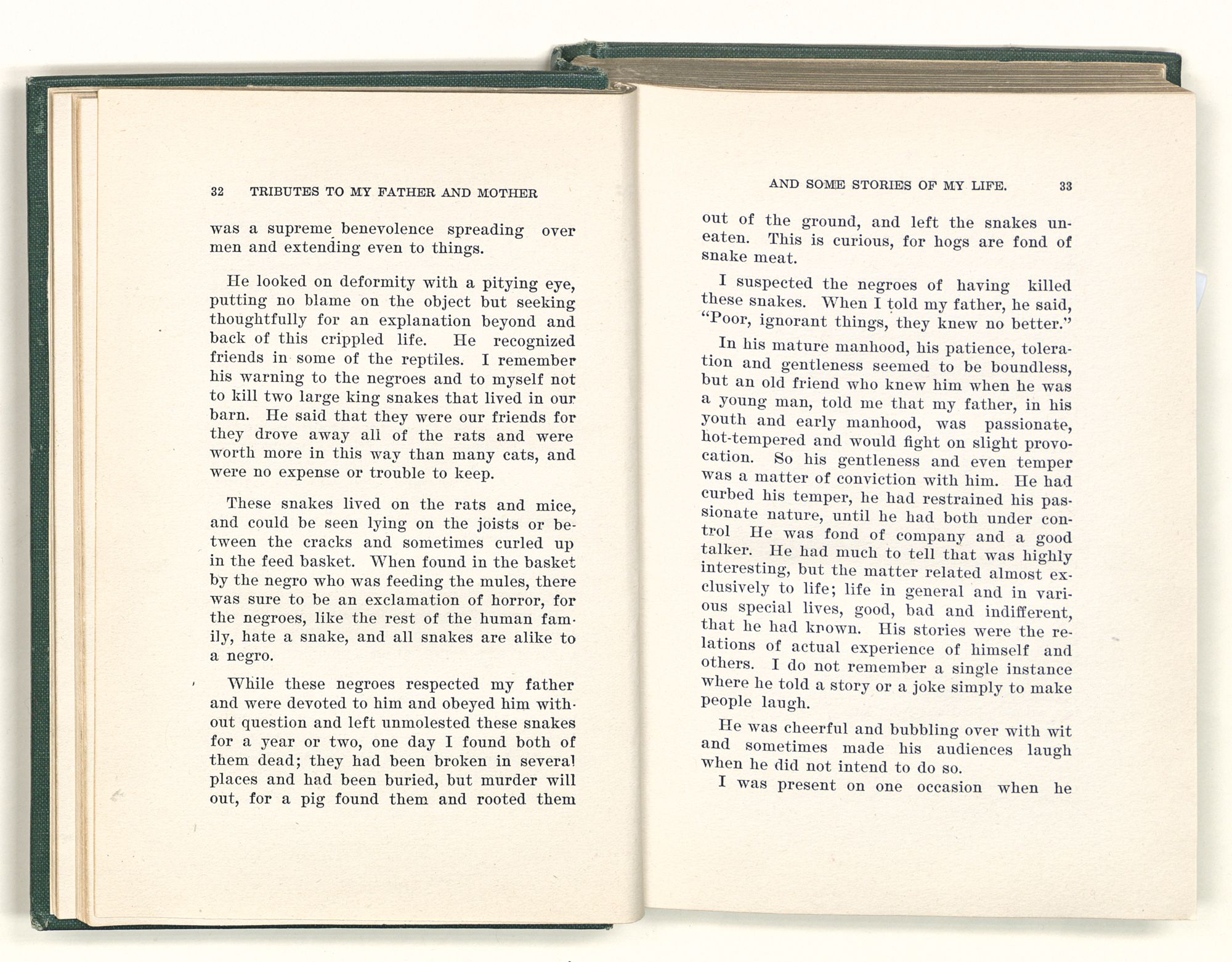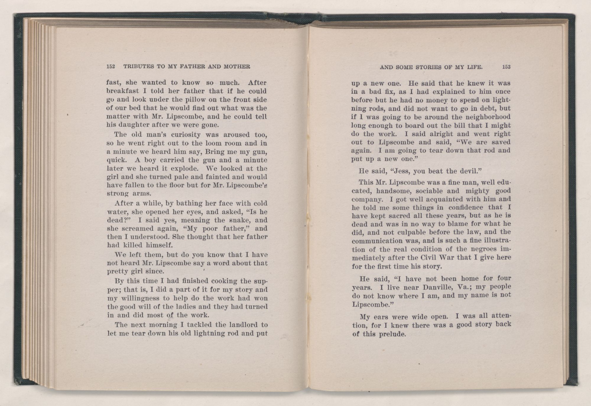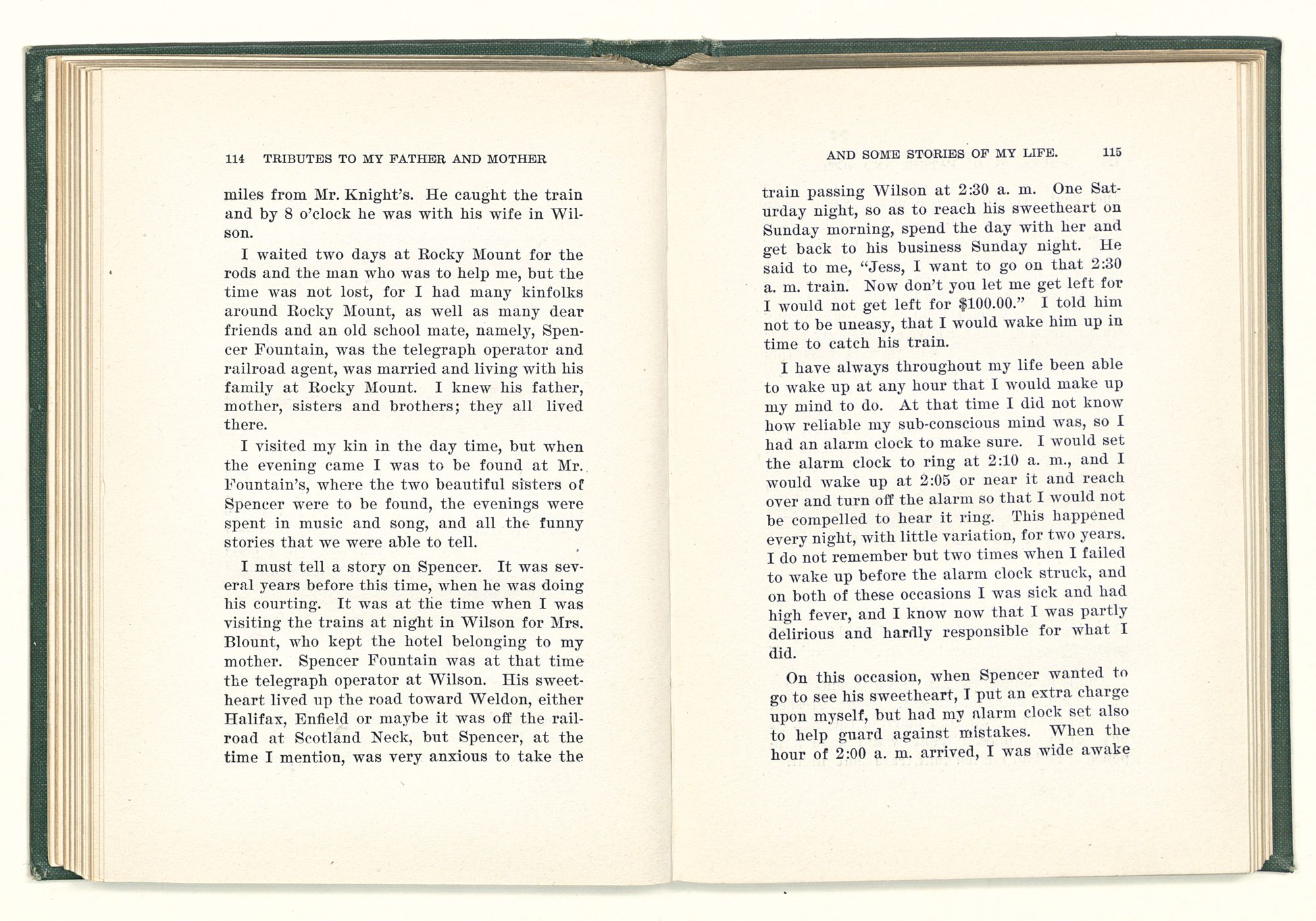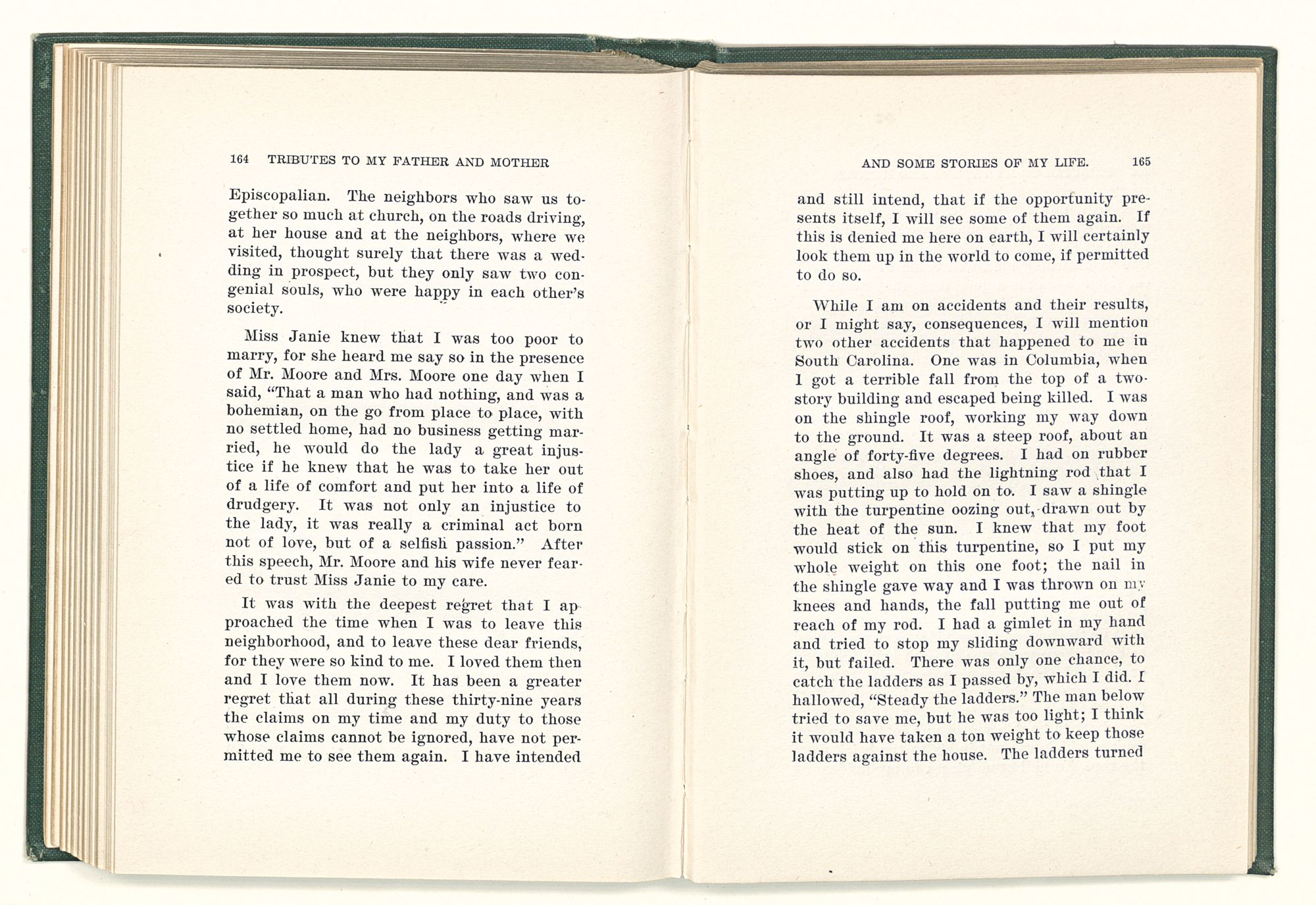given the money to build a church in a section of the state where there was none, and had bought the old saddle for a very small price and borrowed a horse to do his missionary work with; and when his journey was finished, he had returned the horse and brought the old saddle home on his back to use at some future time. He put his name on the back of some man's note as an endorsement, and when the note came due, the man did not have the money to pay with, and my father was asked to pay, but he did not have the money either, and said so, but that he would pay when he got the money. The man who held the note asked my father why he put his name on a note when he had no money, my father, in his guilelessness said he did it because he had been asked to do so. This answer so enraged the holder of the note that he slapped my father's face, and my father deliberately turned his other cheek and said to the man, “You may slap the other cheek if you want to.” I have known many good men, but I have never seen another one as good as my father. He was accessible to rich and poor alike. There was nothing that he possessed that he would not give away if some one would ask him for it. There was never a minute, night or day that he would reserve for himself or family, all his time was at the disposal of any one that would come and ask