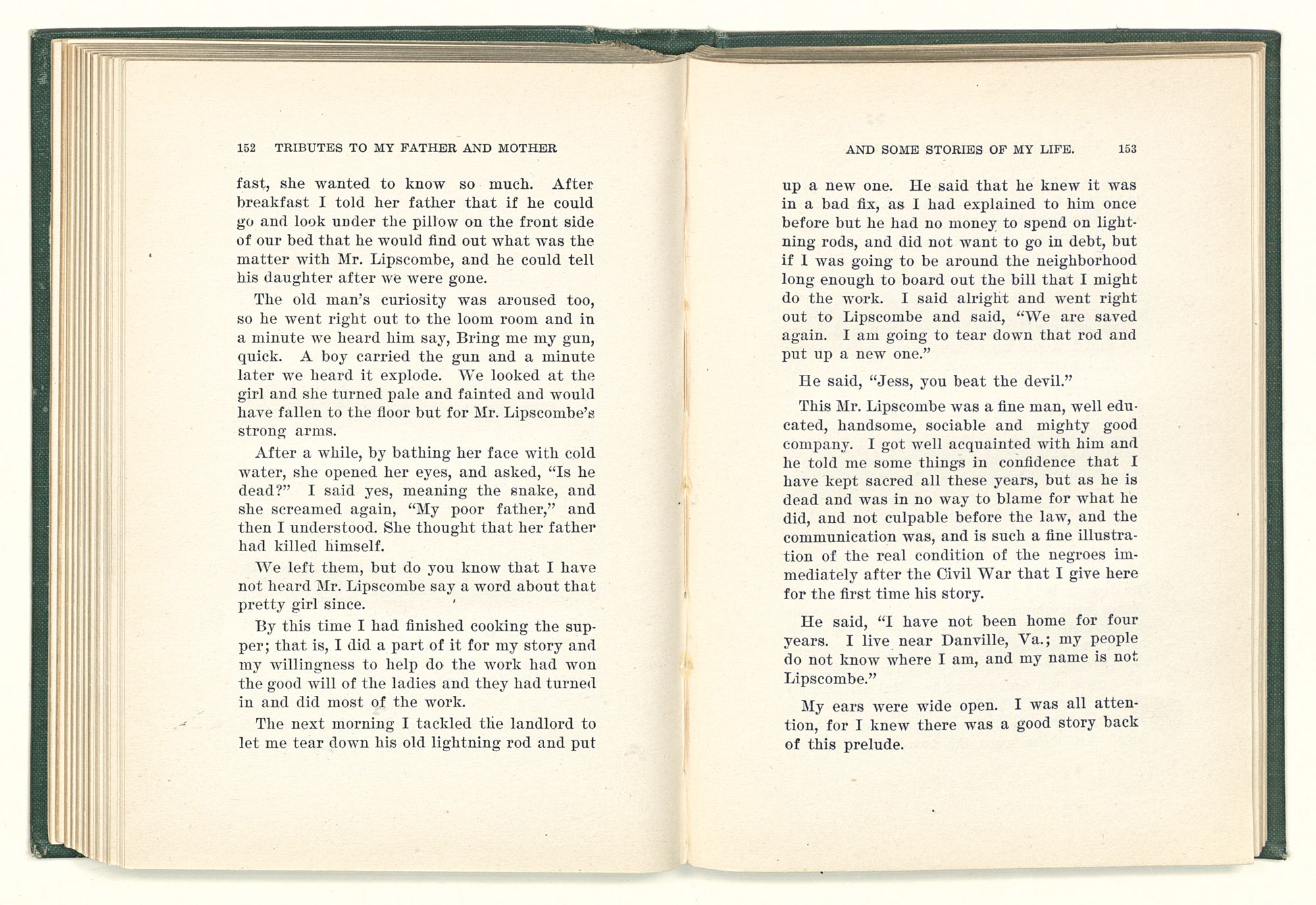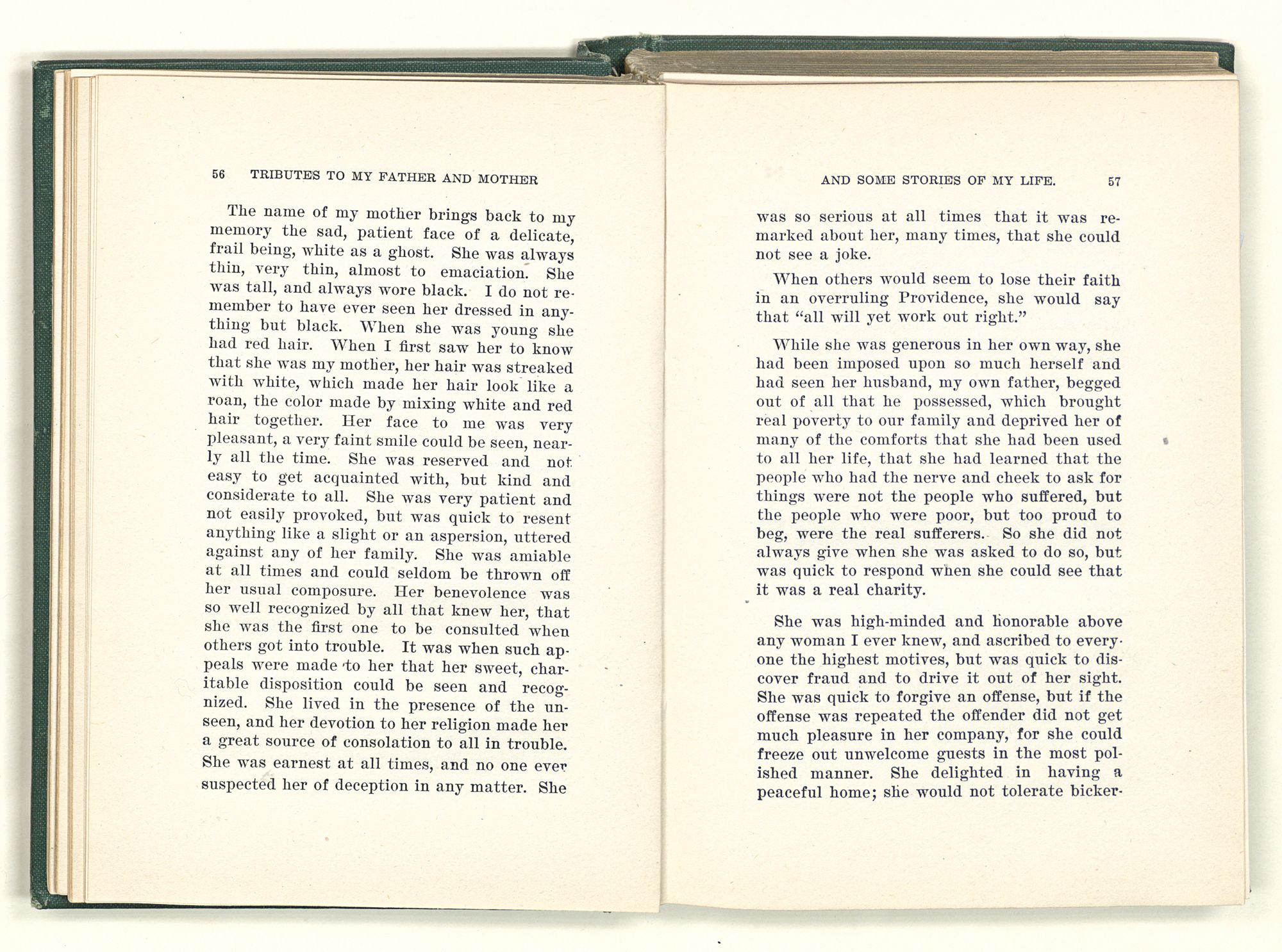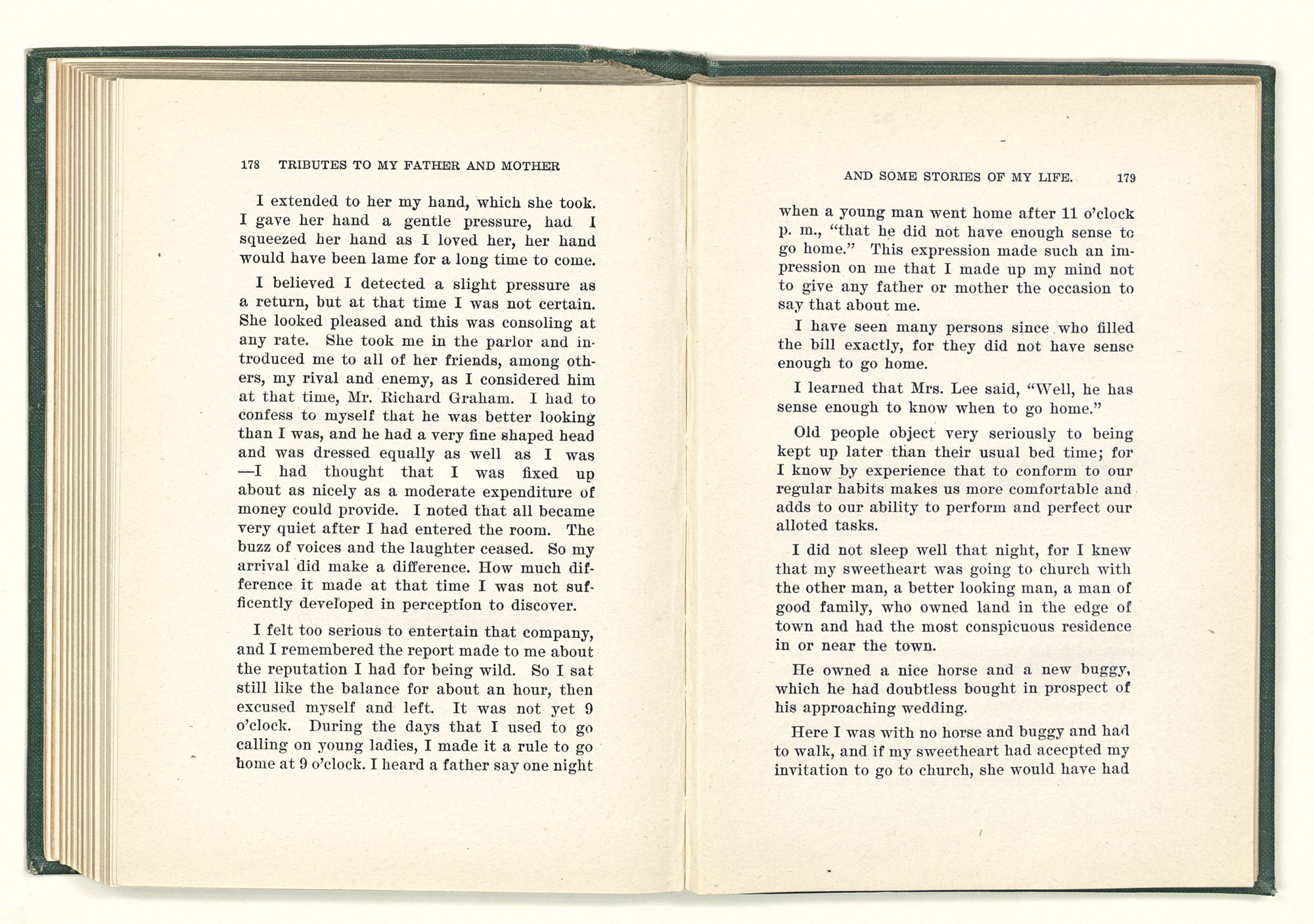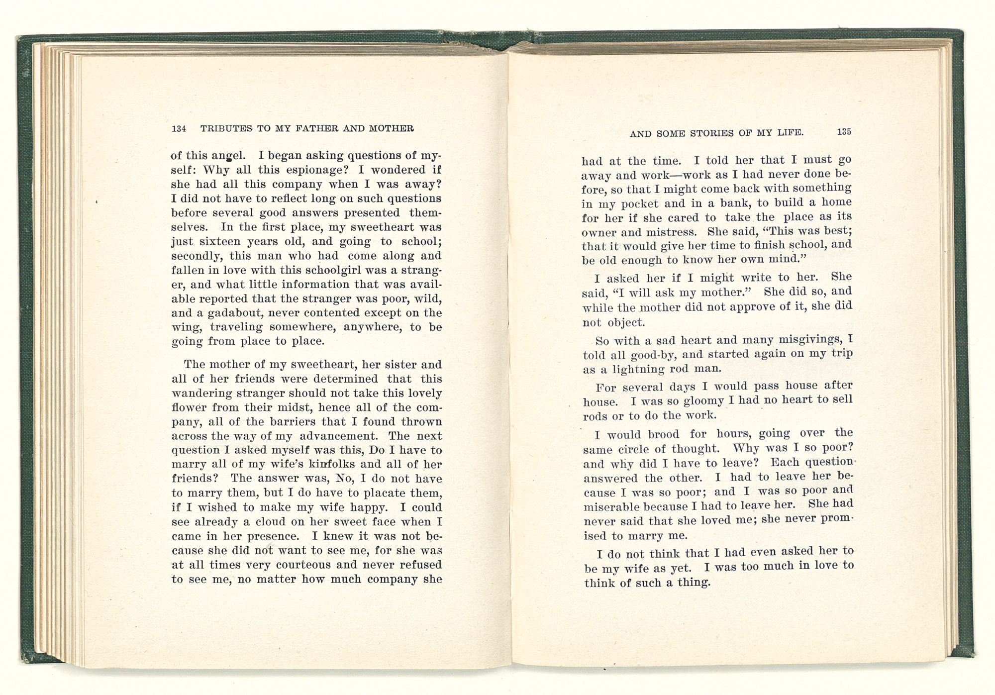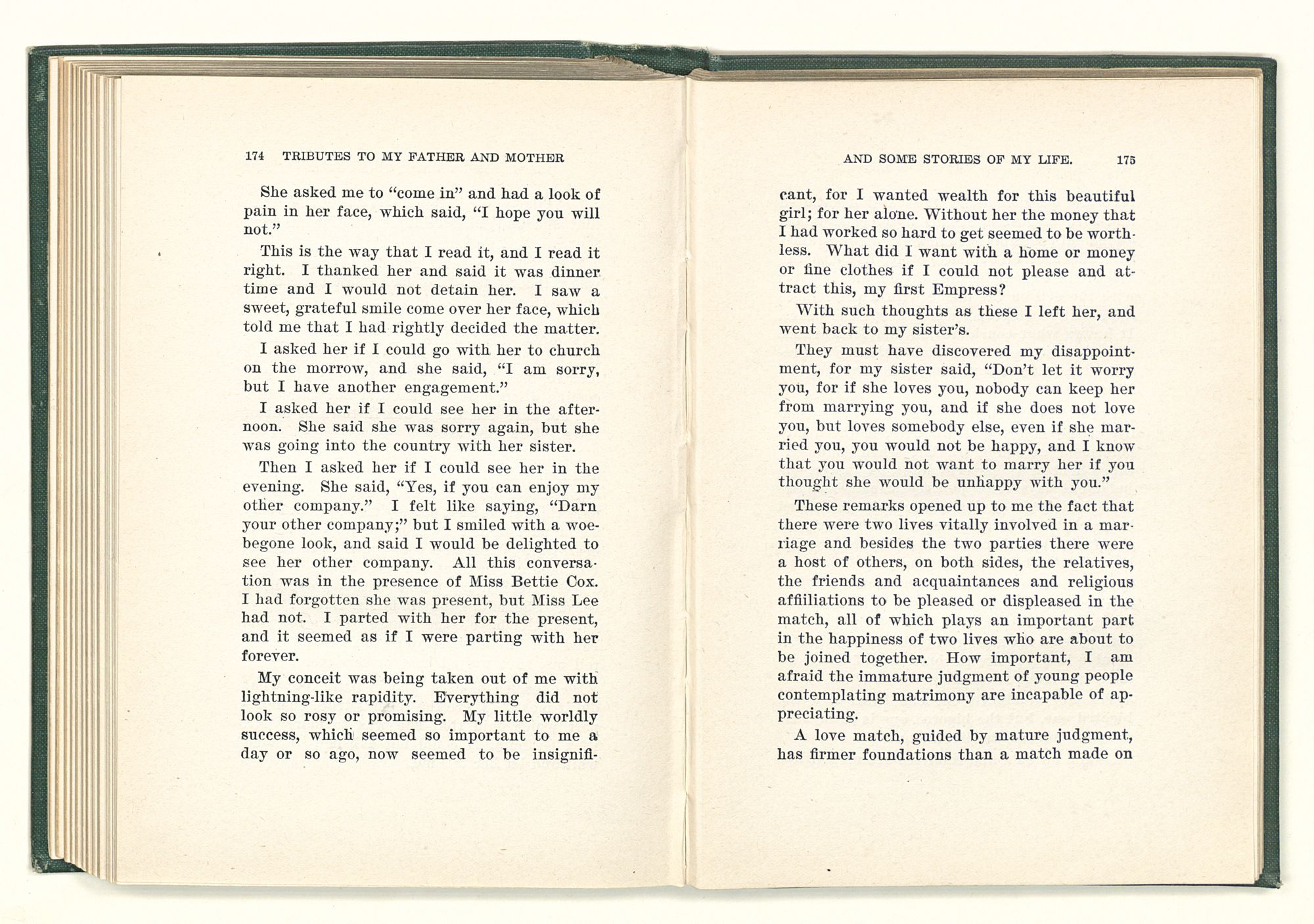given the money to build a church in a section of the state where there was none, and had bought the old saddle for a very small price and borrowed a horse to do his missionary work with; and when his journey was finished, he had returned the horse and brought the old saddle home on his back to use at some future time. He put his name on the back of some man's note as an endorsement, and when the note came due, the man did not have the money to pay with, and my father was asked to pay, but he did not have the money either, and said so, but that he would pay when he got the money. The man who held the note asked my father why he put his name on a note when he had no money, my father, in his guilelessness said he did it because he had been asked to do so. This answer so enraged the holder of the note that he slapped my father's face, and my father deliberately turned his other cheek and said to the man, “You may slap the other cheek if you want to.” I have known many good men, but I have never seen another one as good as my father. He was accessible to rich and poor alike. There was nothing that he possessed that he would not give away if some one would ask him for it. There was never a minute, night or day that he would reserve for himself or family, all his time was at the disposal of any one that would come and ask