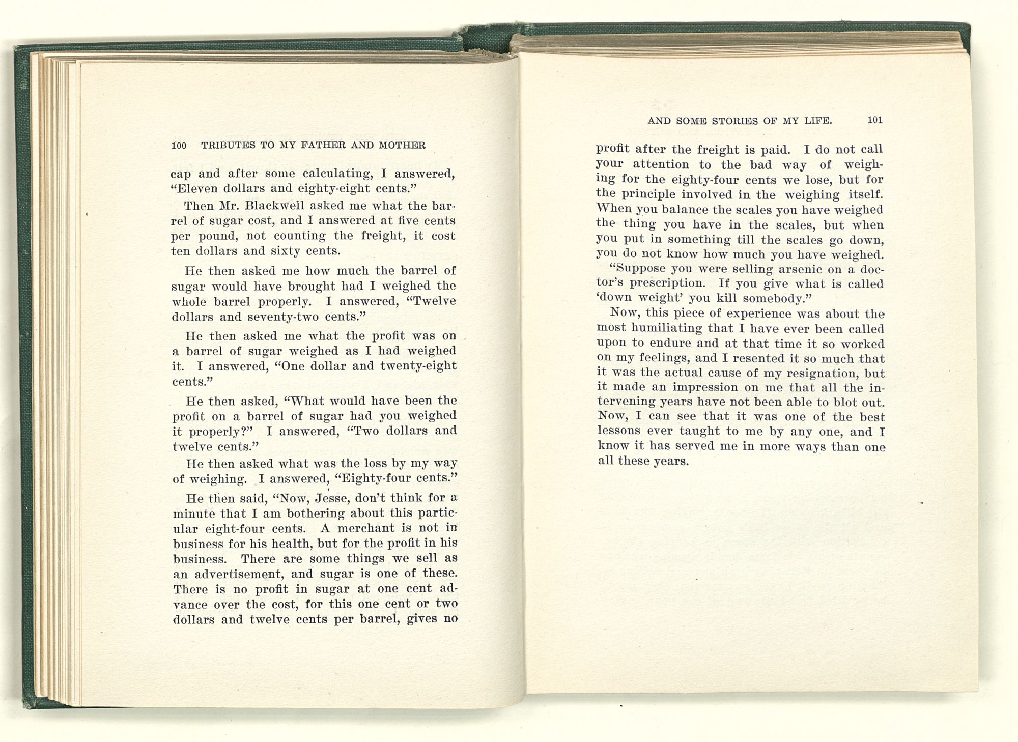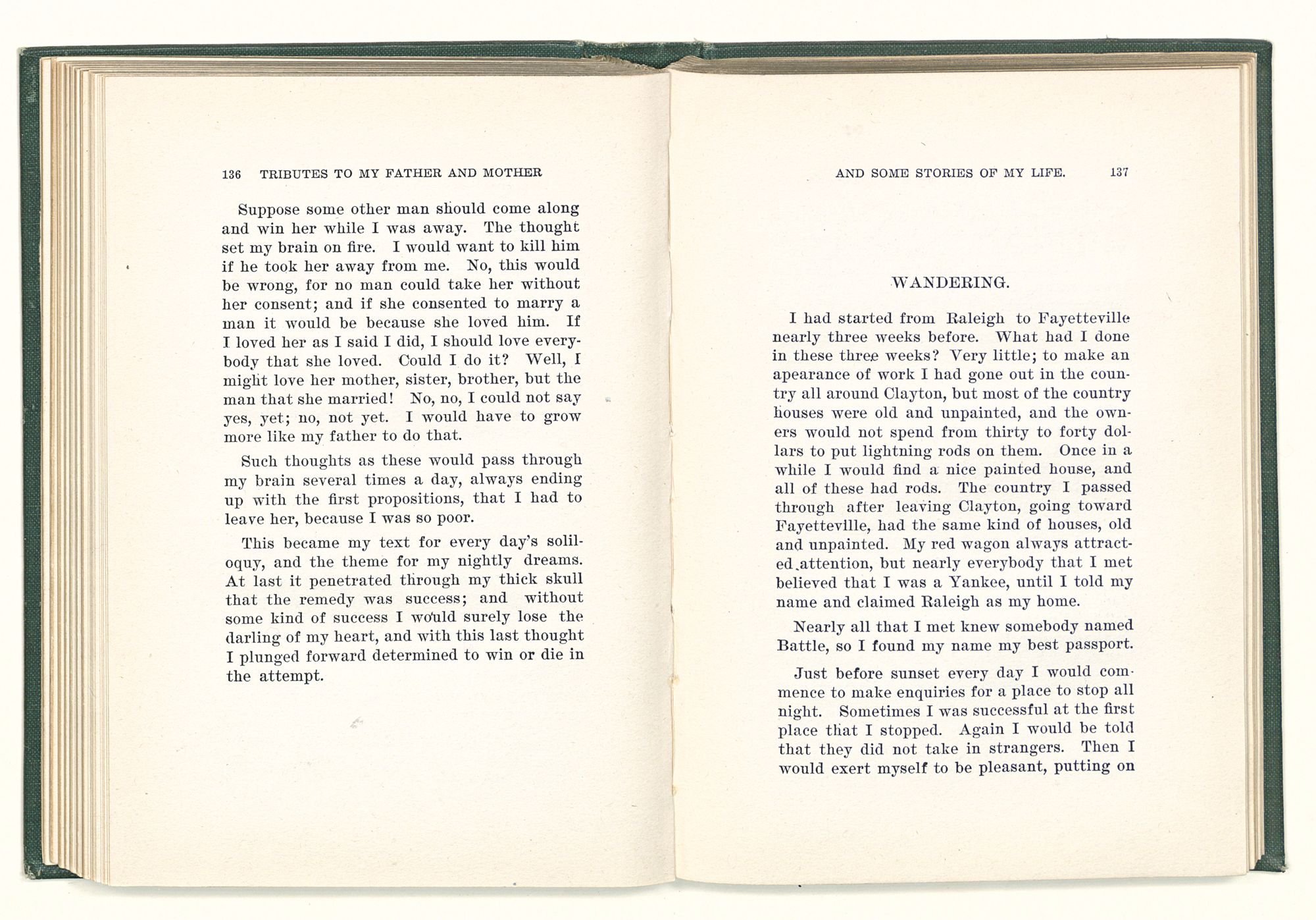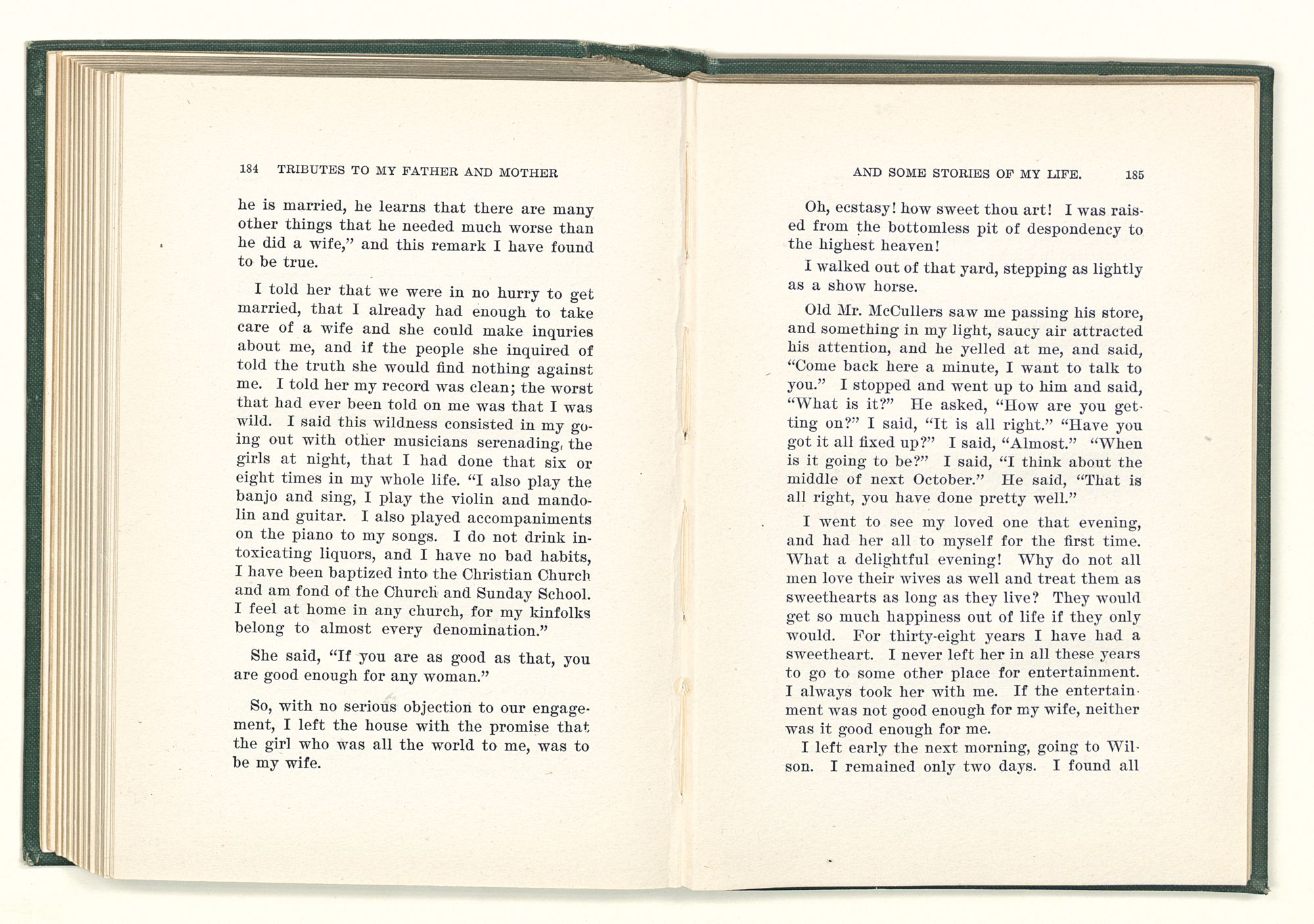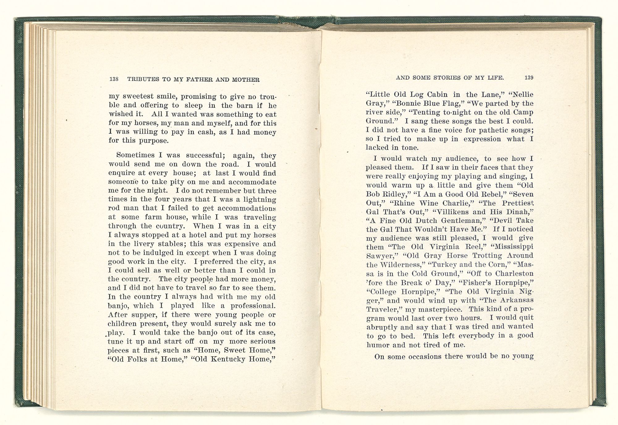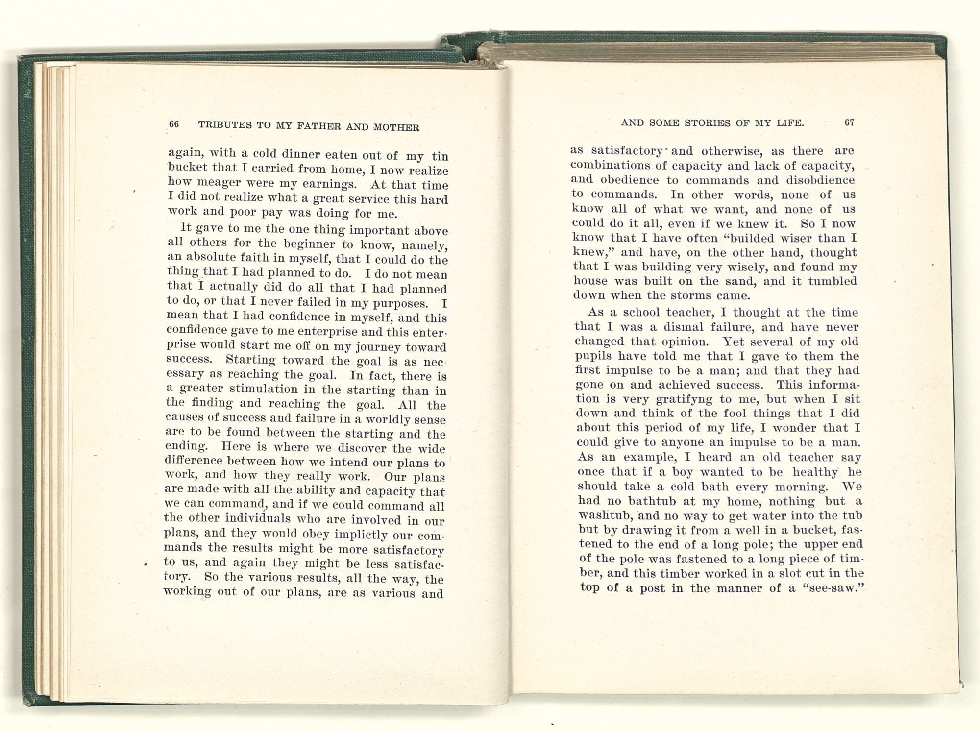 given the money to build a church in a section of the state where there was none, and had bought the old saddle for a very small price and borrowed a horse to do his missionary work with; and when his journey was finished, he had returned the horse and brought the old saddle home on his back to use at some future time. He put his name on the back of some man's note as an endorsement, and when the note came due, the man did not have the money to pay with, and my father was asked to pay, but he did not have the money either, and said so, but that he would pay when he got the money. The man who held the note asked my father why he put his name on a note when he had no money, my father, in his guilelessness said he did it because he had been asked to do so. This answer so enraged the holder of the note that he slapped my father's face, and my father deliberately turned his other cheek and said to the man, “You may slap the other cheek if you want to.” I have known many good men, but I have never seen another one as good as my father. He was accessible to rich and poor alike. There was nothing that he possessed that he would not give away if some one would ask him for it. There was never a minute, night or day that he would reserve for himself or family, all his time was at the disposal of any one that would come and ask