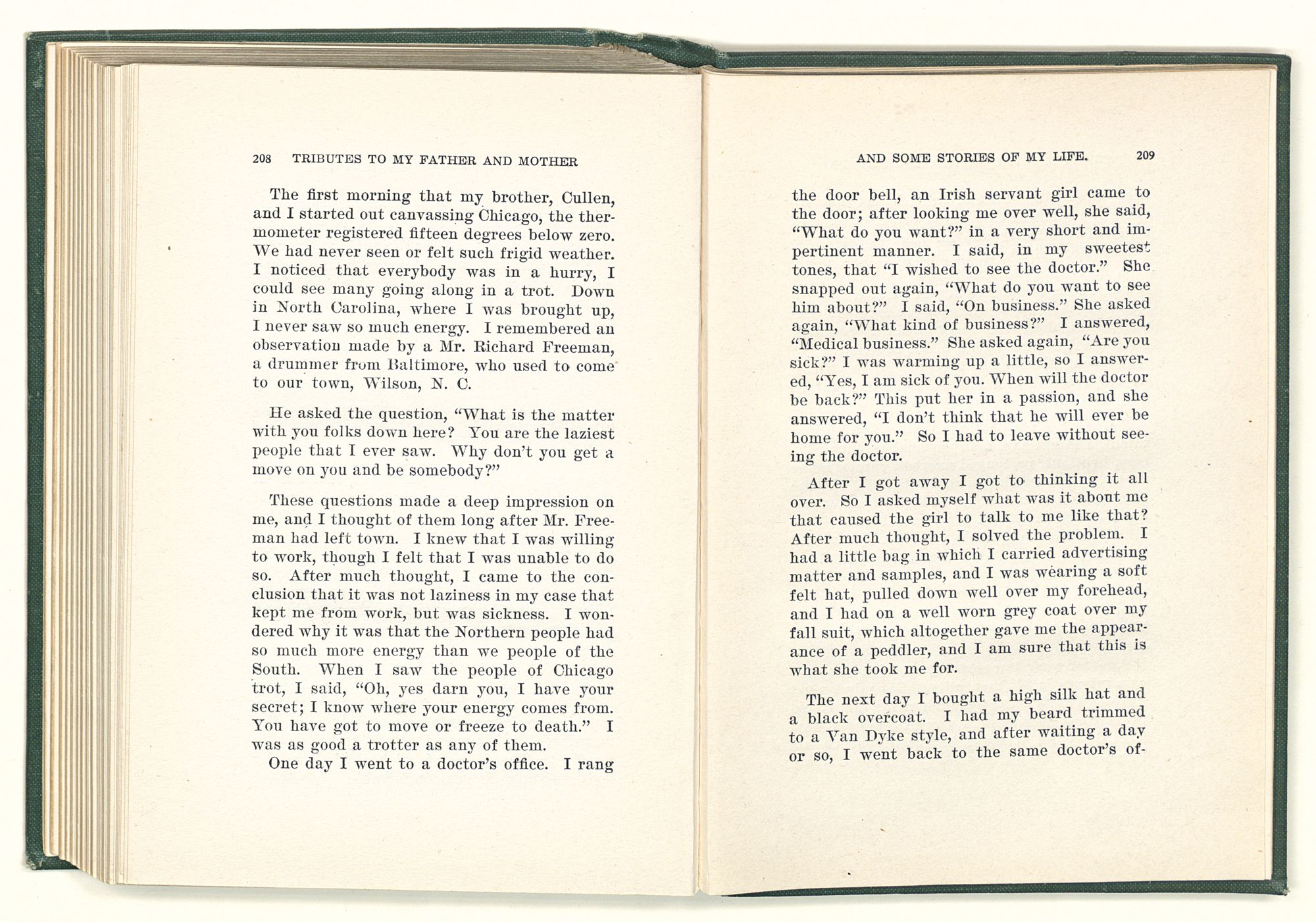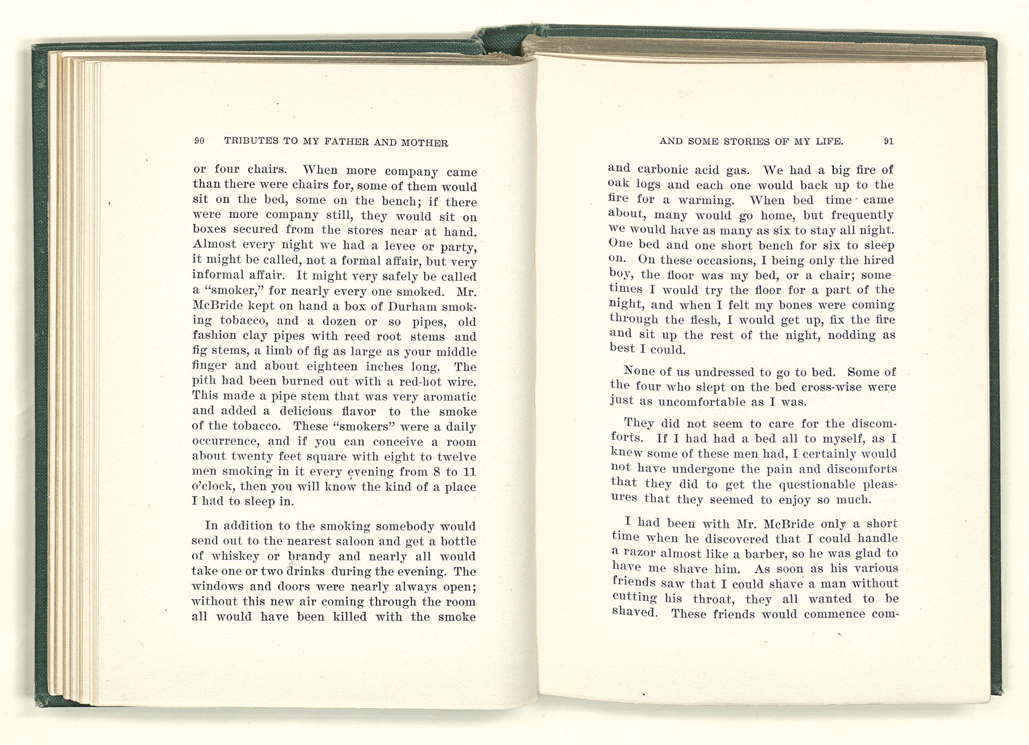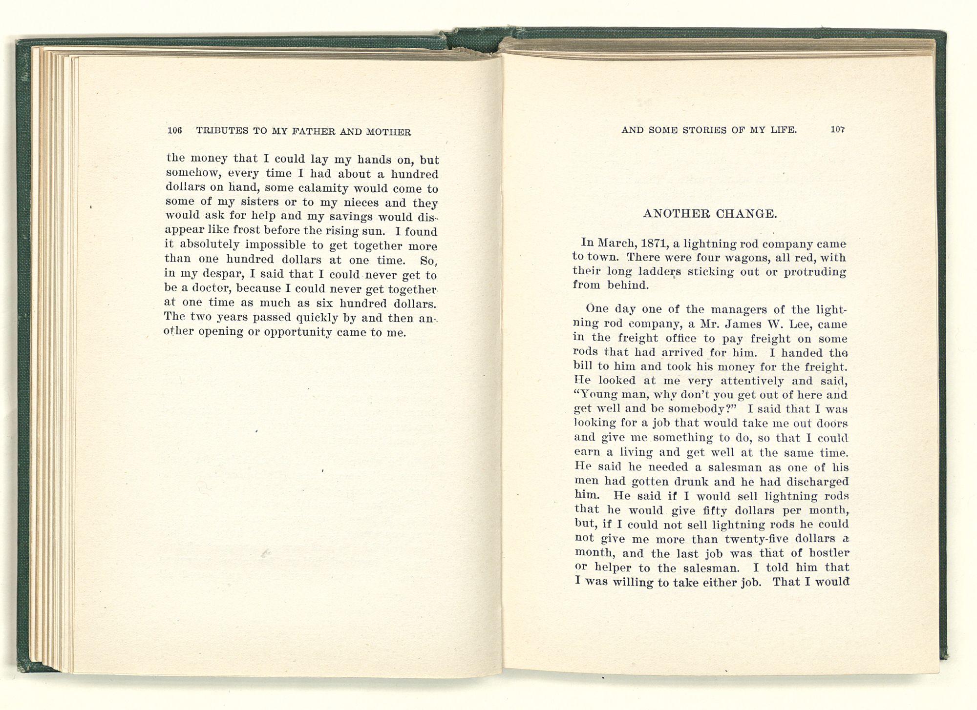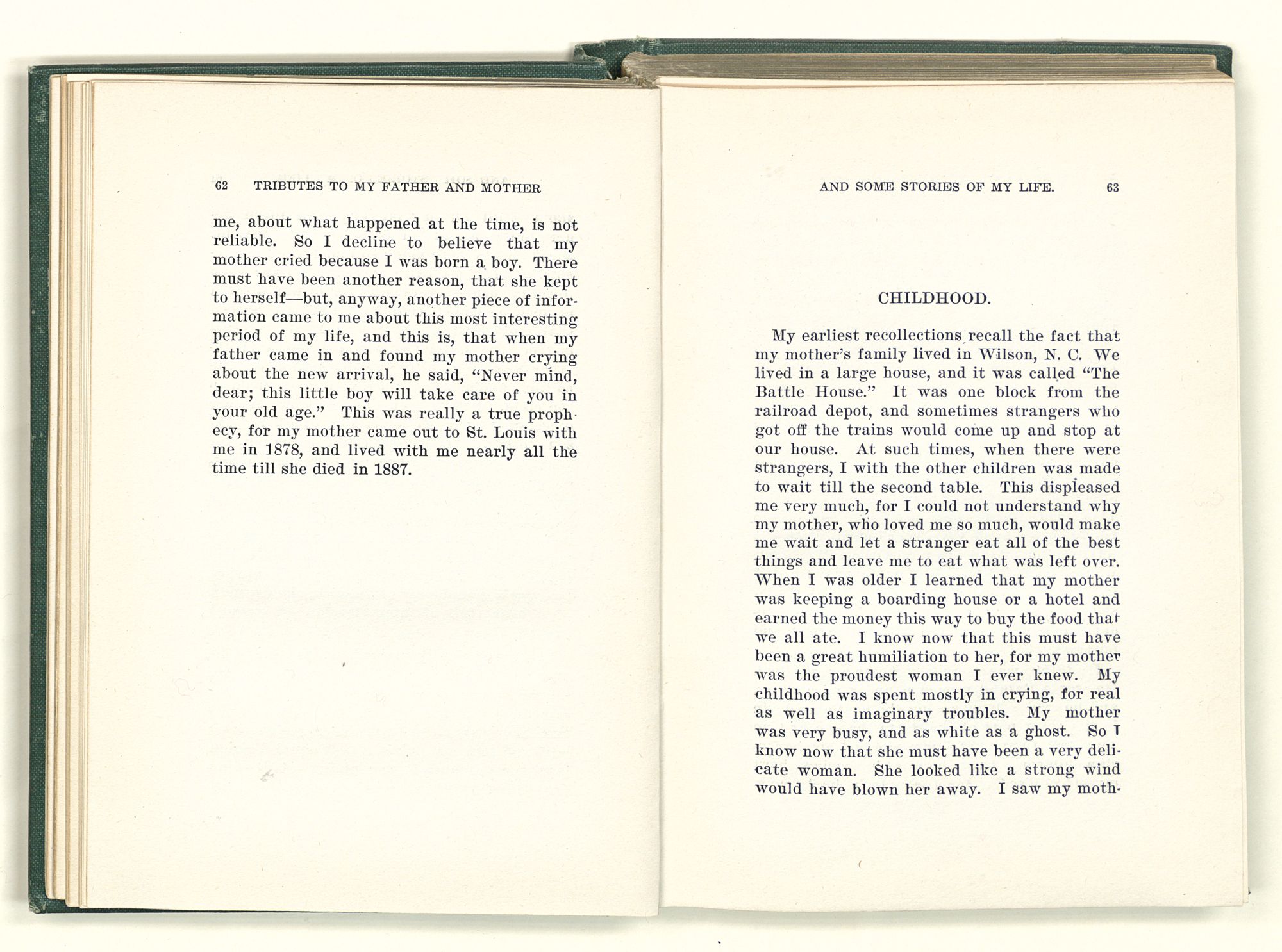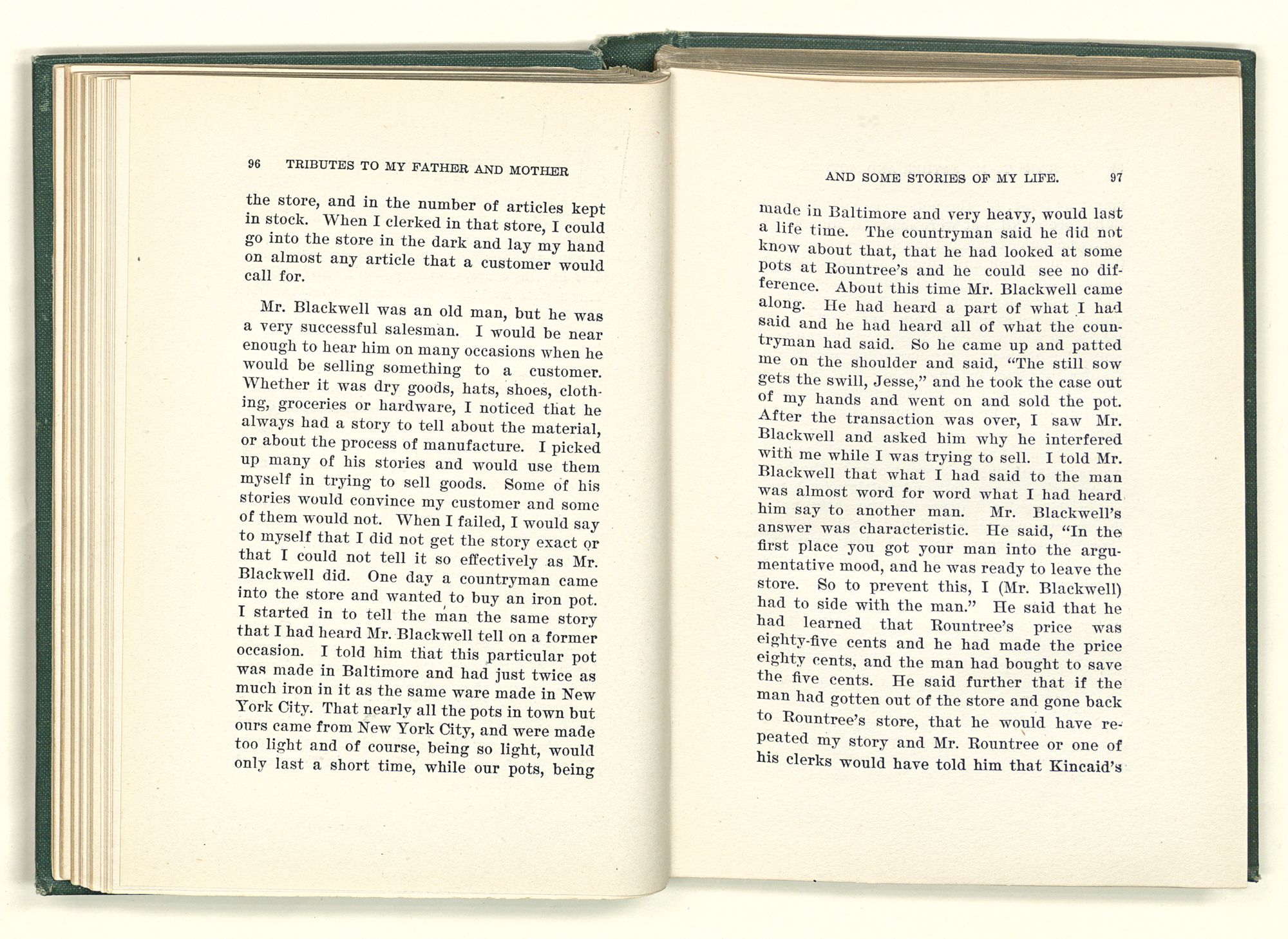 given the money to build a church in a section of the state where there was none, and had bought the old saddle for a very small price and borrowed a horse to do his missionary work with; and when his journey was finished, he had returned the horse and brought the old saddle home on his back to use at some future time. He put his name on the back of some man's note as an endorsement, and when the note came due, the man did not have the money to pay with, and my father was asked to pay, but he did not have the money either, and said so, but that he would pay when he got the money. The man who held the note asked my father why he put his name on a note when he had no money, my father, in his guilelessness said he did it because he had been asked to do so. This answer so enraged the holder of the note that he slapped my father's face, and my father deliberately turned his other cheek and said to the man, “You may slap the other cheek if you want to.” I have known many good men, but I have never seen another one as good as my father. He was accessible to rich and poor alike. There was nothing that he possessed that he would not give away if some one would ask him for it. There was never a minute, night or day that he would reserve for himself or family, all his time was at the disposal of any one that would come and ask