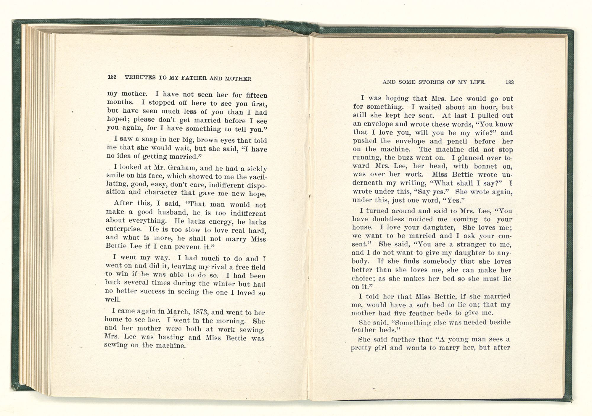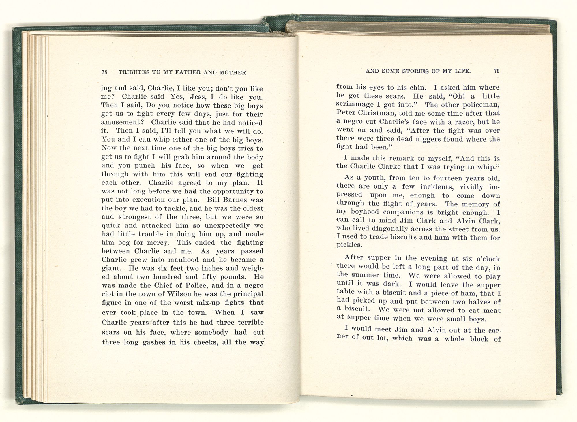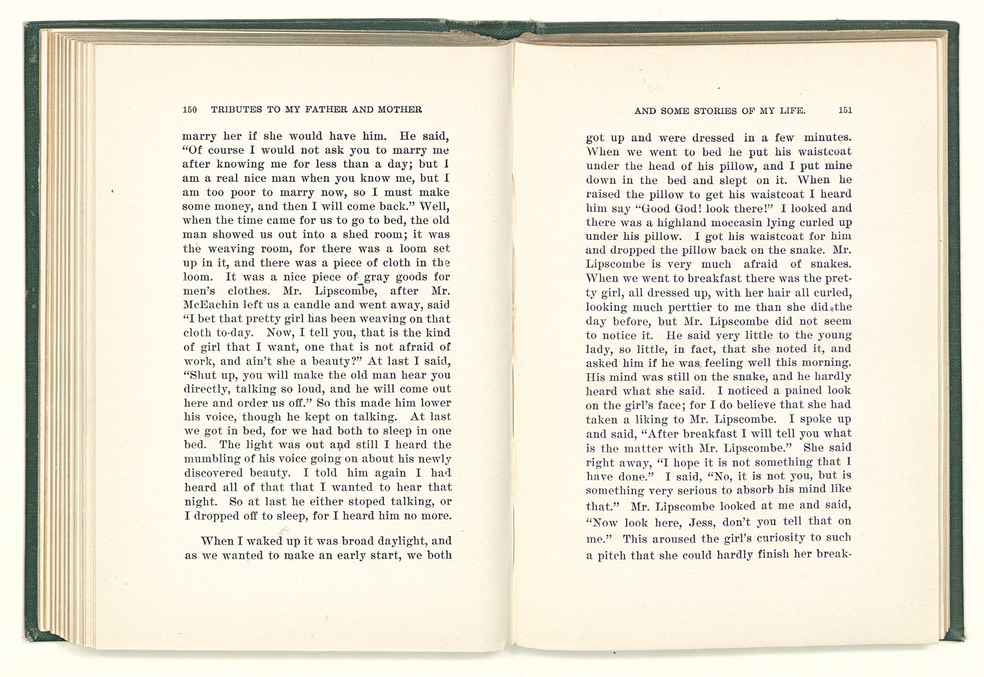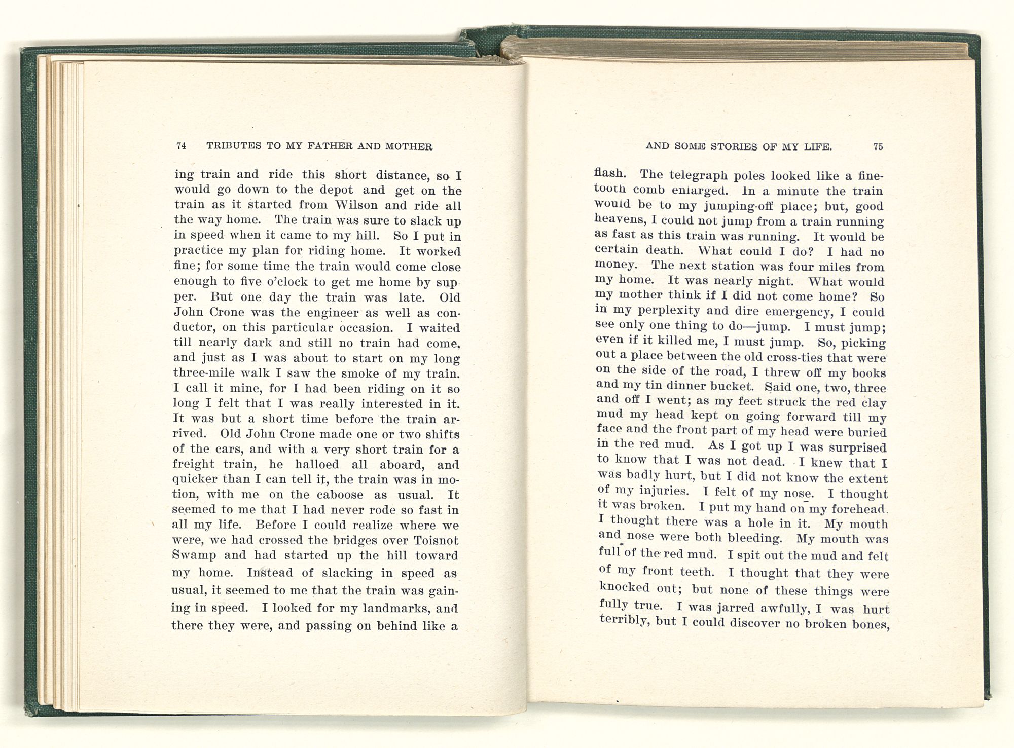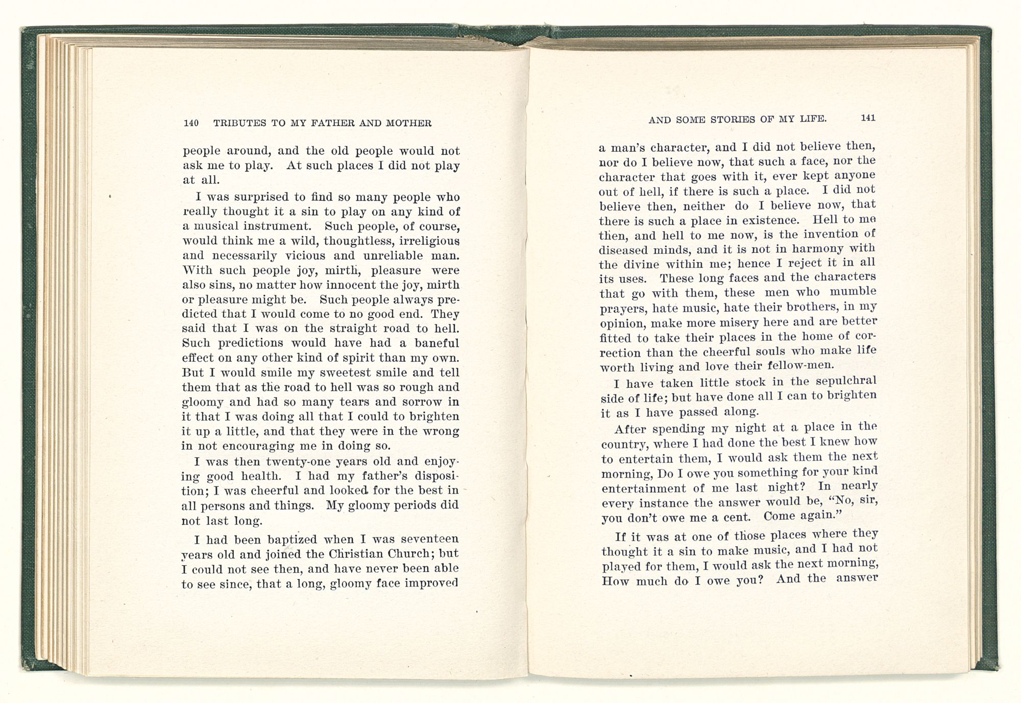 given the money to build a church in a section of the state where there was none, and had bought the old saddle for a very small price and borrowed a horse to do his missionary work with; and when his journey was finished, he had returned the horse and brought the old saddle home on his back to use at some future time. He put his name on the back of some man's note as an endorsement, and when the note came due, the man did not have the money to pay with, and my father was asked to pay, but he did not have the money either, and said so, but that he would pay when he got the money. The man who held the note asked my father why he put his name on a note when he had no money, my father, in his guilelessness said he did it because he had been asked to do so. This answer so enraged the holder of the note that he slapped my father's face, and my father deliberately turned his other cheek and said to the man, “You may slap the other cheek if you want to.” I have known many good men, but I have never seen another one as good as my father. He was accessible to rich and poor alike. There was nothing that he possessed that he would not give away if some one would ask him for it. There was never a minute, night or day that he would reserve for himself or family, all his time was at the disposal of any one that would come and ask