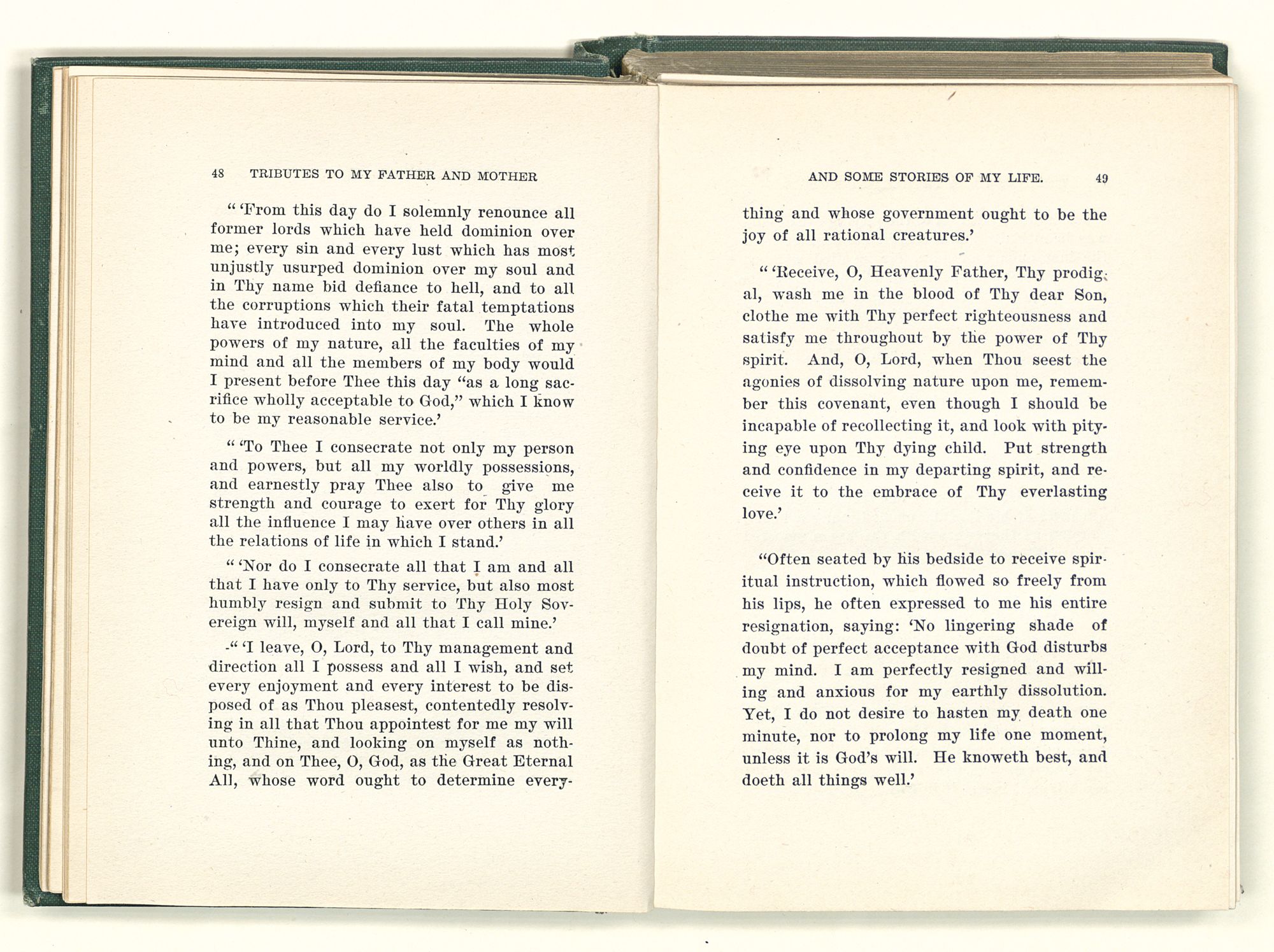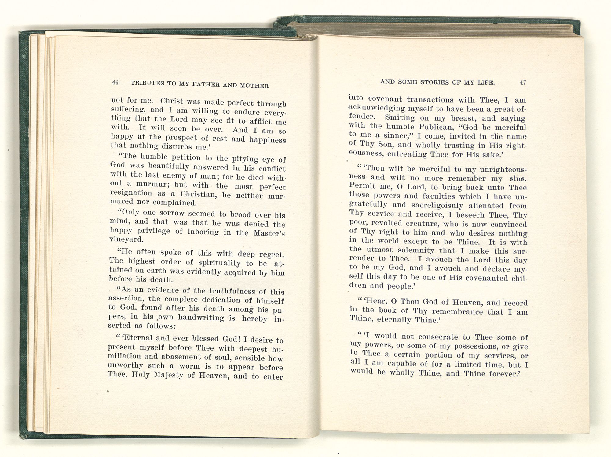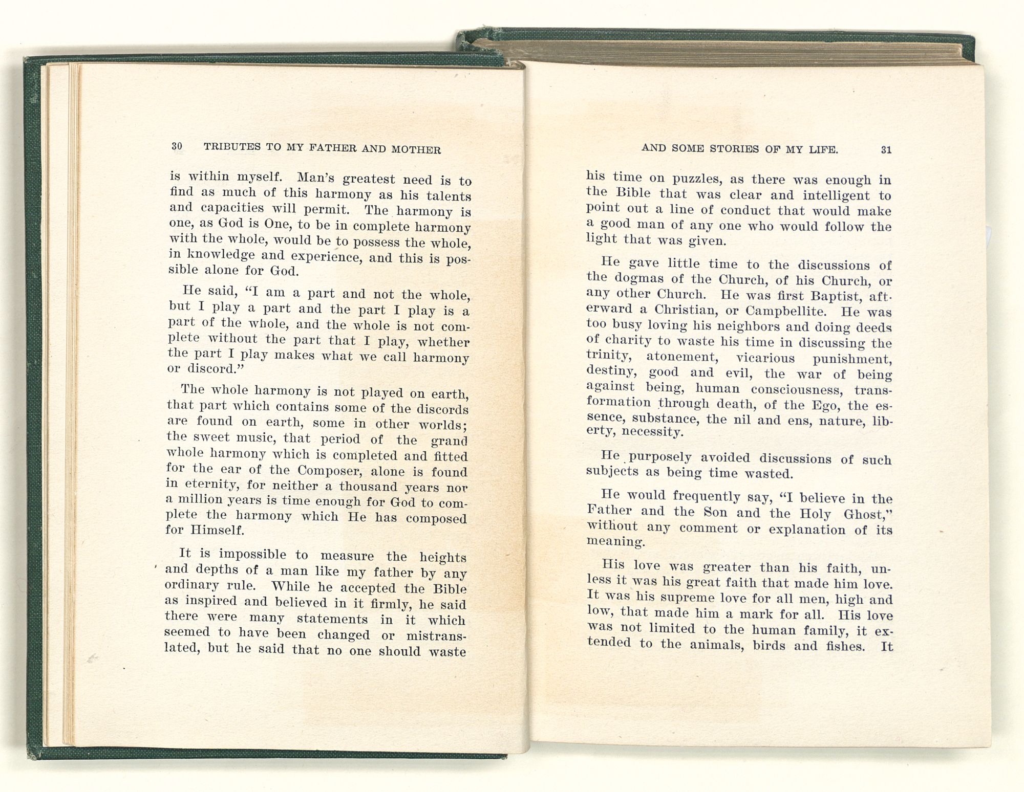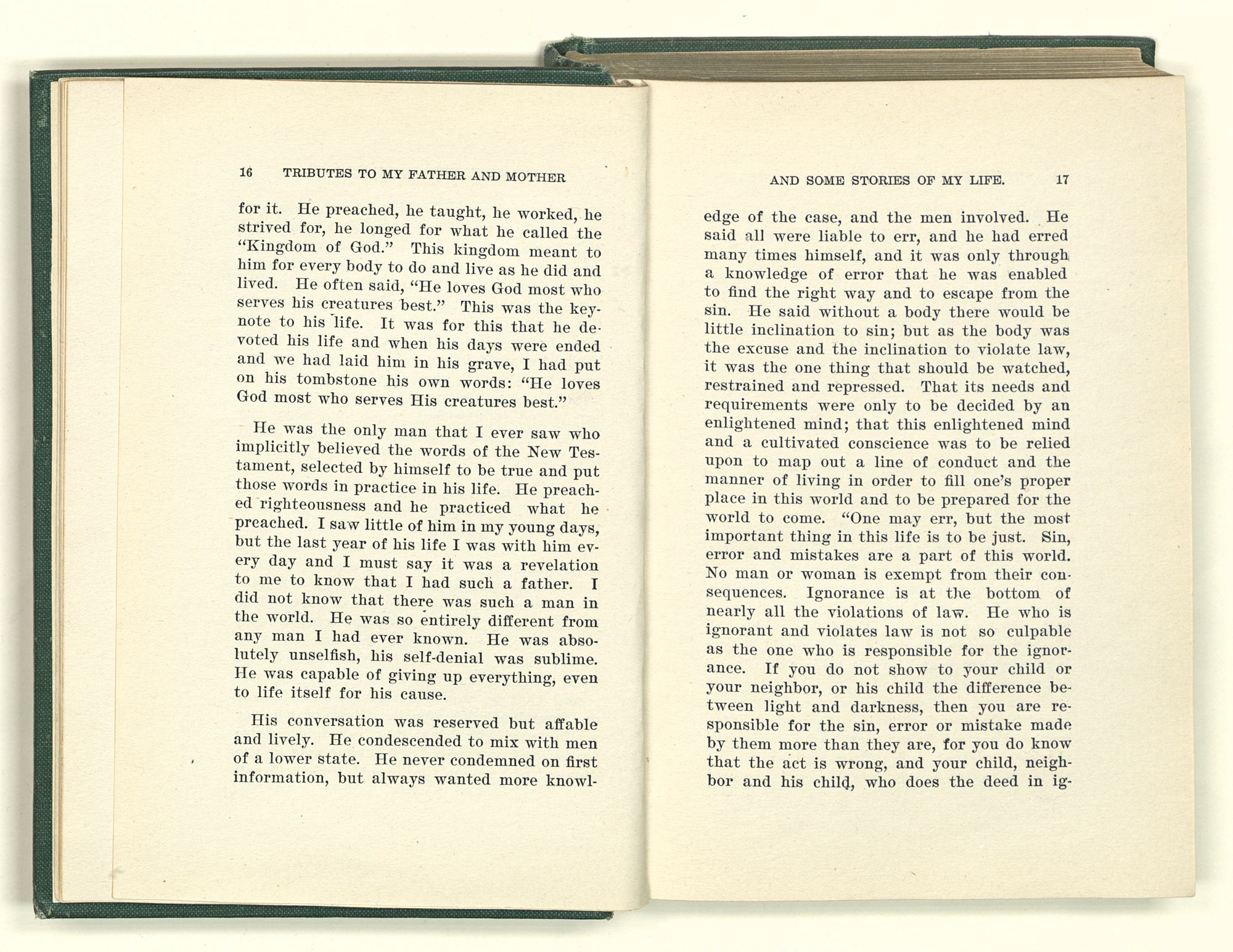 He was the only man that I ever saw who implicitly believed the words of the New Testament, selected by himself to be true and put those words in practice in his life. He preached righteousness and he practiced what he preached. I saw little of him in my young days, but the last year of his life I was with him every day and I must say it was a revelation to me to know that I had such a father. I did not know that there was such a man in the world. He was so entirely different from any man I had ever known. He was absolutely unselfish, his self-denial was sublime. He was capable of giving up everything, even to life itself for his cause.