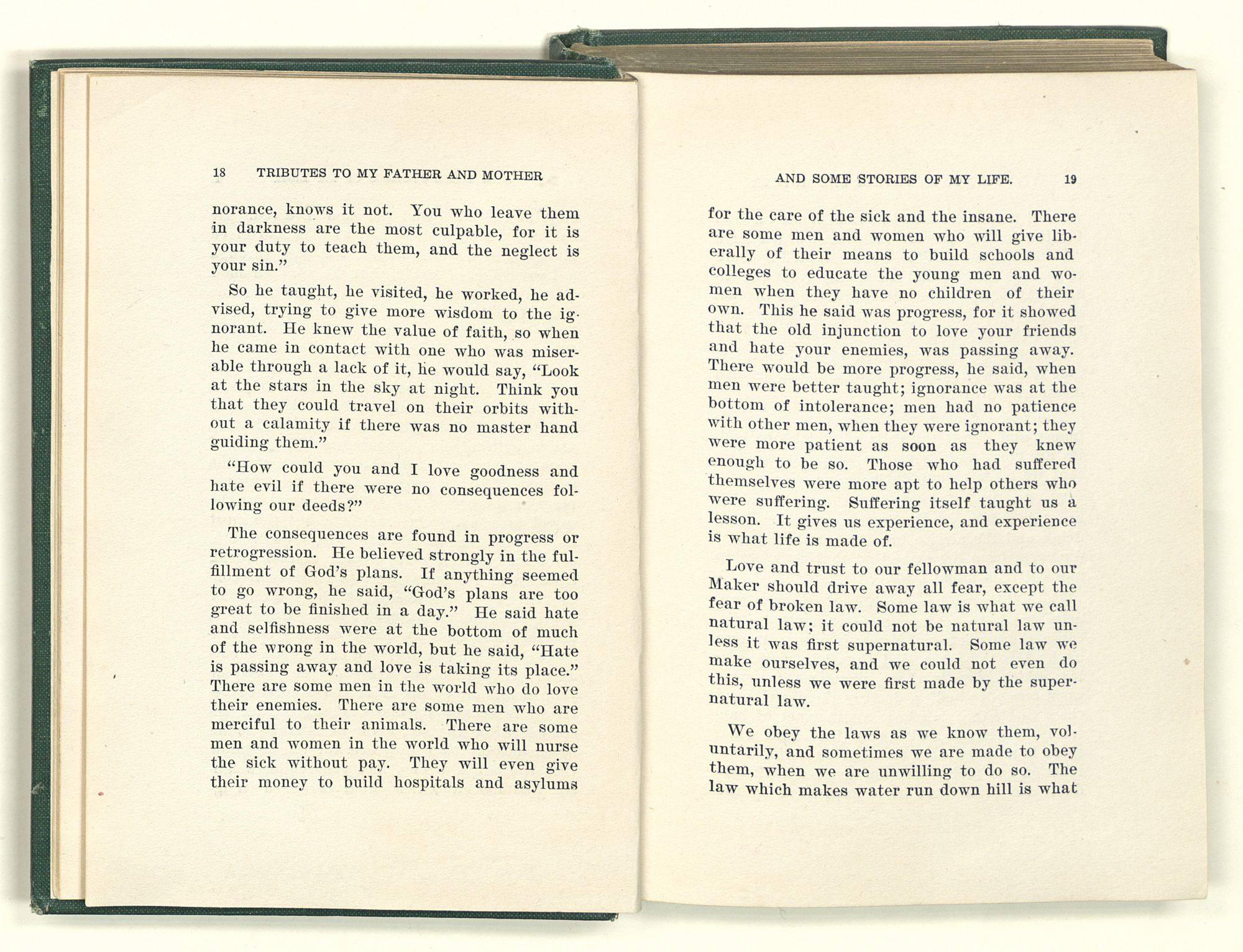 The consequences are found in progress or retrogression. He believed strongly in the fulfillment of God's plans. If anything seemed to go wrong, he said, “God's plans are too great to be finished in a day.” He said hate and selfishness were at the bottom of much of the wrong in the world, but he said, “Hate is passing away and love is taking its place.” There are some men in the world who do love their enemies. There are some men who are merciful to their animals. There are some men and women in the world who will nurse the sick without pay. They will even give their money to build hospitals and asylums