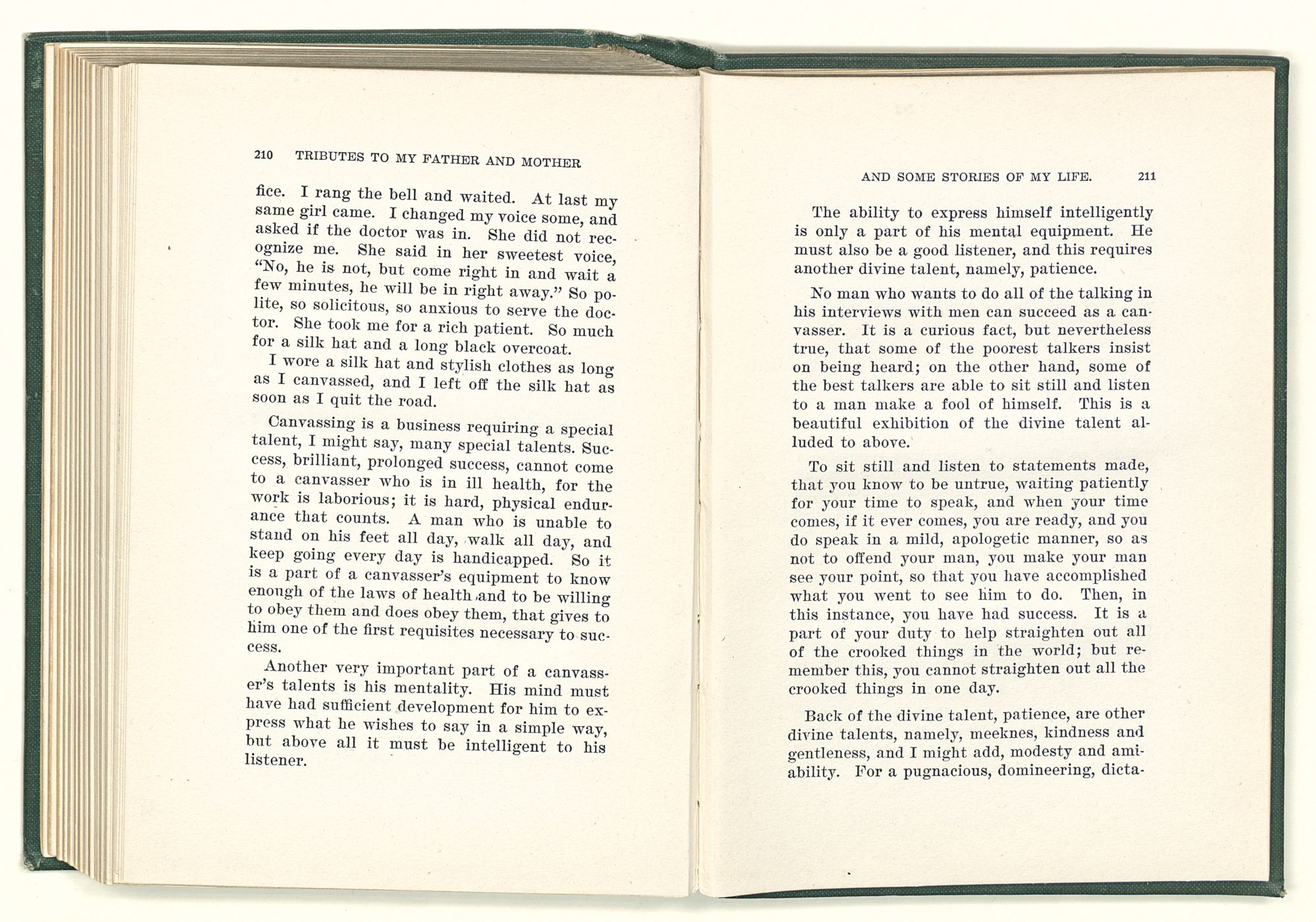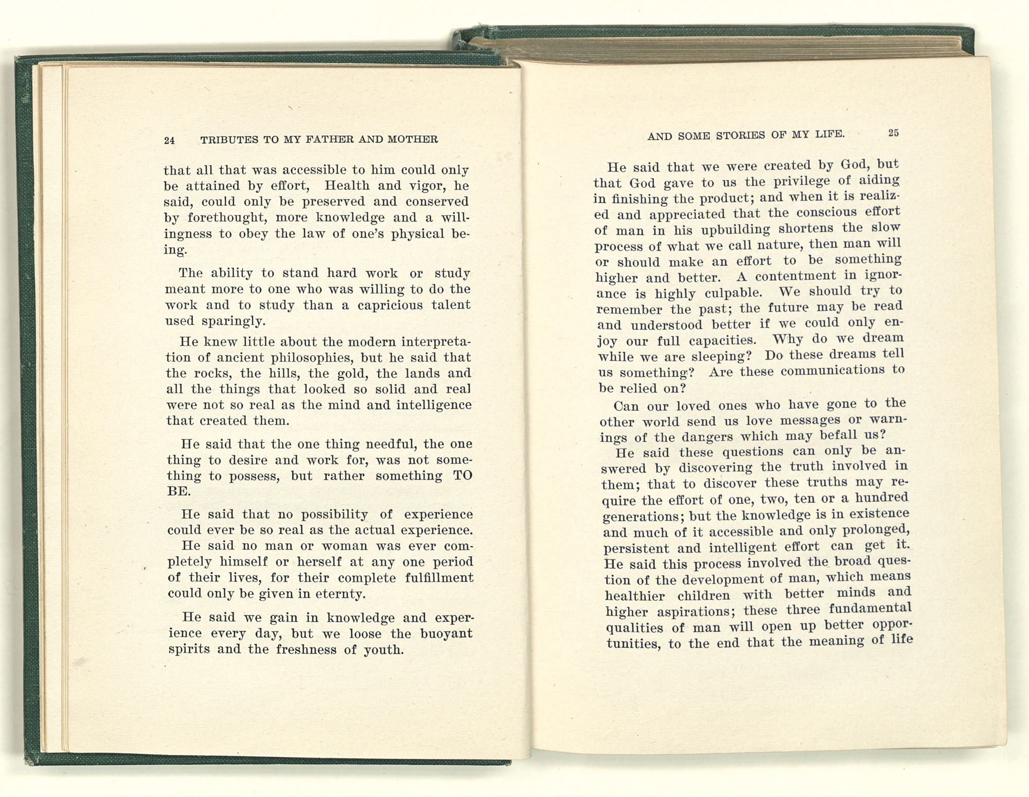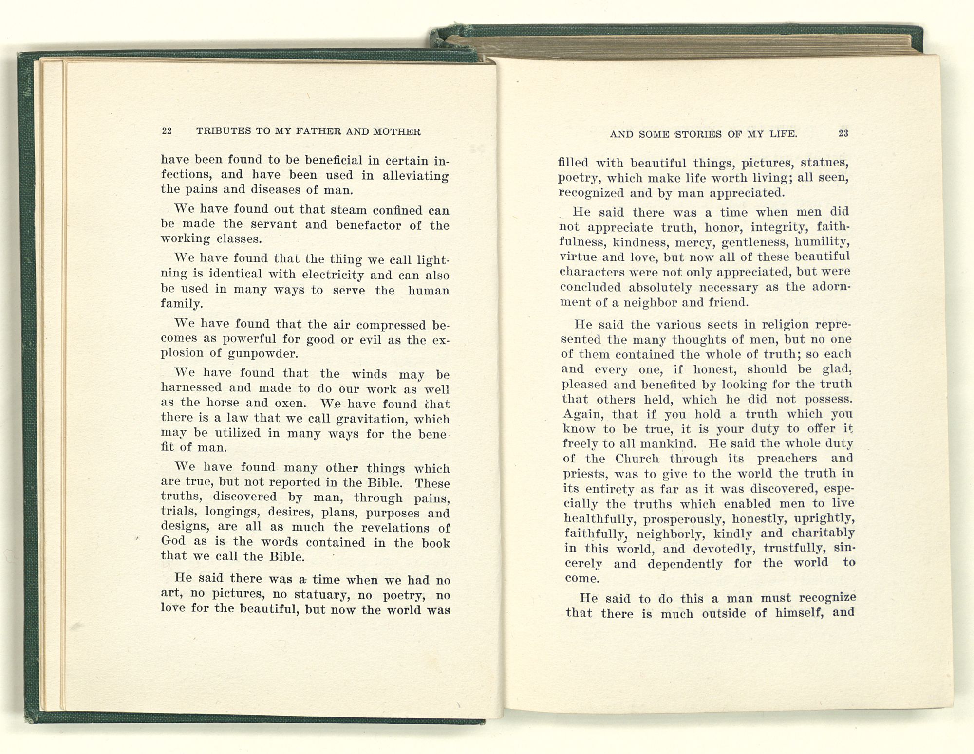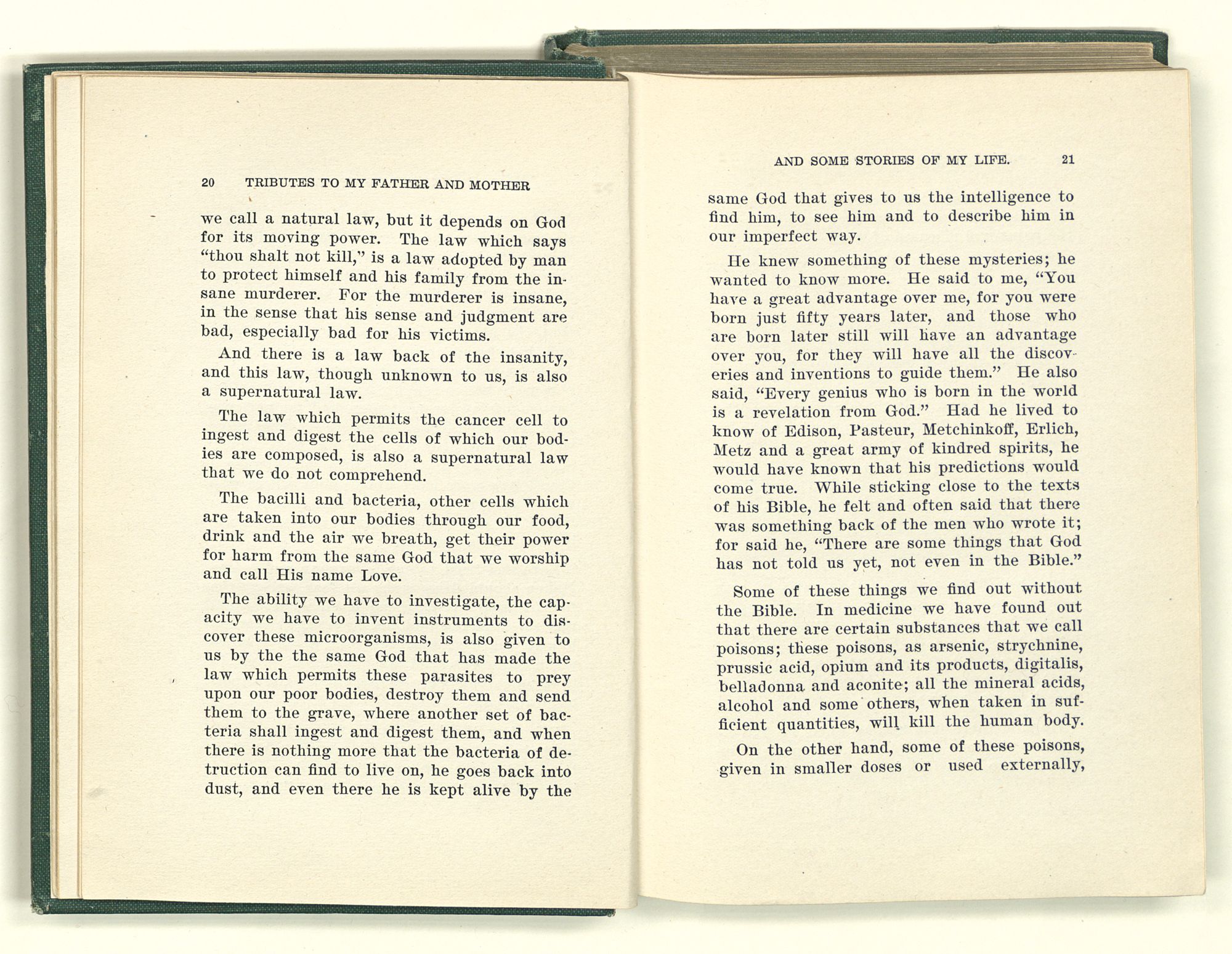 He knew something of these mysteries; he wanted to know more. He said to me, “You have a great advantage over me, for you were born just fifty years later, and those who are born later still will have an advantage over you, for they will have all the discoveries and inventions to guide them.” He also said, “Every genius who is born in the world is a revelation from God.” Had he lived to know of Edison, Pasteur, Metchinkoff, Erlich, Metz and a great army of kindred spirits, he would have known that his predictions would come true. While sticking close to the texts of his Bible, he felt and often said that there was something back of the men who wrote it; for said he, “There are some things that God has not told us yet, not even in the Bible.”
