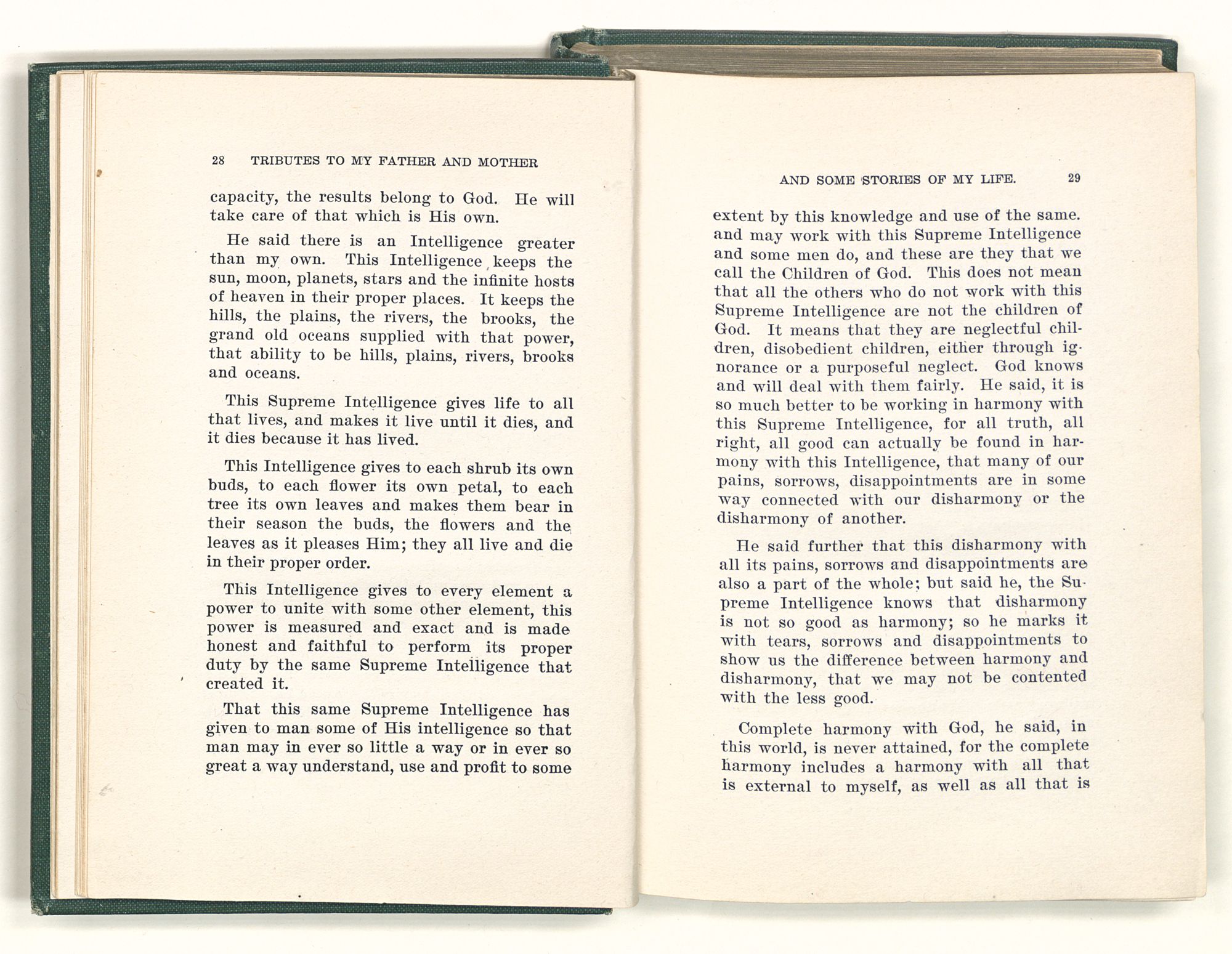 He said this world is just a part of another whole, and the whole included all the other worlds, and that each one was controlled by God and passed on through space according to His plans and pleasure. He said if it all works like a machine it is because an all-wise God could plan it and set it in motion and put behind it all and in it all that power and intelligence necessary to keep it as He wants it to be. In it all and a part of it all is man with some qualities which belong alone to him. He can think, plan, do things and then reflect and meditate on his plans and his deeds. Sometimes he is intelligent enough to discover his mistakes, his blunders and is willing to and does make an effort to correct them, and in some instances does so. This is one of the important ways that knowledge comes into the world. He said that our inability to use our full capacities made progress in the world very slow, but said he, this is for not making an effort with the capacities we do have; small capacities well used grow to be larger capacities and capacities or talents neglected are destroyed by the neglect. It is man's duty to make the effort whether with small or great