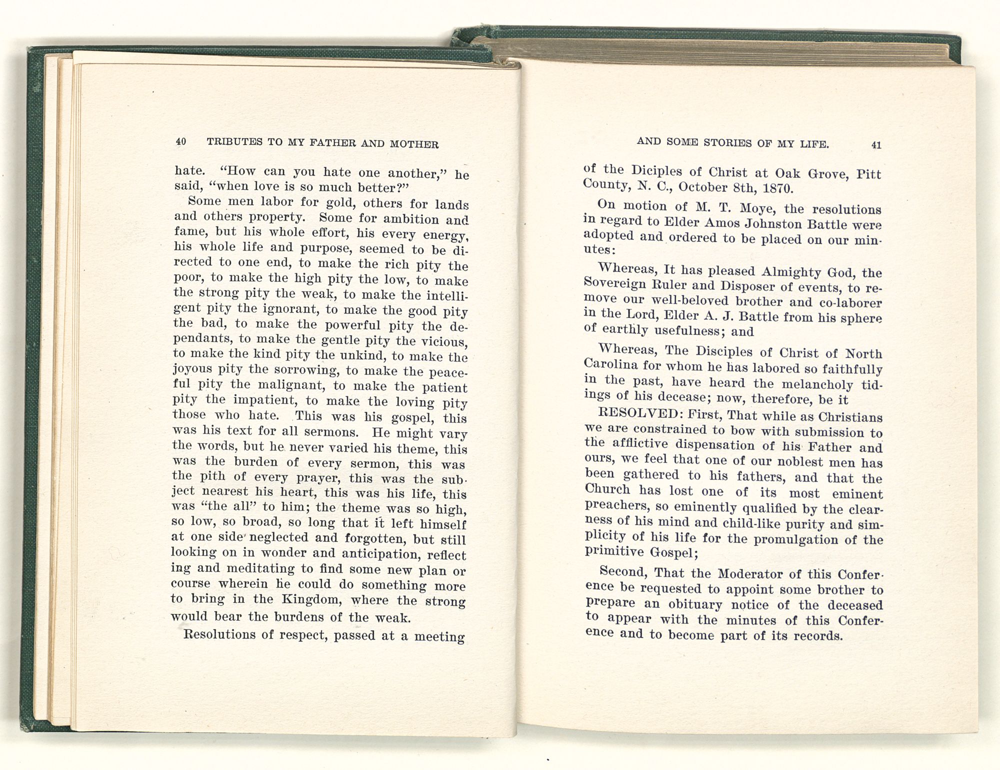 “Elder Amos Johnston Battle, son of Joel and Mary P. Battle, was born at Shell Bank, Edgecombe County, North Carolina, on the eleventh day of January, 1805. His parents, being of an influential family and having ample means, gave to their son the superior advantages of a good education, which he continued to enrich by close study and extensive reading during the whole of his laborious and useful life.
