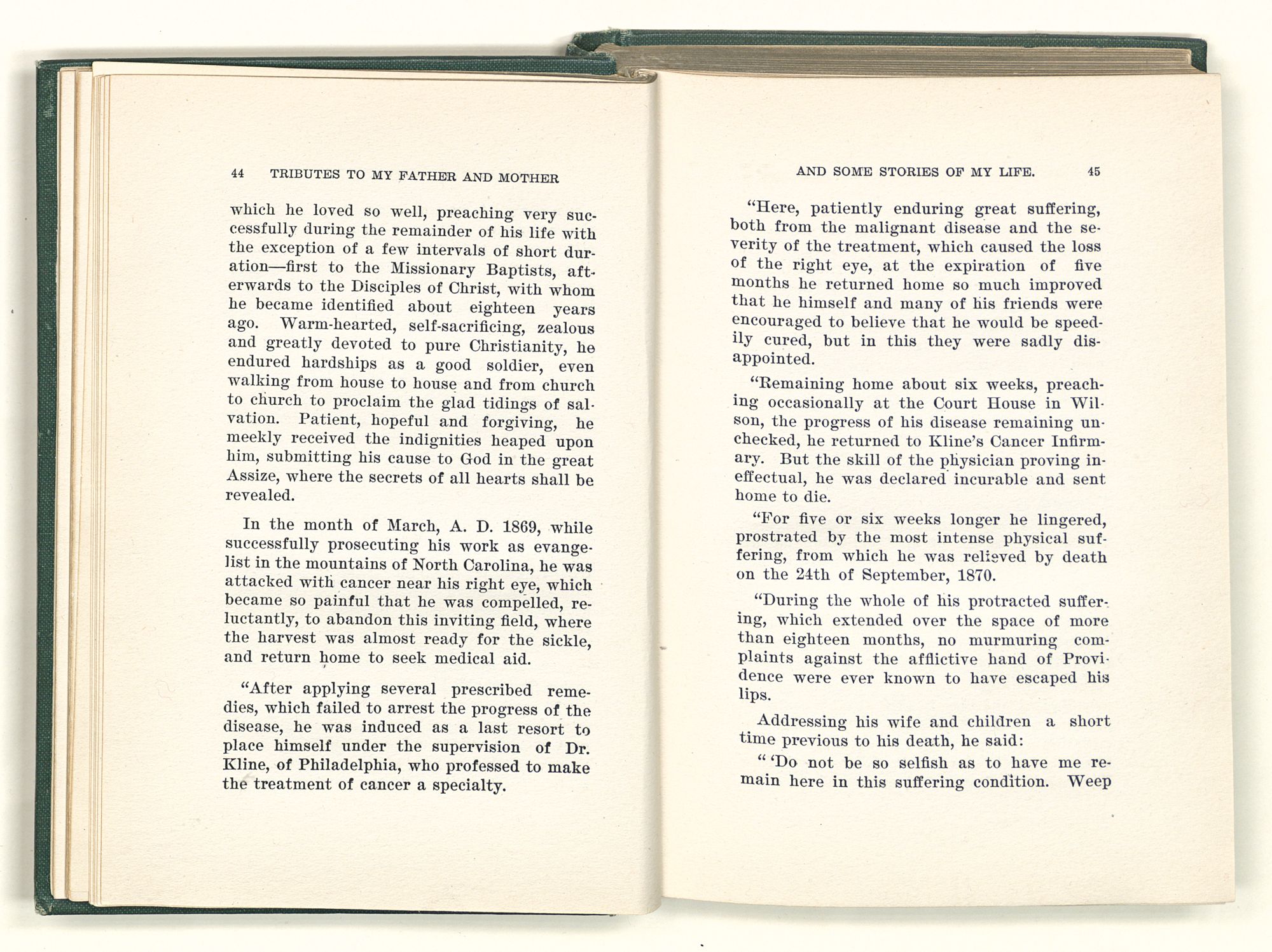 “In 1843 he moved to Wilson, N. C., where he lived until his death, spending his time traveling and preaching as an evangelist, sometimes in the eastern part of the State, and sometimes in the mountains. He was preaching at Rutherfordton when attacked with cancer near his right eye, from which he died in Wilson, September 24th, 1870.”