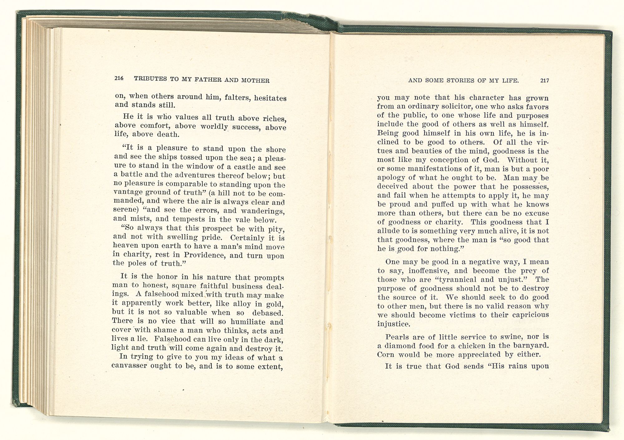 you may note that his character has grown from an ordinary solicitor, one who asks favors of the public, to one whose life and purposes include the good of others as well as himself. Being good himself in his own life, he is inclined to be good to others. Of all the virtues and beauties of the mind, goodness is the most like my conception of God. Without it, or some manifestations of it, man is but a poor apology of what he ought to be. Man may be deceived about the power that he possesses, and fail when he attempts to apply it, he may be proud and puffed up with what he knows more than others, but there can be no excuse of goodness or charity. This goodness that I allude to is something very much alive, it is not that goodness, where the man is “so good that he is good for nothing.”
