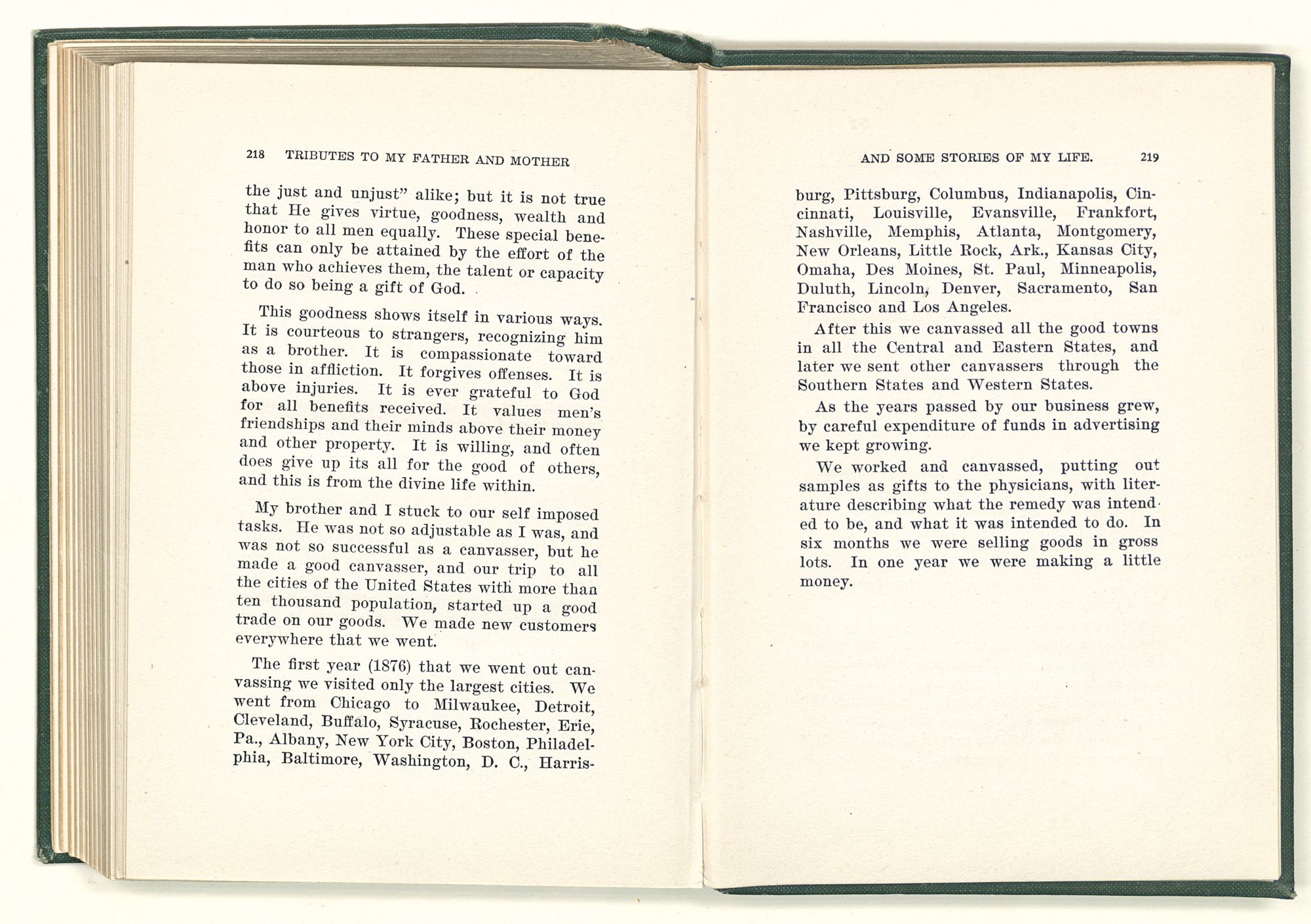 My brother and I stuck to our self imposed tasks. He was not so adjustable as I was, and was not so successful as a canvasser, but he made a good canvasser, and our trip to all the cities of the United States with more than ten thousand population, started up a good trade on our goods. We made new customers everywhere that we went.