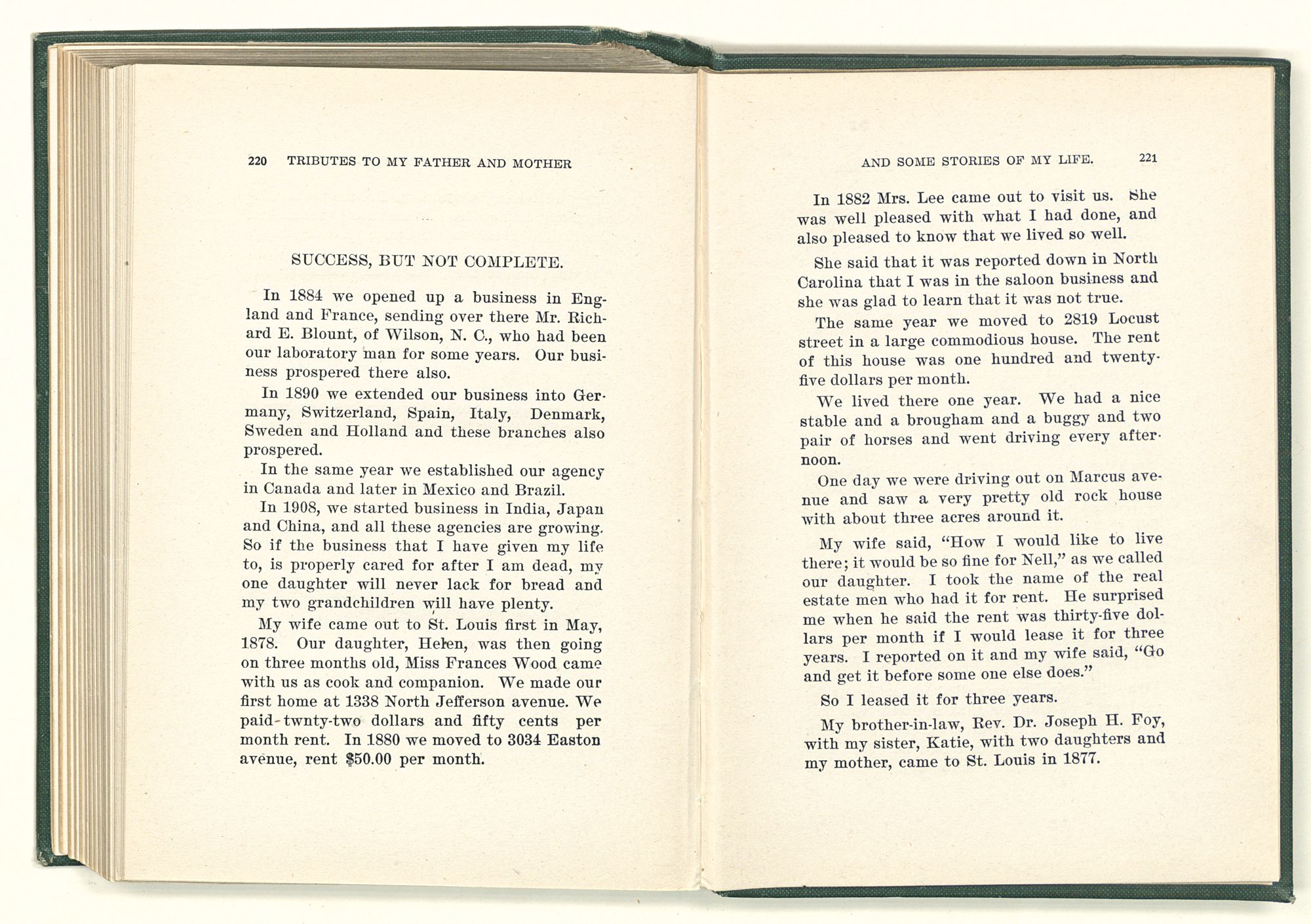 My wife came out to St. Louis first in May, 1878. Our daughter, Helen, was then going on three months old, Miss Frances Wood came with us as cook and companion. We made our first home at 1338 North Jefferson avenue. We paid twenty-two dollars and fifty cents per month rent. In 1880 we moved to 3034 Easton avenue, rent $50.00 per month.