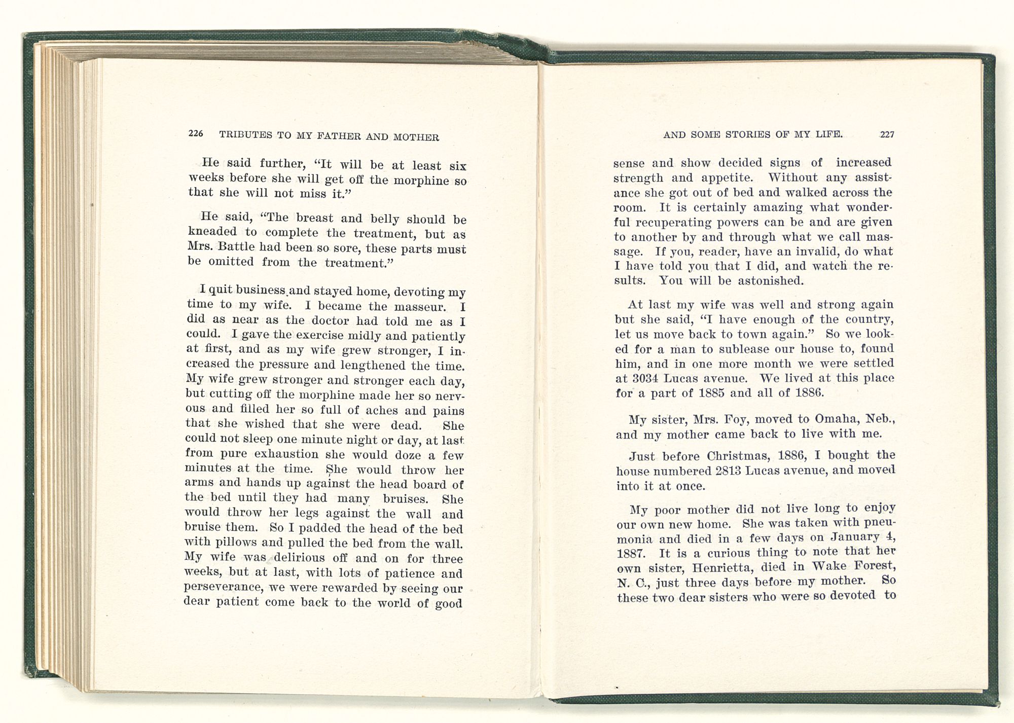 My poor mother did not live long to enjoy our own new home. She was taken with pneumonia and died in a few days on January 4, 1887. It is a curious thing to note that her own sister, Henrietta, died in Wake Forest, N. C., just three days before my mother. So these two dear sisters who were so devoted to