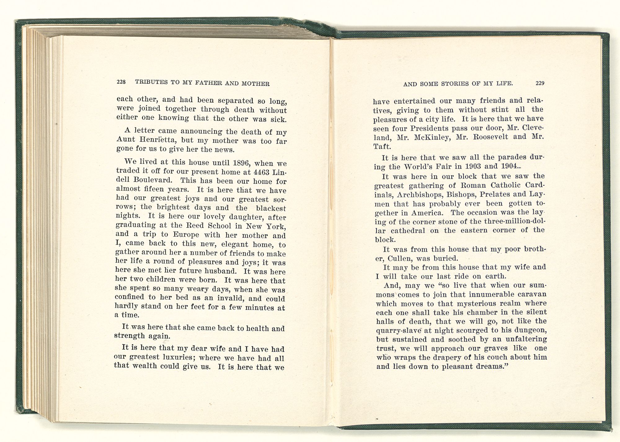 We lived at this house until 1896, when we traded it off for our present home at 4463 Lindell Boulevard. This has been our home for almost fifteen years. It is here that we have had our greatest joys and our greatest sorrows; the brightest days and the blackest nights. It is here our lovely daughter, after graduating at the Reed School in New York, and a trip to Europe with her mother and I, came back to this new, elegant home, to gather around her a number of friends to make her life a round of pleasures and joys; it was here she met her future husband. It was here her two children were born. It was here that she spent so many weary days, when she was confined to her bed as an invalid, and could hardly stand on her feet for a few minutes at a time.
