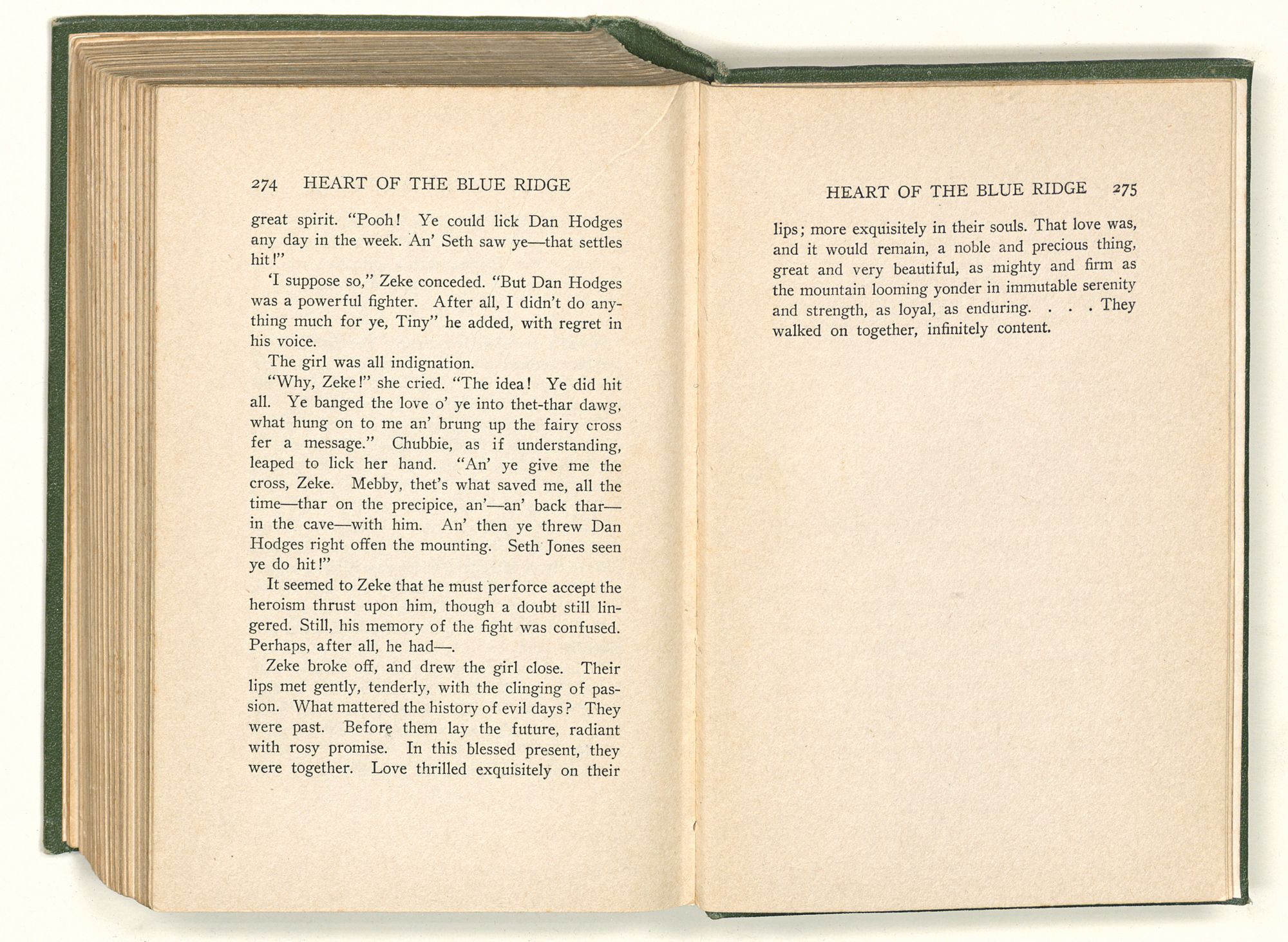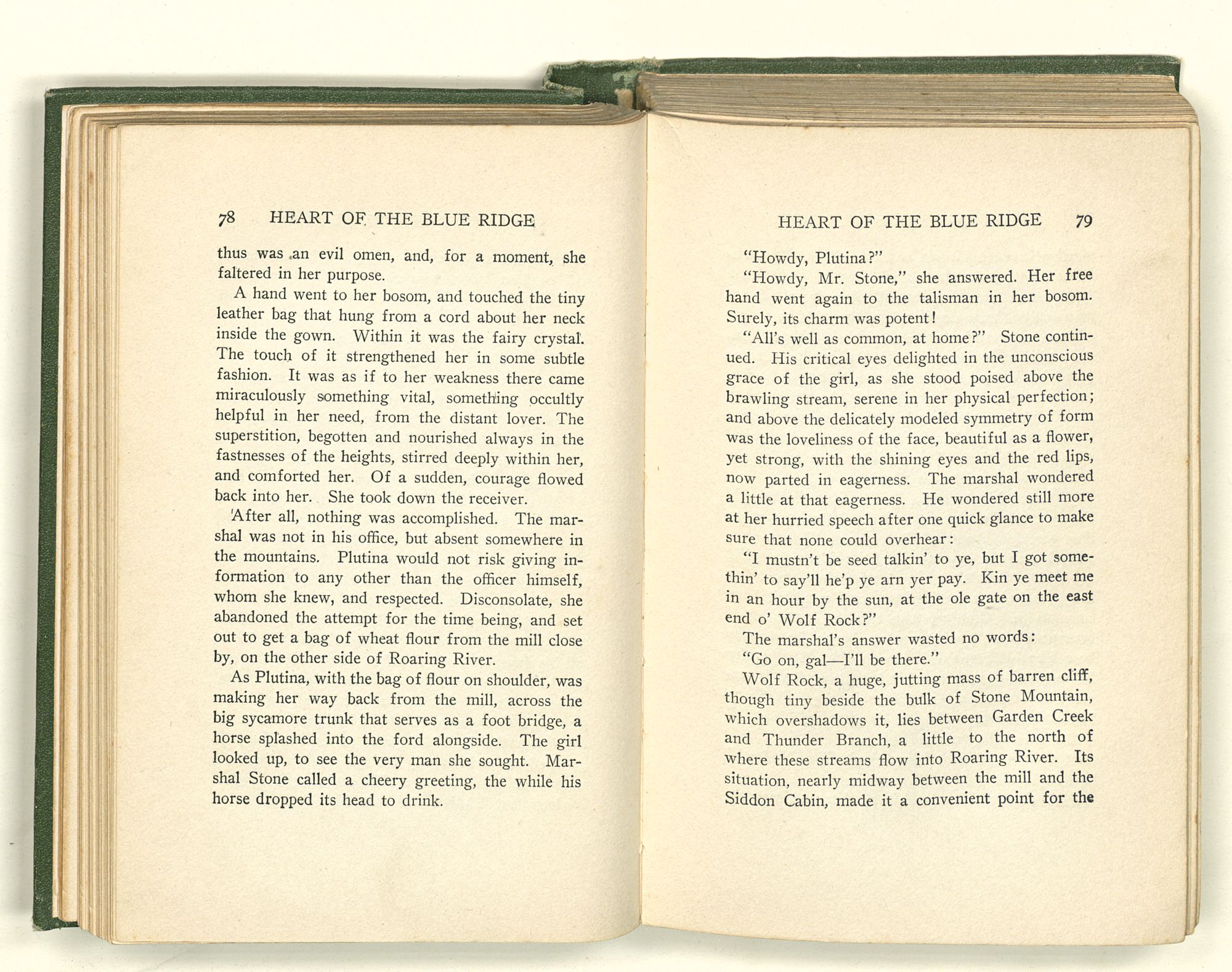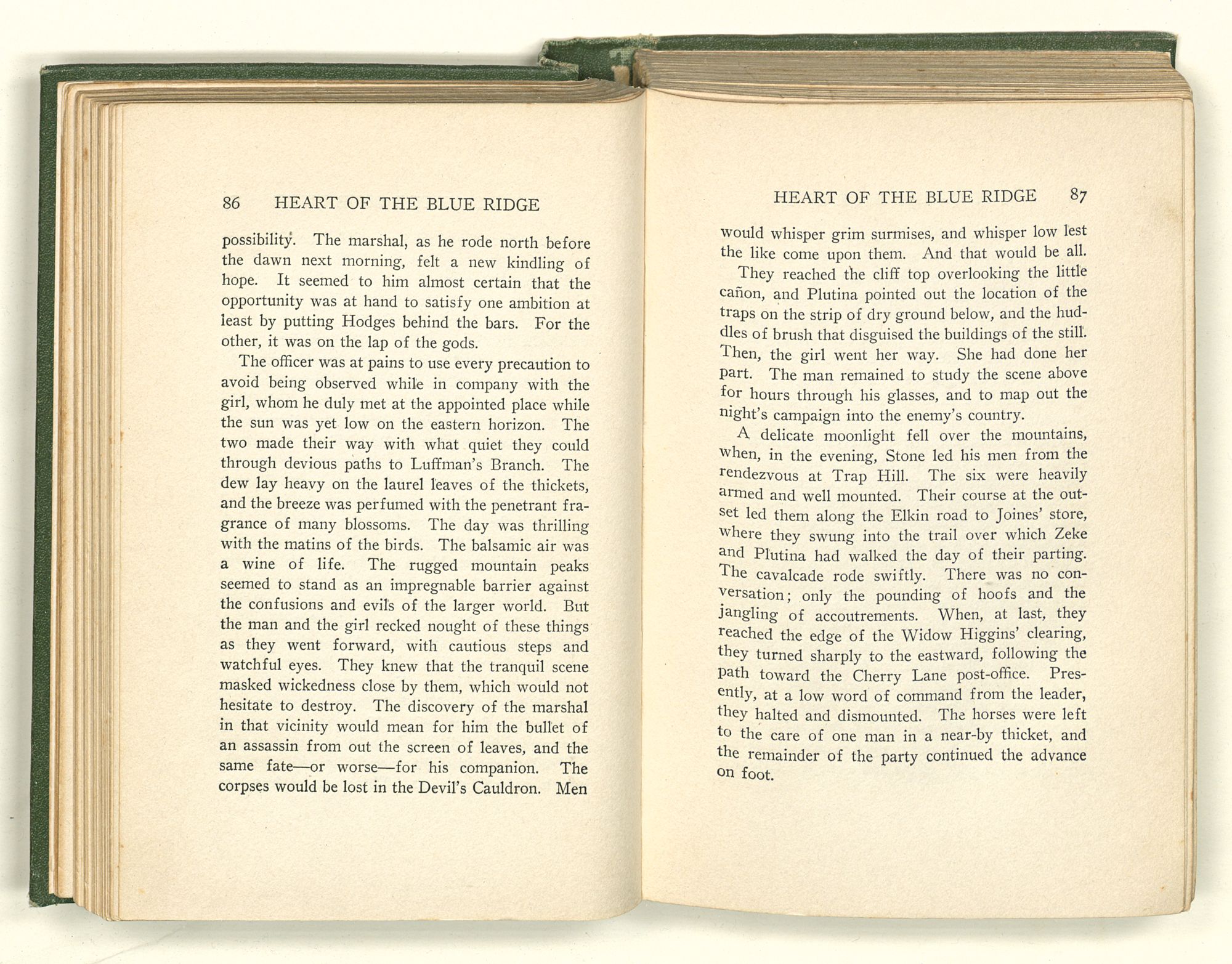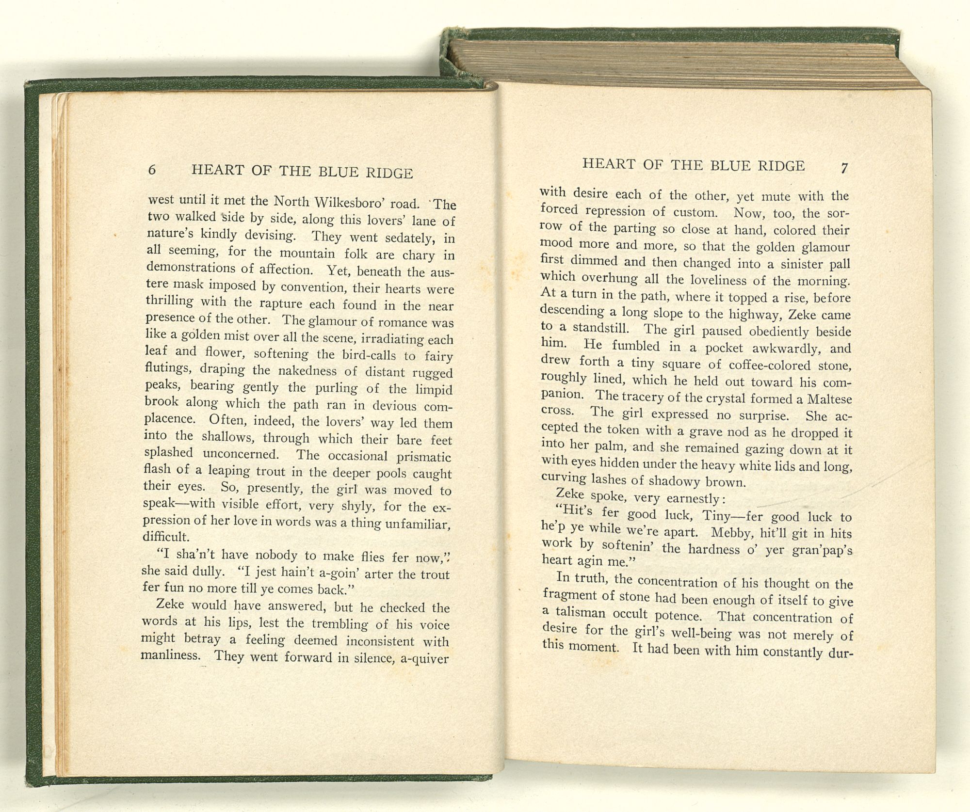 until it met the North Wilkesboro’ road. The two walked side by side, along this lovers' lane of nature's kindly devising. They went sedately, in all seeming, for the mountain folk are chary in demonstrations of affection. Yet, beneath the austere mask imposed by convention, their hearts were thrilling with the rapture each found in the near presence of the other. The glamour of romance was like a golden mist over all the scene, irradiating each leaf and flower, softening the bird-calls to fairy flutings, draping the nakedness of distant rugged peaks, bearing gently the purling of the limpid brook along which the path ran in devious complacence. Often, indeed, the lovers' way led them into the shallows, through which their bare feet splashed unconcerned. The occasional prismatic flash of a leaping trout in the deeper pools caught their eyes. So, presently, the girl was moved to speak—with visible effort, very shyly, for the expression of her love in words was a thing unfamiliar, difficult.