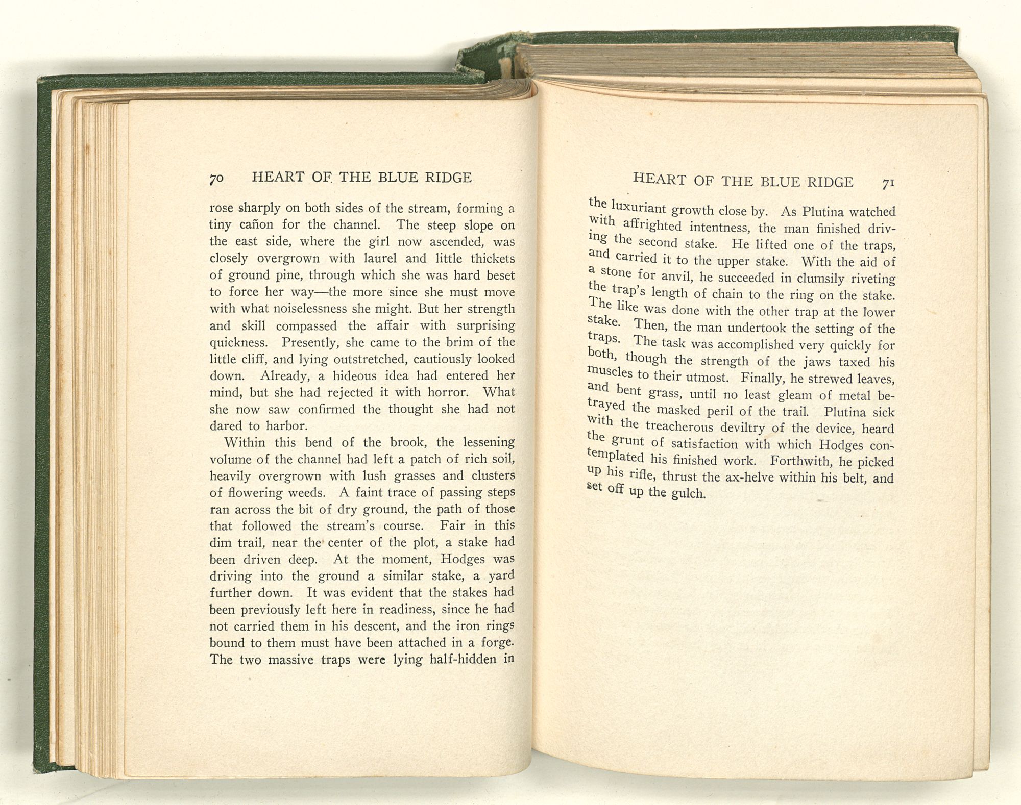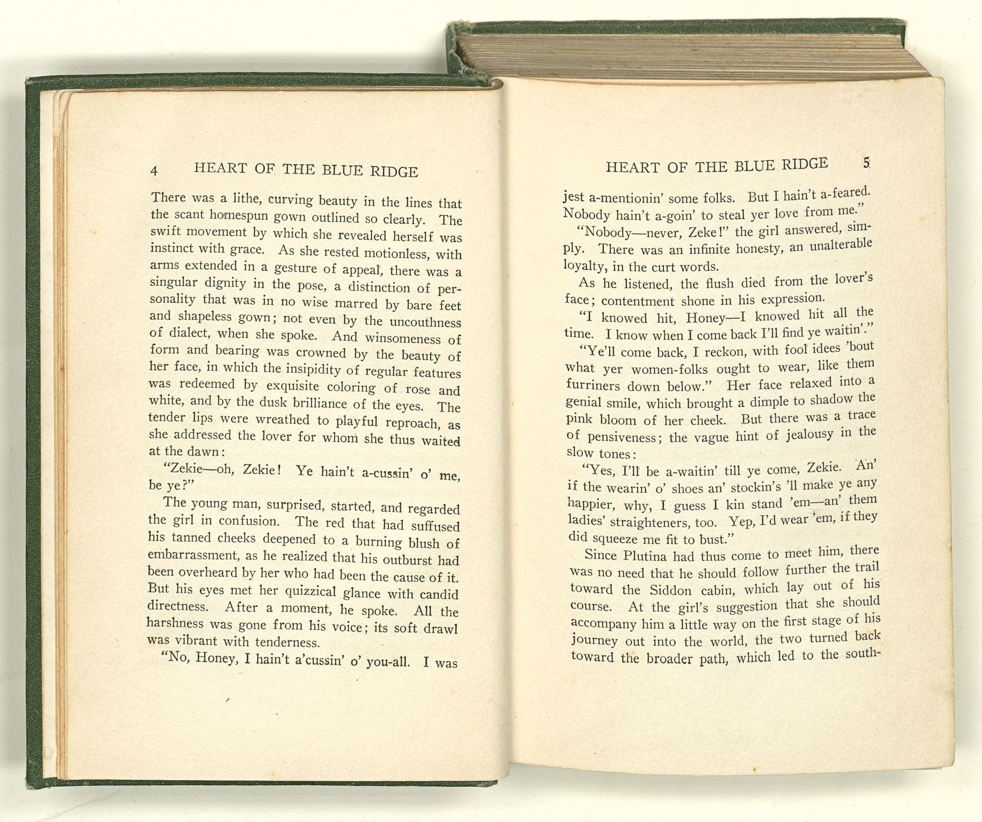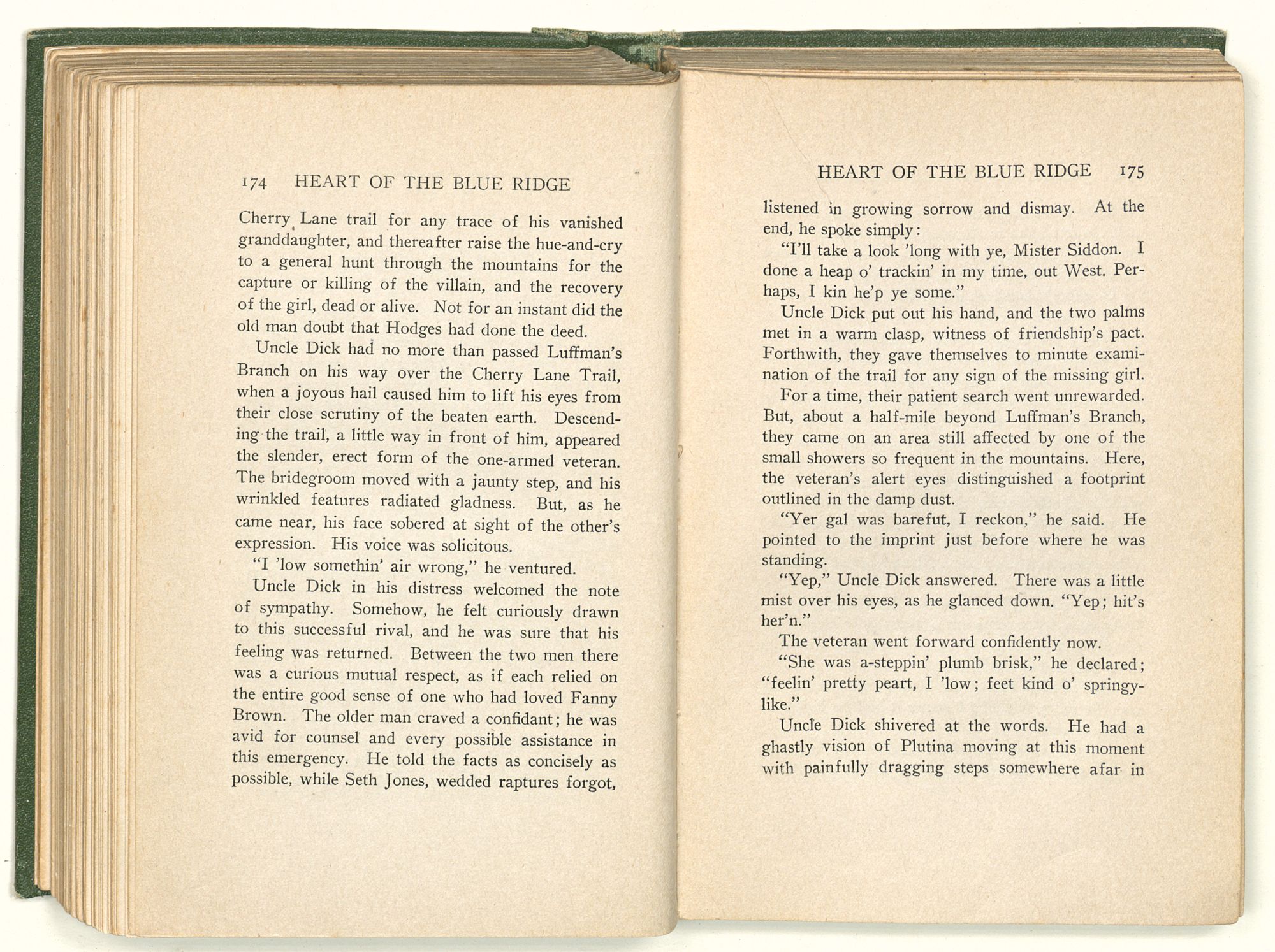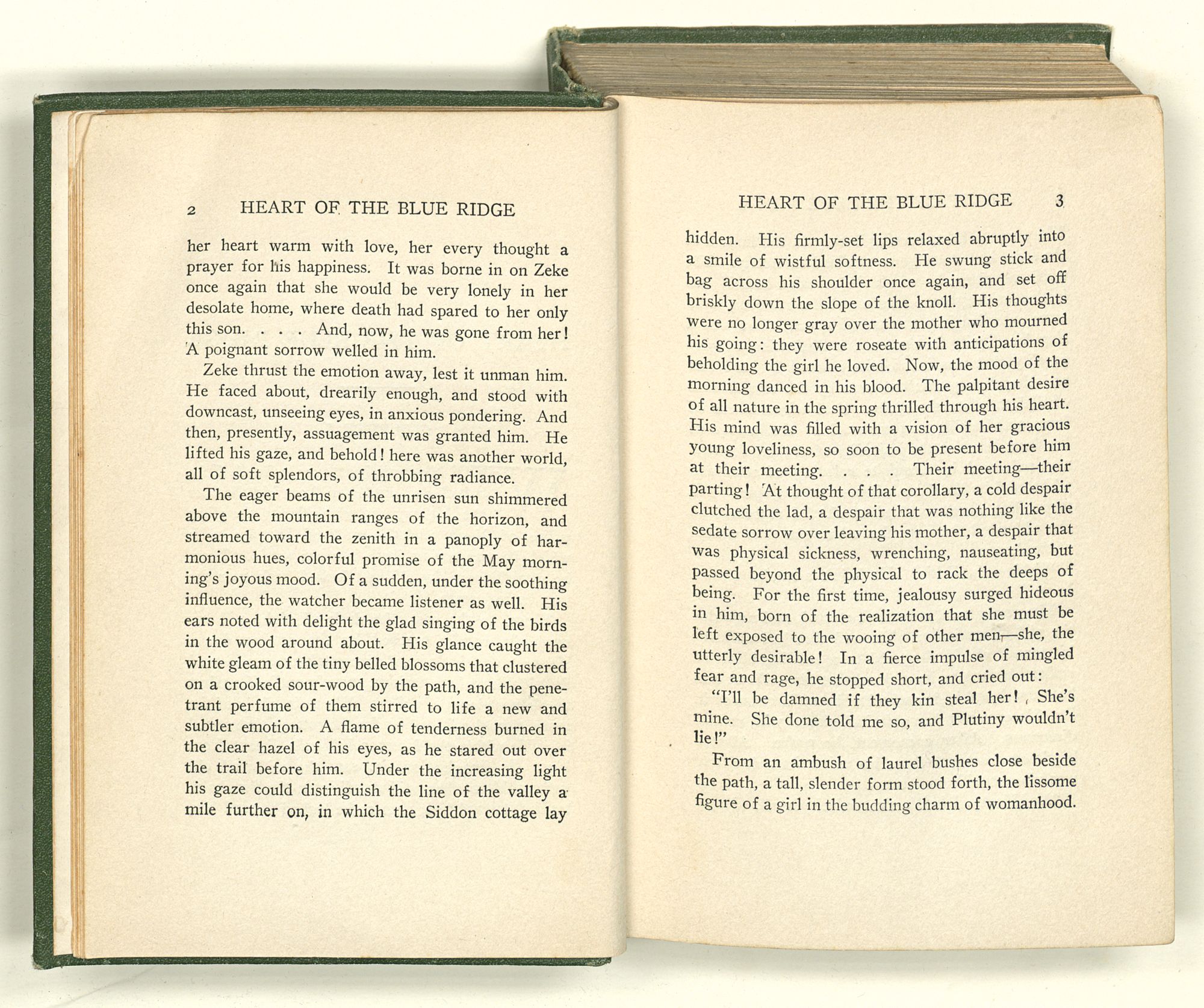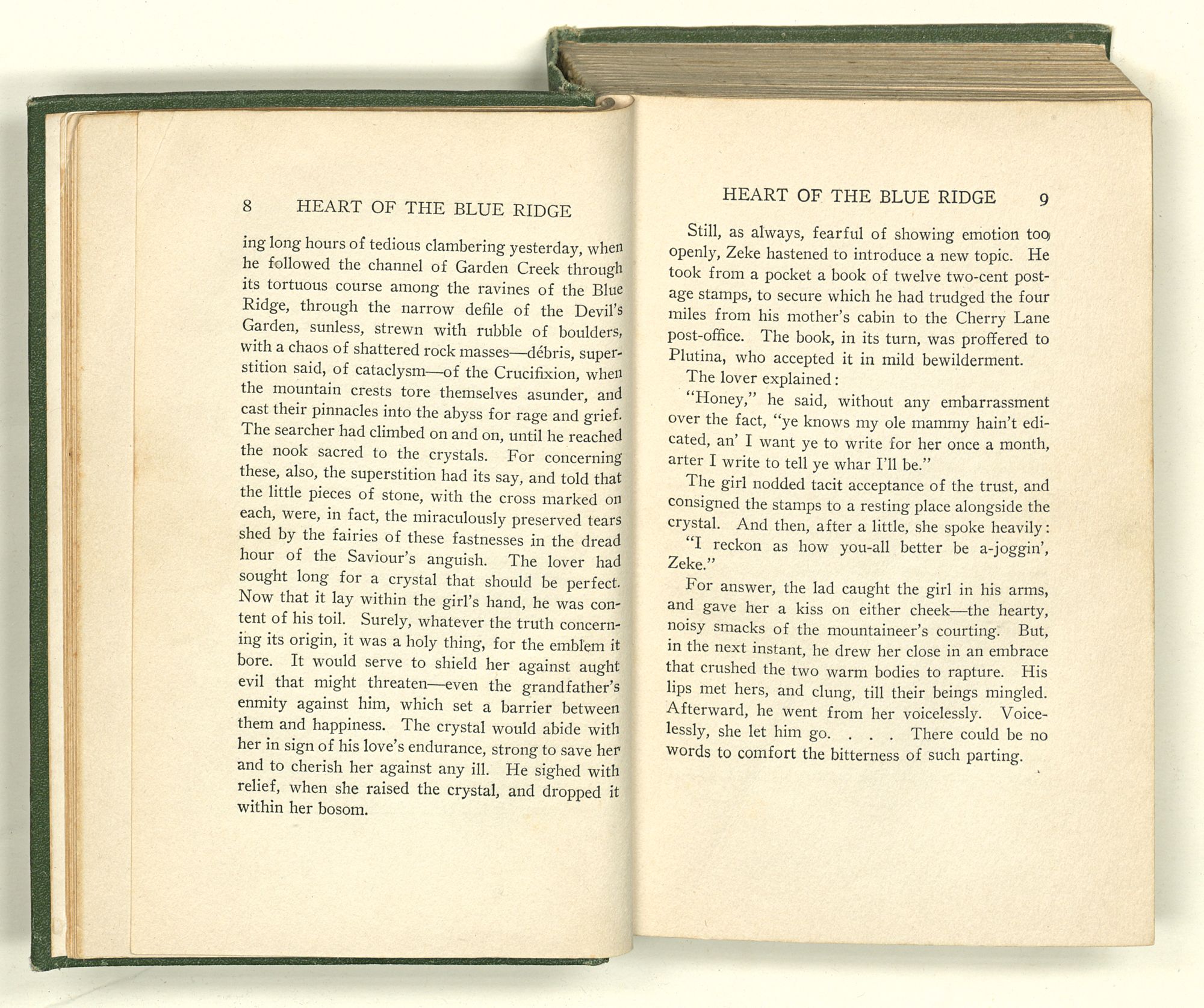 until it met the North Wilkesboro’ road. The two walked side by side, along this lovers' lane of nature's kindly devising. They went sedately, in all seeming, for the mountain folk are chary in demonstrations of affection. Yet, beneath the austere mask imposed by convention, their hearts were thrilling with the rapture each found in the near presence of the other. The glamour of romance was like a golden mist over all the scene, irradiating each leaf and flower, softening the bird-calls to fairy flutings, draping the nakedness of distant rugged peaks, bearing gently the purling of the limpid brook along which the path ran in devious complacence. Often, indeed, the lovers' way led them into the shallows, through which their bare feet splashed unconcerned. The occasional prismatic flash of a leaping trout in the deeper pools caught their eyes. So, presently, the girl was moved to speak—with visible effort, very shyly, for the expression of her love in words was a thing unfamiliar, difficult.
