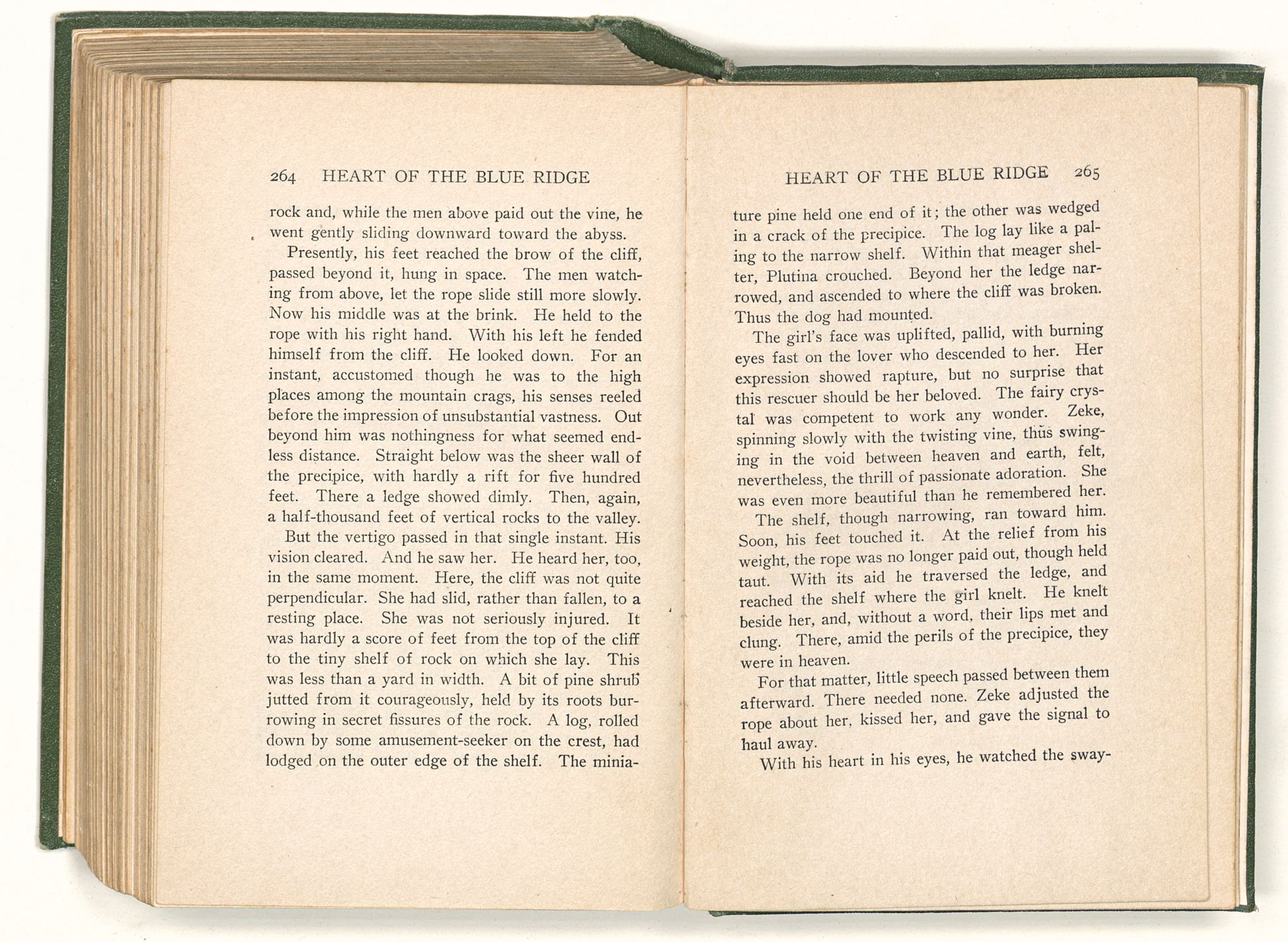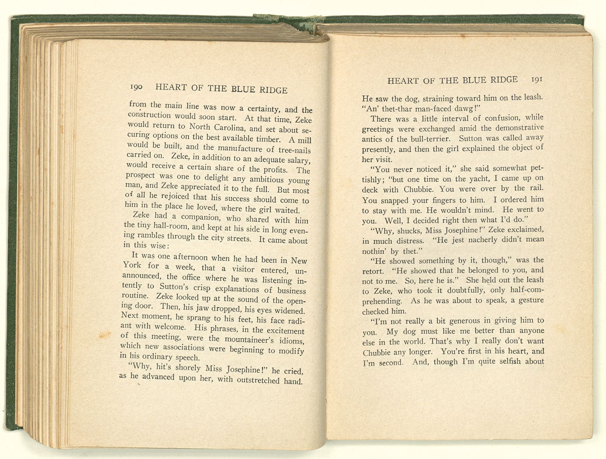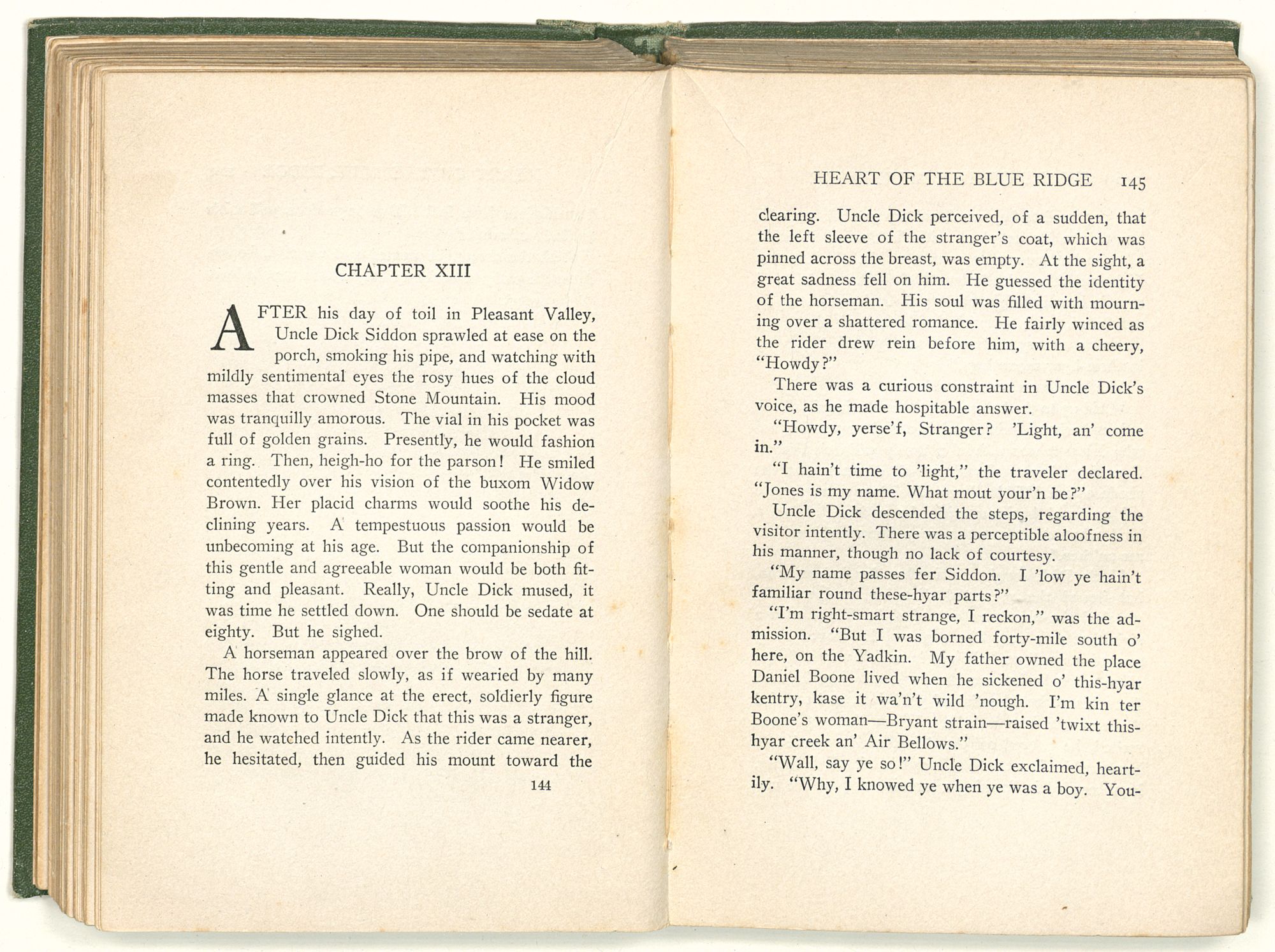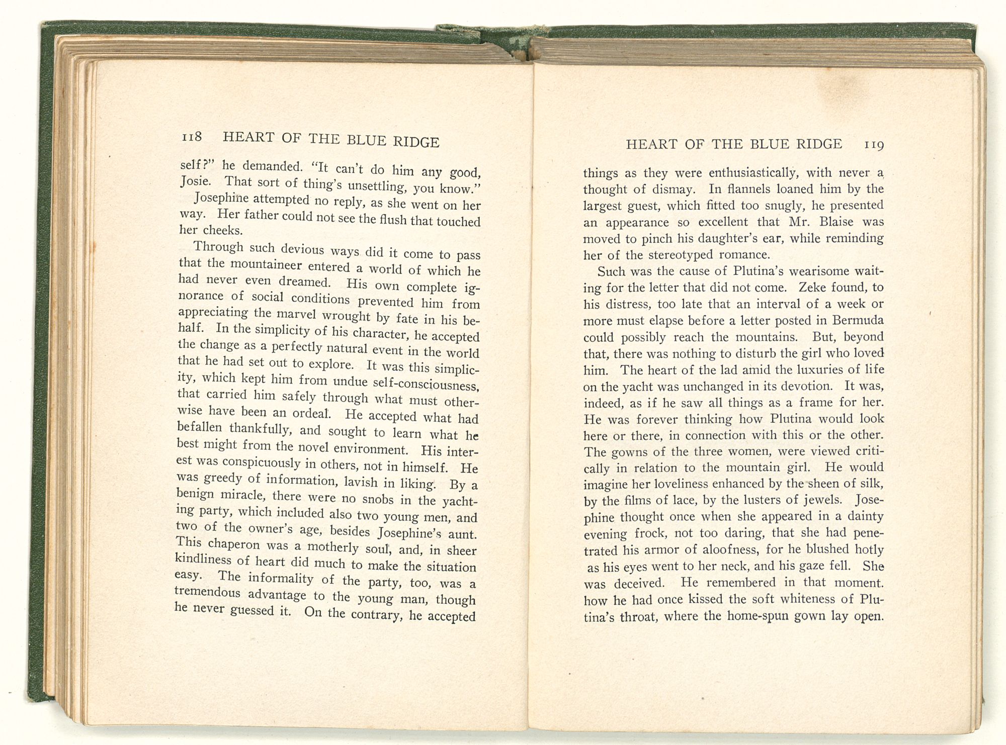 until it met the North Wilkesboro’ road. The two walked side by side, along this lovers' lane of nature's kindly devising. They went sedately, in all seeming, for the mountain folk are chary in demonstrations of affection. Yet, beneath the austere mask imposed by convention, their hearts were thrilling with the rapture each found in the near presence of the other. The glamour of romance was like a golden mist over all the scene, irradiating each leaf and flower, softening the bird-calls to fairy flutings, draping the nakedness of distant rugged peaks, bearing gently the purling of the limpid brook along which the path ran in devious complacence. Often, indeed, the lovers' way led them into the shallows, through which their bare feet splashed unconcerned. The occasional prismatic flash of a leaping trout in the deeper pools caught their eyes. So, presently, the girl was moved to speak—with visible effort, very shyly, for the expression of her love in words was a thing unfamiliar, difficult.