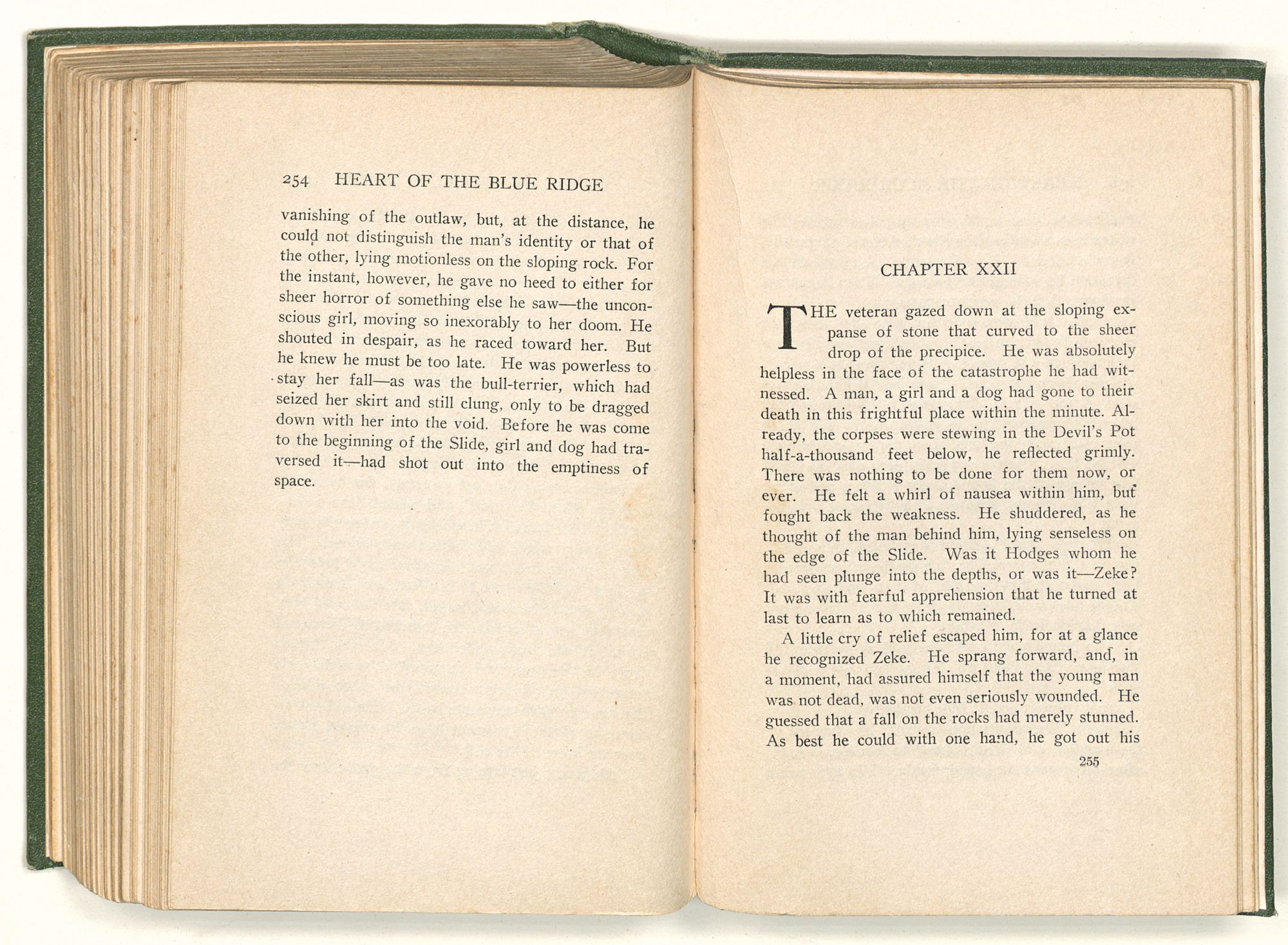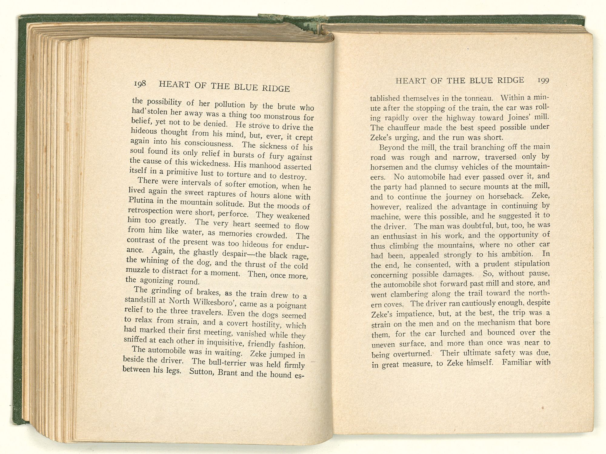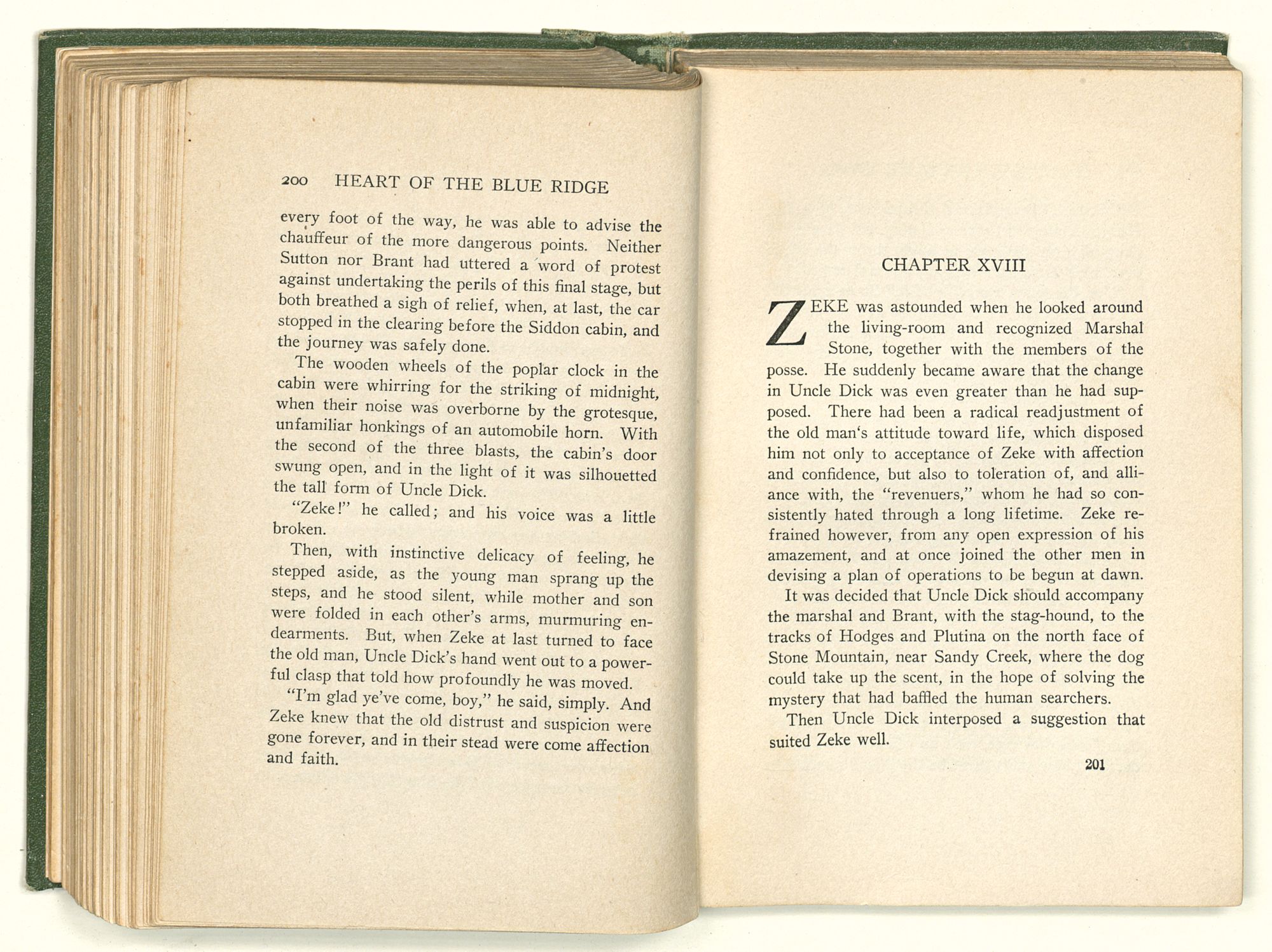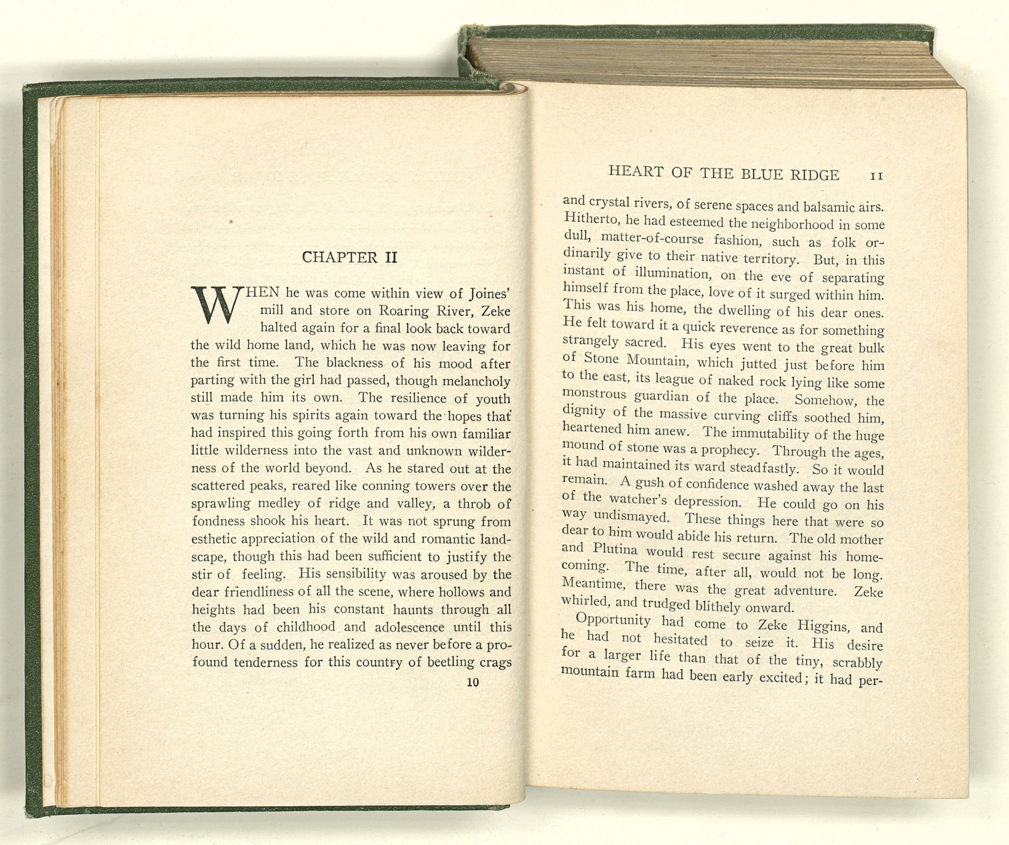 WHEN he was come within view of Joines' mill and store on Roaring River, Zeke halted again for a final look back toward the wild home land, which he was now leaving for the first time. The blackness of his mood after parting with the girl had passed, though melancholy still made him its own. The resilience of youth was turning his spirits again toward the hopes that had inspired this going forth from his own familiar little wilderness into the vast and unknown wilderness of the world beyond. As he stared out at the scattered peaks, reared like conning towers over the sprawling medley of ridge and valley, a throb of fondness shook his heart. It was not sprung from esthetic appreciation of the wild and romantic landscape, though this had been sufficient to justify the stir of feeling. His sensibility was aroused by the dear friendliness of all the scene, where hollows and heights had been his constant haunts through all the days of childhood and adolescence until this hour. Of a sudden, he realized as never before a profound tenderness for this country of beetling crags