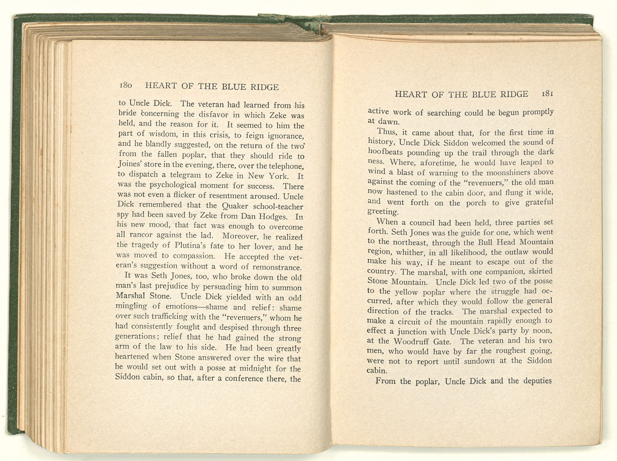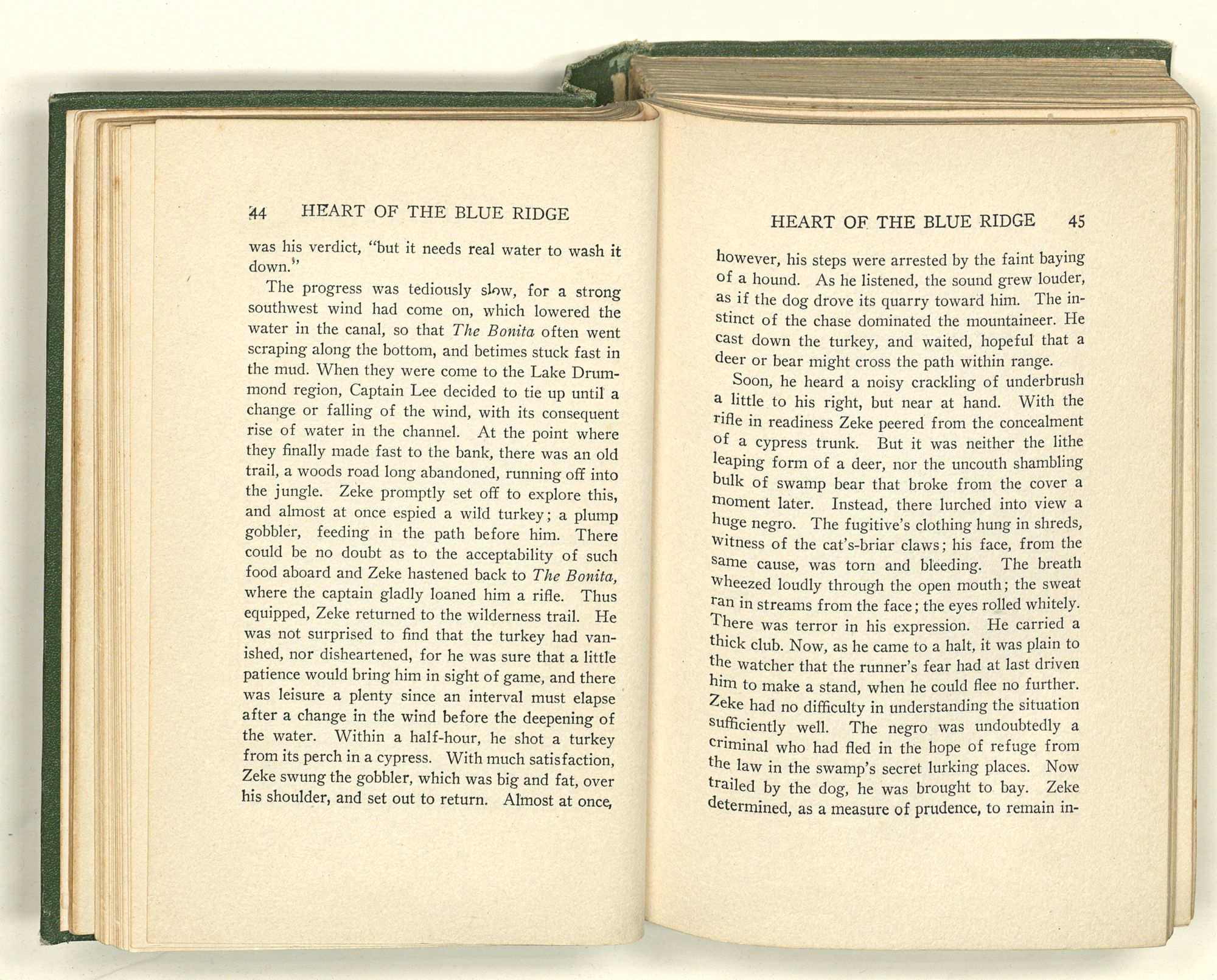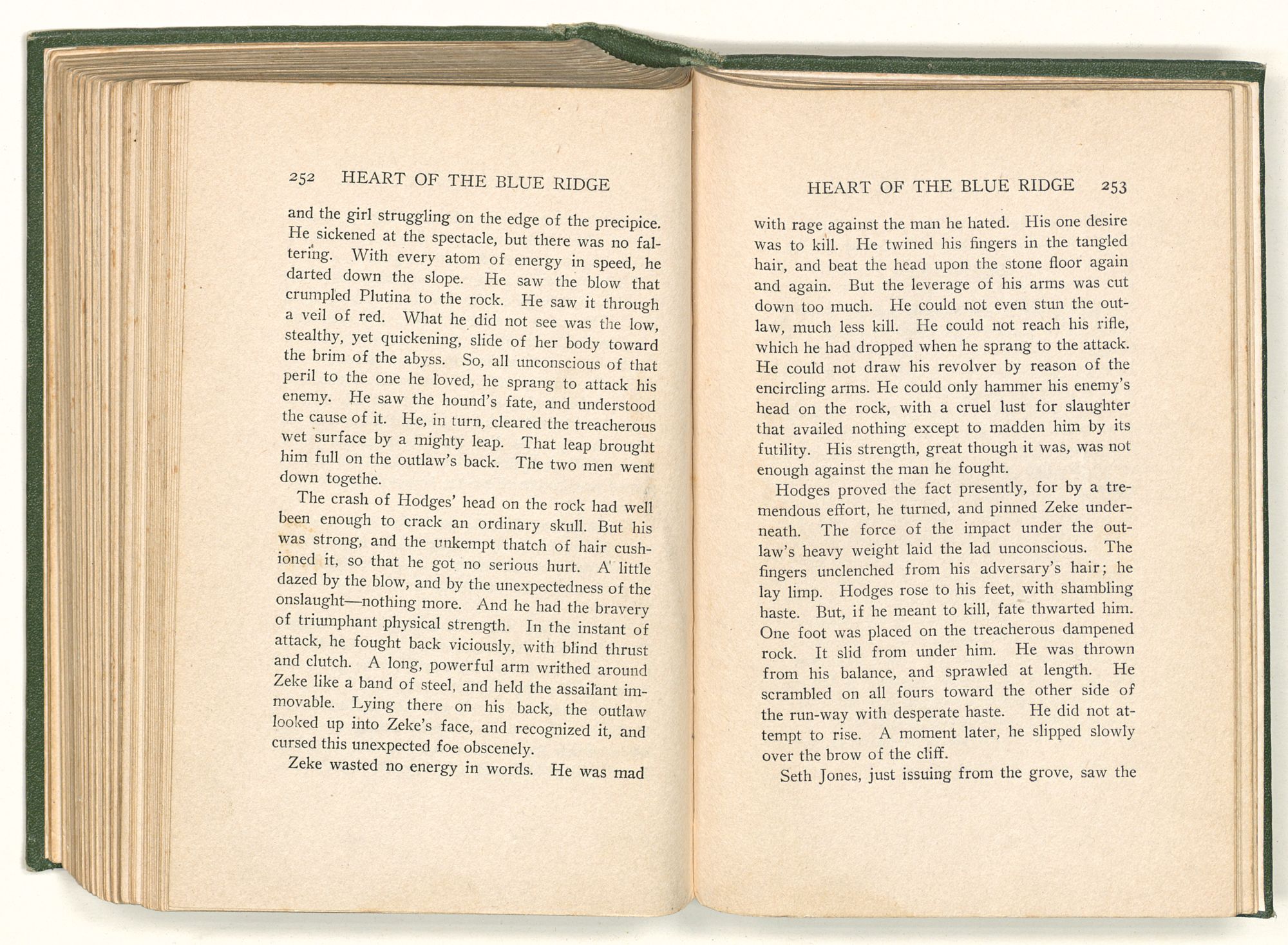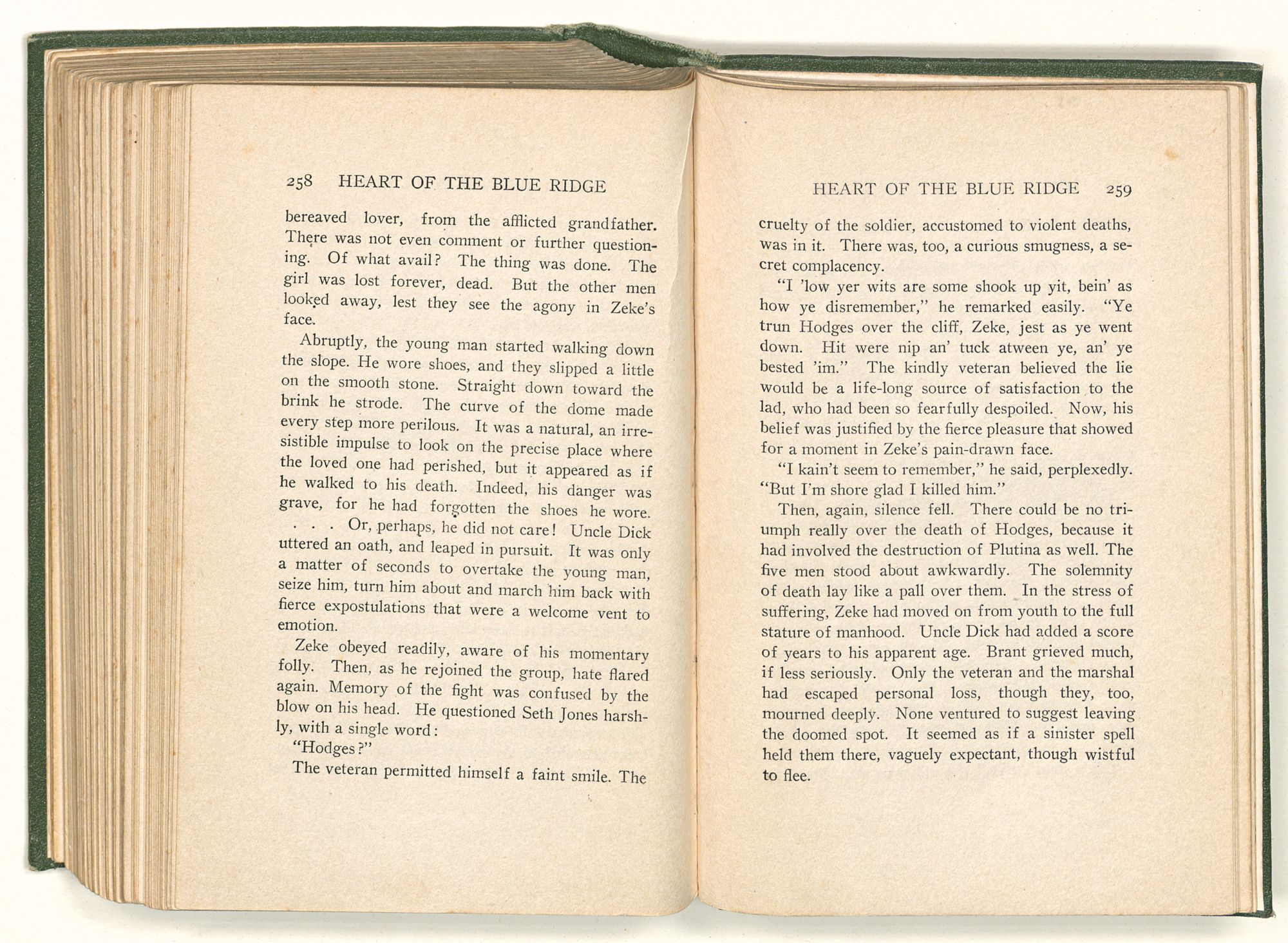 WHEN he was come within view of Joines' mill and store on Roaring River, Zeke halted again for a final look back toward the wild home land, which he was now leaving for the first time. The blackness of his mood after parting with the girl had passed, though melancholy still made him its own. The resilience of youth was turning his spirits again toward the hopes that had inspired this going forth from his own familiar little wilderness into the vast and unknown wilderness of the world beyond. As he stared out at the scattered peaks, reared like conning towers over the sprawling medley of ridge and valley, a throb of fondness shook his heart. It was not sprung from esthetic appreciation of the wild and romantic landscape, though this had been sufficient to justify the stir of feeling. His sensibility was aroused by the dear friendliness of all the scene, where hollows and heights had been his constant haunts through all the days of childhood and adolescence until this hour. Of a sudden, he realized as never before a profound tenderness for this country of beetling crags