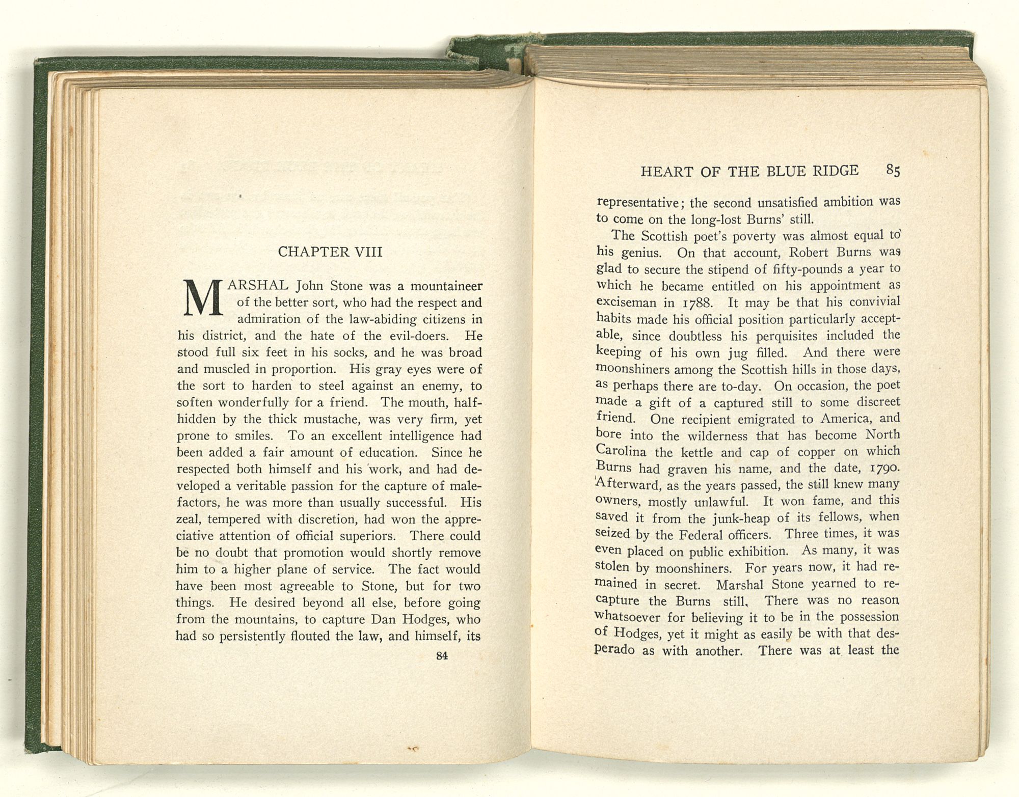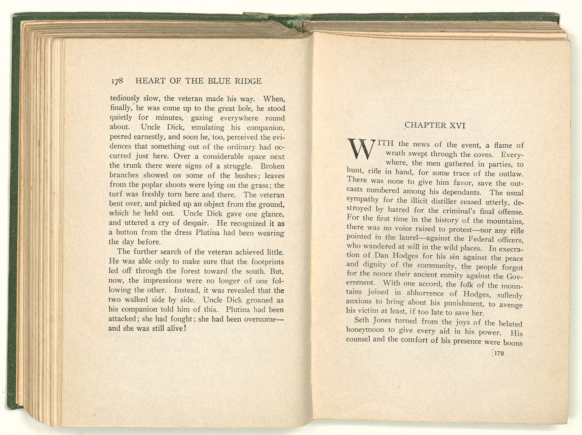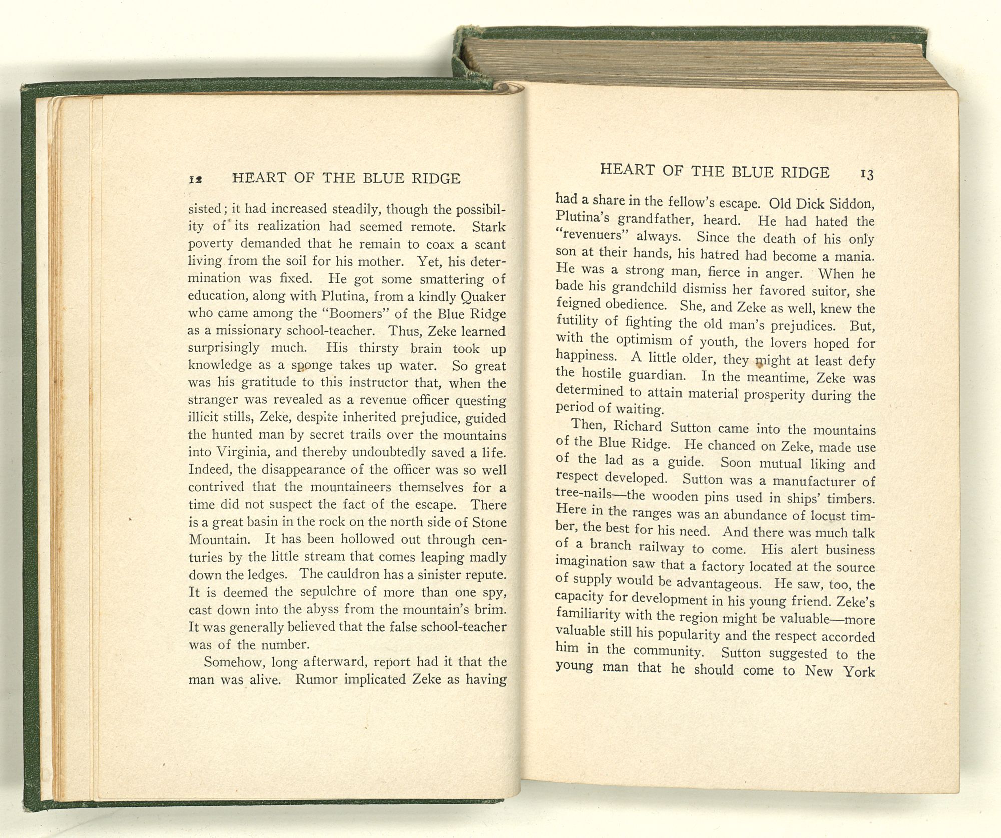 it had increased steadily, though the possibility of its realization had seemed remote. Stark poverty demanded that he remain to coax a scant living from the soil for his mother. Yet, his determination was fixed. He got some smattering of education, along with Plutina, from a kindly Quaker who came among the “Boomers” of the Blue Ridge as a missionary school-teacher. Thus, Zeke learned surprisingly much. His thirsty brain took up knowledge as a sponge takes up water. So great was his gratitude to this instructor that, when the stranger was revealed as a revenue officer questing illicit stills, Zeke, despite inherited prejudice, guided the hunted man by secret trails over the mountains into Virginia, and thereby undoubtedly saved a life. Indeed, the disappearance of the officer was so well contrived that the mountaineers themselves for a time did not suspect the fact of the escape. There is a great basin in the rock on the north side of Stone Mountain. It has been hollowed out through centuries by the little stream that comes leaping madly down the ledges. The cauldron has a sinister repute. It is deemed the sepulchre of more than one spy, cast down into the abyss from the mountain's brim. It was generally believed that the false school-teacher was of the number.