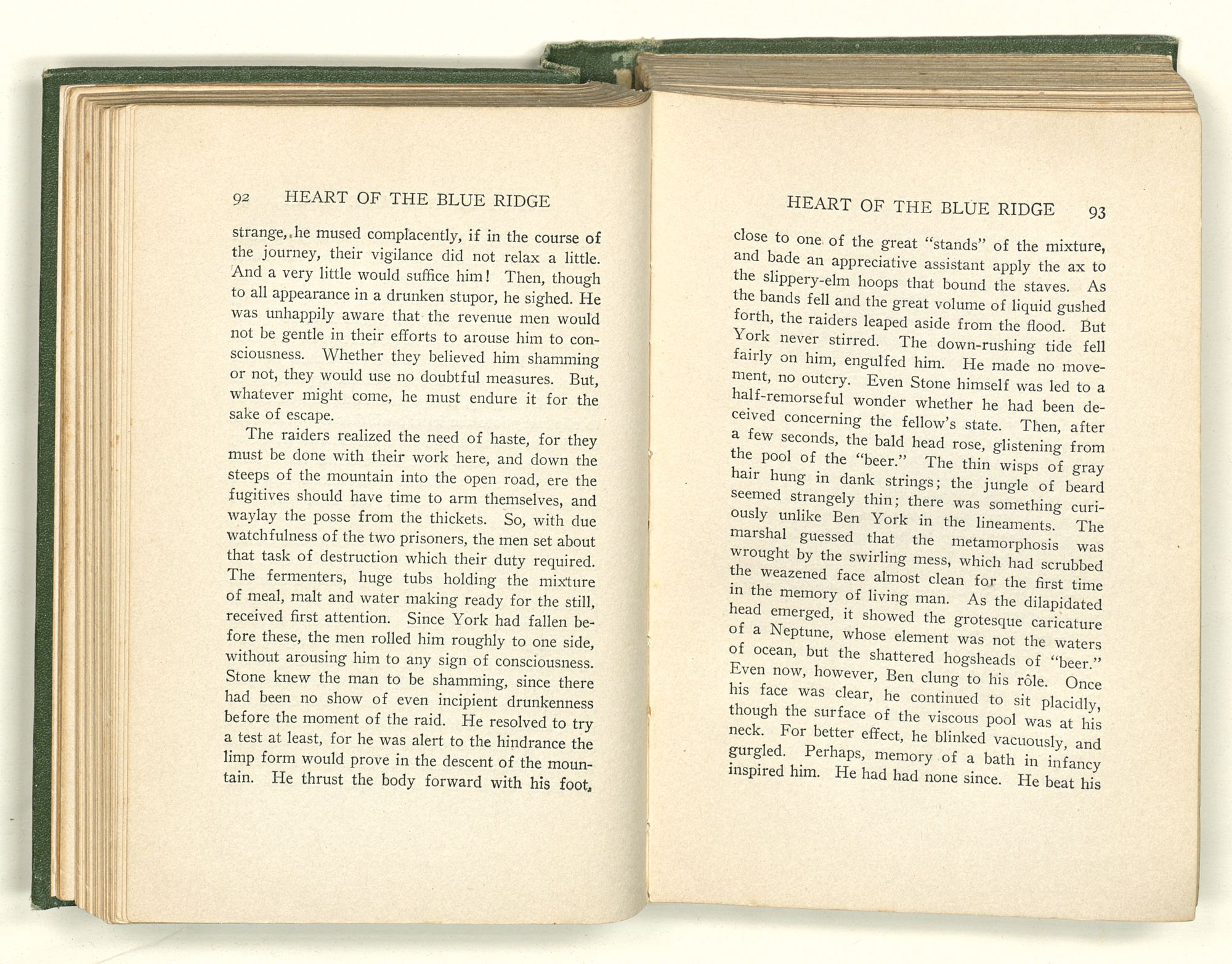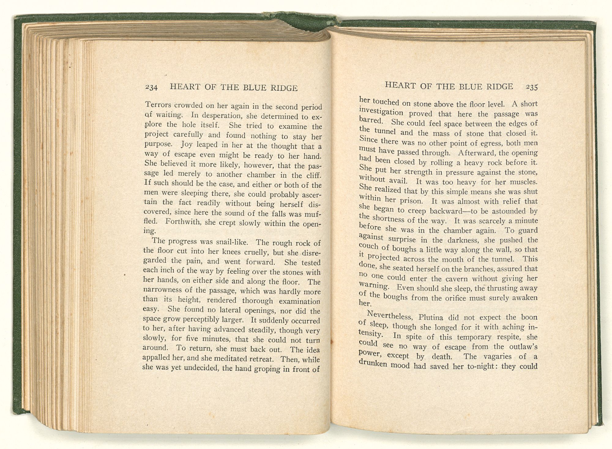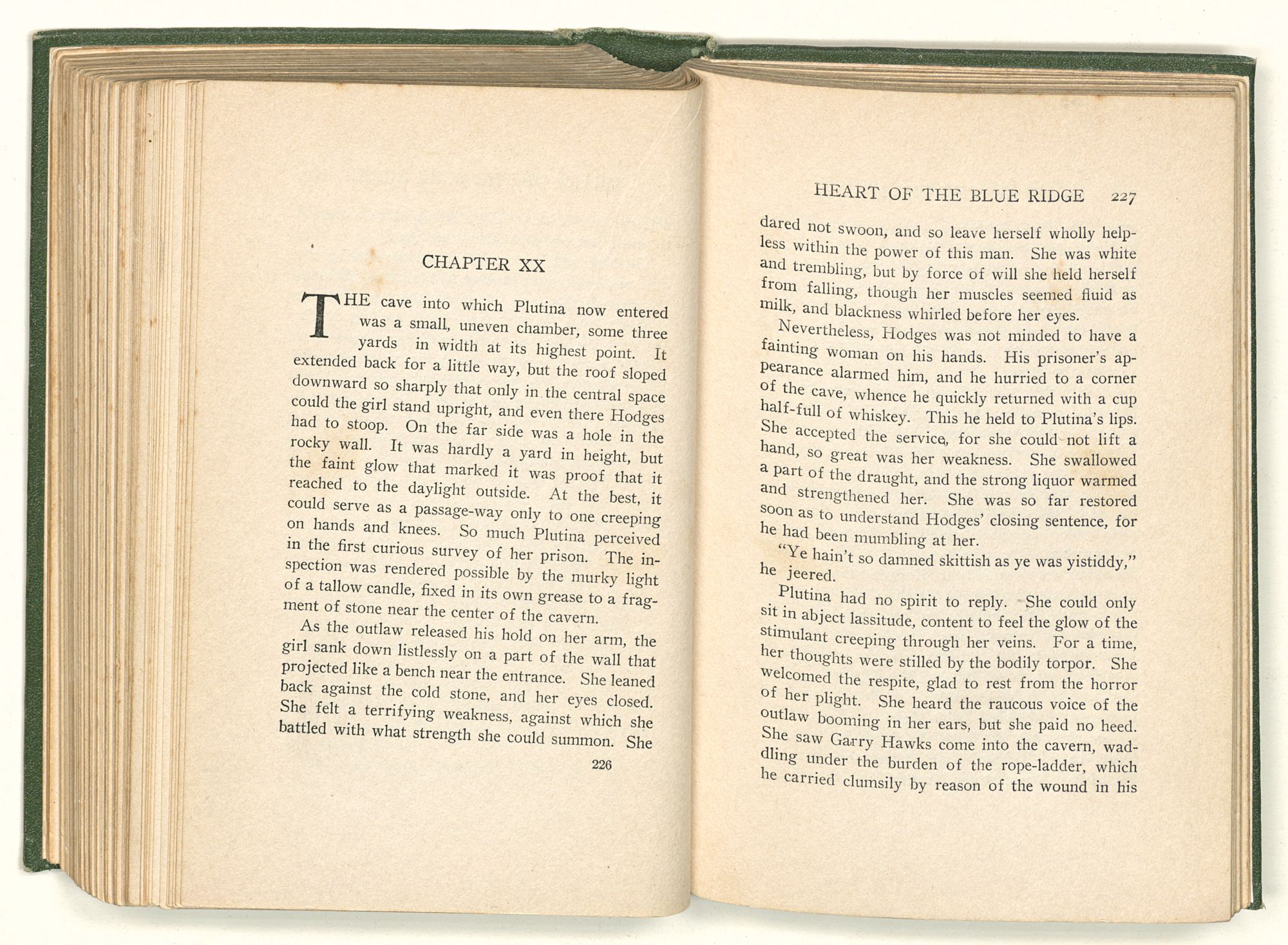 it had increased steadily, though the possibility of its realization had seemed remote. Stark poverty demanded that he remain to coax a scant living from the soil for his mother. Yet, his determination was fixed. He got some smattering of education, along with Plutina, from a kindly Quaker who came among the “Boomers” of the Blue Ridge as a missionary school-teacher. Thus, Zeke learned surprisingly much. His thirsty brain took up knowledge as a sponge takes up water. So great was his gratitude to this instructor that, when the stranger was revealed as a revenue officer questing illicit stills, Zeke, despite inherited prejudice, guided the hunted man by secret trails over the mountains into Virginia, and thereby undoubtedly saved a life. Indeed, the disappearance of the officer was so well contrived that the mountaineers themselves for a time did not suspect the fact of the escape. There is a great basin in the rock on the north side of Stone Mountain. It has been hollowed out through centuries by the little stream that comes leaping madly down the ledges. The cauldron has a sinister repute. It is deemed the sepulchre of more than one spy, cast down into the abyss from the mountain's brim. It was generally believed that the false school-teacher was of the number.