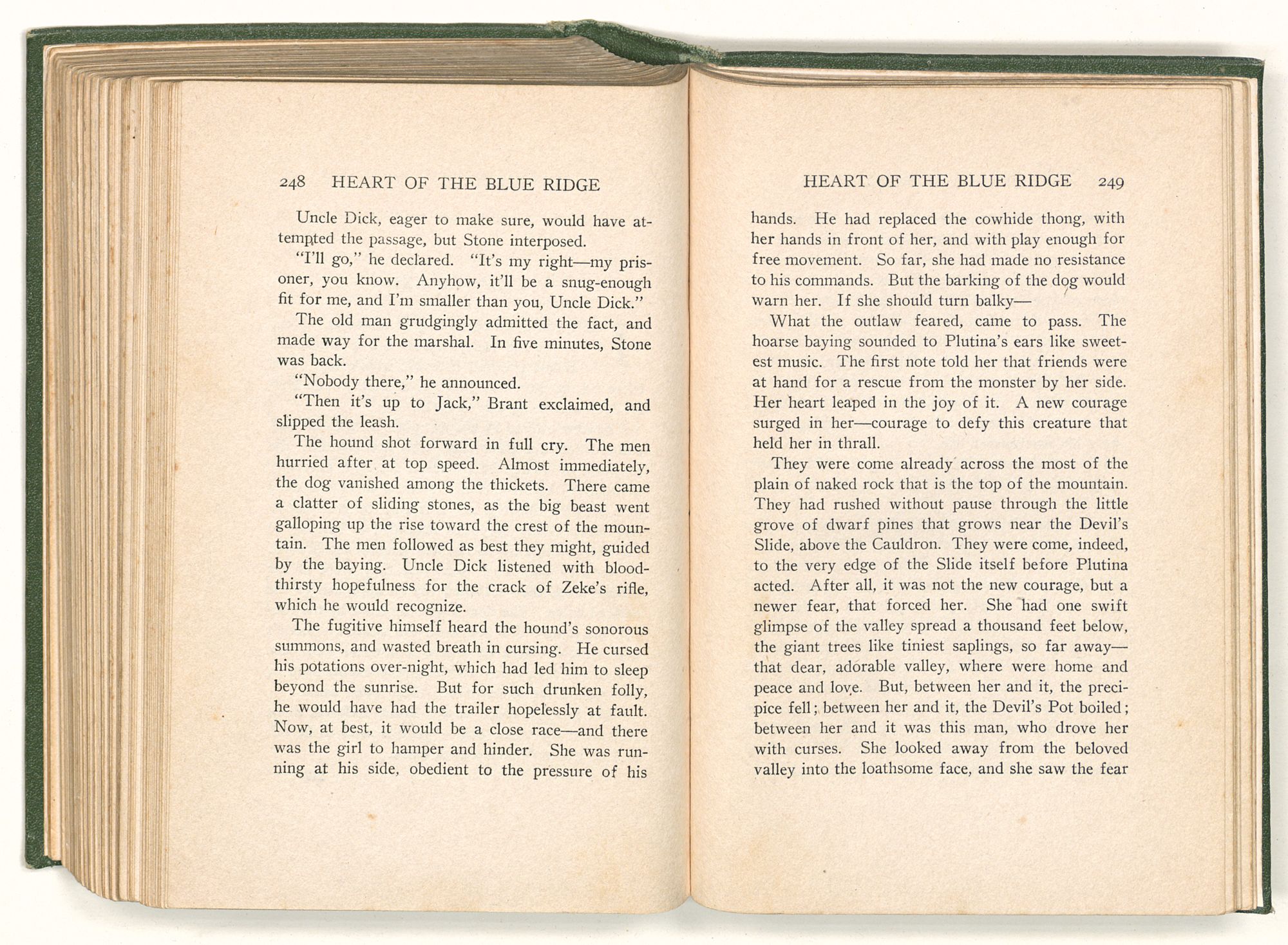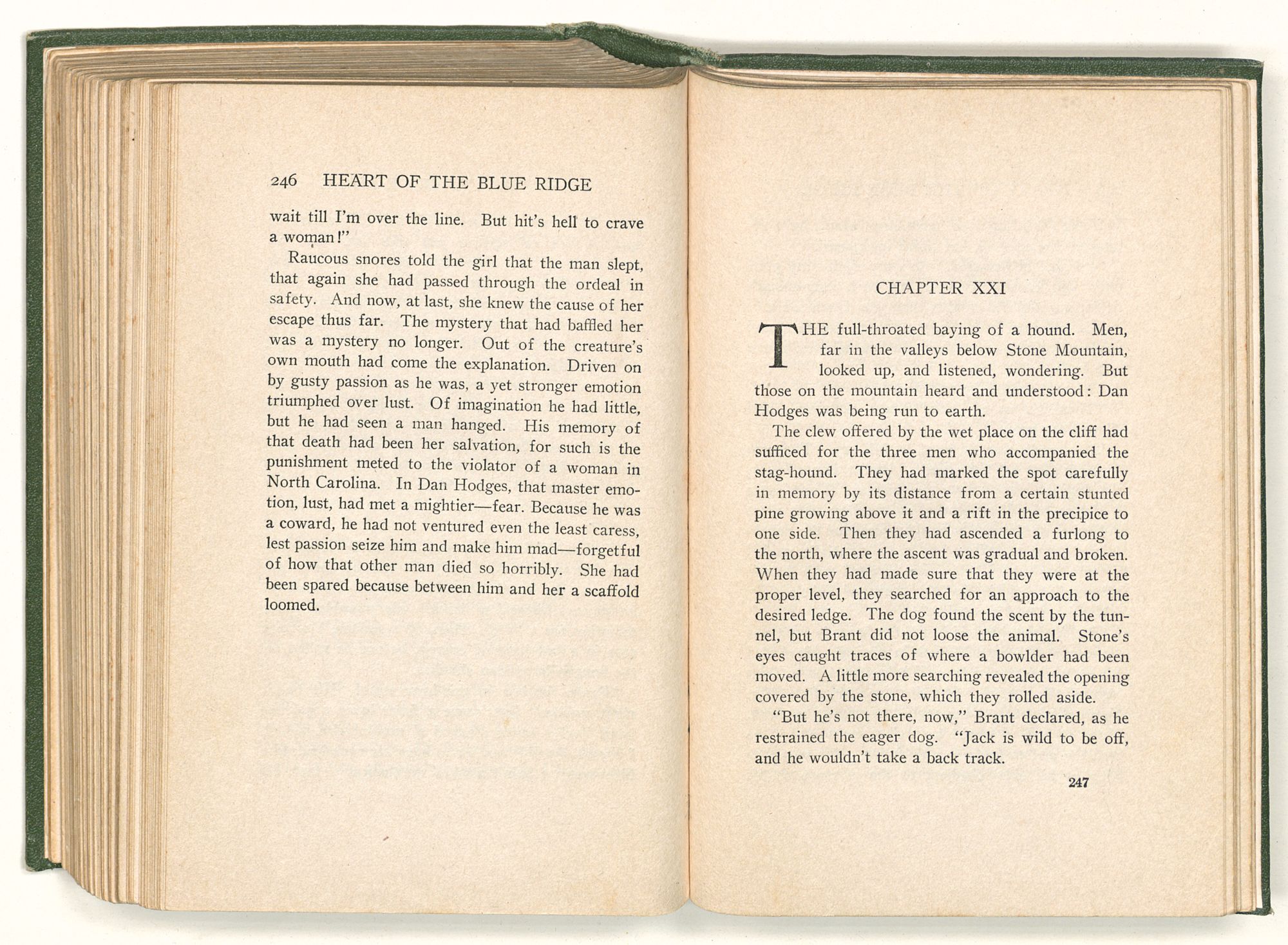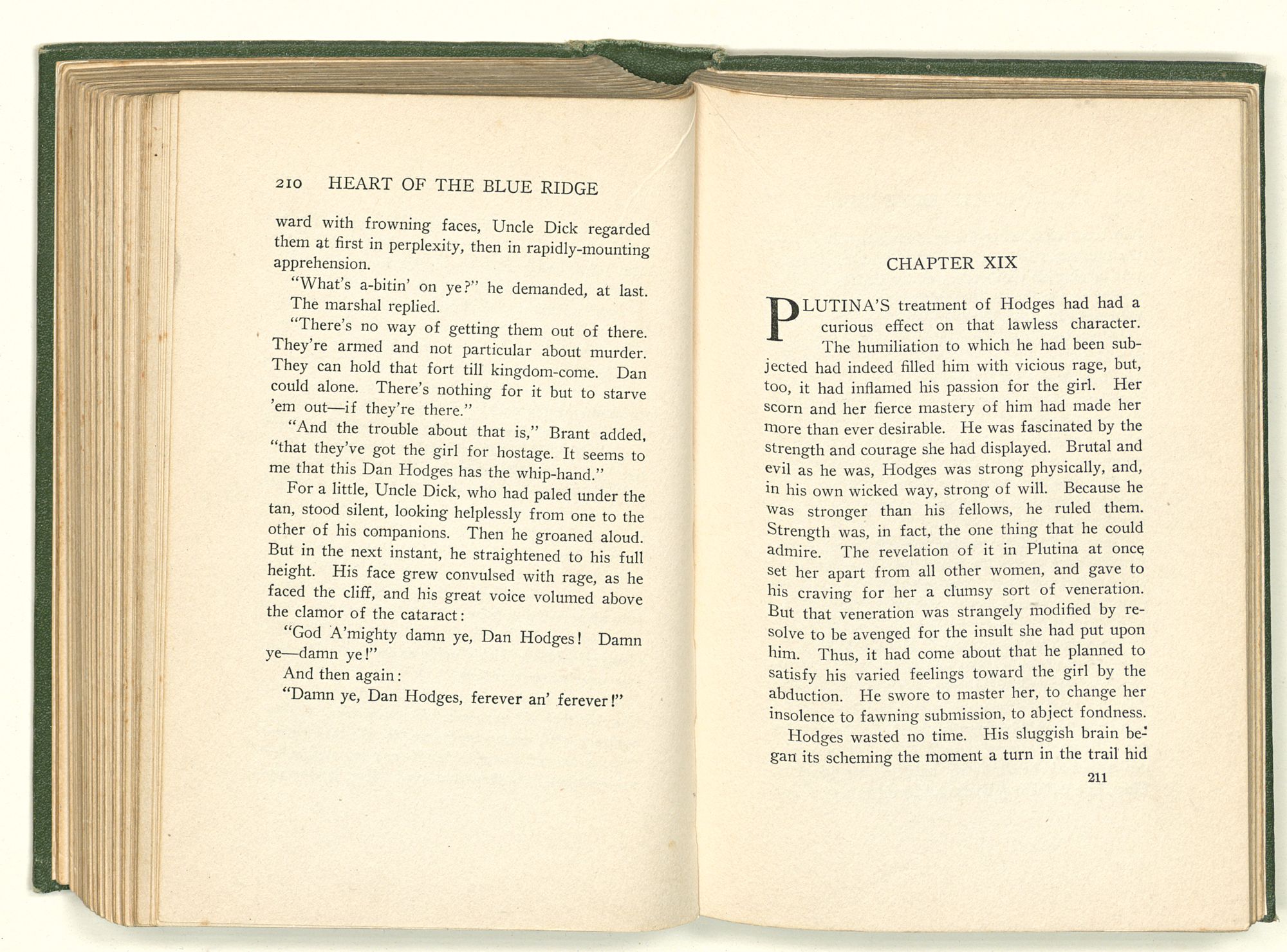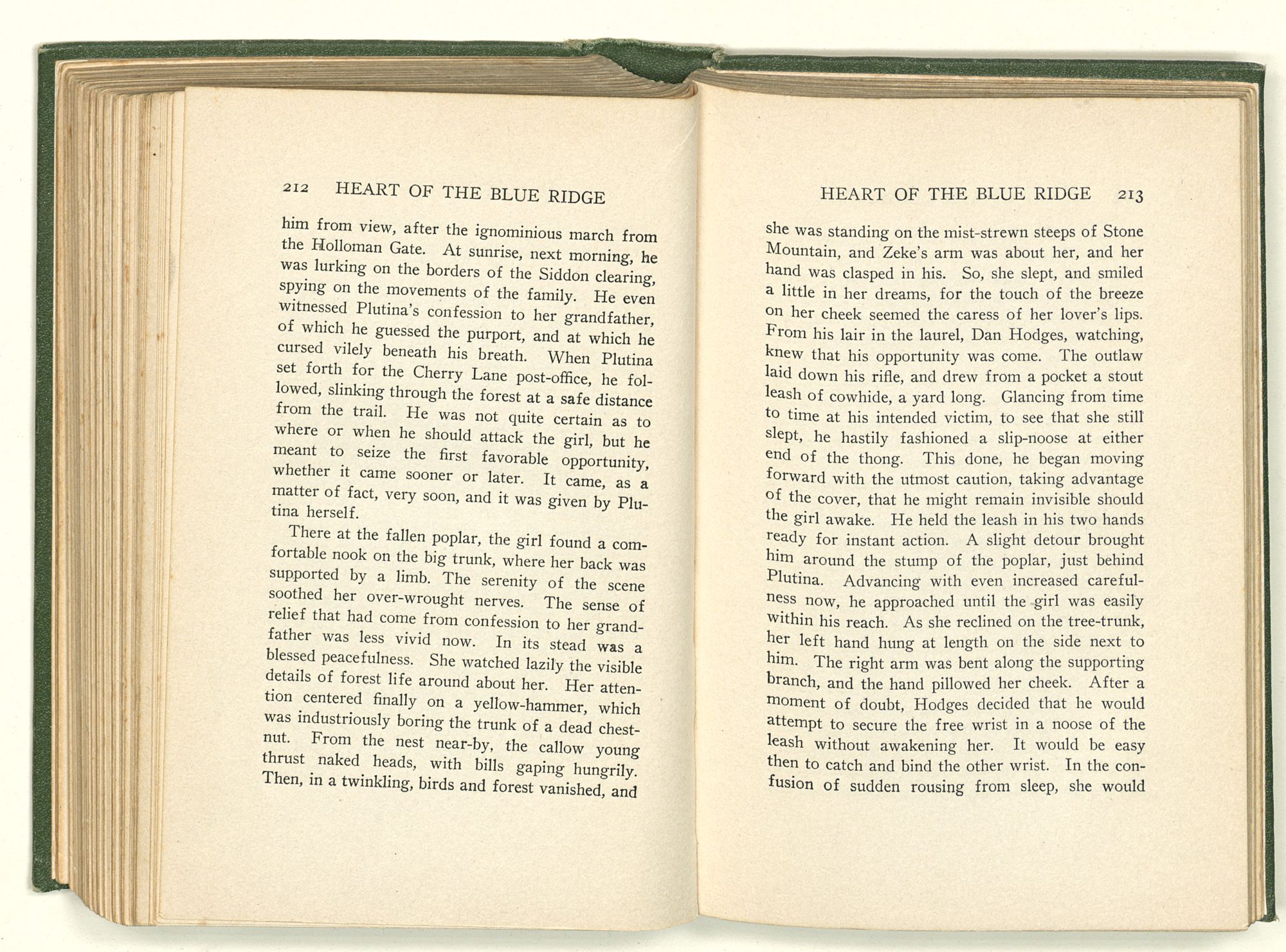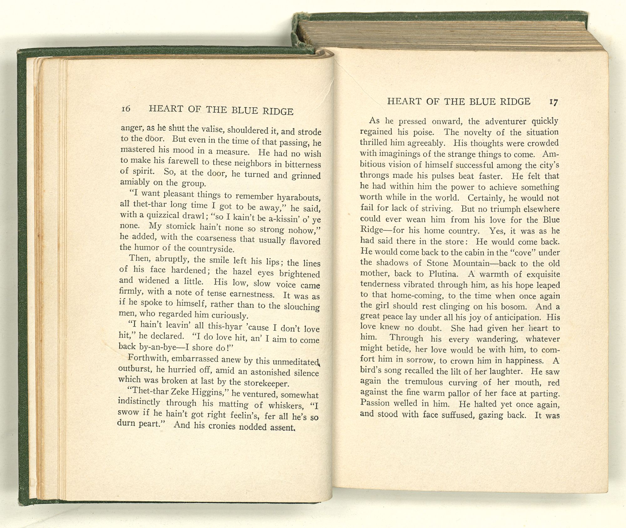 As he pressed onward, the adventurer quickly regained his poise. The novelty of the situation thrilled him agreeably. His thoughts were crowded with imaginings of the strange things to come. Ambitious vision of himself successful among the city's throngs made his pulses beat faster. He felt that he had within him the power to achieve something worth while in the world. Certainly, he would not fail for lack of striving. But no triumph elsewhere could ever wean him from his love for the Blue Ridge—for his home country. Yes, it was as he had said there in the store: He would come back. He would come back to the cabin in the “cove” under the shadows of Stone Mountain—back to the old mother, back to Plutina. A warmth of exquisite tenderness vibrated through him, as his hope leaped to that home-coming, to the time when once again the girl should rest clinging on his bosom. And a great peace lay under all his joy of anticipation. His love knew no doubt. She had given her heart to him. Through his every wandering, whatever might betide, her love would be with him, to comfort him in sorrow, to crown him in happiness. A bird's song recalled the lilt of her laughter. He saw again the tremulous curving of her mouth, red against the fine warm pallor of her face at parting. Passion welled in him. He halted yet once again, and stood with face suffused, gazing back. It was