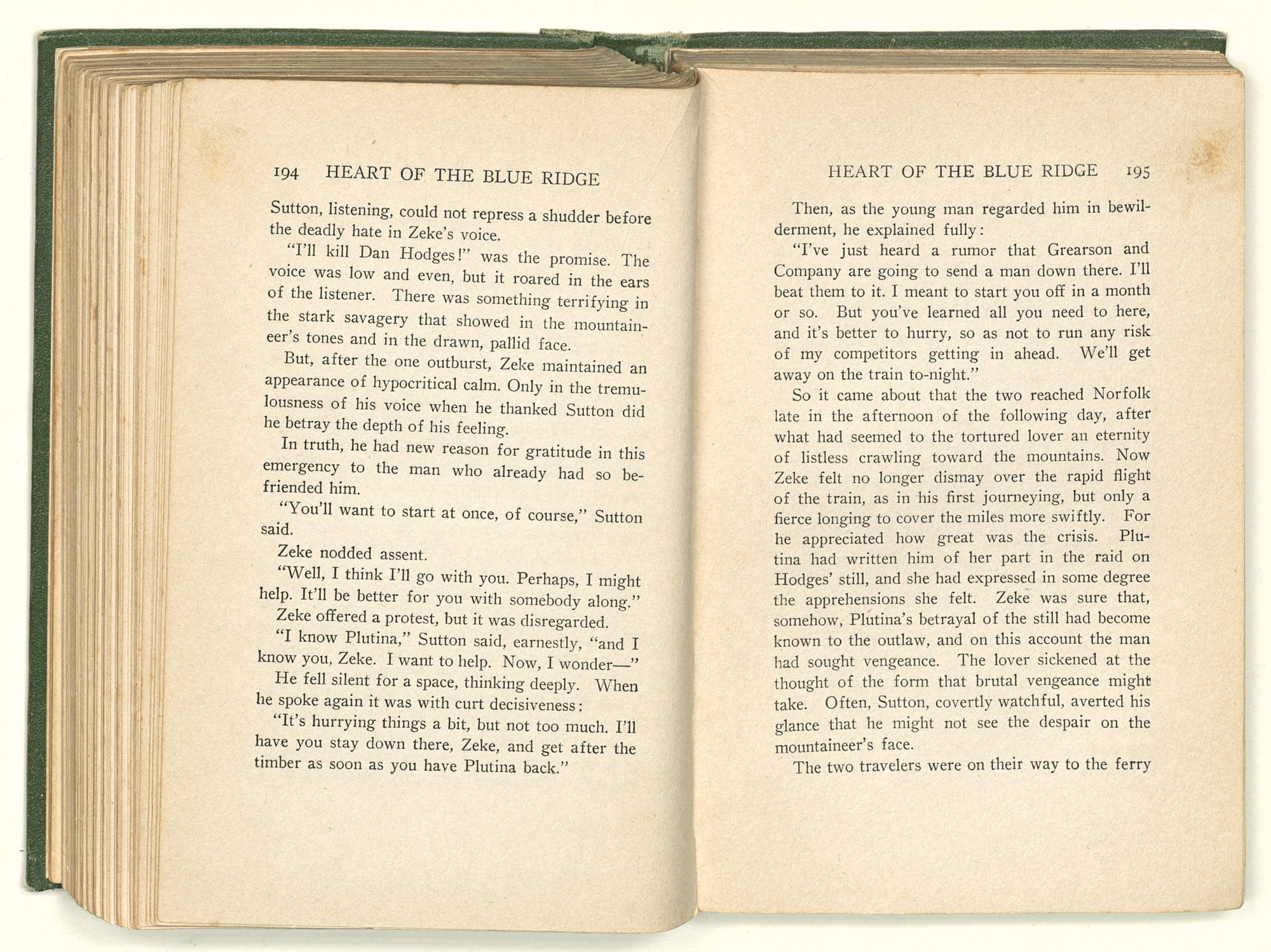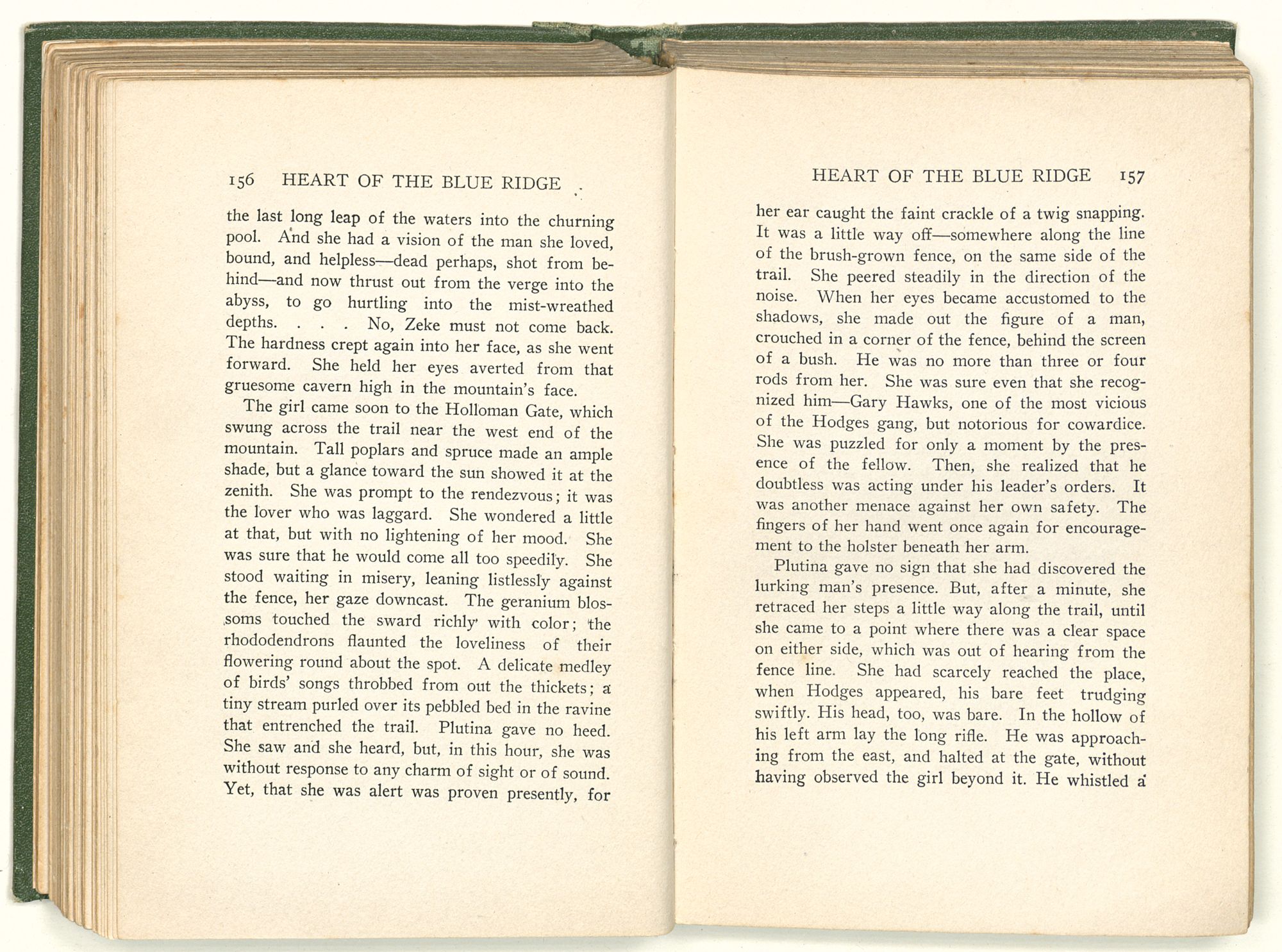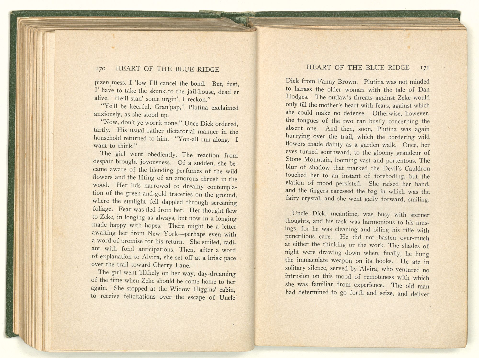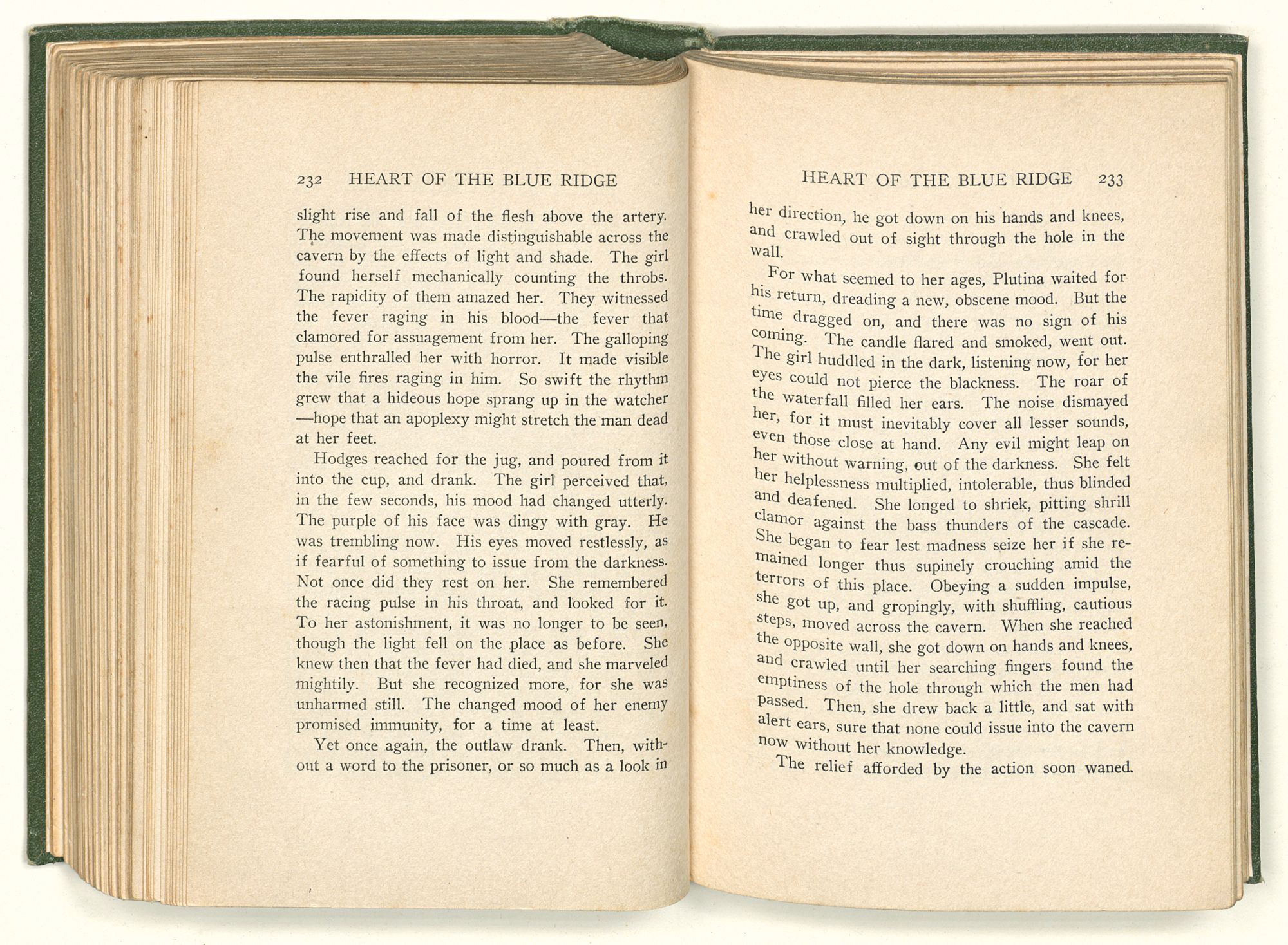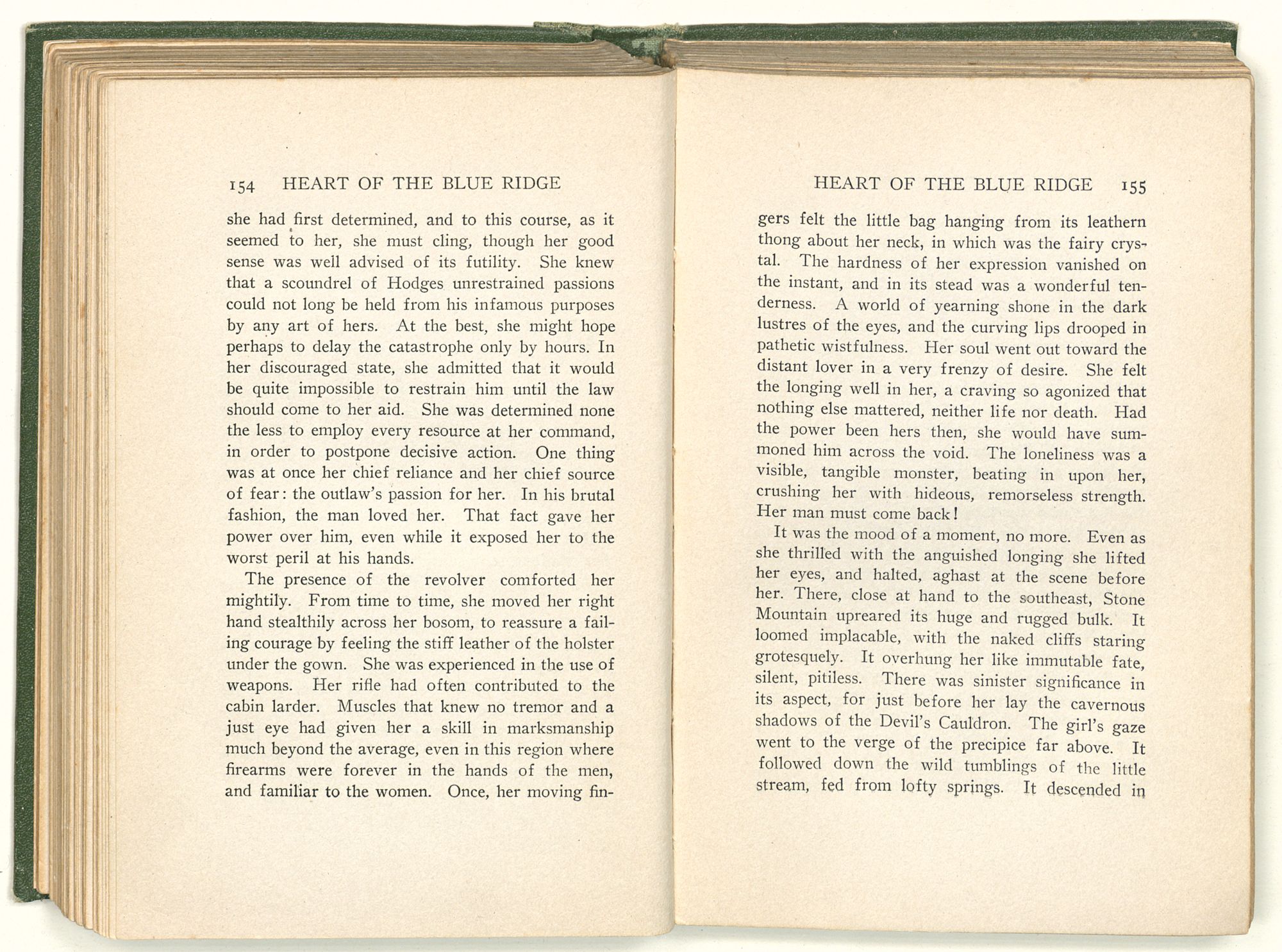 As he pressed onward, the adventurer quickly regained his poise. The novelty of the situation thrilled him agreeably. His thoughts were crowded with imaginings of the strange things to come. Ambitious vision of himself successful among the city's throngs made his pulses beat faster. He felt that he had within him the power to achieve something worth while in the world. Certainly, he would not fail for lack of striving. But no triumph elsewhere could ever wean him from his love for the Blue Ridge—for his home country. Yes, it was as he had said there in the store: He would come back. He would come back to the cabin in the “cove” under the shadows of Stone Mountain—back to the old mother, back to Plutina. A warmth of exquisite tenderness vibrated through him, as his hope leaped to that home-coming, to the time when once again the girl should rest clinging on his bosom. And a great peace lay under all his joy of anticipation. His love knew no doubt. She had given her heart to him. Through his every wandering, whatever might betide, her love would be with him, to comfort him in sorrow, to crown him in happiness. A bird's song recalled the lilt of her laughter. He saw again the tremulous curving of her mouth, red against the fine warm pallor of her face at parting. Passion welled in him. He halted yet once again, and stood with face suffused, gazing back. It was