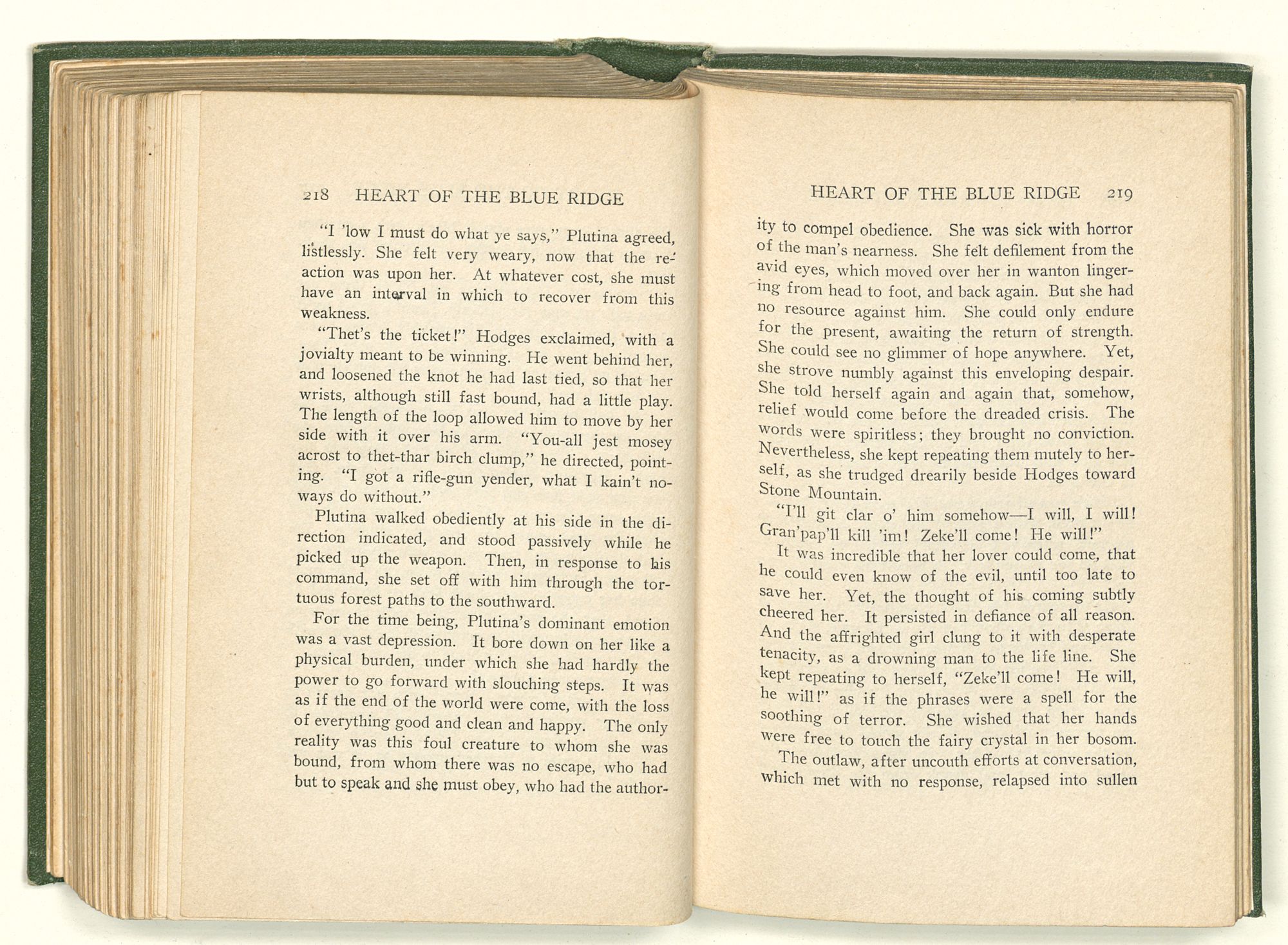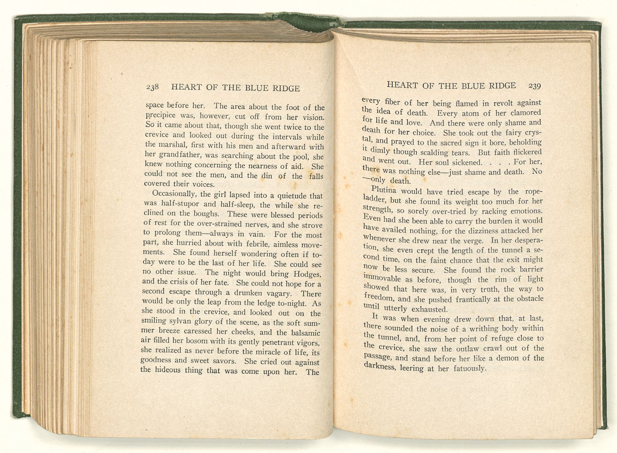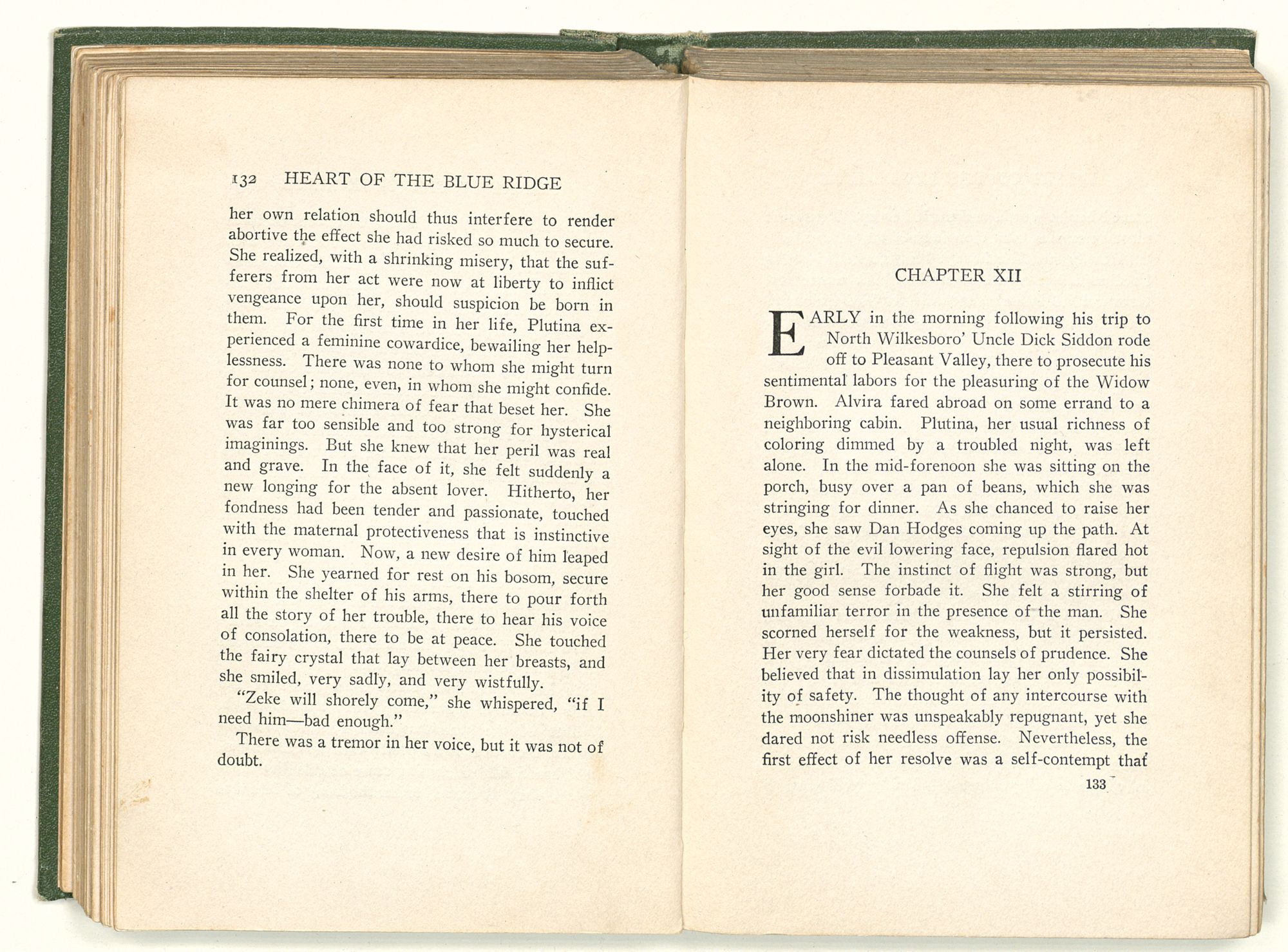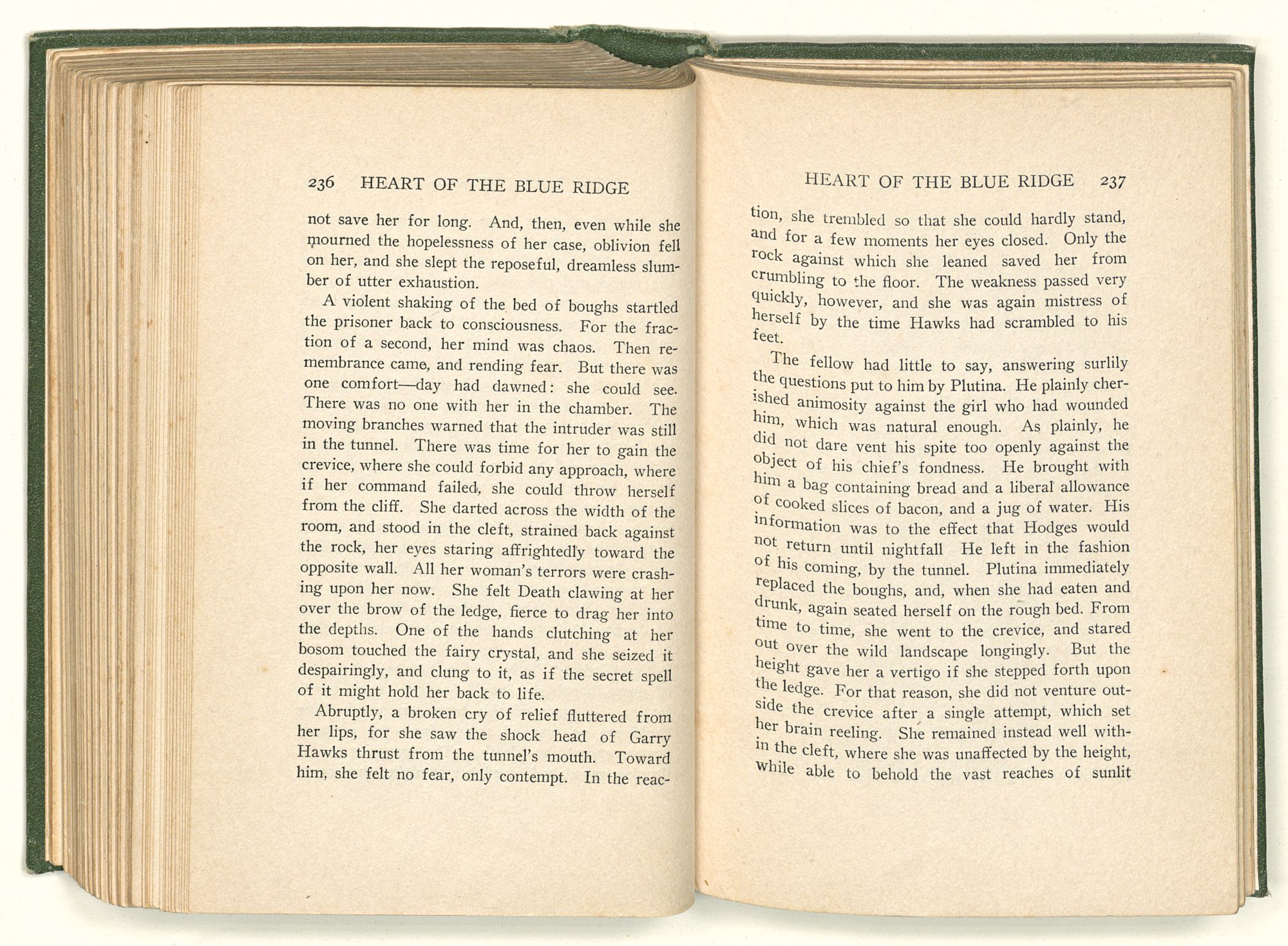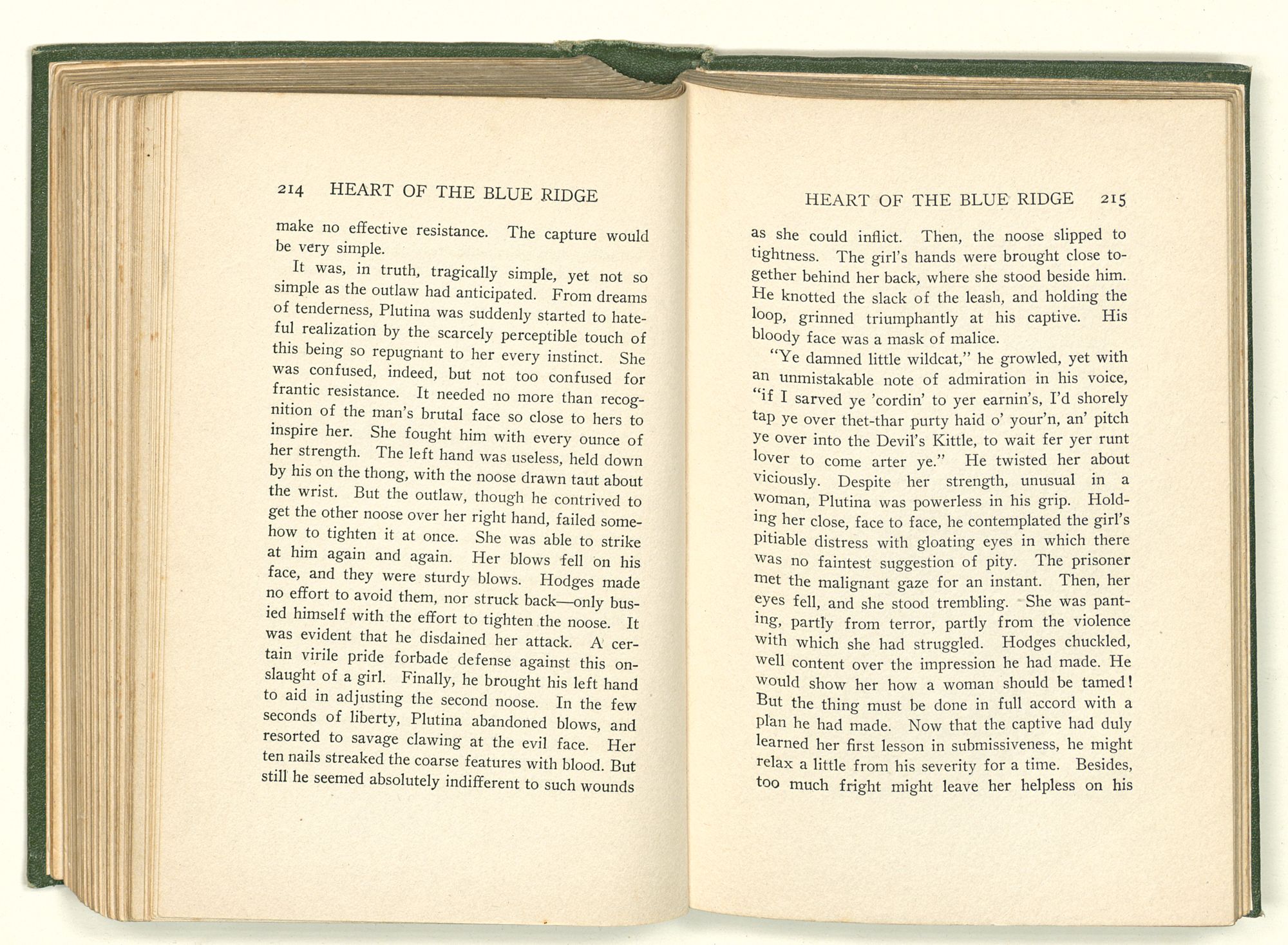 As he pressed onward, the adventurer quickly regained his poise. The novelty of the situation thrilled him agreeably. His thoughts were crowded with imaginings of the strange things to come. Ambitious vision of himself successful among the city's throngs made his pulses beat faster. He felt that he had within him the power to achieve something worth while in the world. Certainly, he would not fail for lack of striving. But no triumph elsewhere could ever wean him from his love for the Blue Ridge—for his home country. Yes, it was as he had said there in the store: He would come back. He would come back to the cabin in the “cove” under the shadows of Stone Mountain—back to the old mother, back to Plutina. A warmth of exquisite tenderness vibrated through him, as his hope leaped to that home-coming, to the time when once again the girl should rest clinging on his bosom. And a great peace lay under all his joy of anticipation. His love knew no doubt. She had given her heart to him. Through his every wandering, whatever might betide, her love would be with him, to comfort him in sorrow, to crown him in happiness. A bird's song recalled the lilt of her laughter. He saw again the tremulous curving of her mouth, red against the fine warm pallor of her face at parting. Passion welled in him. He halted yet once again, and stood with face suffused, gazing back. It was