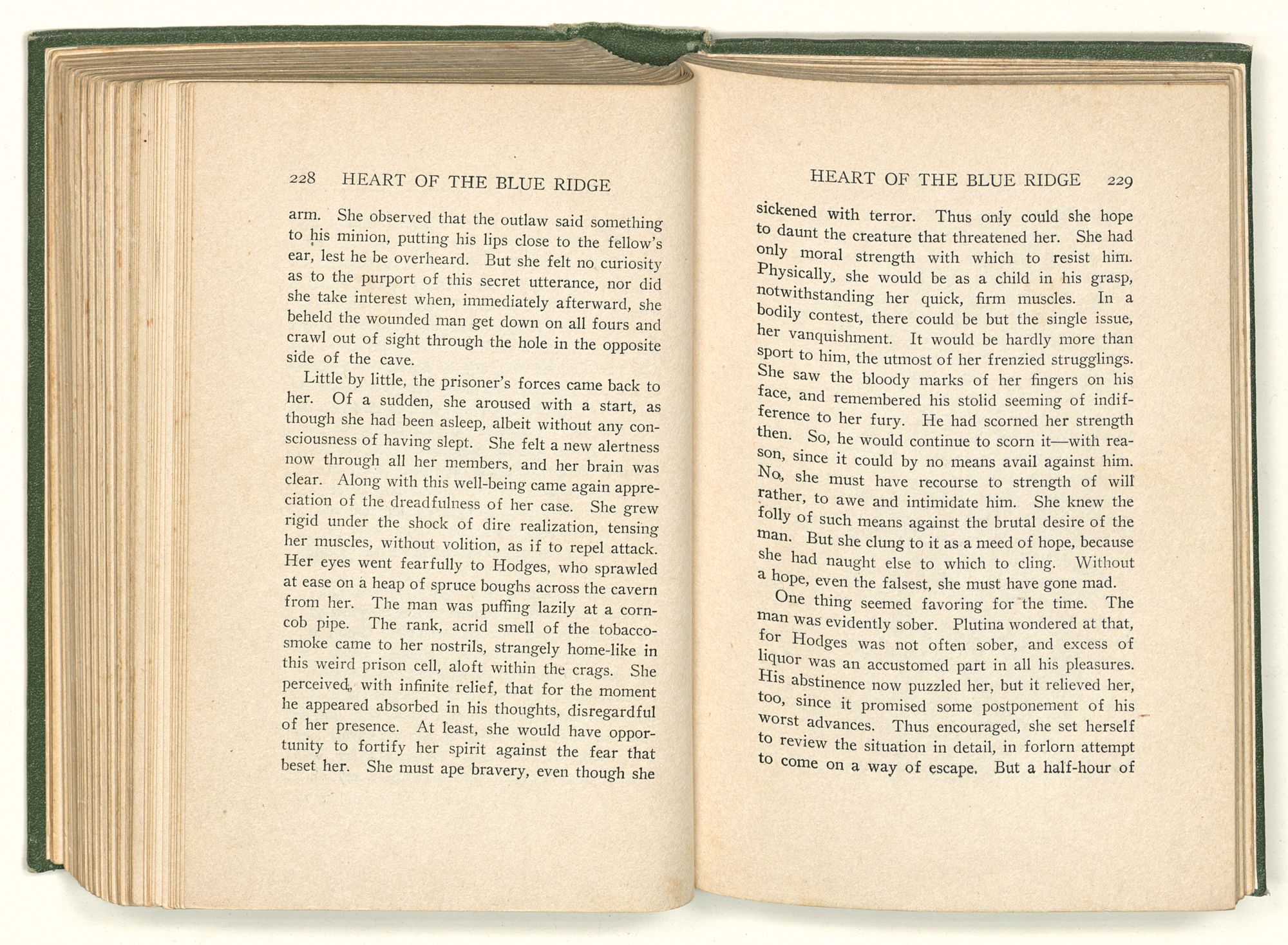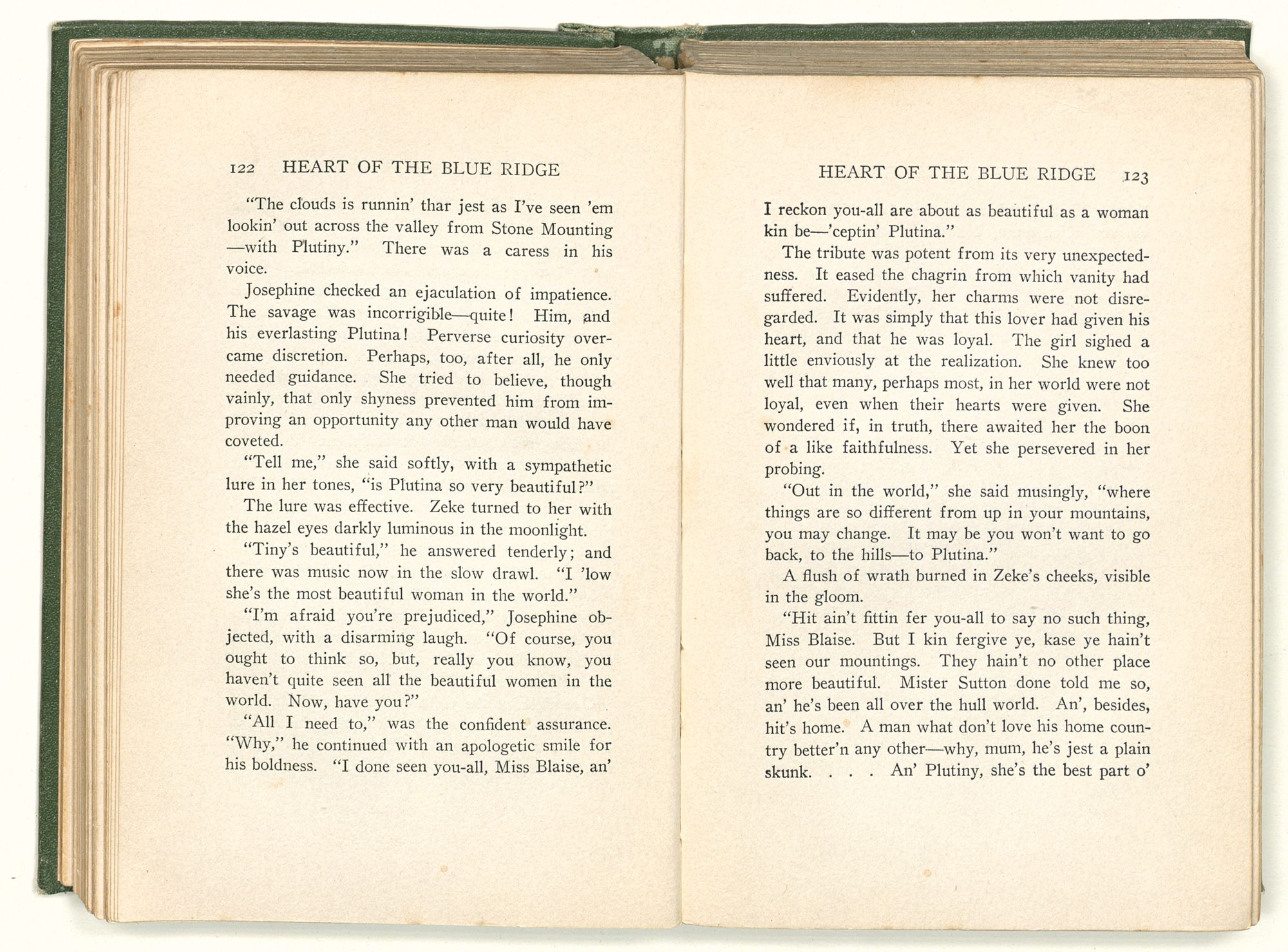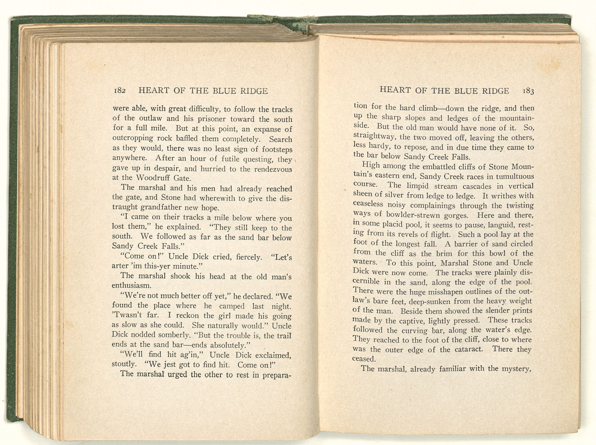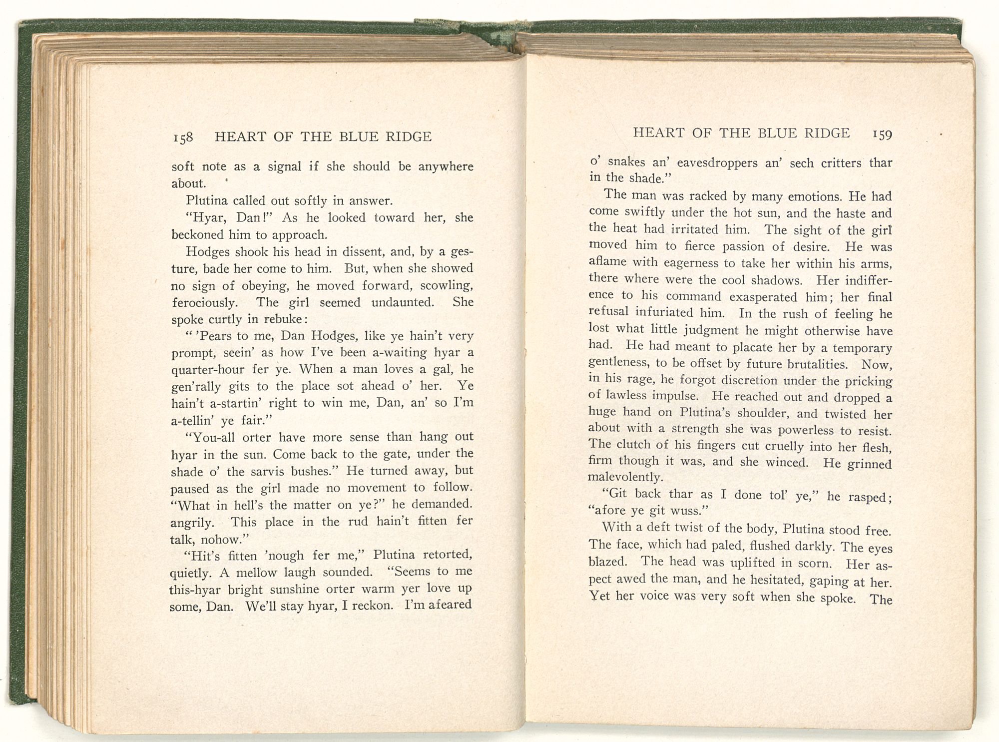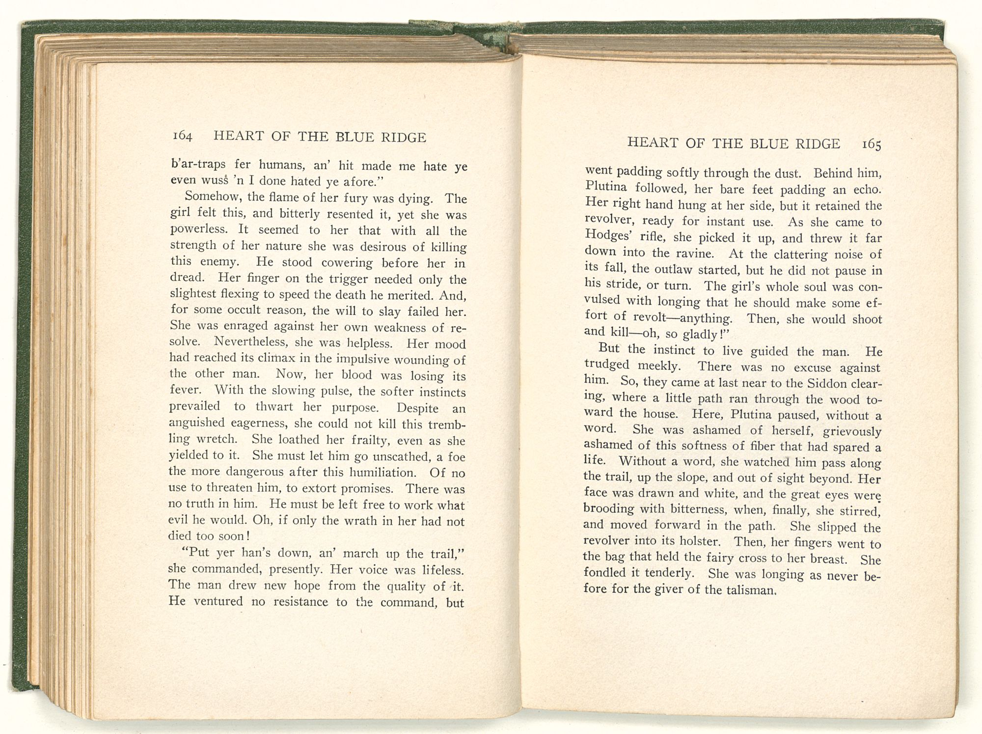 As he pressed onward, the adventurer quickly regained his poise. The novelty of the situation thrilled him agreeably. His thoughts were crowded with imaginings of the strange things to come. Ambitious vision of himself successful among the city's throngs made his pulses beat faster. He felt that he had within him the power to achieve something worth while in the world. Certainly, he would not fail for lack of striving. But no triumph elsewhere could ever wean him from his love for the Blue Ridge—for his home country. Yes, it was as he had said there in the store: He would come back. He would come back to the cabin in the “cove” under the shadows of Stone Mountain—back to the old mother, back to Plutina. A warmth of exquisite tenderness vibrated through him, as his hope leaped to that home-coming, to the time when once again the girl should rest clinging on his bosom. And a great peace lay under all his joy of anticipation. His love knew no doubt. She had given her heart to him. Through his every wandering, whatever might betide, her love would be with him, to comfort him in sorrow, to crown him in happiness. A bird's song recalled the lilt of her laughter. He saw again the tremulous curving of her mouth, red against the fine warm pallor of her face at parting. Passion welled in him. He halted yet once again, and stood with face suffused, gazing back. It was