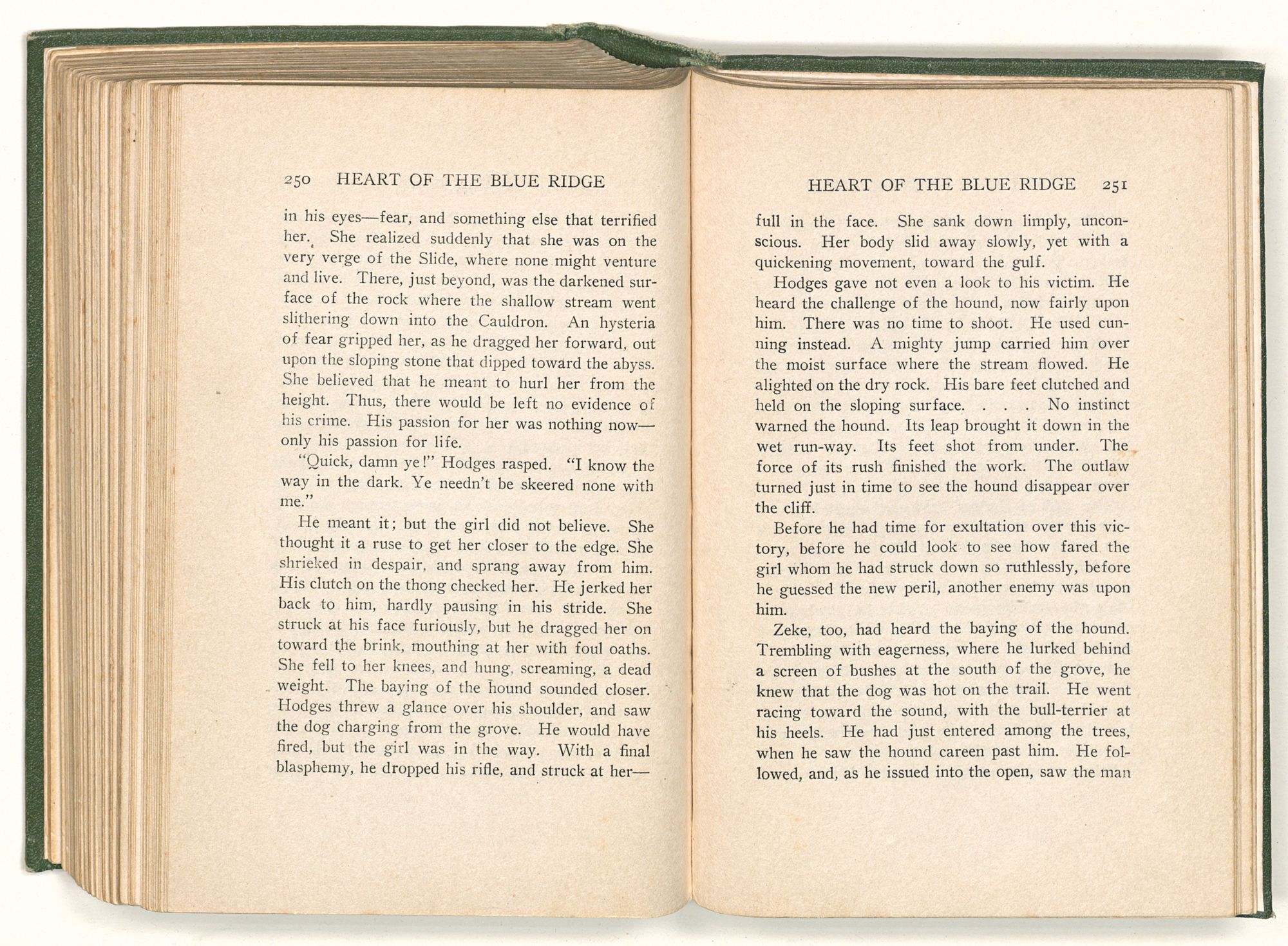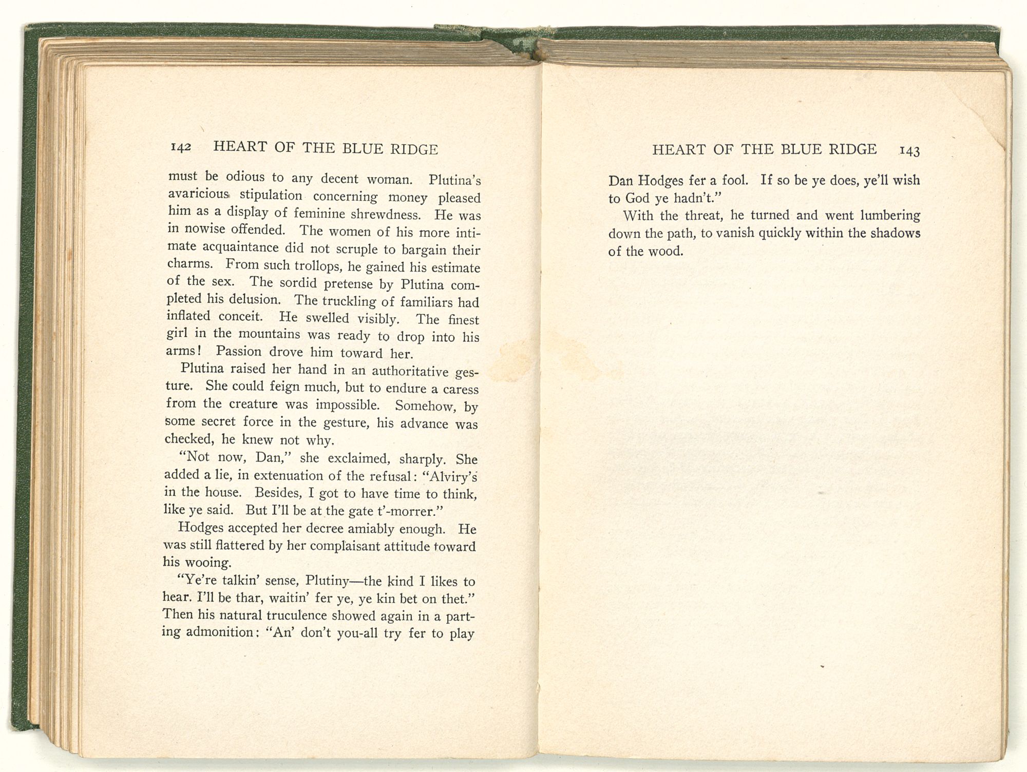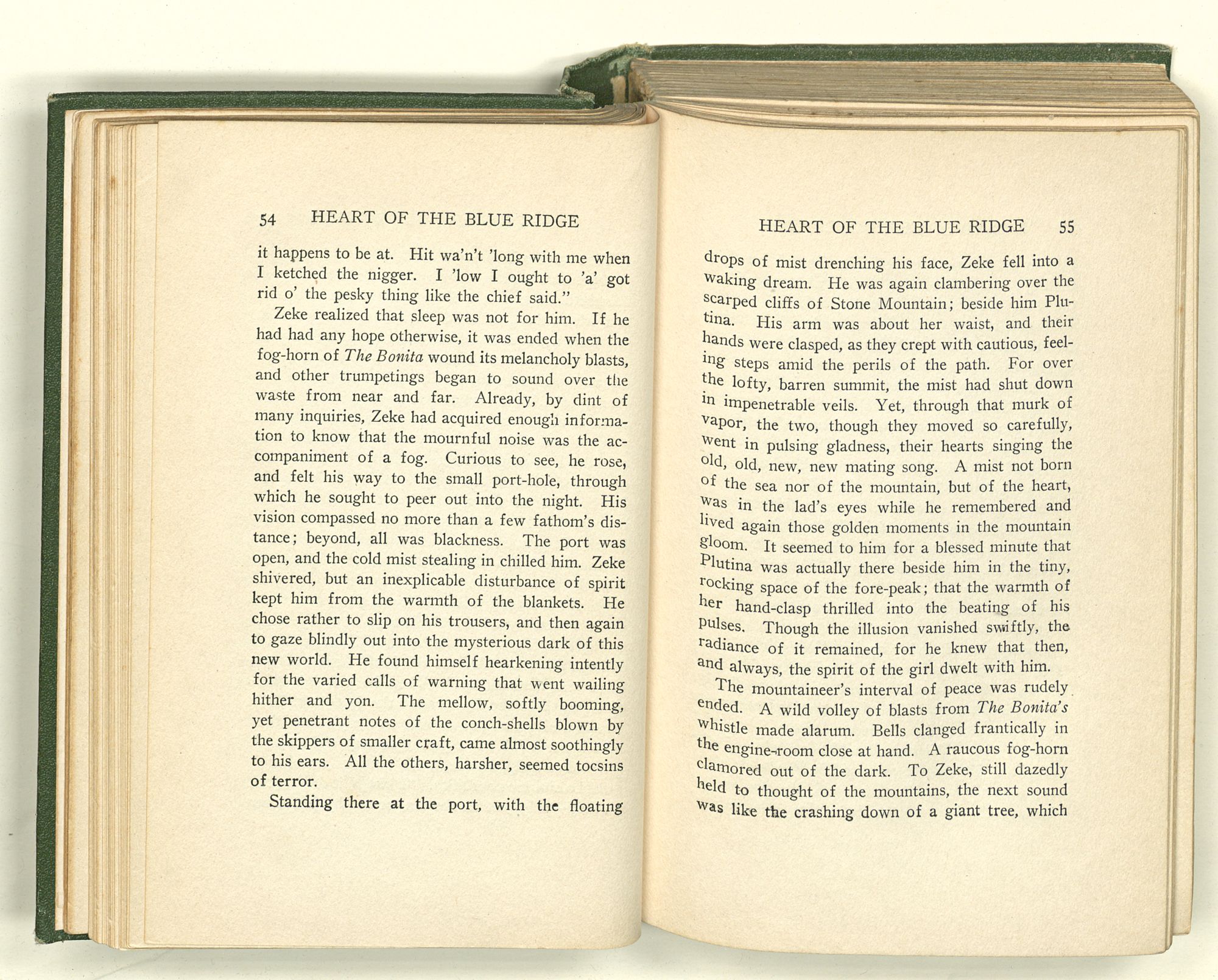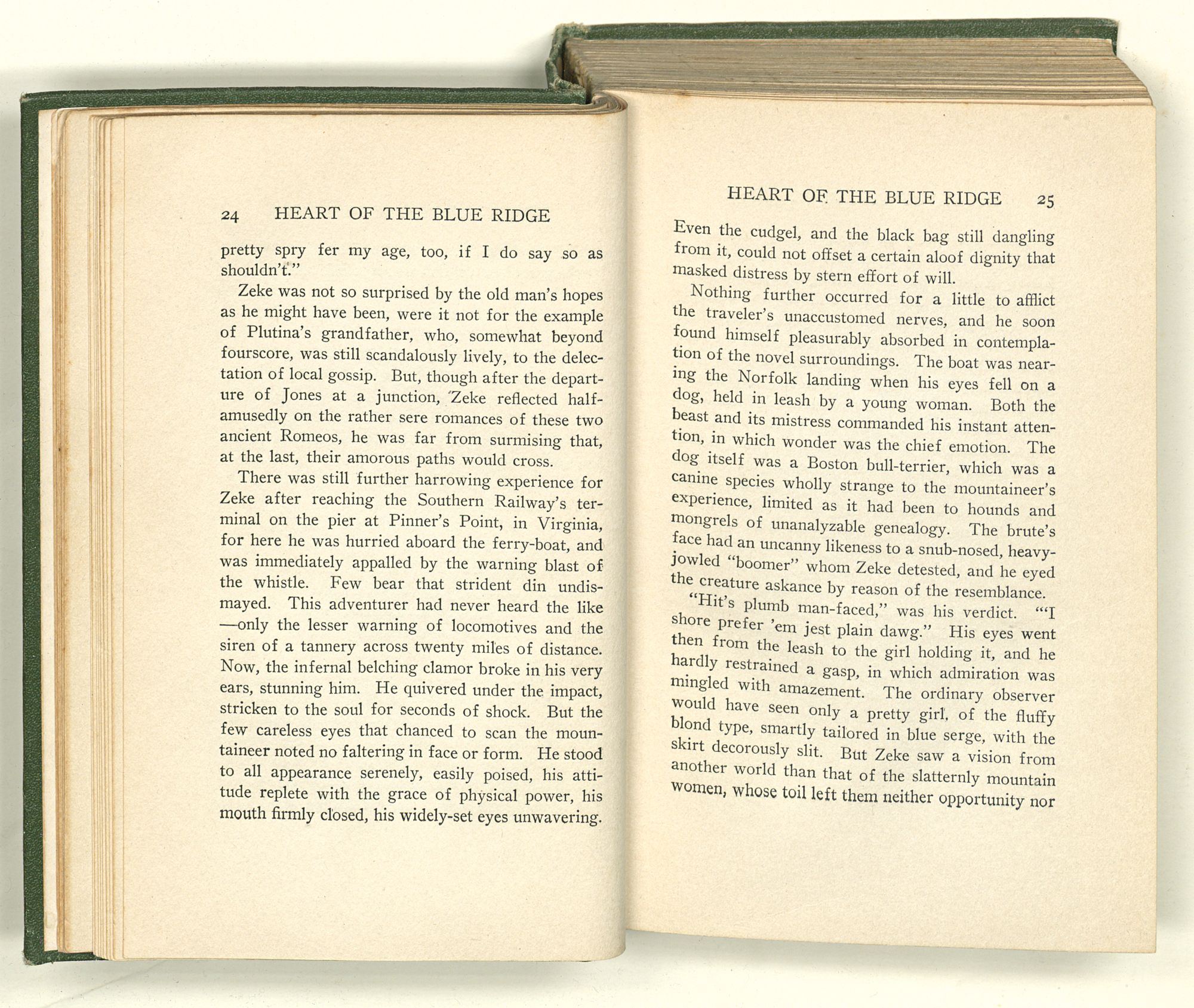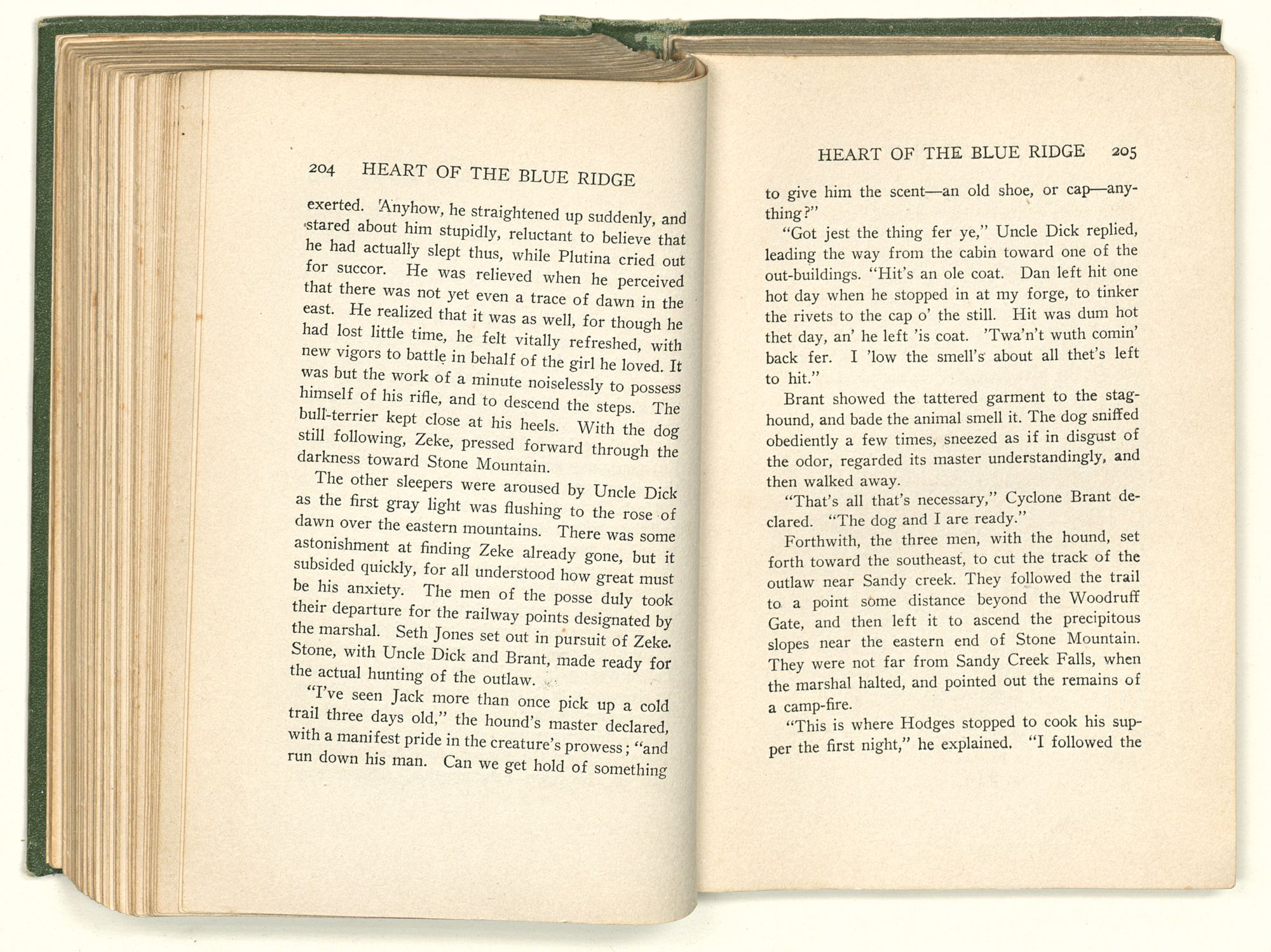 As he pressed onward, the adventurer quickly regained his poise. The novelty of the situation thrilled him agreeably. His thoughts were crowded with imaginings of the strange things to come. Ambitious vision of himself successful among the city's throngs made his pulses beat faster. He felt that he had within him the power to achieve something worth while in the world. Certainly, he would not fail for lack of striving. But no triumph elsewhere could ever wean him from his love for the Blue Ridge—for his home country. Yes, it was as he had said there in the store: He would come back. He would come back to the cabin in the “cove” under the shadows of Stone Mountain—back to the old mother, back to Plutina. A warmth of exquisite tenderness vibrated through him, as his hope leaped to that home-coming, to the time when once again the girl should rest clinging on his bosom. And a great peace lay under all his joy of anticipation. His love knew no doubt. She had given her heart to him. Through his every wandering, whatever might betide, her love would be with him, to comfort him in sorrow, to crown him in happiness. A bird's song recalled the lilt of her laughter. He saw again the tremulous curving of her mouth, red against the fine warm pallor of her face at parting. Passion welled in him. He halted yet once again, and stood with face suffused, gazing back. It was