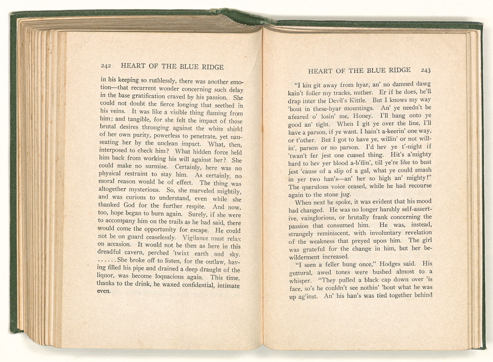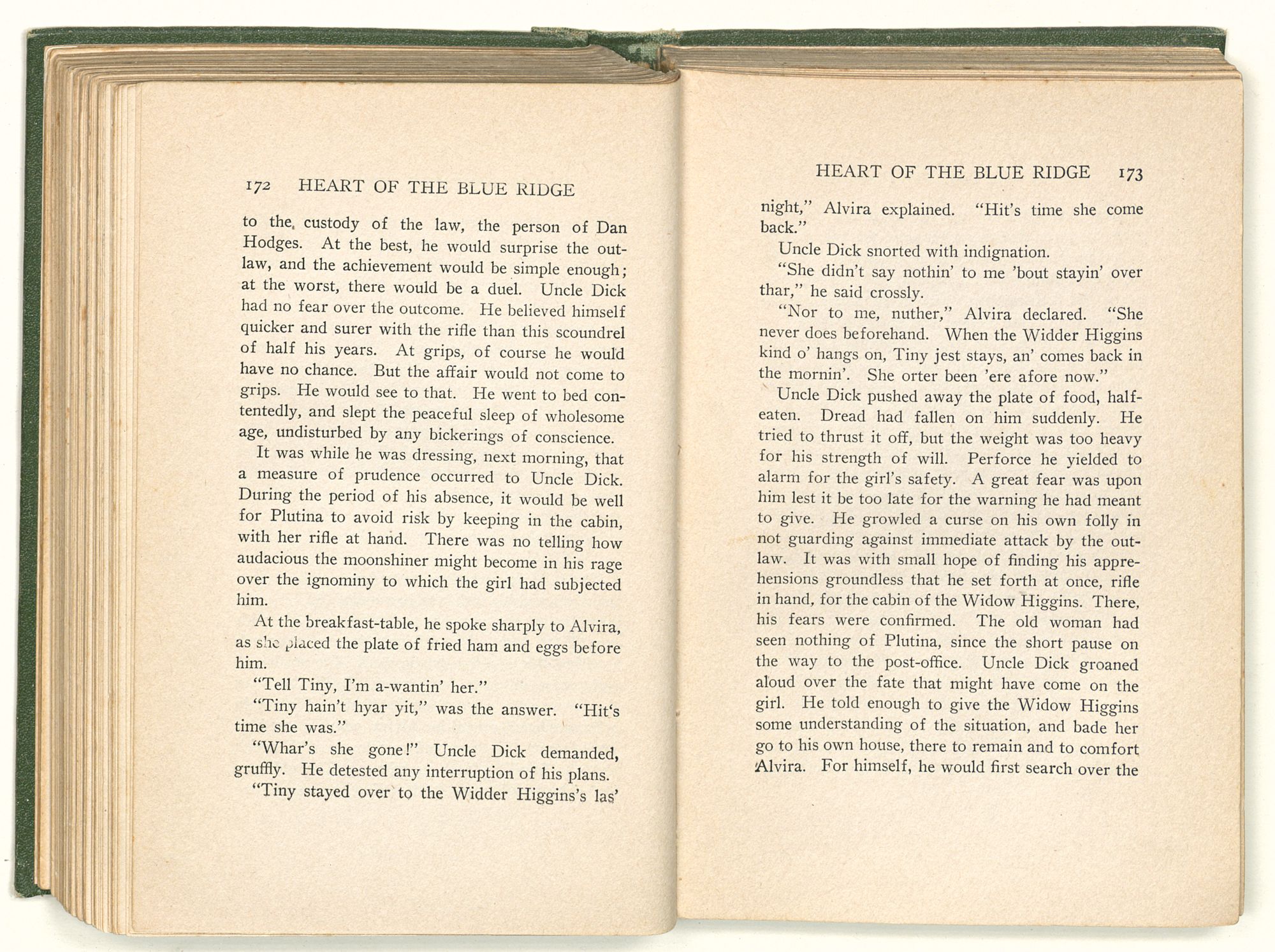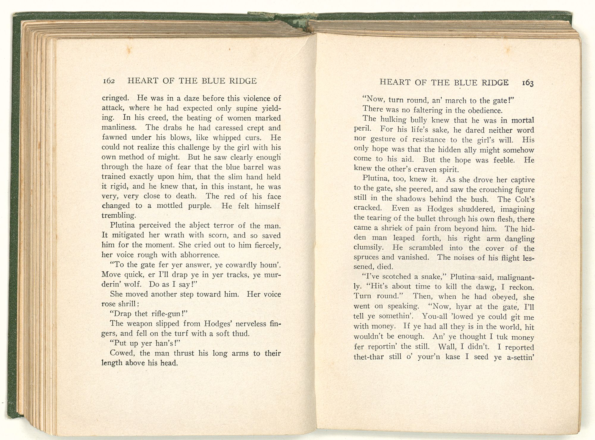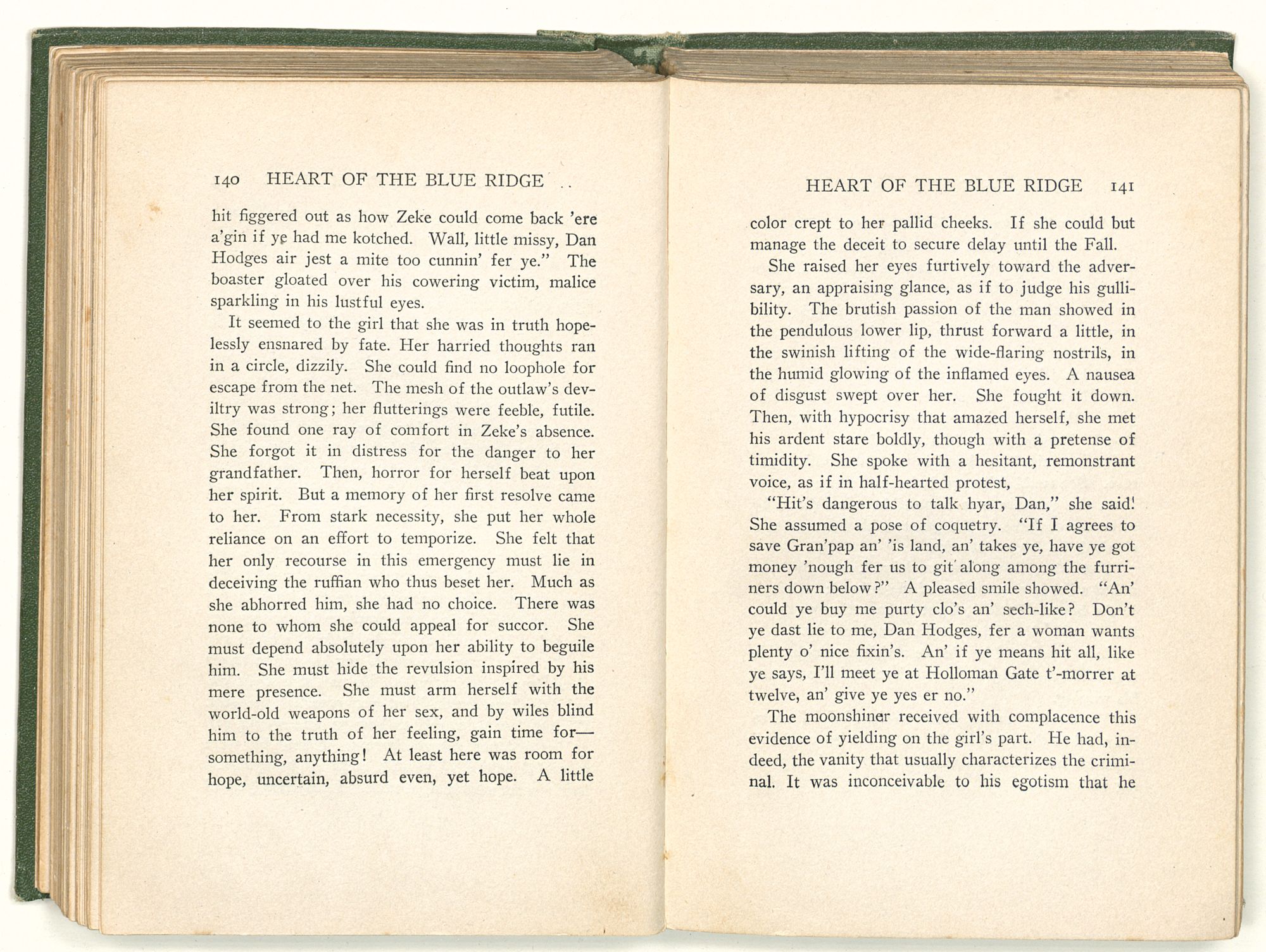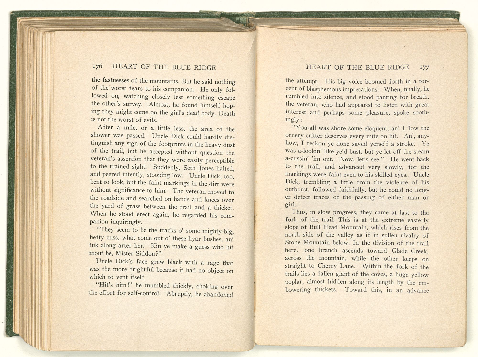 As he pressed onward, the adventurer quickly regained his poise. The novelty of the situation thrilled him agreeably. His thoughts were crowded with imaginings of the strange things to come. Ambitious vision of himself successful among the city's throngs made his pulses beat faster. He felt that he had within him the power to achieve something worth while in the world. Certainly, he would not fail for lack of striving. But no triumph elsewhere could ever wean him from his love for the Blue Ridge—for his home country. Yes, it was as he had said there in the store: He would come back. He would come back to the cabin in the “cove” under the shadows of Stone Mountain—back to the old mother, back to Plutina. A warmth of exquisite tenderness vibrated through him, as his hope leaped to that home-coming, to the time when once again the girl should rest clinging on his bosom. And a great peace lay under all his joy of anticipation. His love knew no doubt. She had given her heart to him. Through his every wandering, whatever might betide, her love would be with him, to comfort him in sorrow, to crown him in happiness. A bird's song recalled the lilt of her laughter. He saw again the tremulous curving of her mouth, red against the fine warm pallor of her face at parting. Passion welled in him. He halted yet once again, and stood with face suffused, gazing back. It was