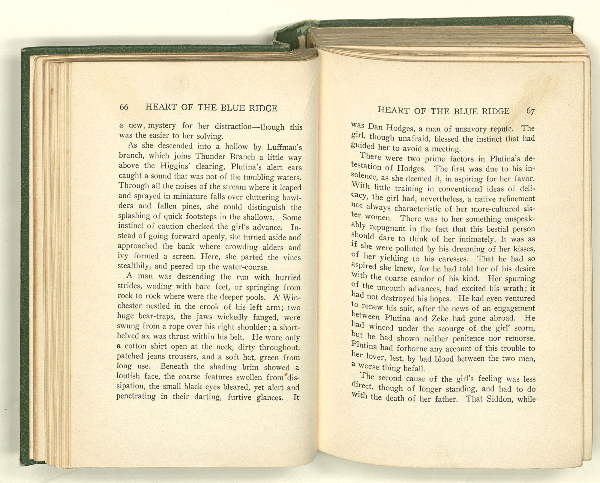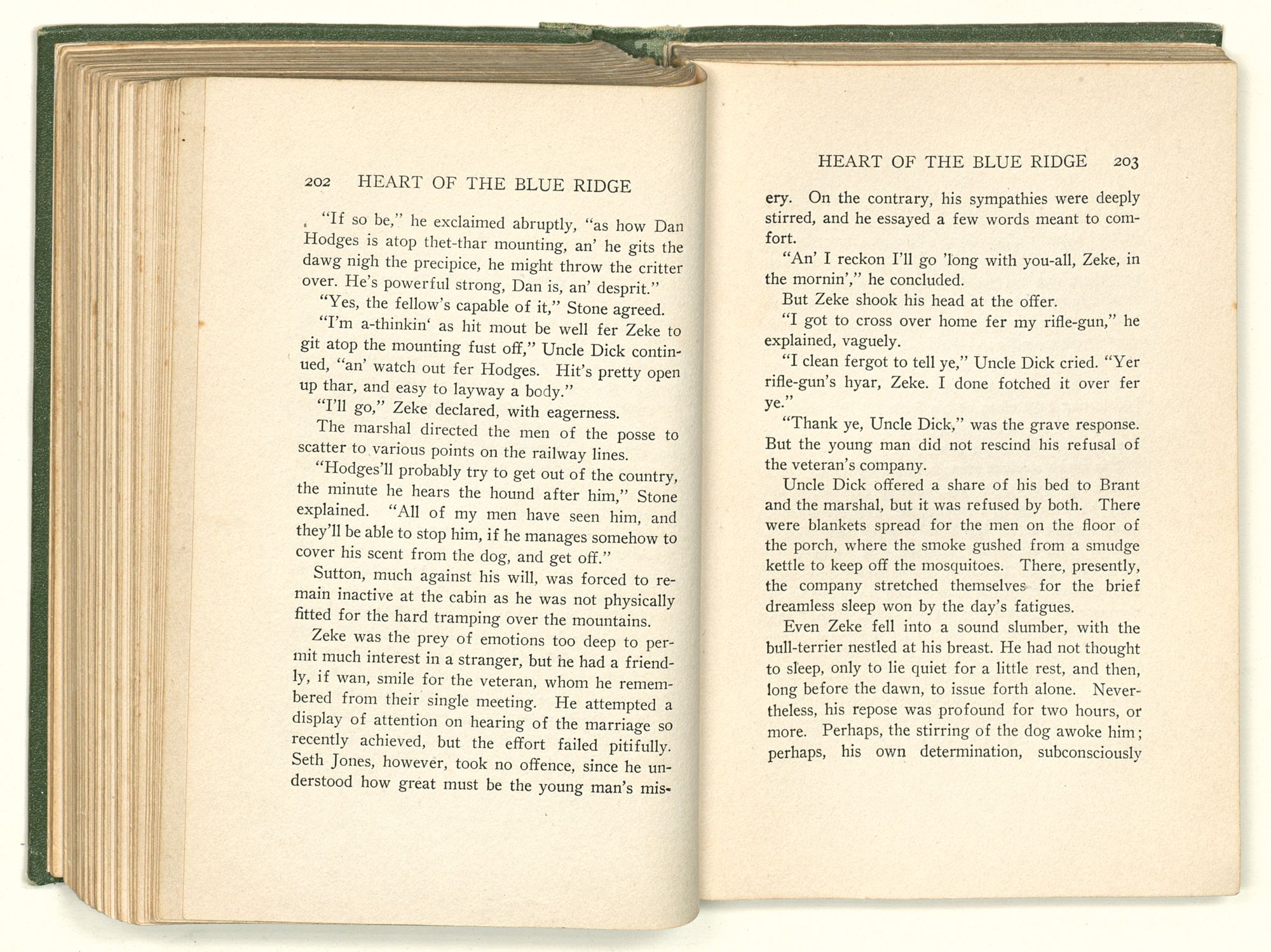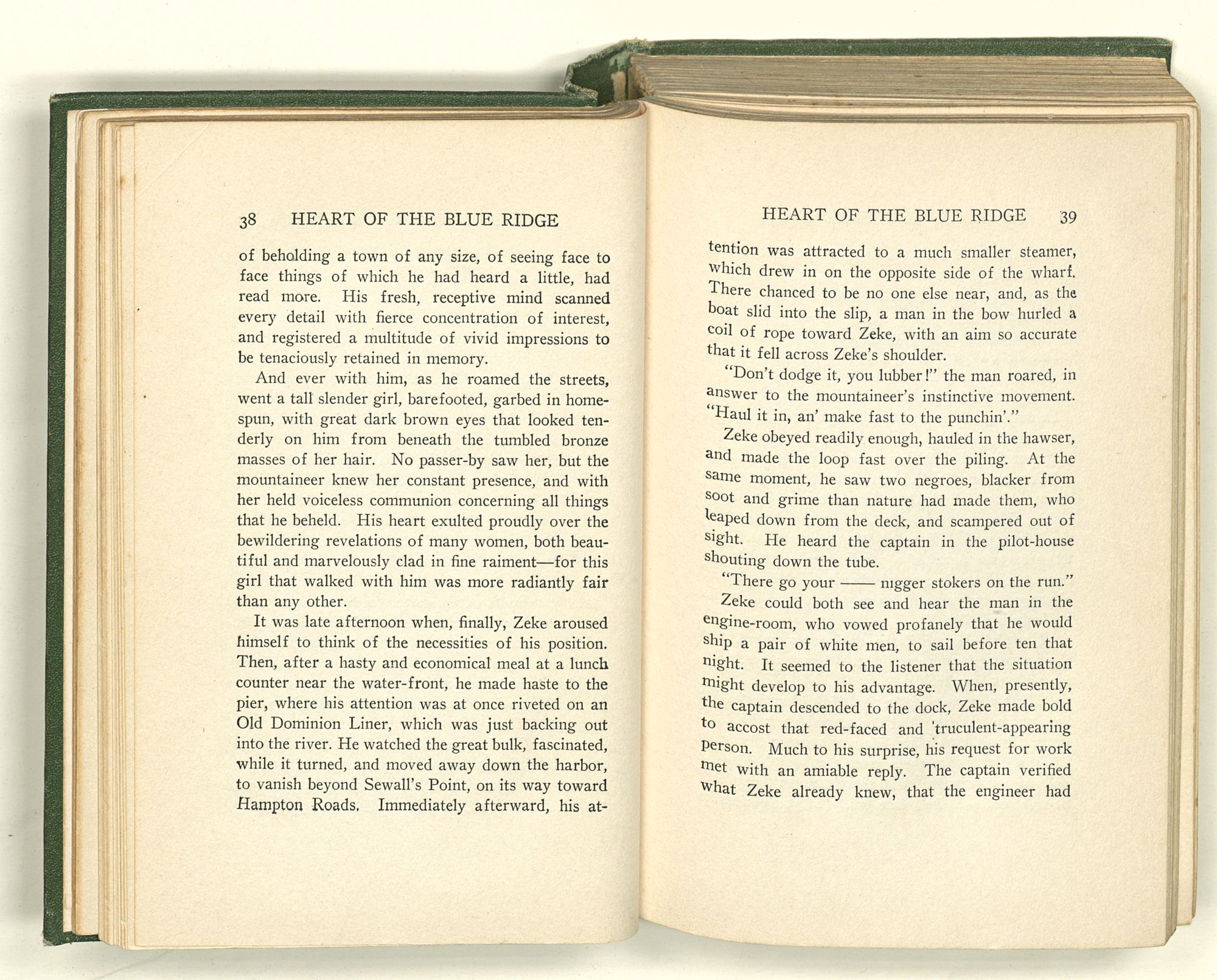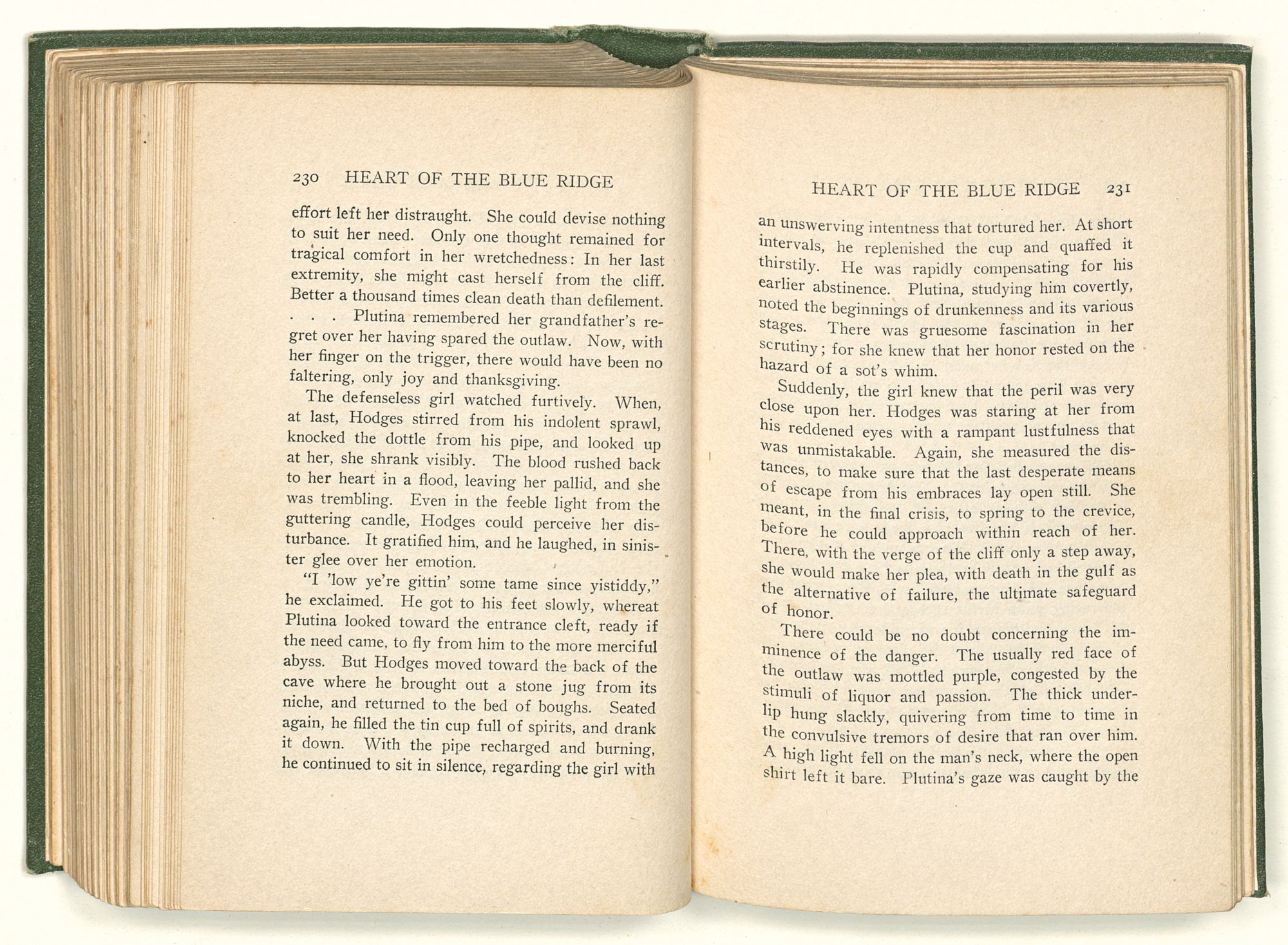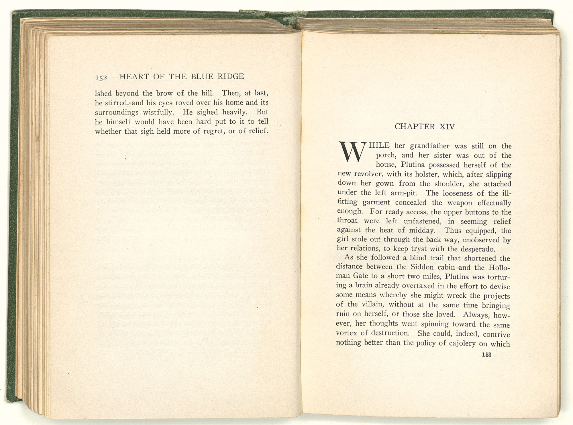 As he pressed onward, the adventurer quickly regained his poise. The novelty of the situation thrilled him agreeably. His thoughts were crowded with imaginings of the strange things to come. Ambitious vision of himself successful among the city's throngs made his pulses beat faster. He felt that he had within him the power to achieve something worth while in the world. Certainly, he would not fail for lack of striving. But no triumph elsewhere could ever wean him from his love for the Blue Ridge—for his home country. Yes, it was as he had said there in the store: He would come back. He would come back to the cabin in the “cove” under the shadows of Stone Mountain—back to the old mother, back to Plutina. A warmth of exquisite tenderness vibrated through him, as his hope leaped to that home-coming, to the time when once again the girl should rest clinging on his bosom. And a great peace lay under all his joy of anticipation. His love knew no doubt. She had given her heart to him. Through his every wandering, whatever might betide, her love would be with him, to comfort him in sorrow, to crown him in happiness. A bird's song recalled the lilt of her laughter. He saw again the tremulous curving of her mouth, red against the fine warm pallor of her face at parting. Passion welled in him. He halted yet once again, and stood with face suffused, gazing back. It was