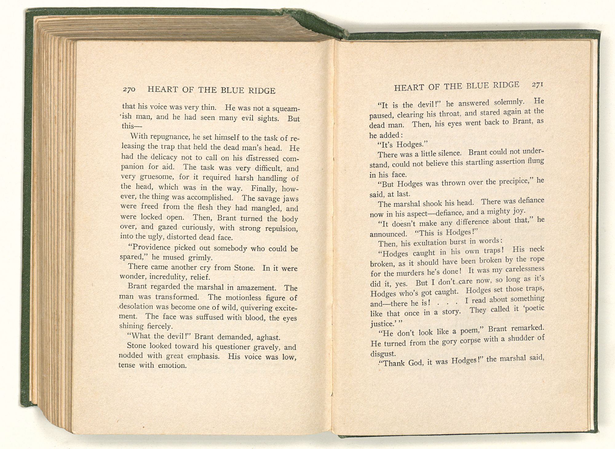 The affair was easily explicable in the light of what Plutina had to tell. Hodges, undoubtedy, had knowedge of some secret, hazardous path down the face of the precipice past the Devil's Cauldron, and on to the valley. He had meant to flee by it with Plutina, thus to escape the hound. By it, he had fled alone. Perhaps, he had had a hiding-place for money somewhere about the raided still. Or, perhaps, he had merely chosen this route along Thunder Branch on his way to an asylum beyond Bull Head Mountain. What was certain was that he had blundered into his own pitiless snares, Naturally, he would have had no suspicion that the traps remained. In his mad haste, he had rushed heedlessly upon destruction. The remorseless engines of his own devising had taken full toll of him. By his own act, he paid with his life the penalty for crime. There was propriety in the marshal's reference to poetic justice.