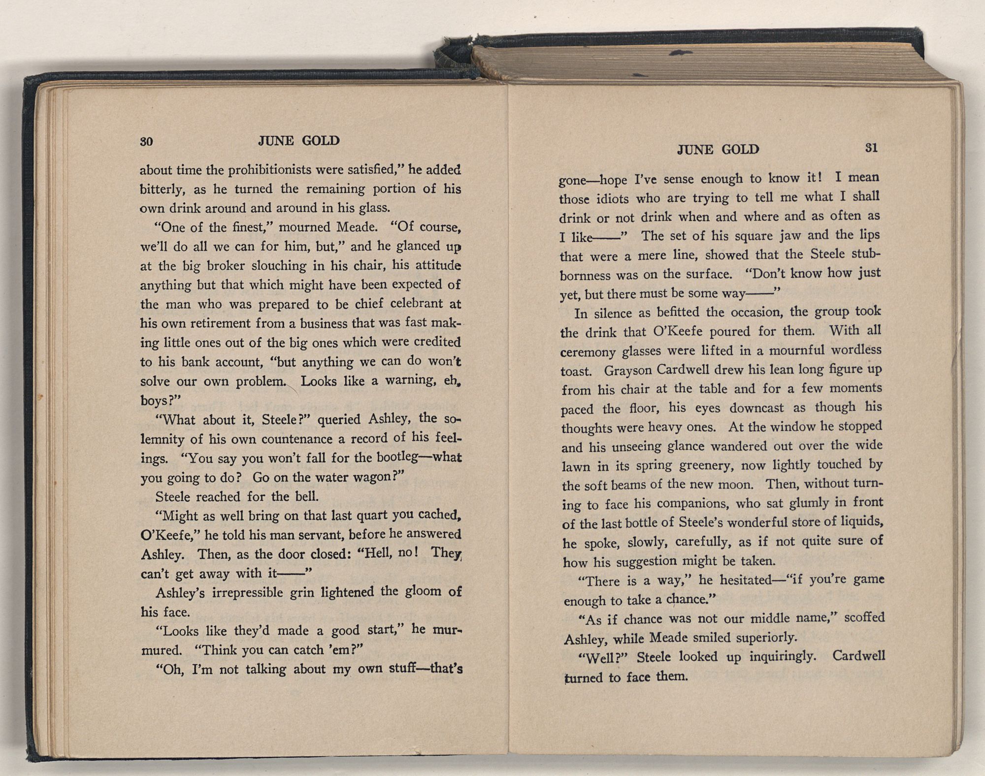 “Sit down, Meade,” he invited, and his hand reached for a lower drawer which he jerked open and brought into view a bottle nearly filled with an amber liquid, and bearing a label that the Volstead act had turned into something precious. Clement Ashley grinned and blinked as Steele produced the glasses.