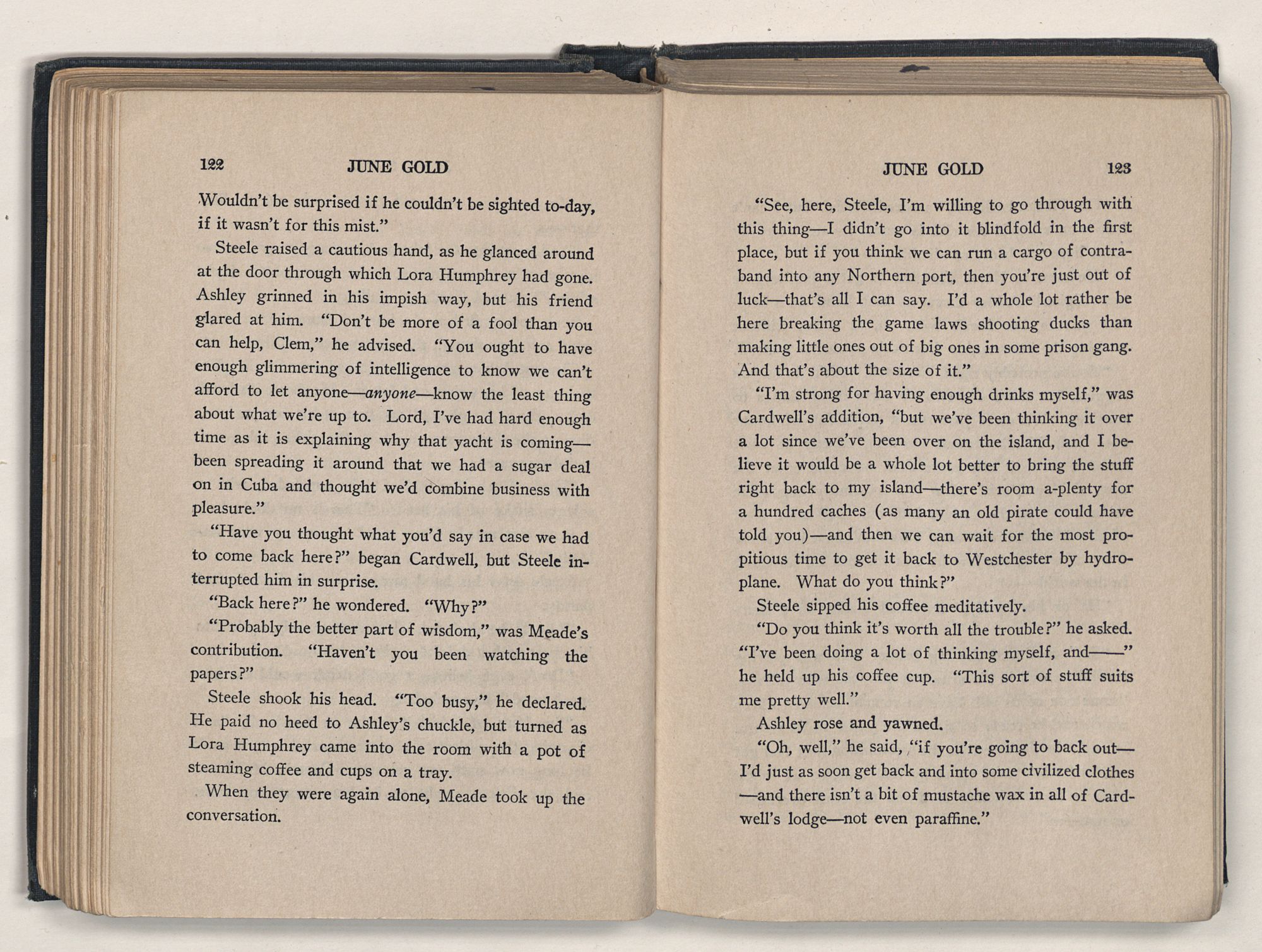 “Wouldn't wonder a bit if we haven't run across the record in treasure finds,” commented Cardwell. “We ought to take inventory. Let's see—I've a volume here—” He stopped in front of one of his bookcases and ran his eye over the books. “Umm—here it is—‘The Gold Bug’—Edgar Allan Poe. They found—” He ran his fingers down a page to the place he wanted to find. “ ‘Diamonds—some of them exceedingly large and fine—a hundred and ten in all, and not one of them small; eighteen rubies of remarkable brilliancy; three hundred and ten emeralds, all very beautiful; and twenty-one sapphires, with an opal.’ Umm! Umm!” he ran further down the page. “Check up what we're lacking,” he said with an upward glance at his guests. “Umm! Umm! ‘A vast quantity of gold ornaments; nearly two hundred massive finger and ear-rings; rich chains; eighty-three very large crucifixes; five great censors of great value; a prodigious golden punch bowl'—er—er—” Cardwell's
