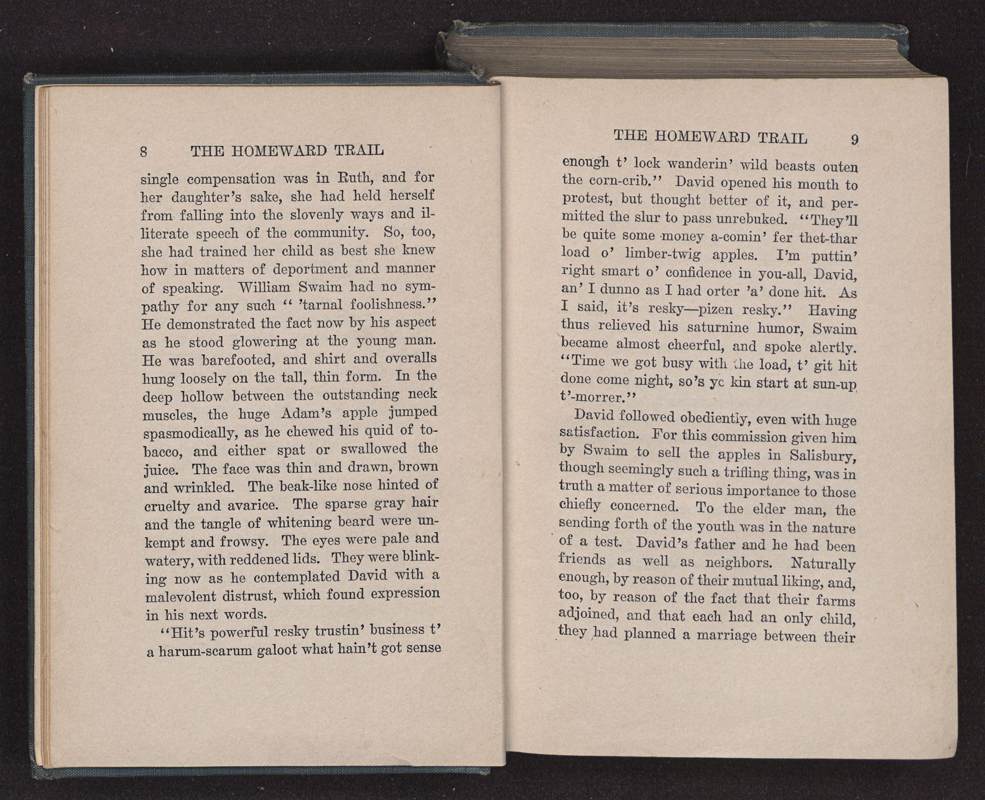 enough t’ lock wanderin’ wild beasts outen the corn-crib.” David opened his mouth to protest, but thought better of it, and permitted the slur to pass unrebuked. “They'll be quite some money a-comin’ fer thet-thar load o’ limber-twig apples. I'm puttin’ right smart o’ confidence in you-all, David, an’ I dunno as I had orter ’a’ done hit. As I said, it's resky—pizen resky.” Having thus relieved his saturnine humor, Swaim became almost cheerful, and spoke alertly. “Time we got busy with the load, t’ git hit done come night, so's ye kin start at sun-up t’-morrer.”
