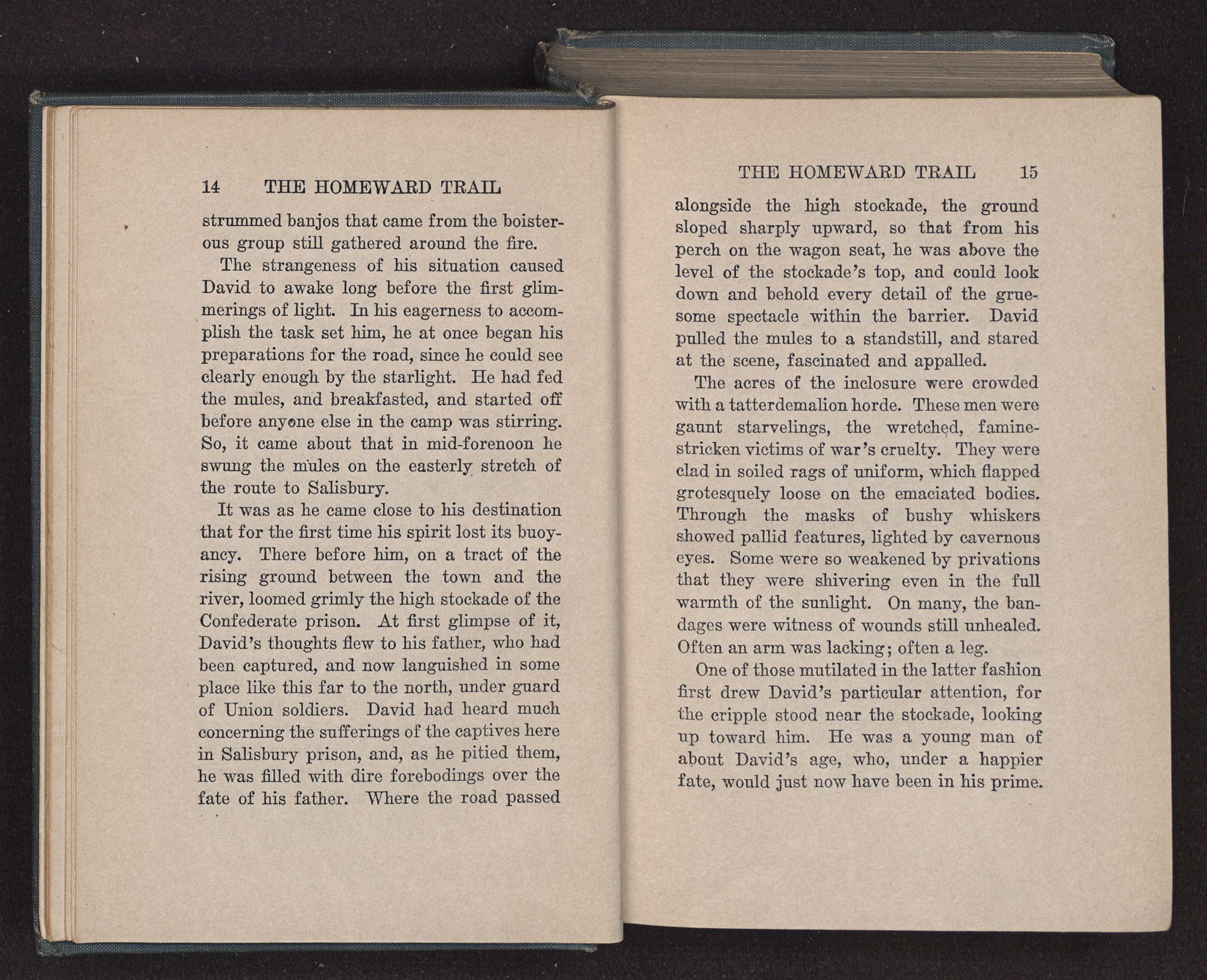 It was as he came close to his destination that for the first time his spirit lost its buoyancy. There before him, on a tract of the rising ground between the town and the river, loomed grimly the high stockade of the Confederate prison. At first glimpse of it, David's thoughts flew to his father, who had been captured, and now languished in some place like this far to the north, under guard of Union soldiers. David had heard much concerning the sufferings of the captives here in Salisbury prison, and, as he pitied them, he was filled with dire forebodings over the fate of his father. Where the road passed