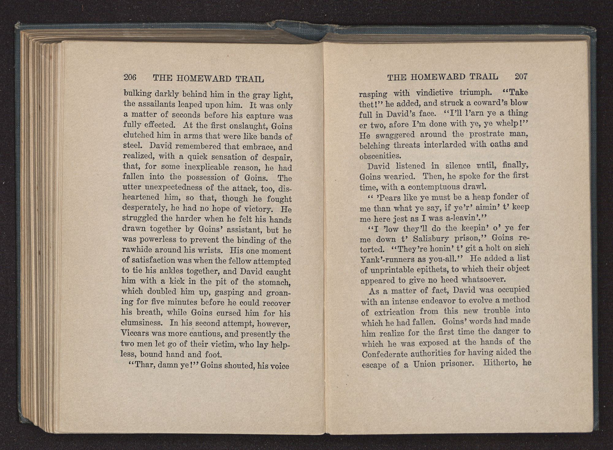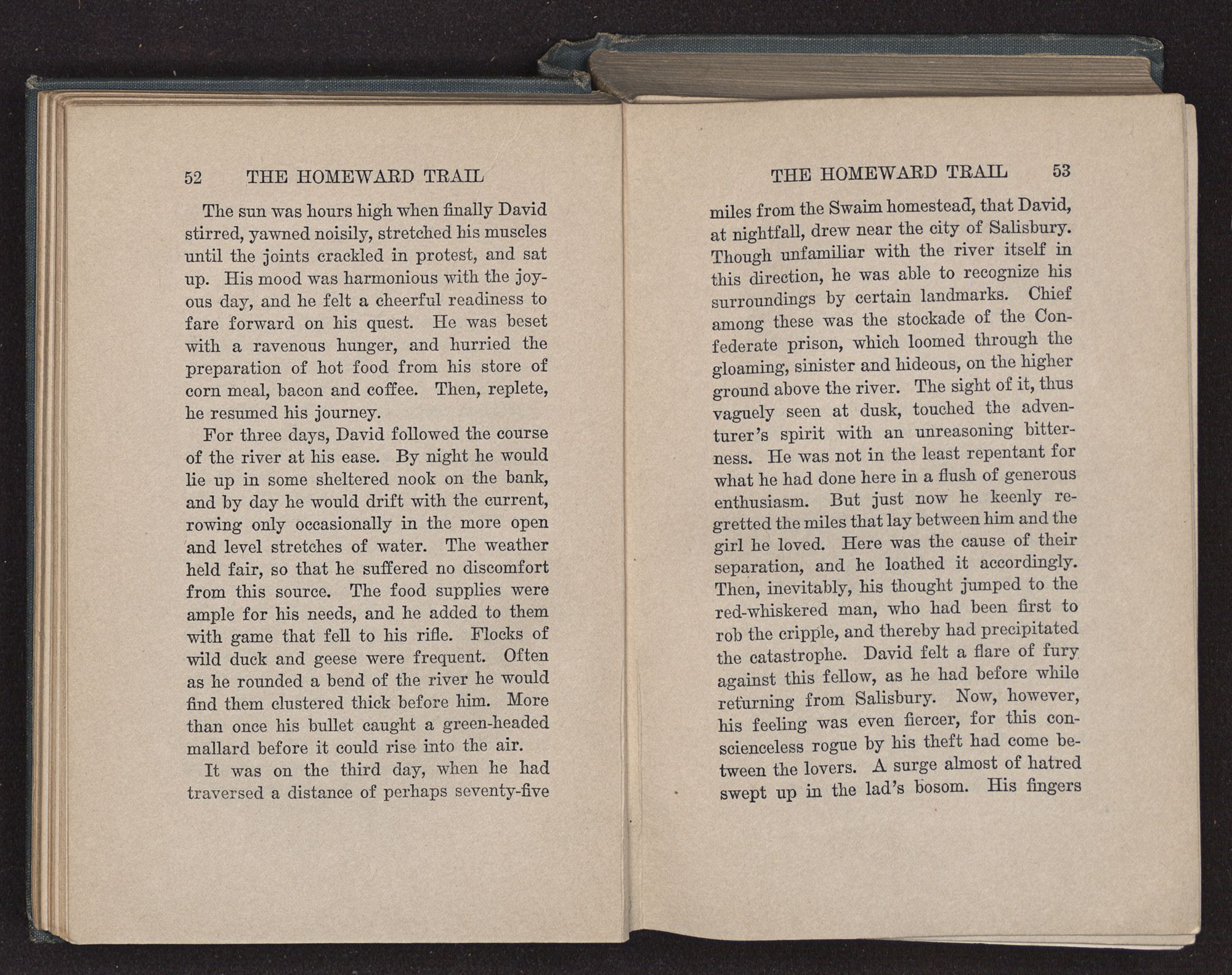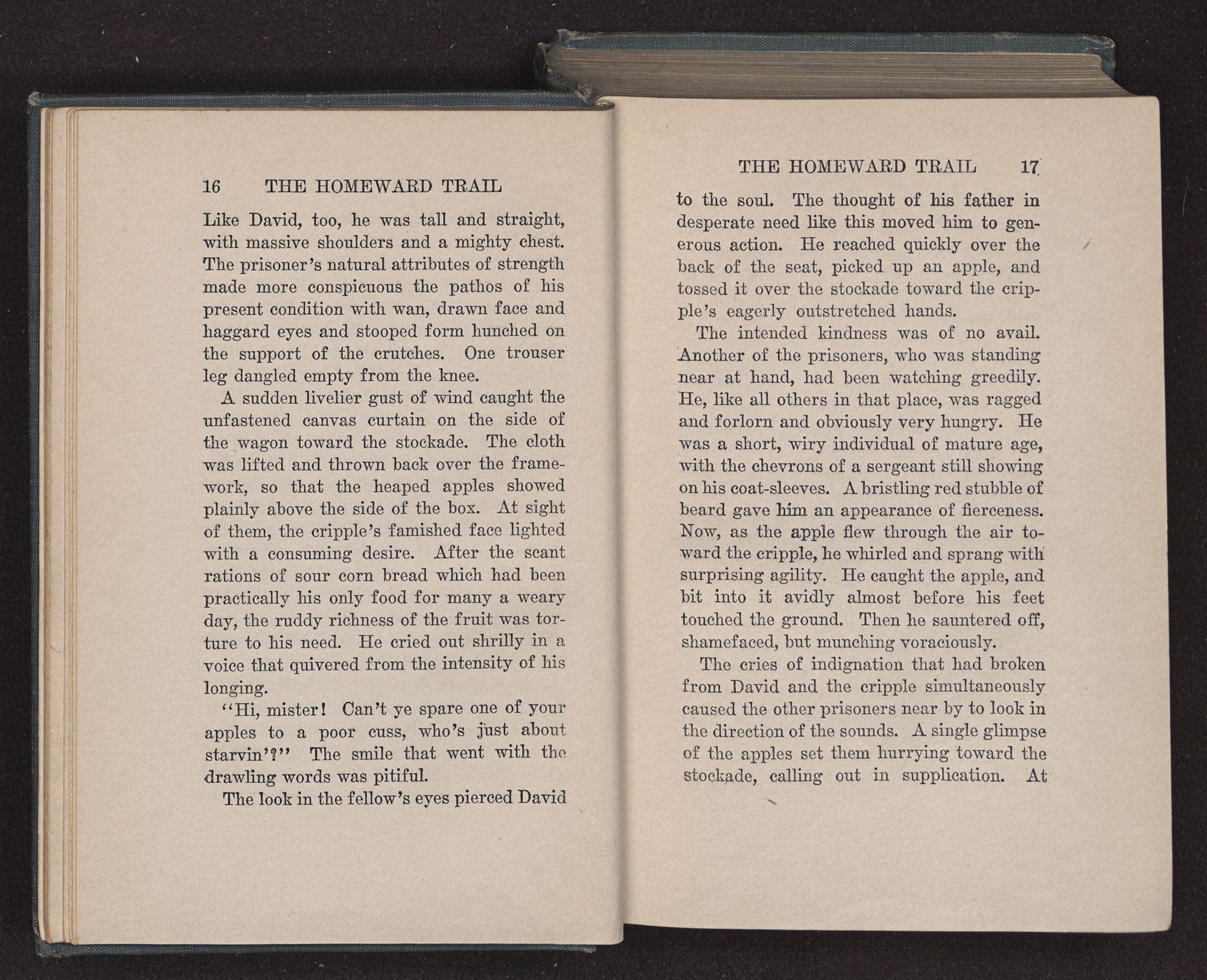 “Why, Mr. Swaim,” he said, in a tone as casual as he could muster, “I got back so quick ’cause I didn't have t’ take the apples clean through t’ Salisbury. I found a customer on the rise o’ the hill where they keep the Yankees that all look so powerful hungry.” He forced a smile. “The feller what bought the apples stood right there in the schooner an’ done tossed the last of ’em right smack over that-there punchin fence while those poor devils scrambled an’ fit t’ git holt onto one.” A flash of reminiscent enthusiasm made his face radiant. “I tell ye, Mr. Swaim, it was wuth twice the wuth o’ the load to see how much good they did them starvin’ humans. The feller what bought ’em just couldn't he'p it, ’cause his heart was teched by sufferin’.” David gulped, hesitated for an instant, then added firmly: “That feller was me. I hain't nary cent t’ pay ye fer ’em. If ye won't wait till pap gits home ag'in, I'll hunt a job t’ work it out.”