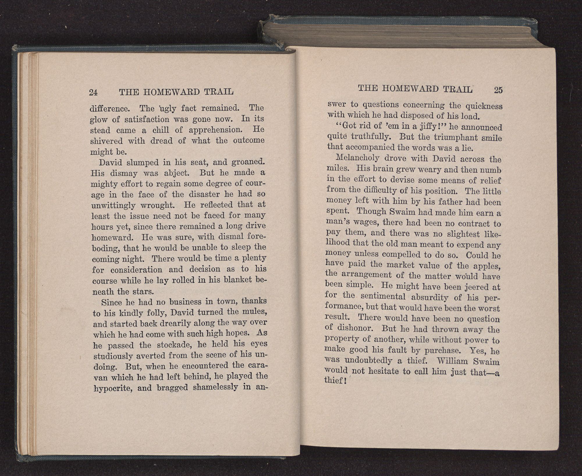 Melancholy drove with David across the miles. His brain grew weary and then numb in the effort to devise some means of relief from the difficulty of his position. The little money left with him by his father had been spent. Though Swaim had made him earn a man's wages, there had been no contract to pay them, and there was no slightest likelihood that the old man meant to expend any money unless compelled to do so. Could he have paid the market value of the apples, the arrangement of the matter would have been simple. He might have been jeered at for the sentimental absurdity of his performance, but that would have been the worst result. There would have been no question of dishonor. But he had thrown away the property of another, while without power to make good his fault by purchase. Yes, he was undoubtedly a thief. William Swaim would not hesitate to call him just that—a thief!