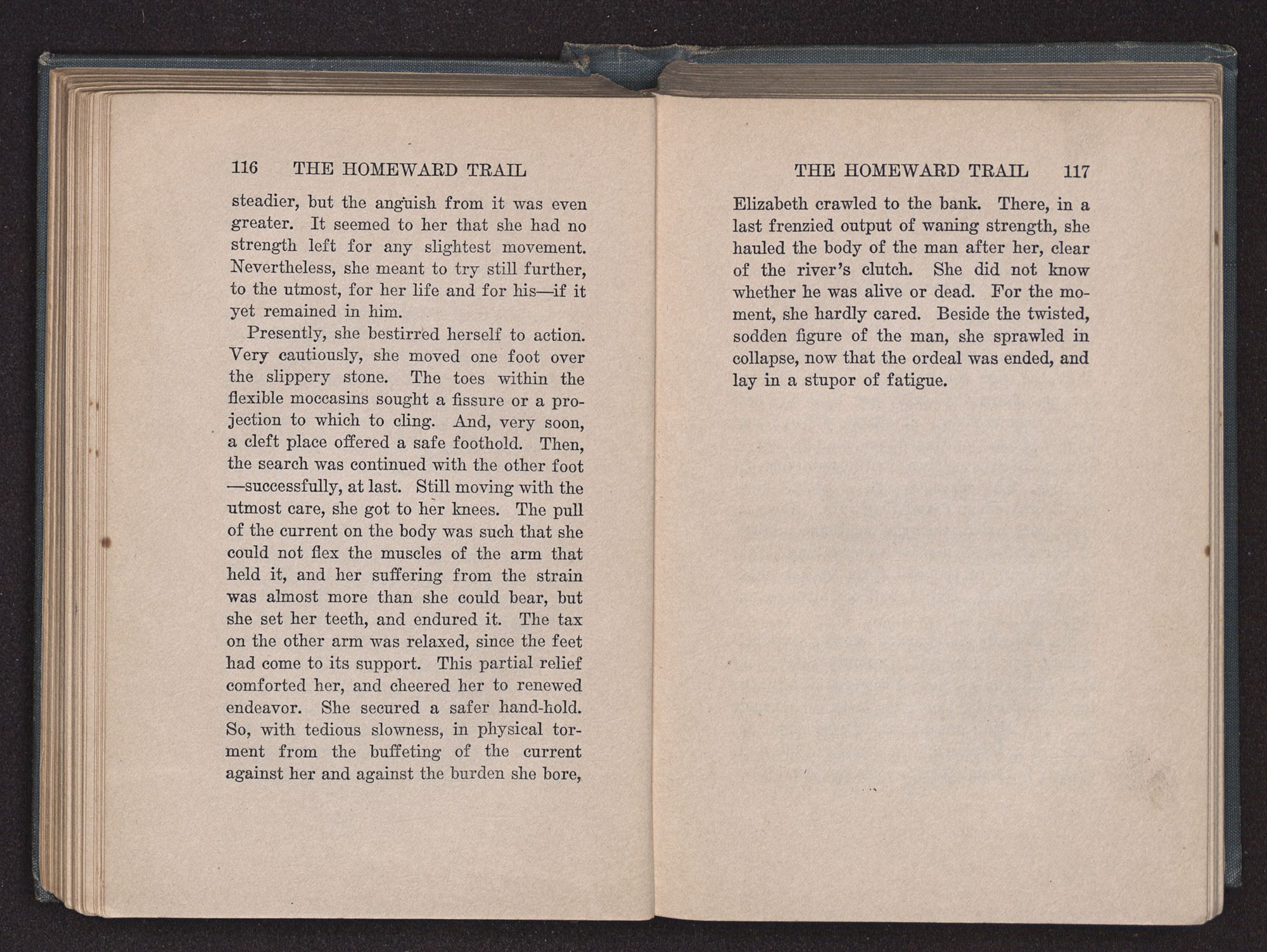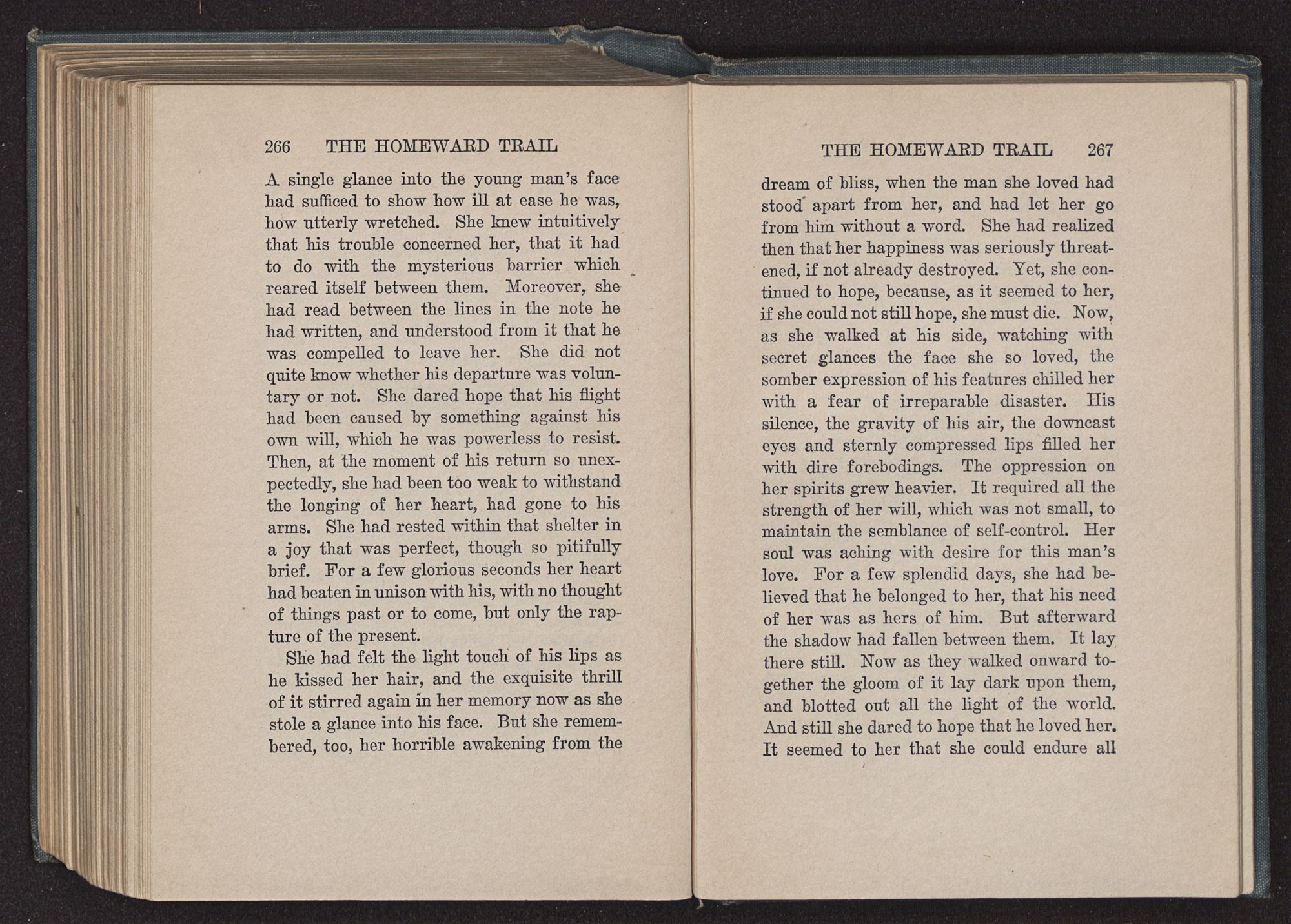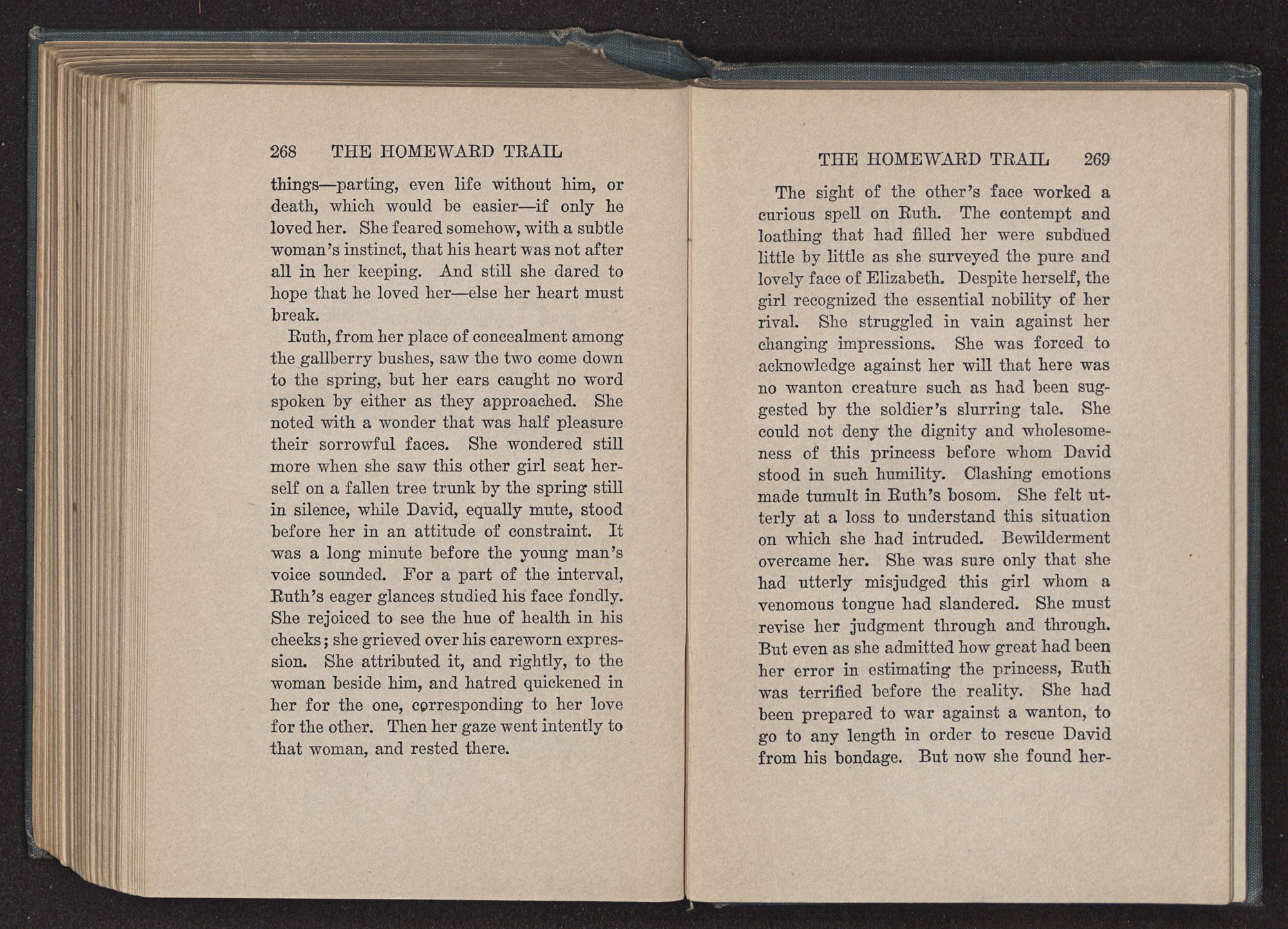 On a little rise of the road, by a common instinct, the lovers drew rein, and looked back toward the encampment, which nestled snugly within the frame of woodland foliage, now dimming from its autumnal splendors. They could not make out the figure of the girl who stood solitary and desolate by the spring, looking with pain-blinded eyes toward the vast spaces of the sky.