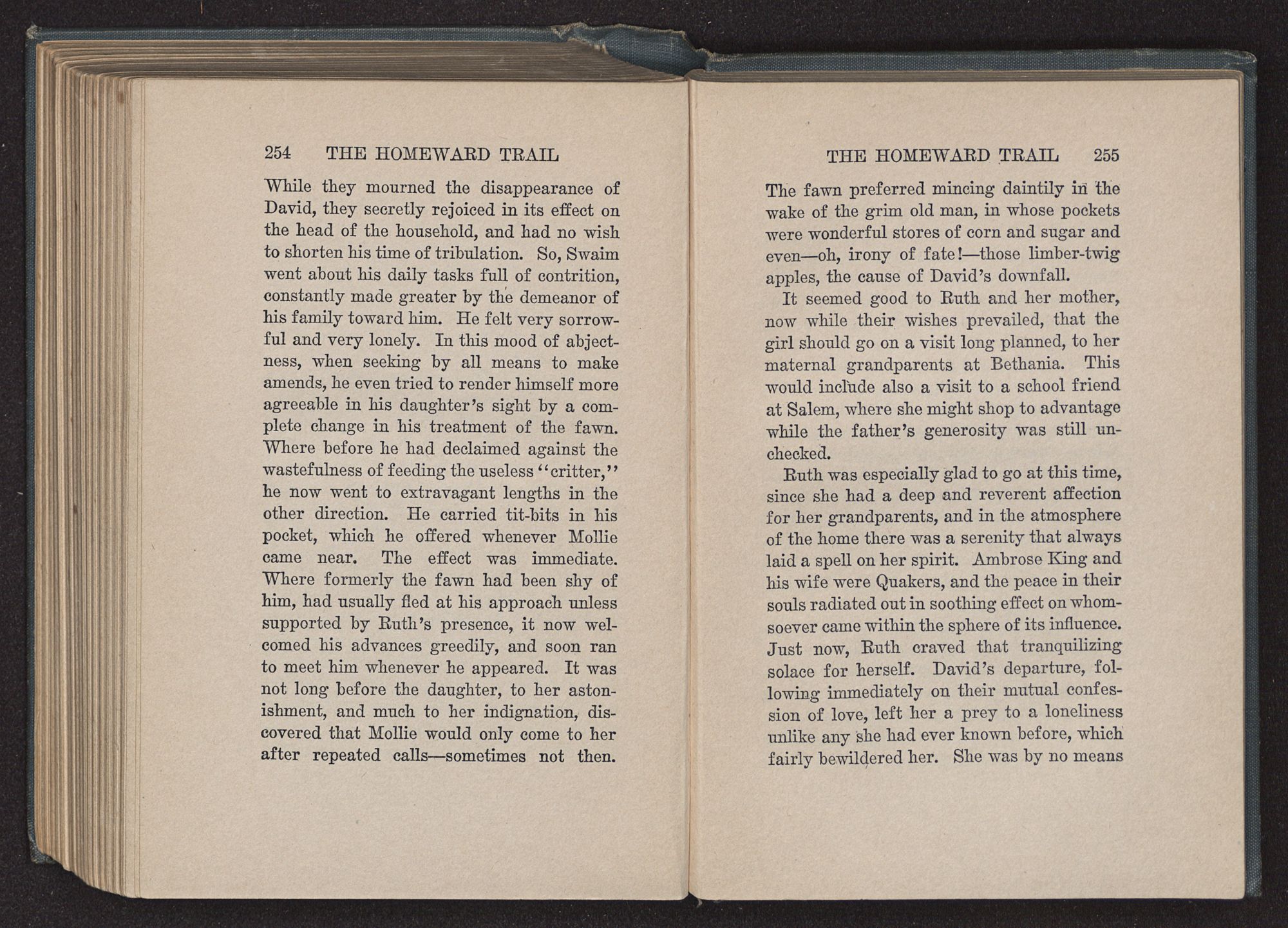 DAVID, sitting under an apple tree, stared with vague eyes toward the thicket of dogwood that bordered on the far side of the orchard. Then, of a sudden, his gaze quickened as there came a movement of the foliage, and a fawn stepped daintily out into the open, where it stood placidly regarding the young man with limpid, friendly eyes. One ear stood out at a right angle from the head; the other was laid back, attentive to something within the thicket. David knew that this something must be Ruth, with whom her fawn wandered everywhere. He stood up expectantly. A moment later, the girl issued from the shelter, and at sight of the youth stopped short beside the fawn, which muzzled her hand in a gentle caress.