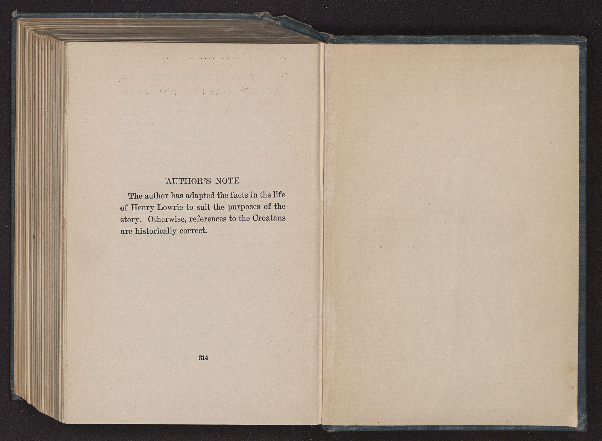 The author has adapted the facts in the life of Henry Lowrie to suit the purposes of the story. Otherwise, references to the Croatans are historically correct.