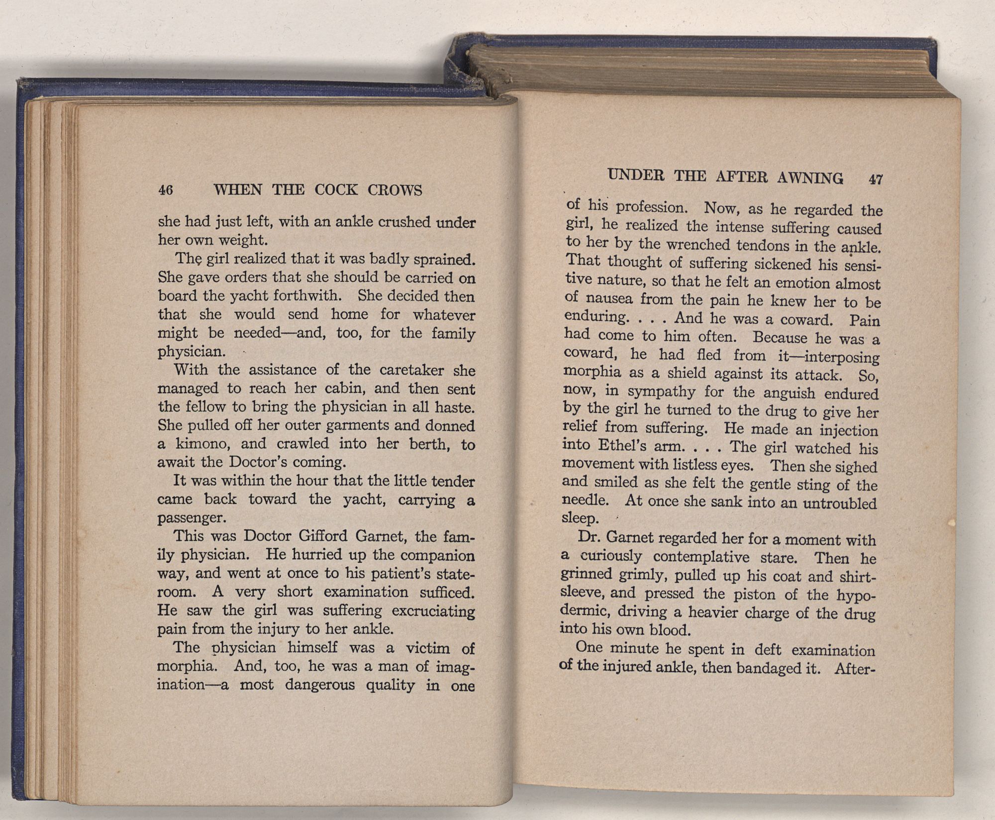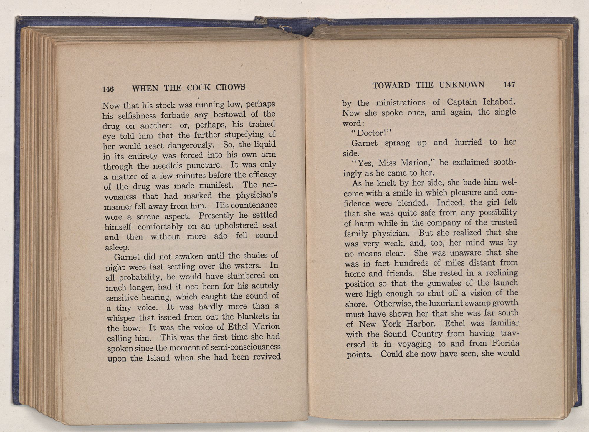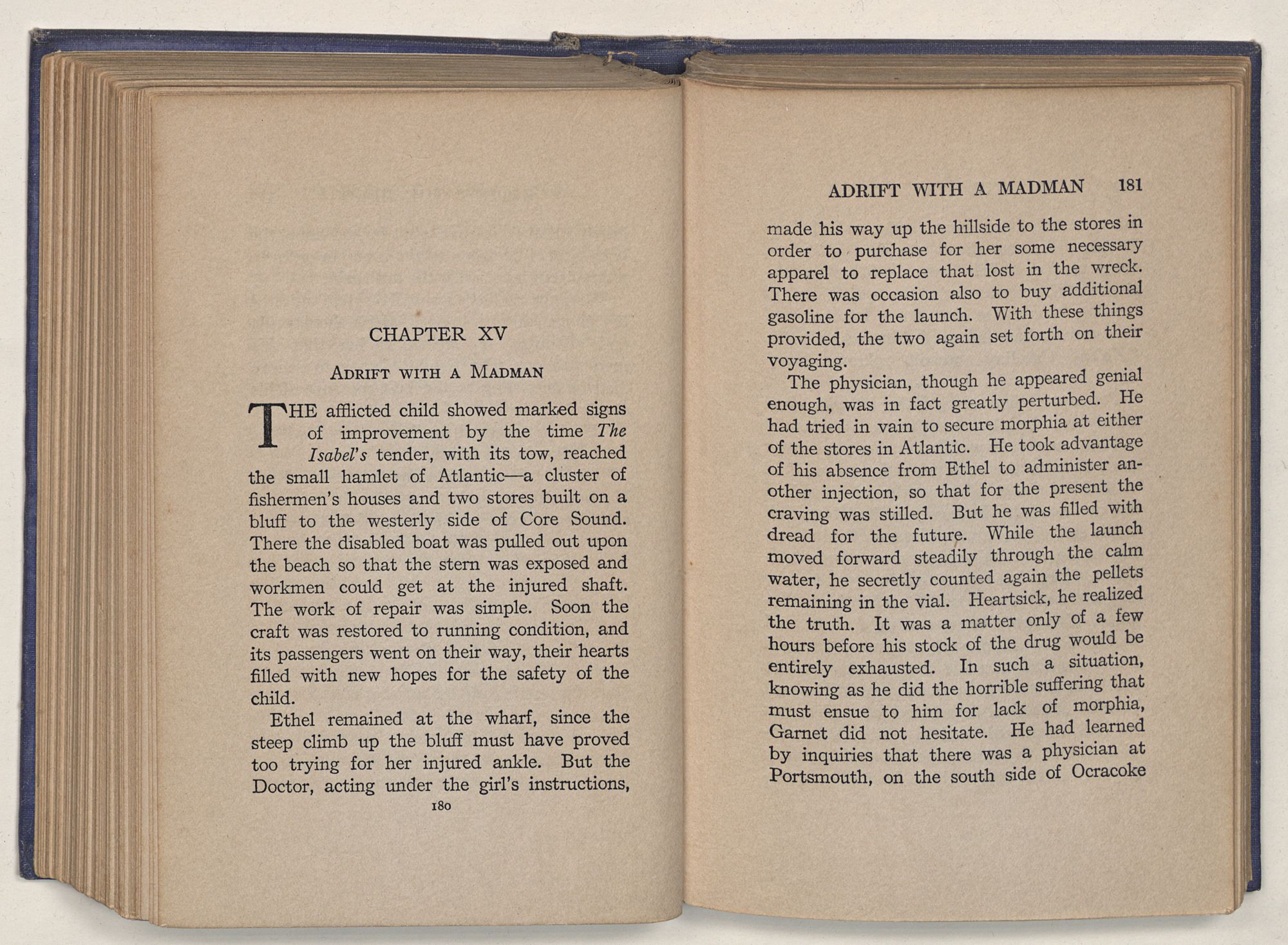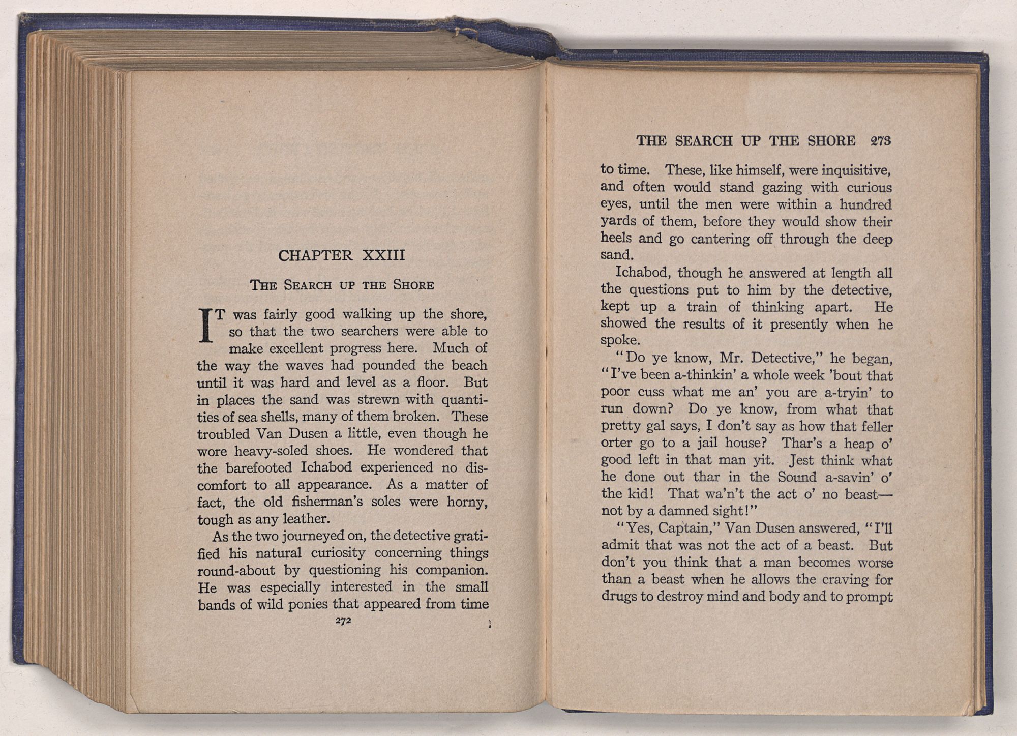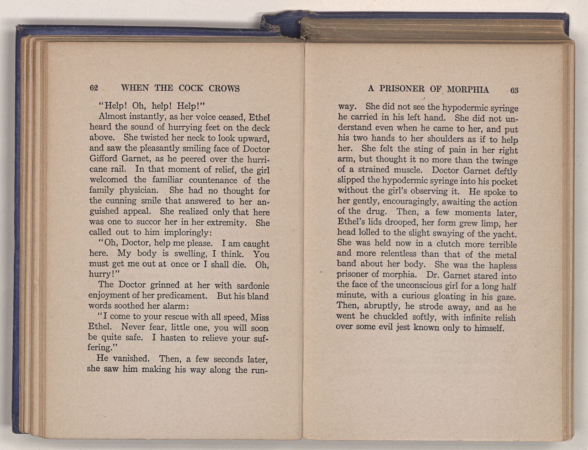 “Ichabod preferred to remain behind, when I went to the physician's house. There I found that Doctor Garnet had in fact been received by the young doctor, who had taken him in and cared for him—proud indeed to do so, since he knew his patient's reputation and held him in veneration for his skill. The younger doctor readily entered into a conspiracy with me when he had heard my story. I had an interview with Doctor Garnet. He accepted my proposition fully. He was glad of a chance to expiate his follies. He swore to me that never again would he take a grain of the drug. At his request, I brought Ichabod to his bedside, and he thanked the old man warmly for all that he had done both for himself and for me, his victim. I offered him funds for the trip abroad, but he told me that he was well supplied with money. He told me also that he had come in a small sail-boat to carry me away from the shack, but had seen on approaching that his services
