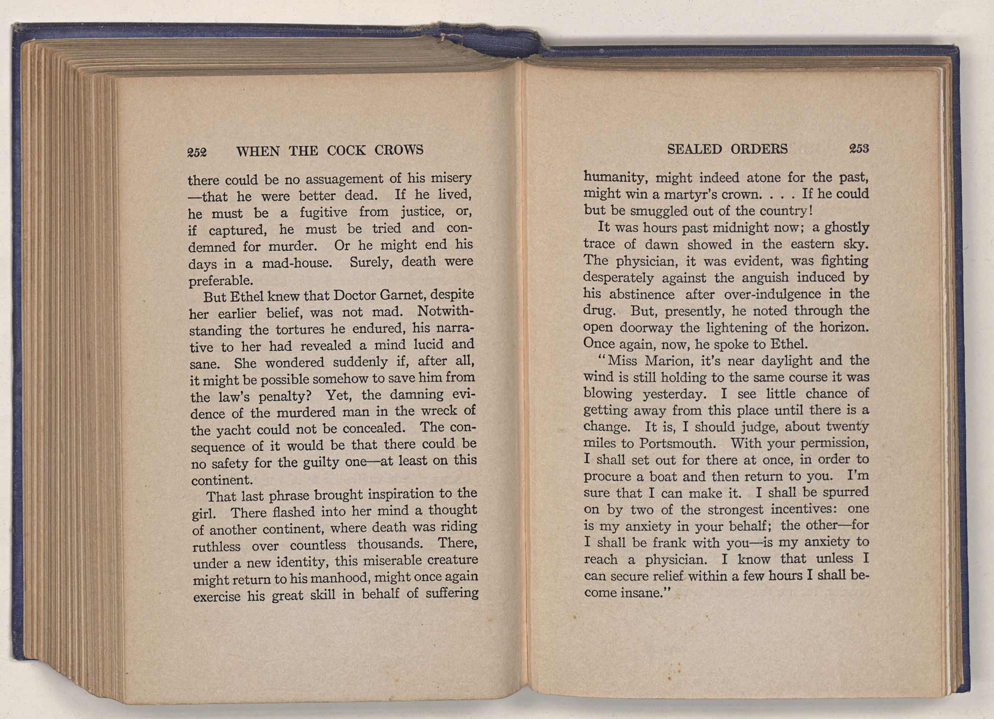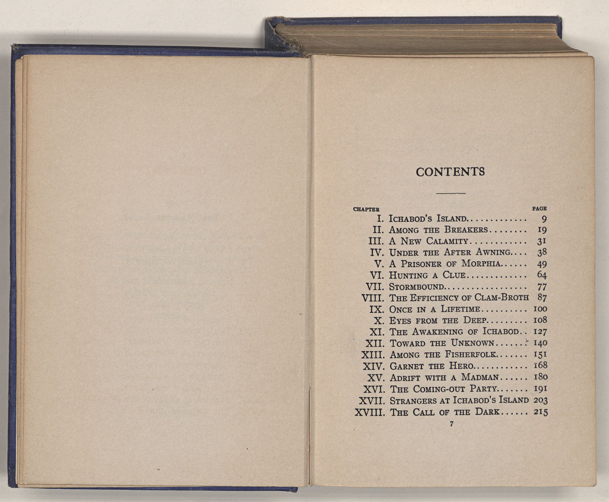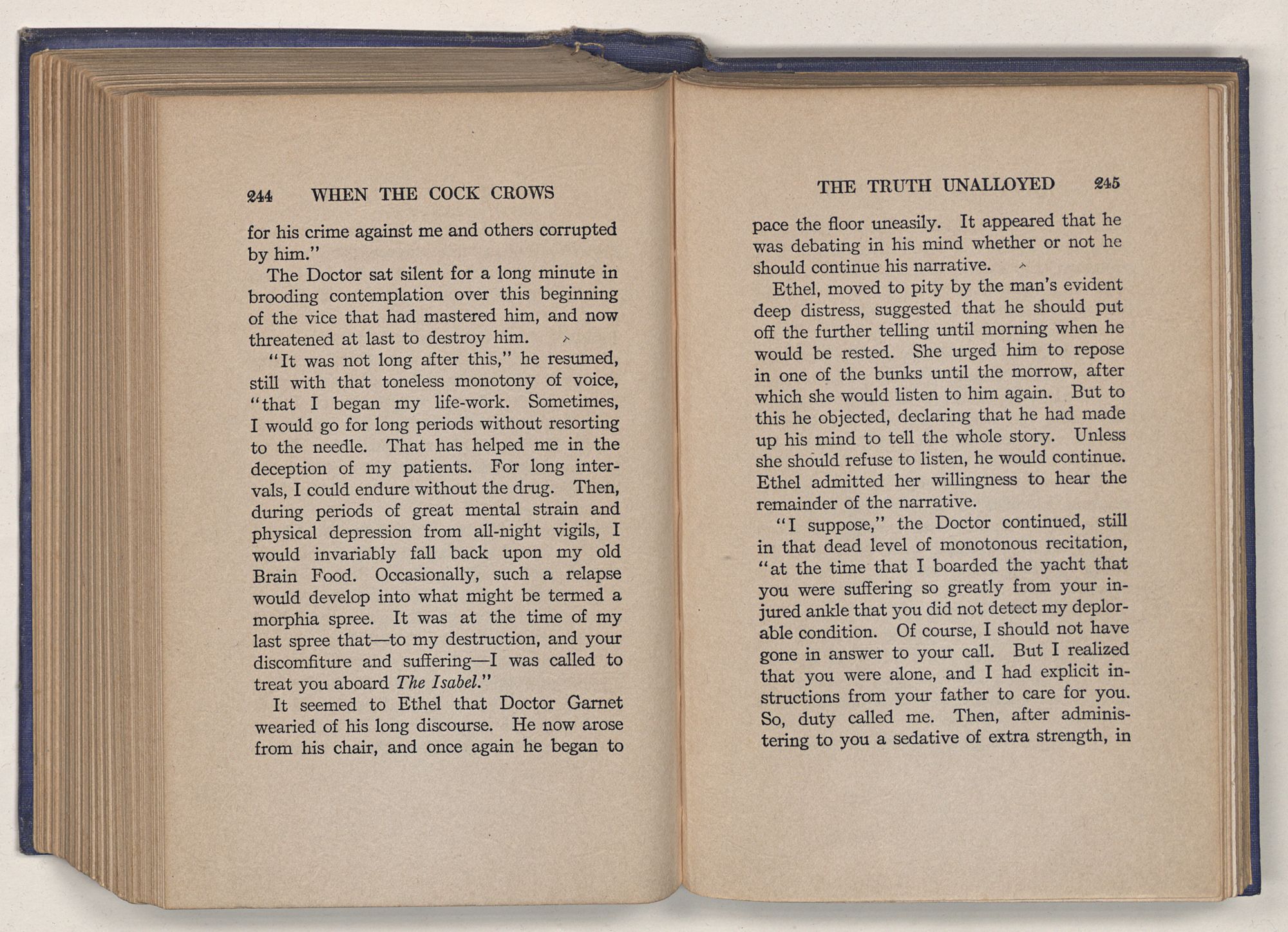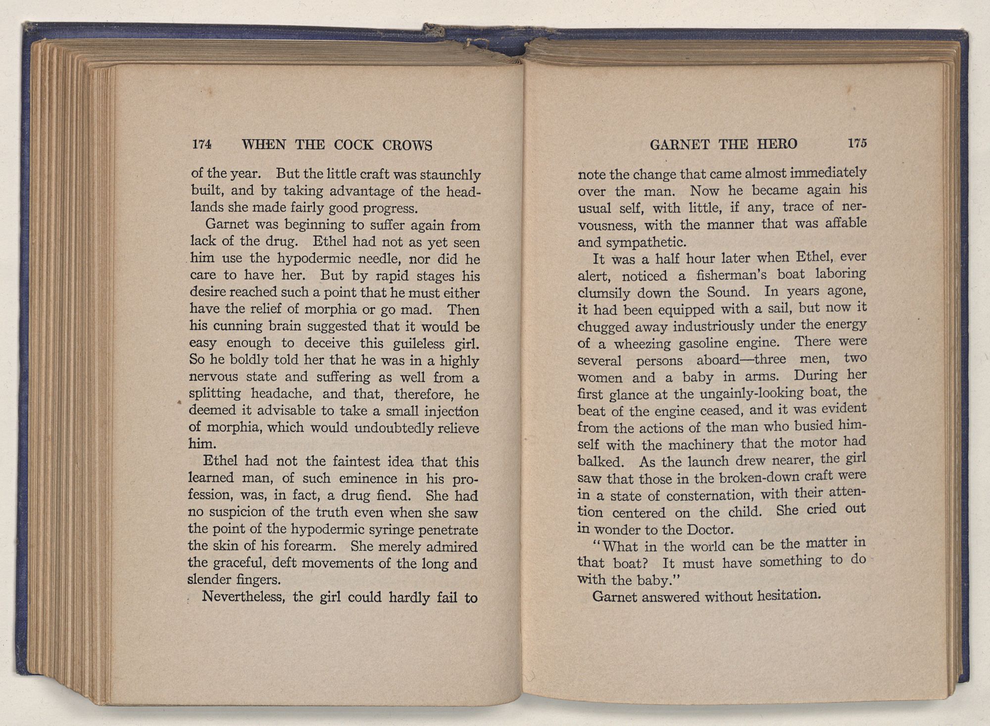 “Ichabod preferred to remain behind, when I went to the physician's house. There I found that Doctor Garnet had in fact been received by the young doctor, who had taken him in and cared for him—proud indeed to do so, since he knew his patient's reputation and held him in veneration for his skill. The younger doctor readily entered into a conspiracy with me when he had heard my story. I had an interview with Doctor Garnet. He accepted my proposition fully. He was glad of a chance to expiate his follies. He swore to me that never again would he take a grain of the drug. At his request, I brought Ichabod to his bedside, and he thanked the old man warmly for all that he had done both for himself and for me, his victim. I offered him funds for the trip abroad, but he told me that he was well supplied with money. He told me also that he had come in a small sail-boat to carry me away from the shack, but had seen on approaching that his services