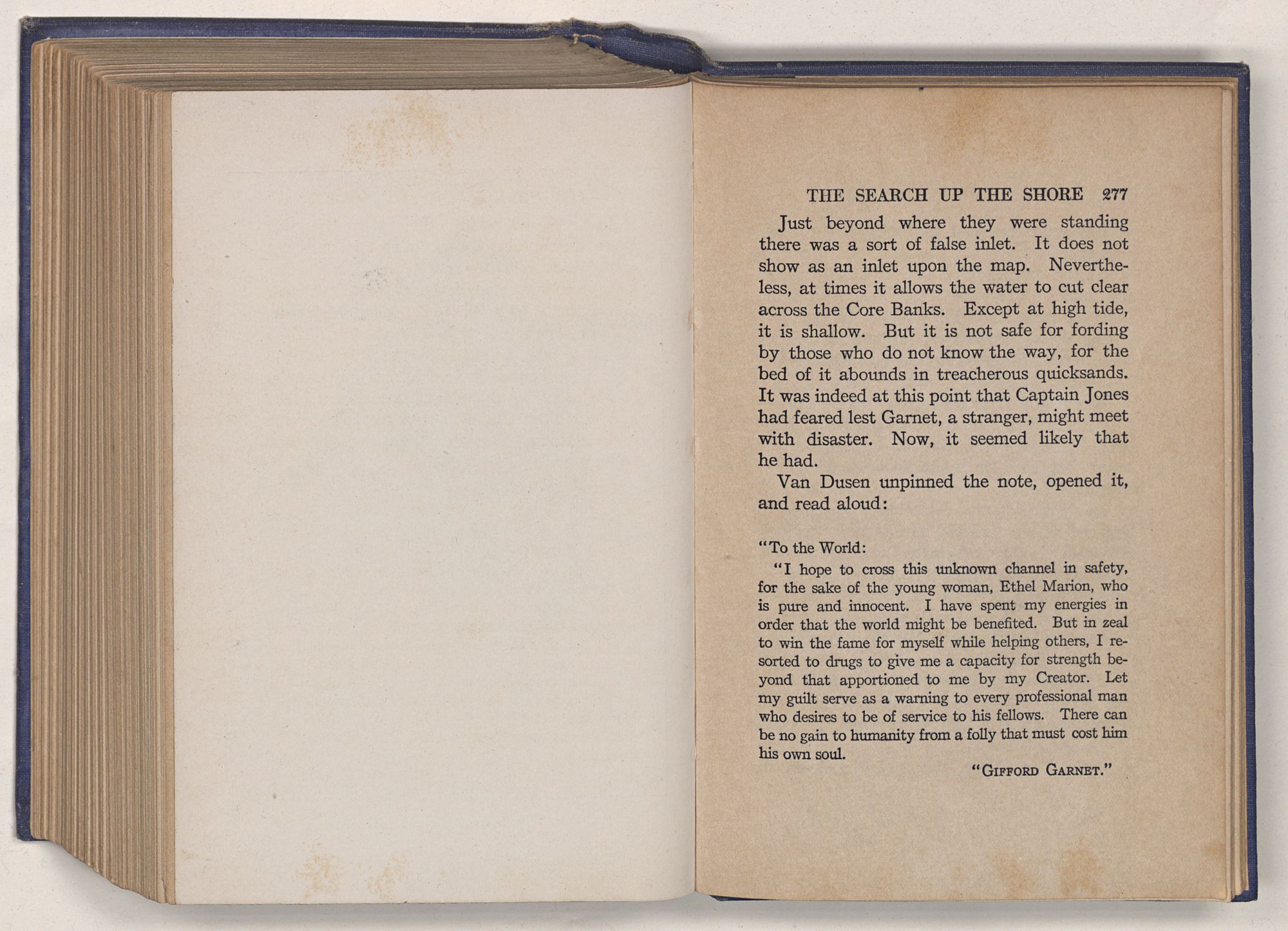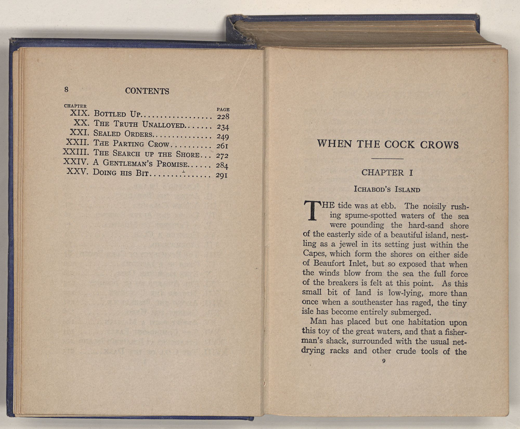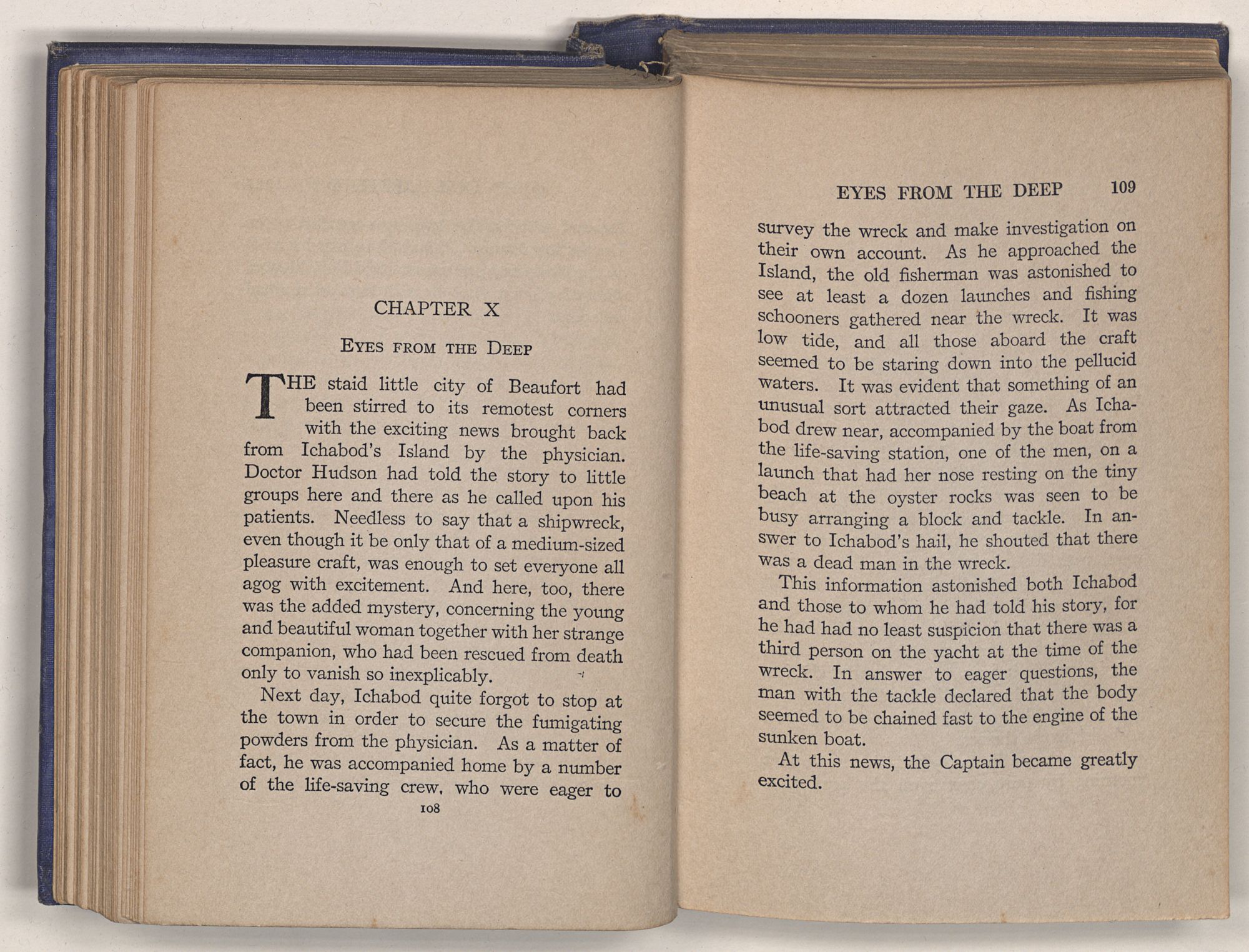 CHAPTER I Ichabod's IslandTHE tide was at ebb. The noisily rushing spume-spotted waters of the sea were pounding the hard-sand shore of the easterly side of a beautiful island, nestling as a jewel in its setting just within the Capes, which form the shores on either side of Beaufort Inlet, but so exposed that when the winds blow from the sea the full force of the breakers is felt at this point. As this small bit of land is low-lying, more than once when a southeaster has raged, the tiny isle has become entirely submerged.