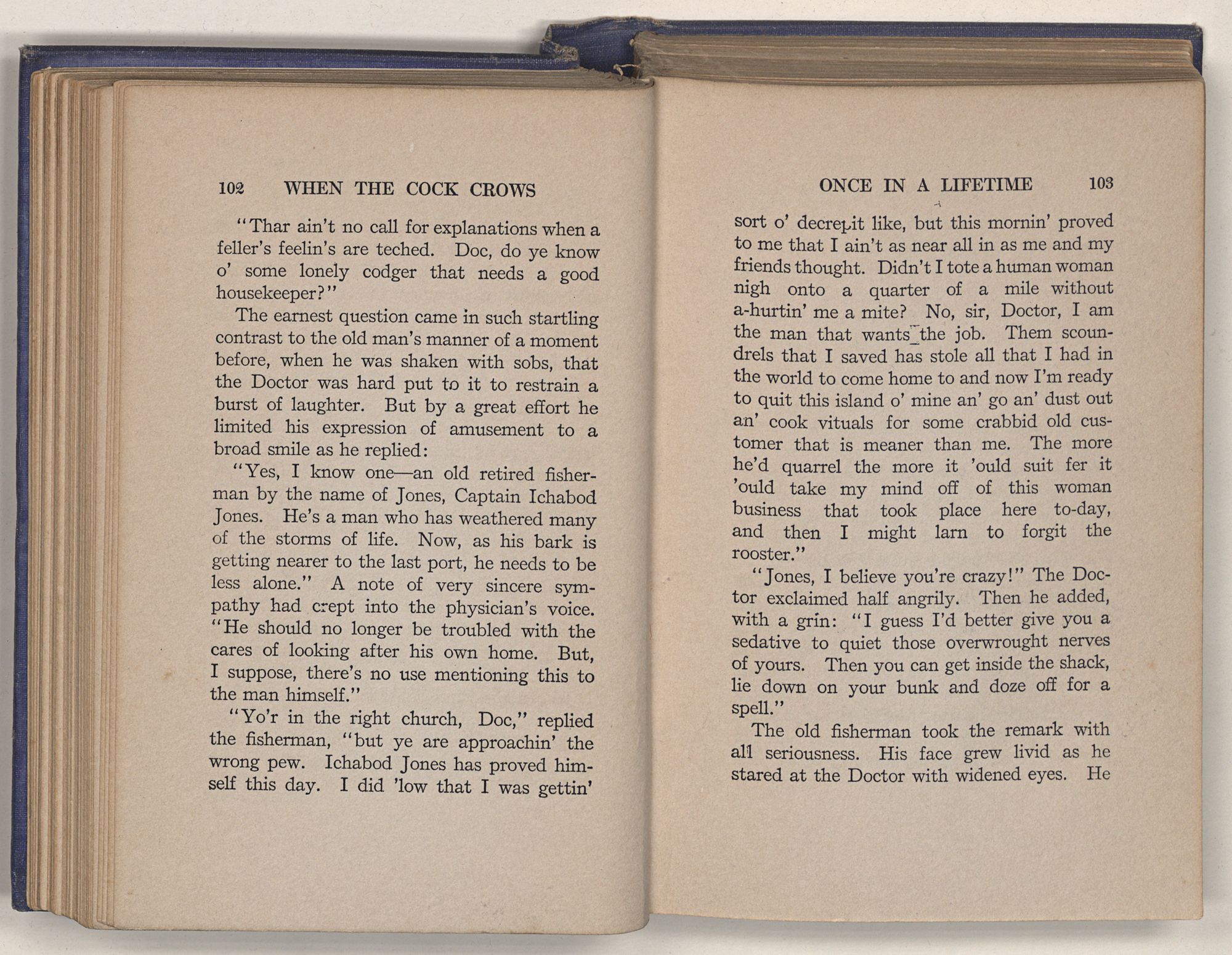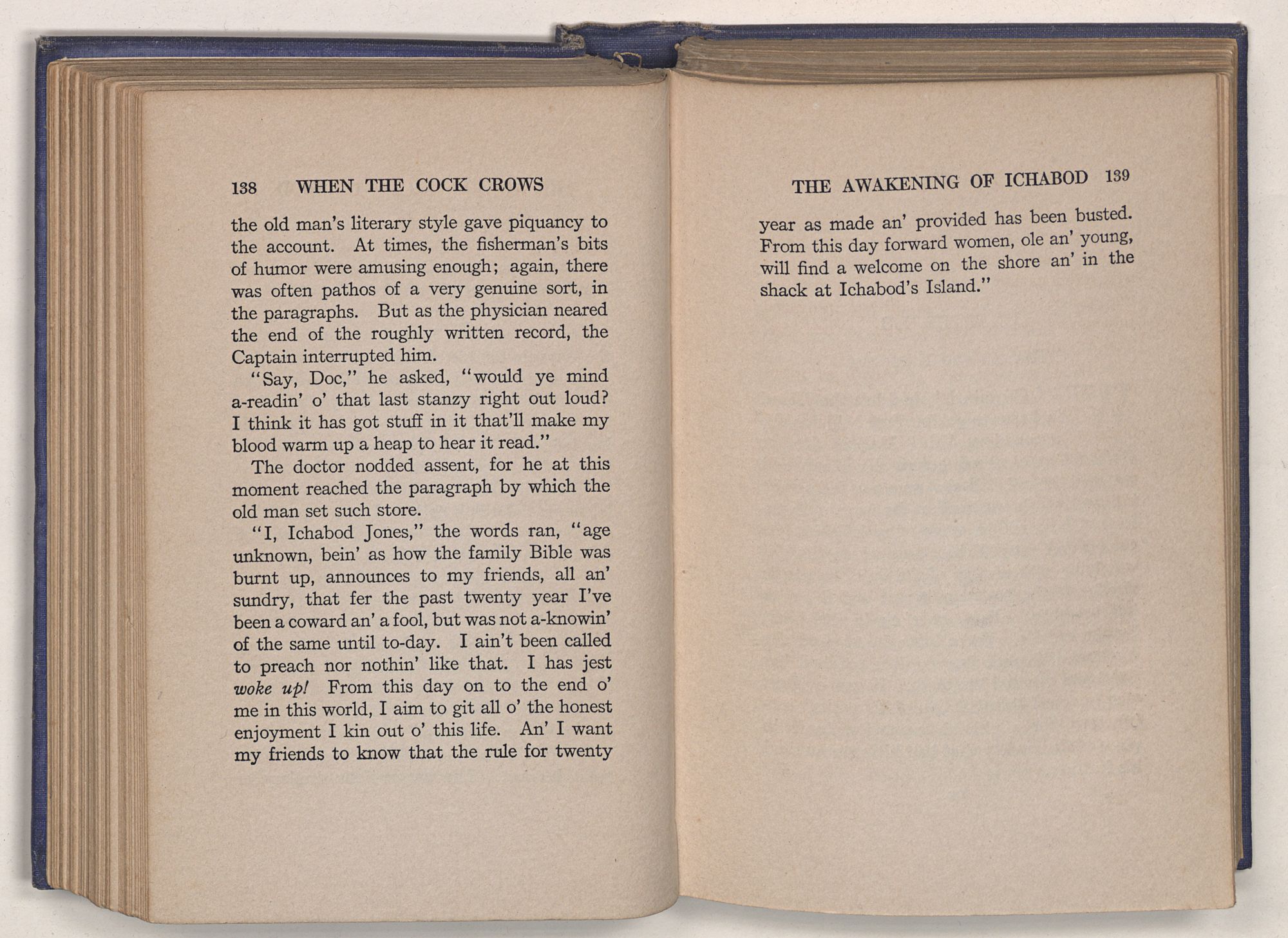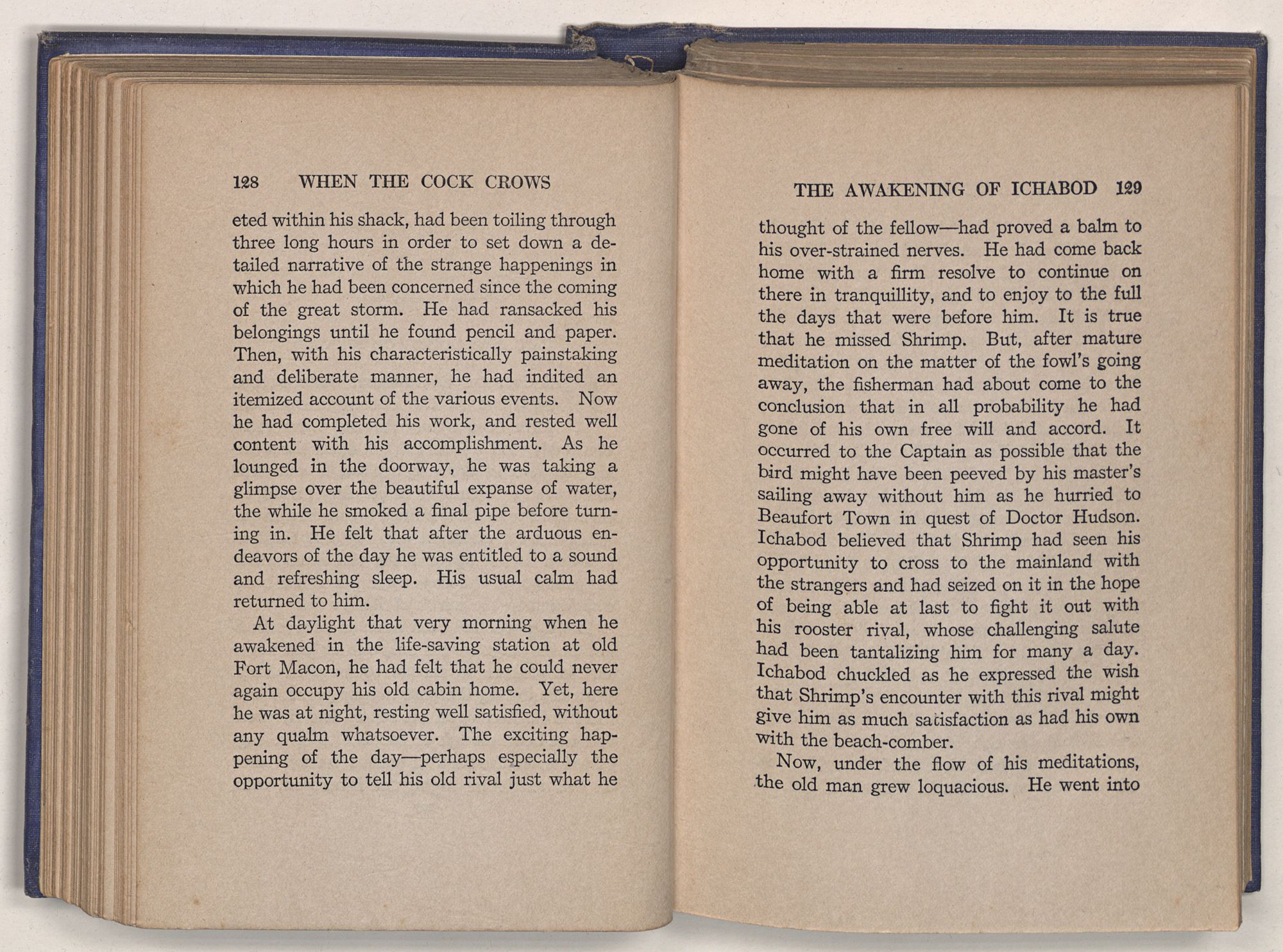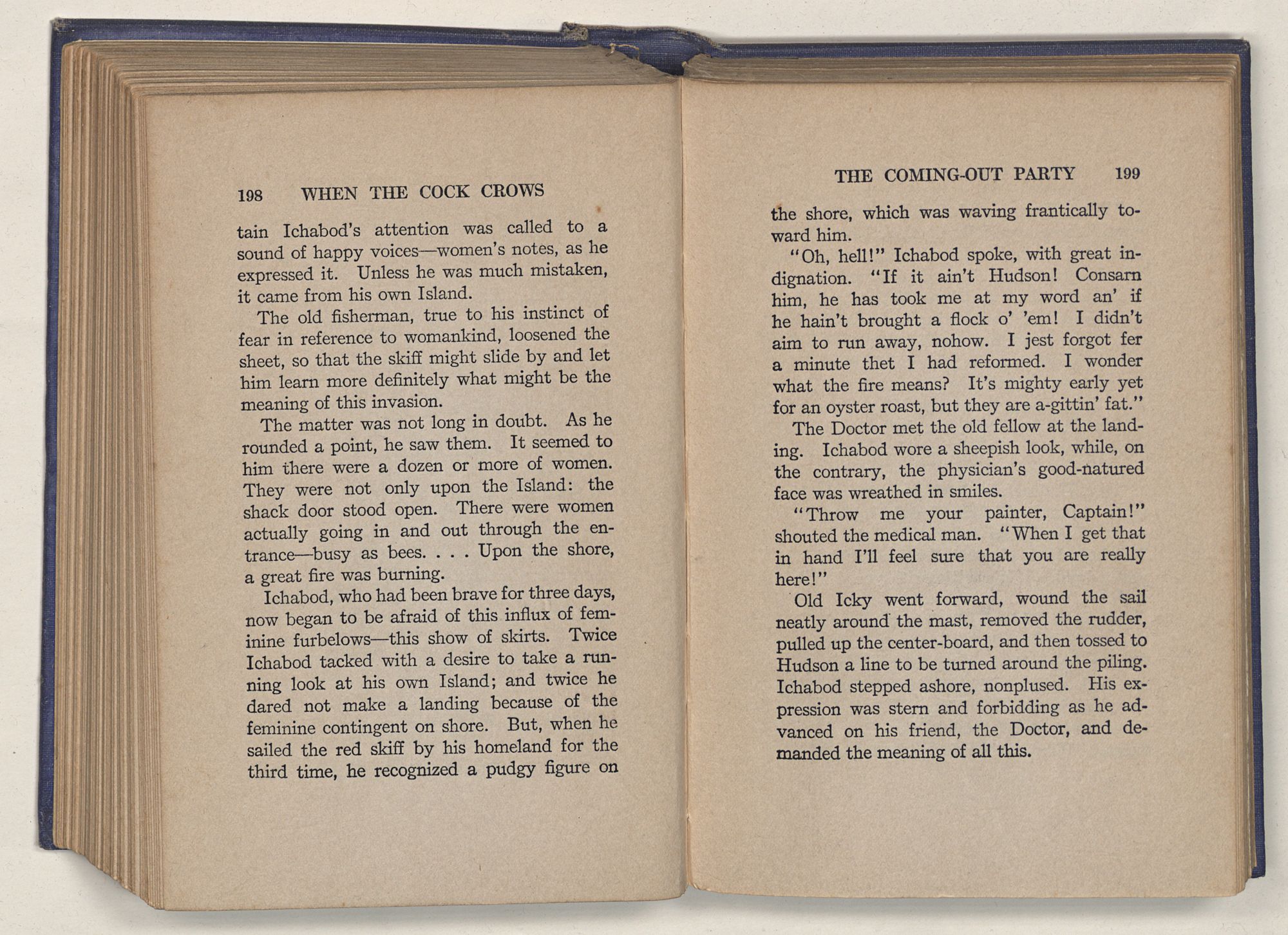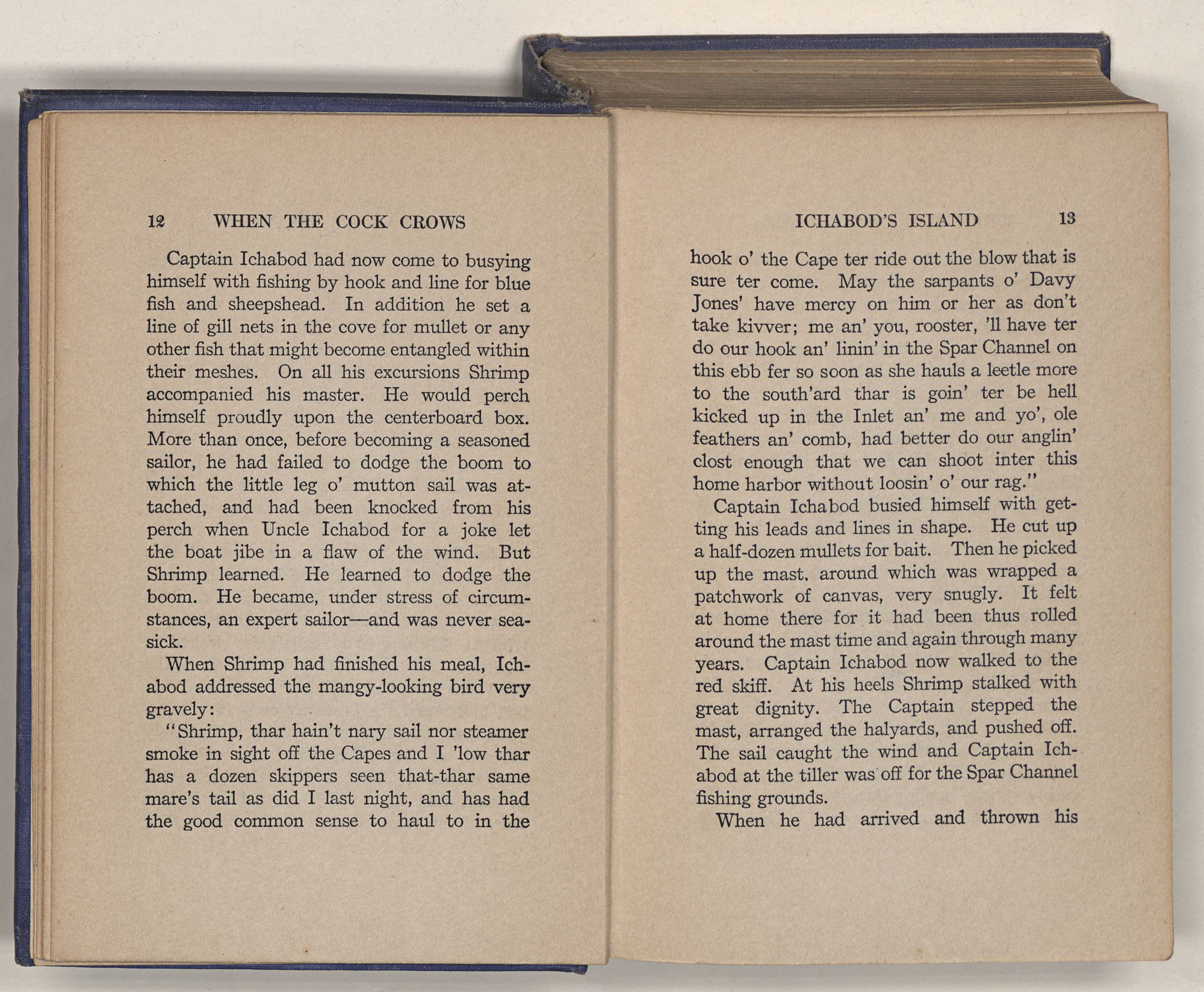 “Shrimp, ye air a heap o’ company to the ole man, but ye wa'n’t built by God A'mighty fer a sailin’ mate, all he fixed ye fer was to peck an’ scratch an’ fight—oh, yes, an’ I like ter forgot the crow.”