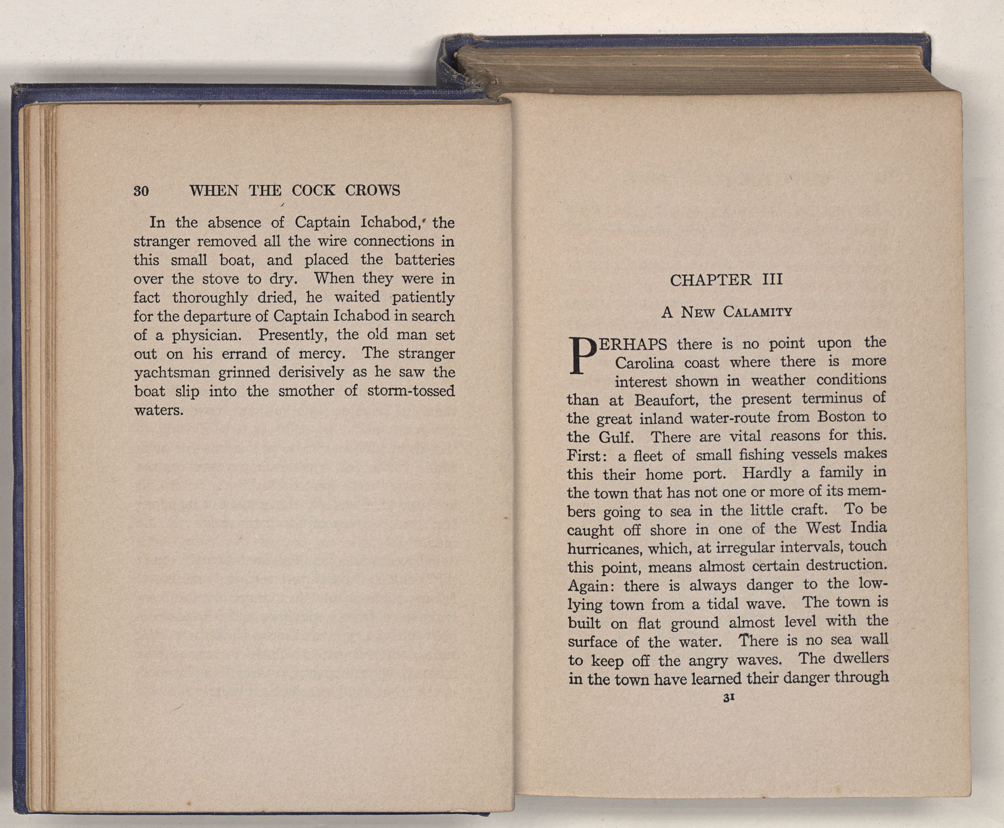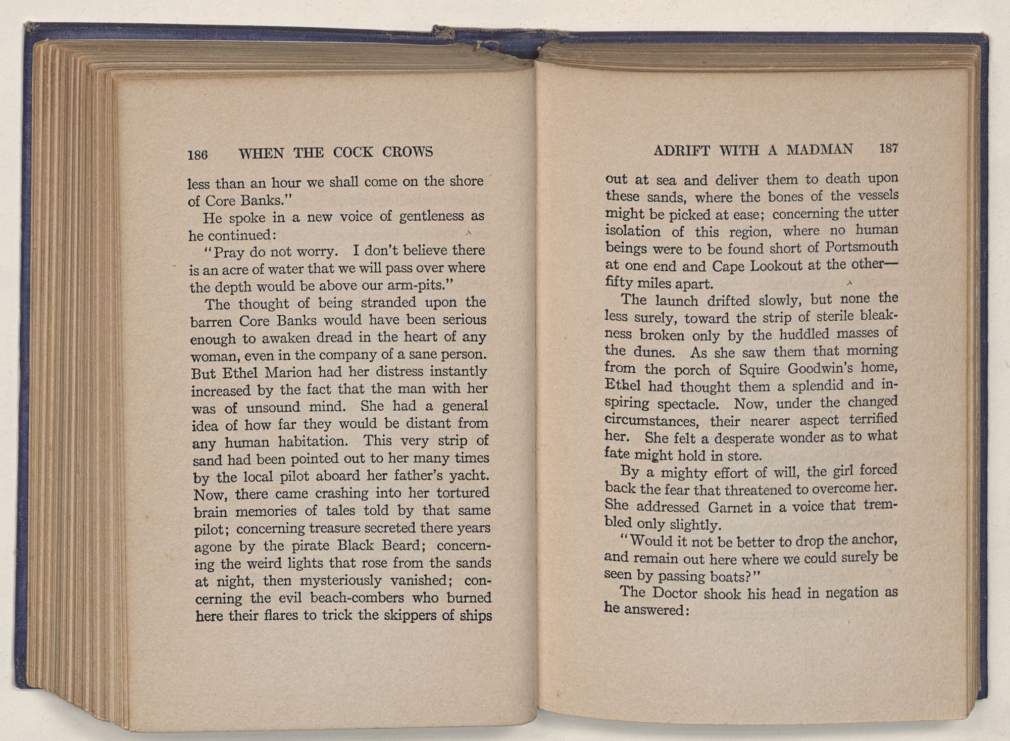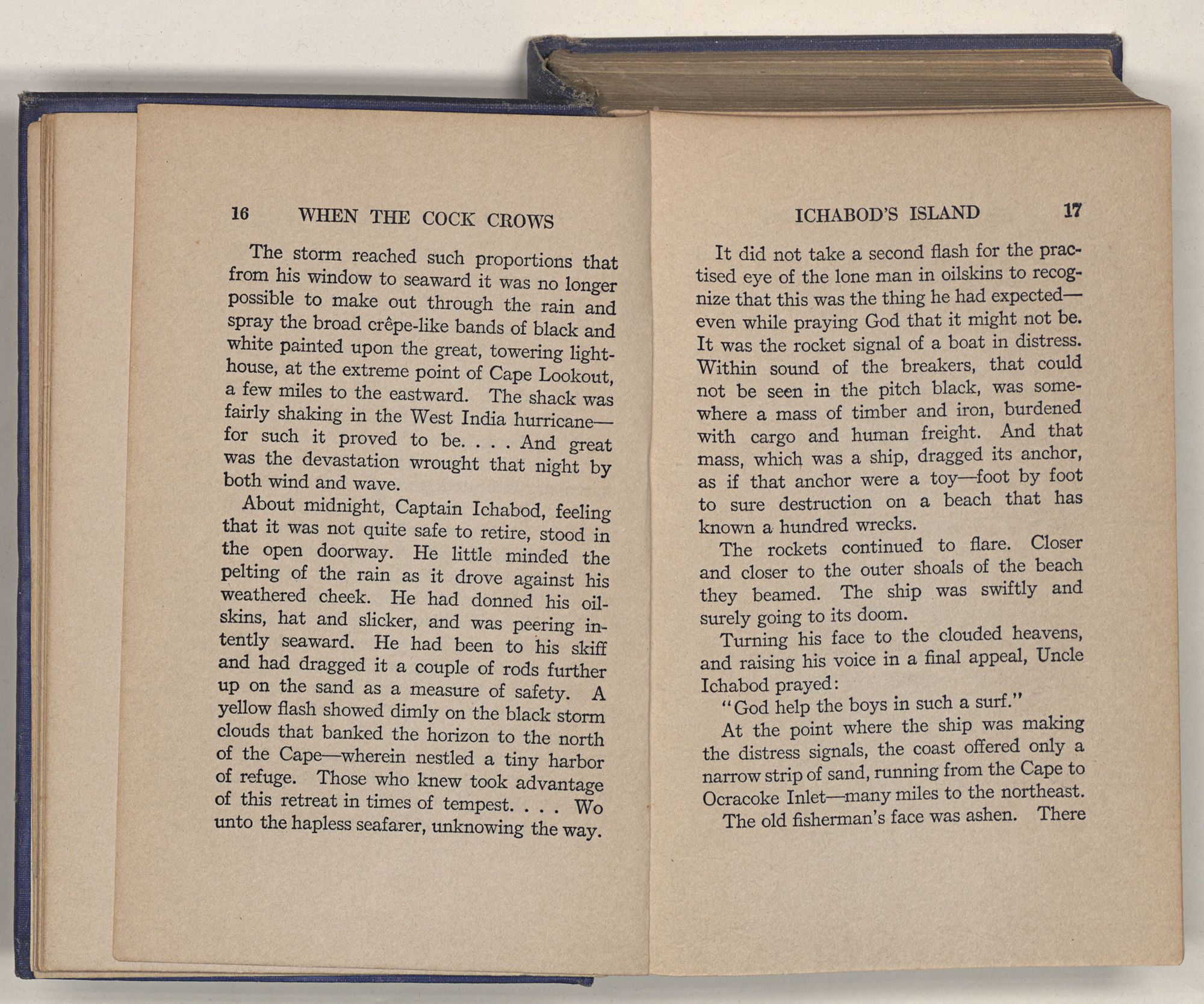 The storm reached such proportions that from his window to seaward it was no longer possible to make out through the rain and spray the broad crêpe-like bands of black and white painted upon the great, towering light-house, at the extreme point of Cape Lookout, a few miles to the eastward. The shack was fairly shaking in the West India hurricane—for such it proved to be. . . . And great was the devastation wrought that night by both wind and wave.