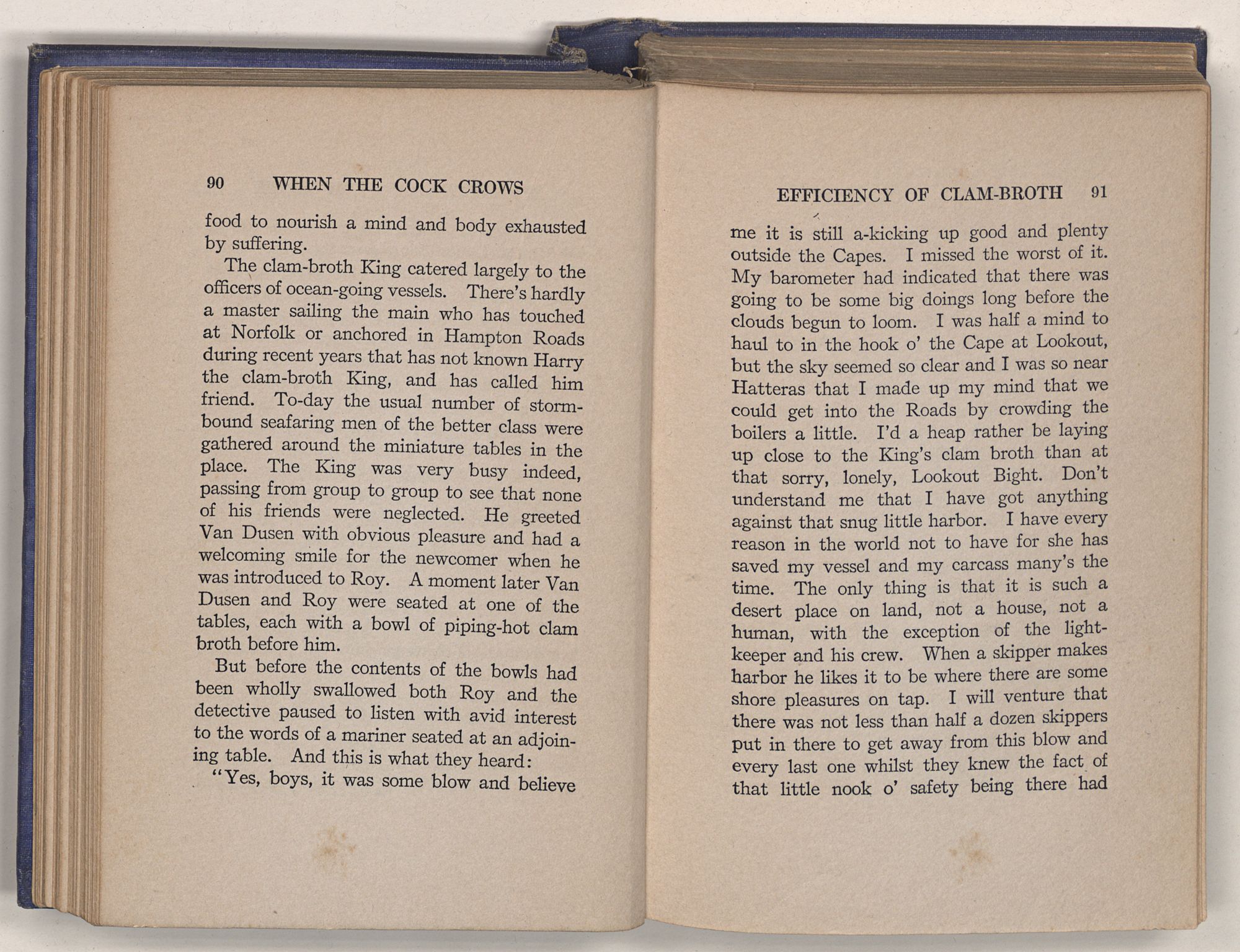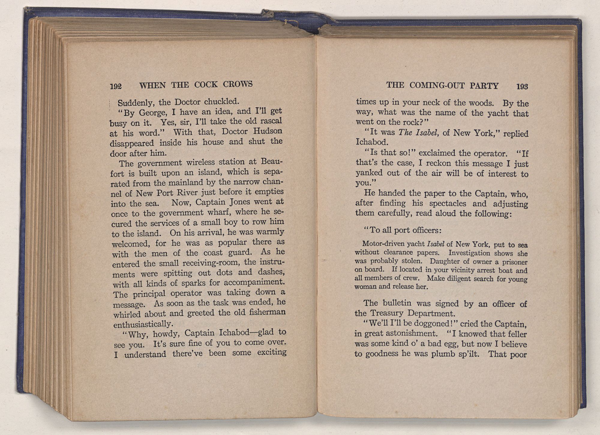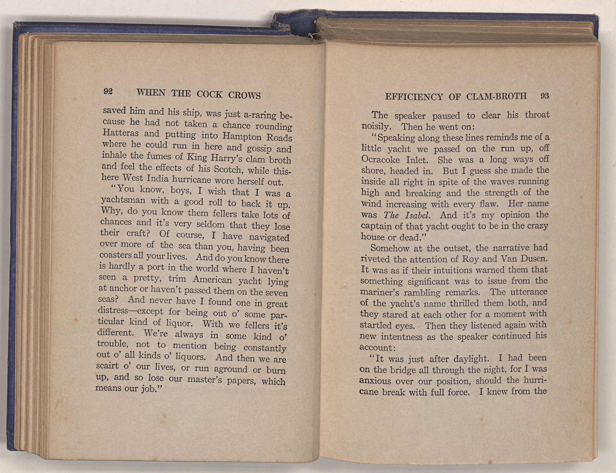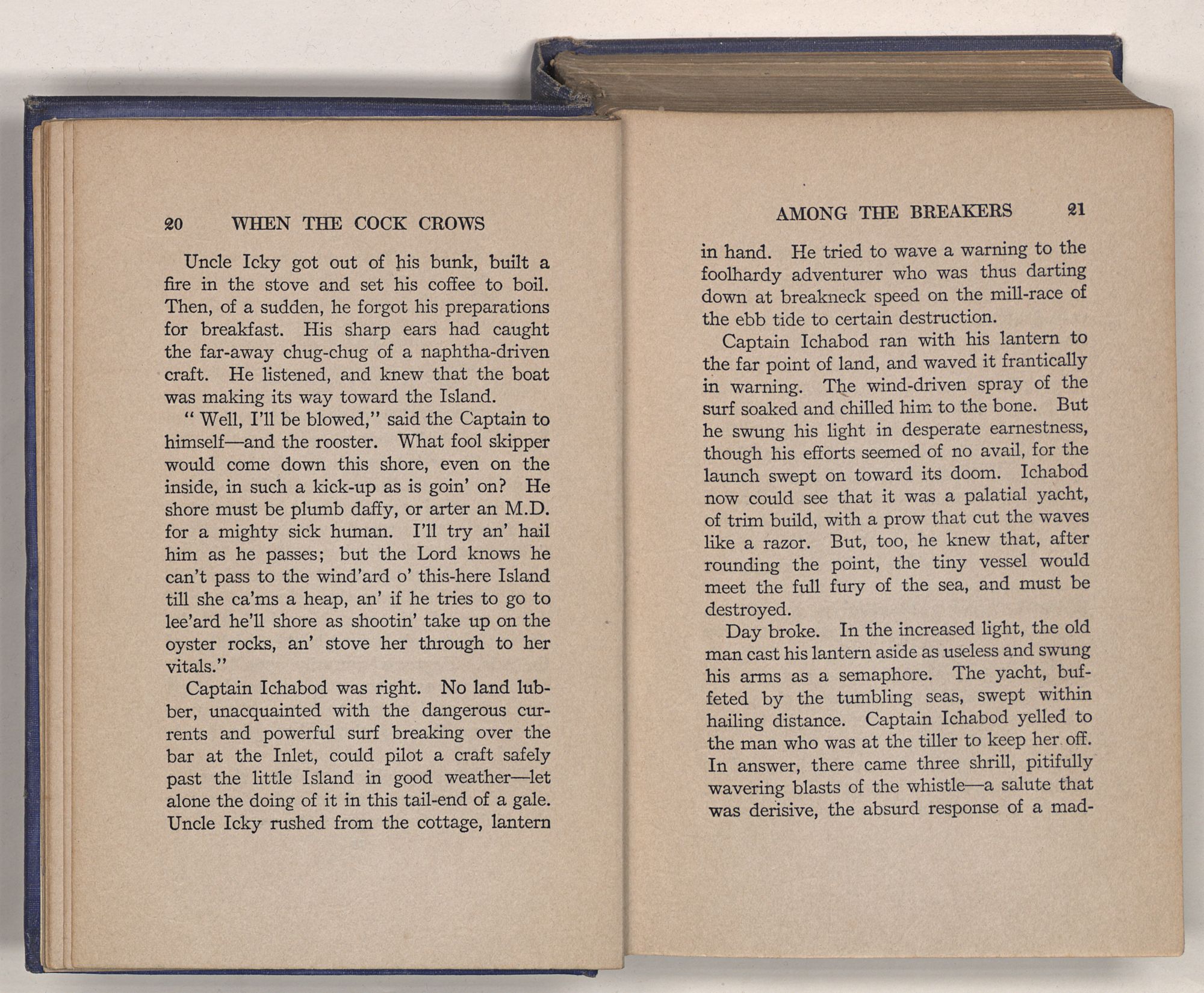 “Well, I'll be blowed,” said the Captain to himself—and the rooster. What fool skipper would come down this shore, even on the inside, in such a kick-up as is goin’ on? He shore must be plumb daffy, or arter an M.D. for a mighty sick human. I'll try an’ hail him as he passes; but the Lord knows he can't pass to the wind'ard o’ this-here Island till she ca'ms a heap, an’ if he tries to go to lee'ard he'll shore as shootin’ take up on the oyster rocks, an’ stove her through to her vitals.”