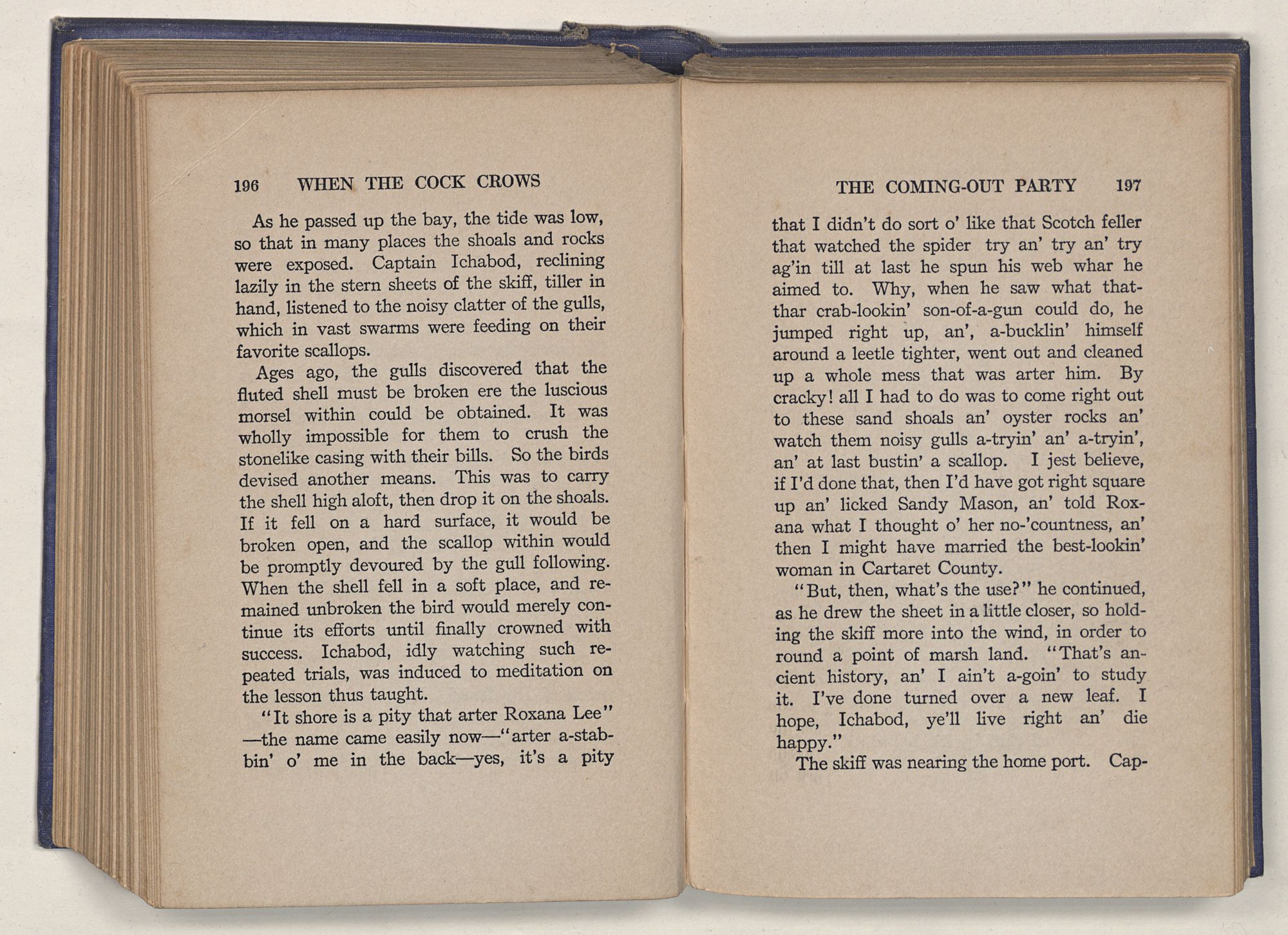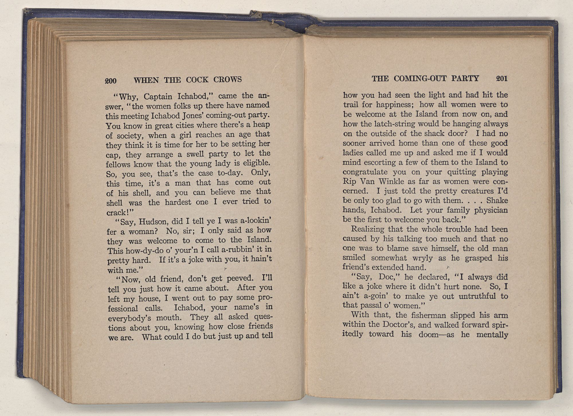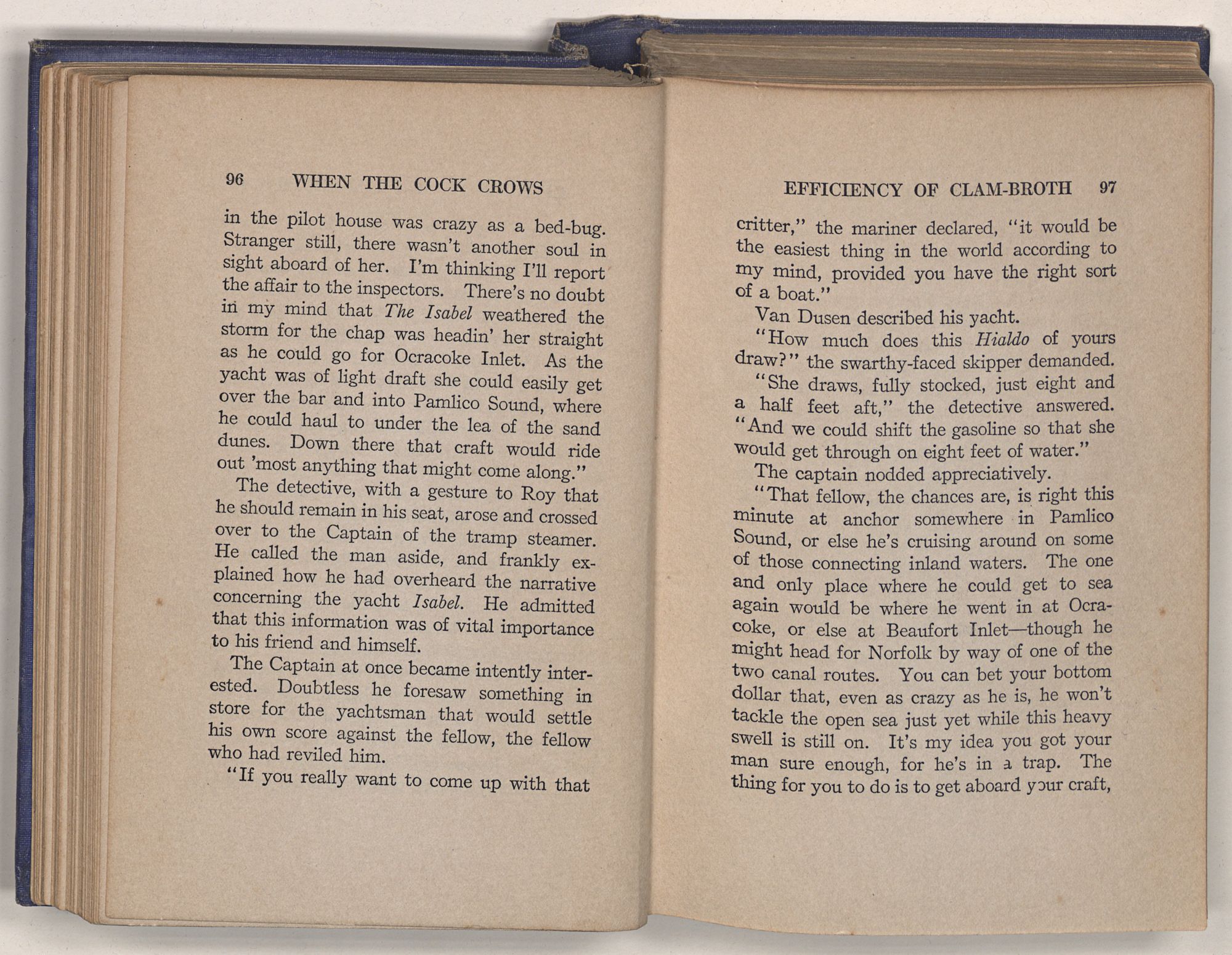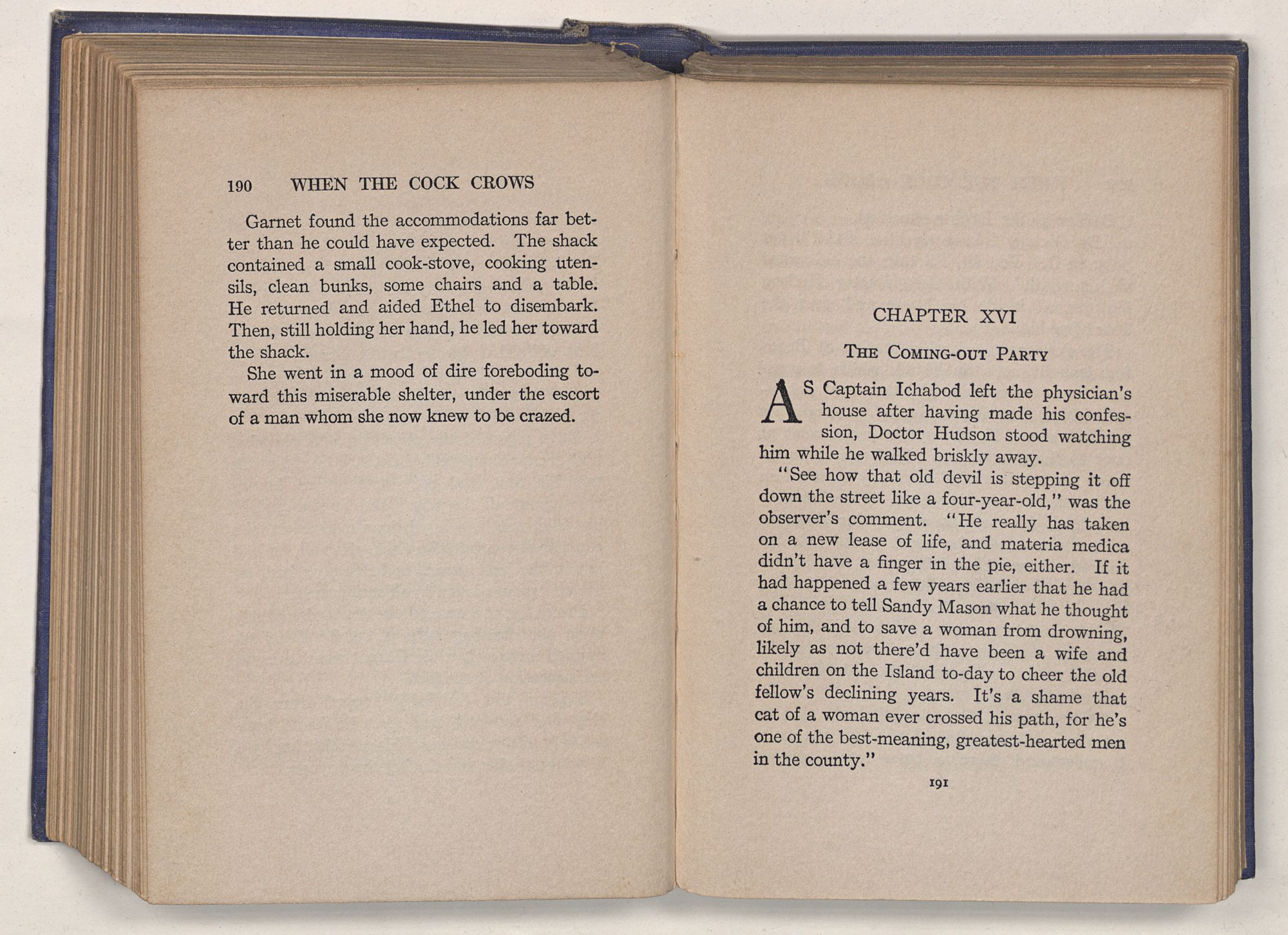 “Well, I'll be blowed,” said the Captain to himself—and the rooster. What fool skipper would come down this shore, even on the inside, in such a kick-up as is goin’ on? He shore must be plumb daffy, or arter an M.D. for a mighty sick human. I'll try an’ hail him as he passes; but the Lord knows he can't pass to the wind'ard o’ this-here Island till she ca'ms a heap, an’ if he tries to go to lee'ard he'll shore as shootin’ take up on the oyster rocks, an’ stove her through to her vitals.”